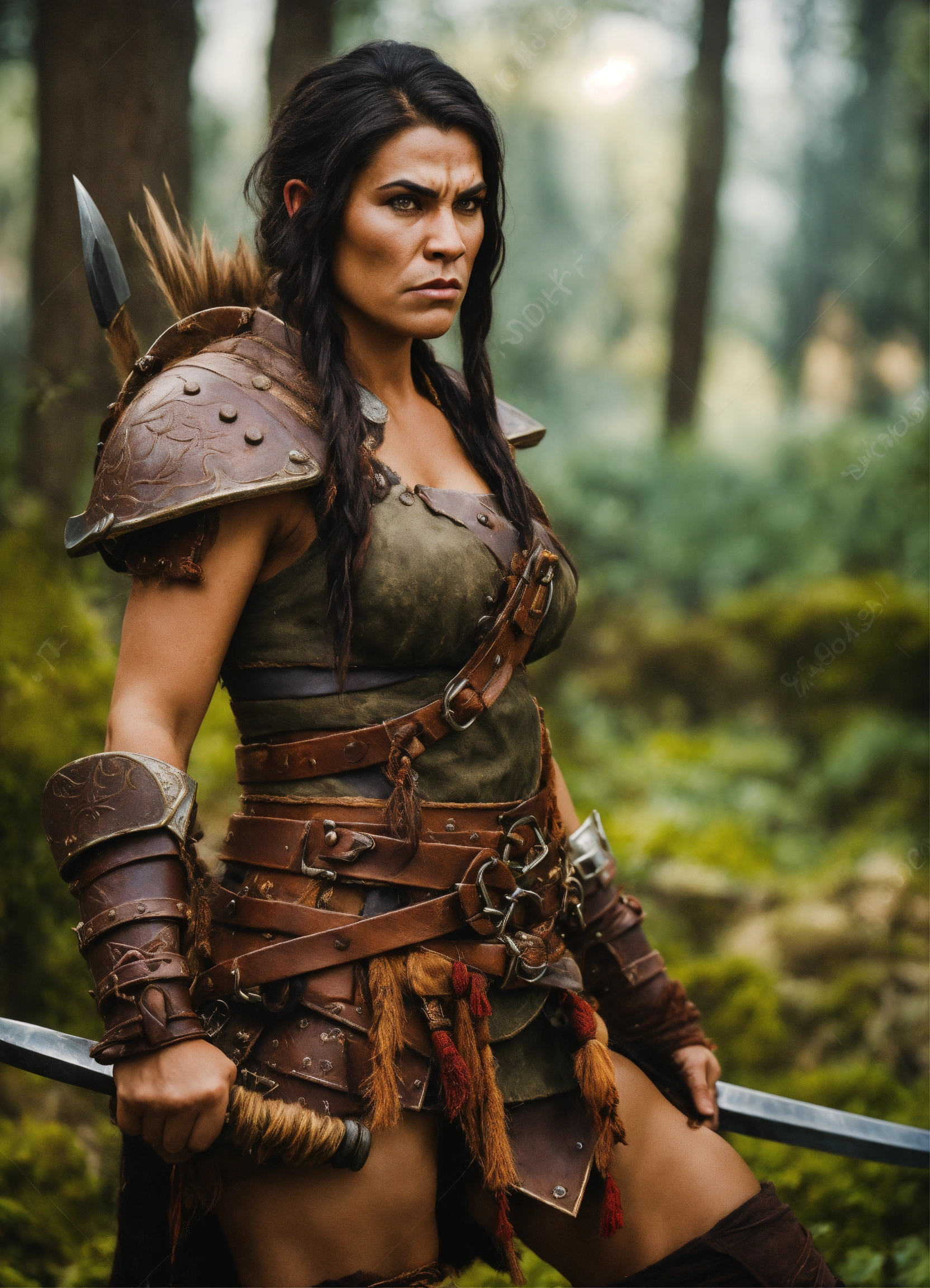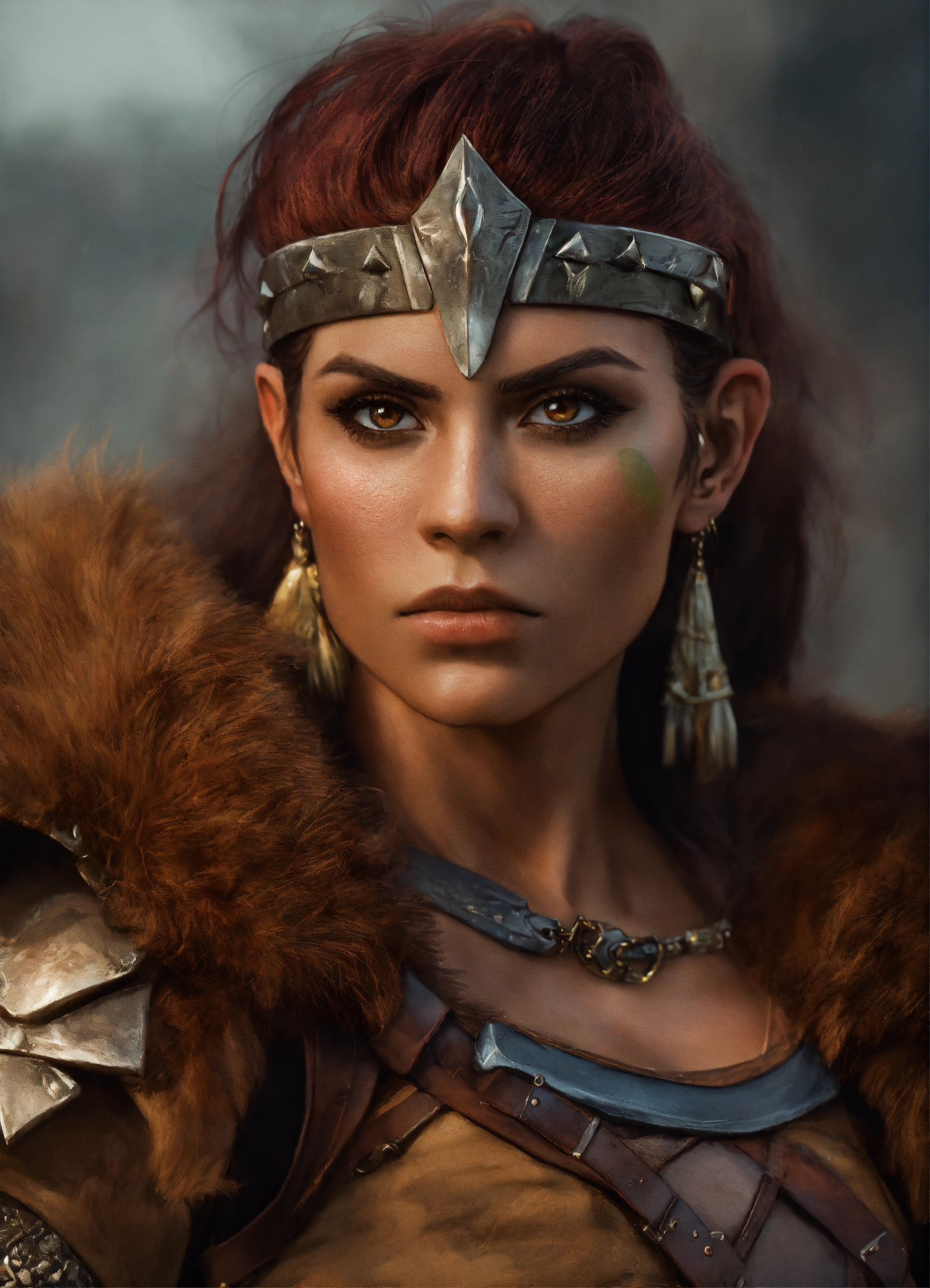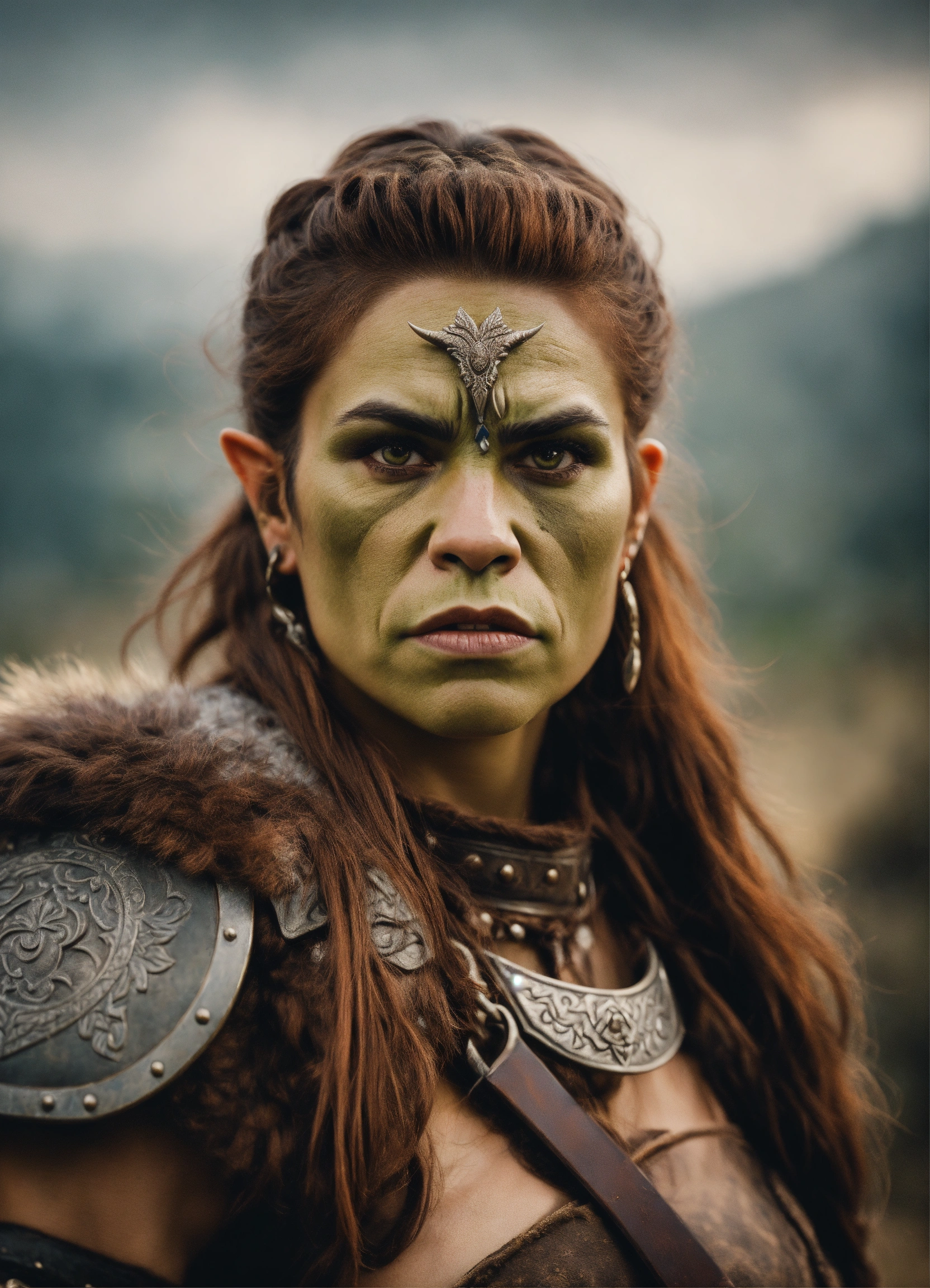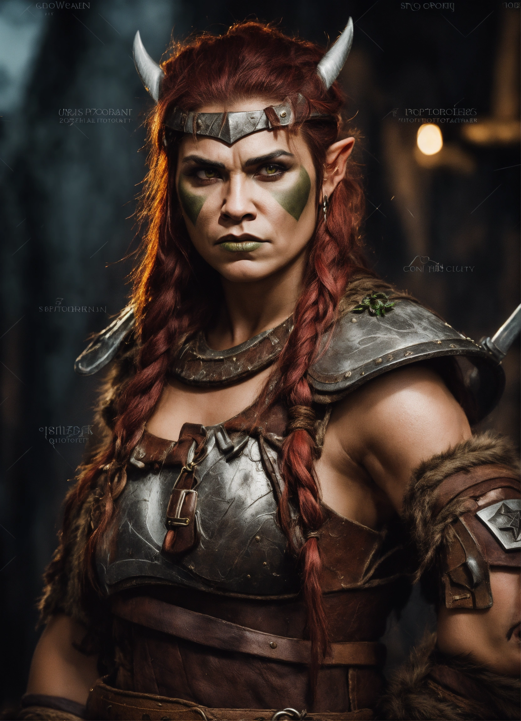 Photo quality portrait of female half-orc barbarian warrior with stern expression