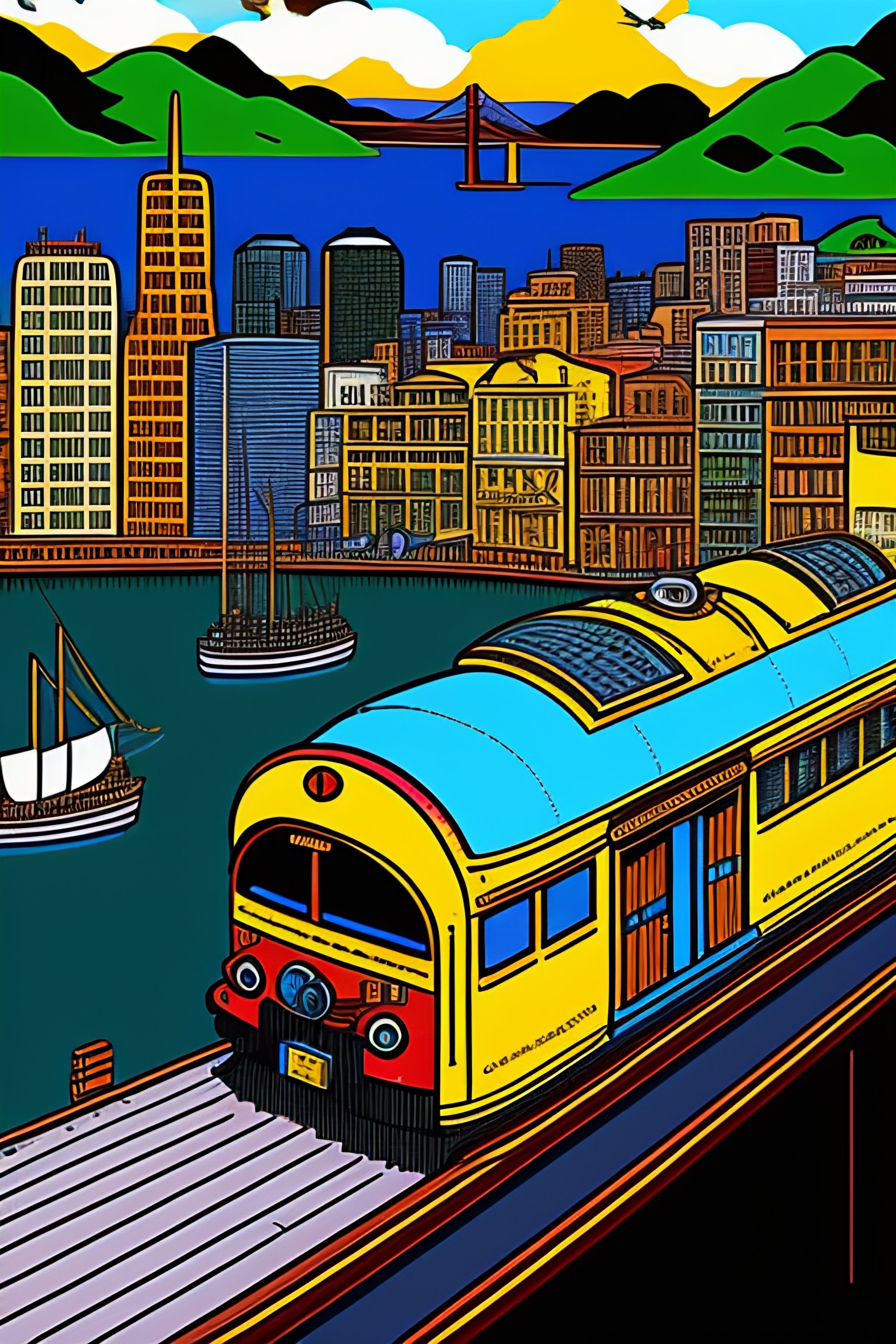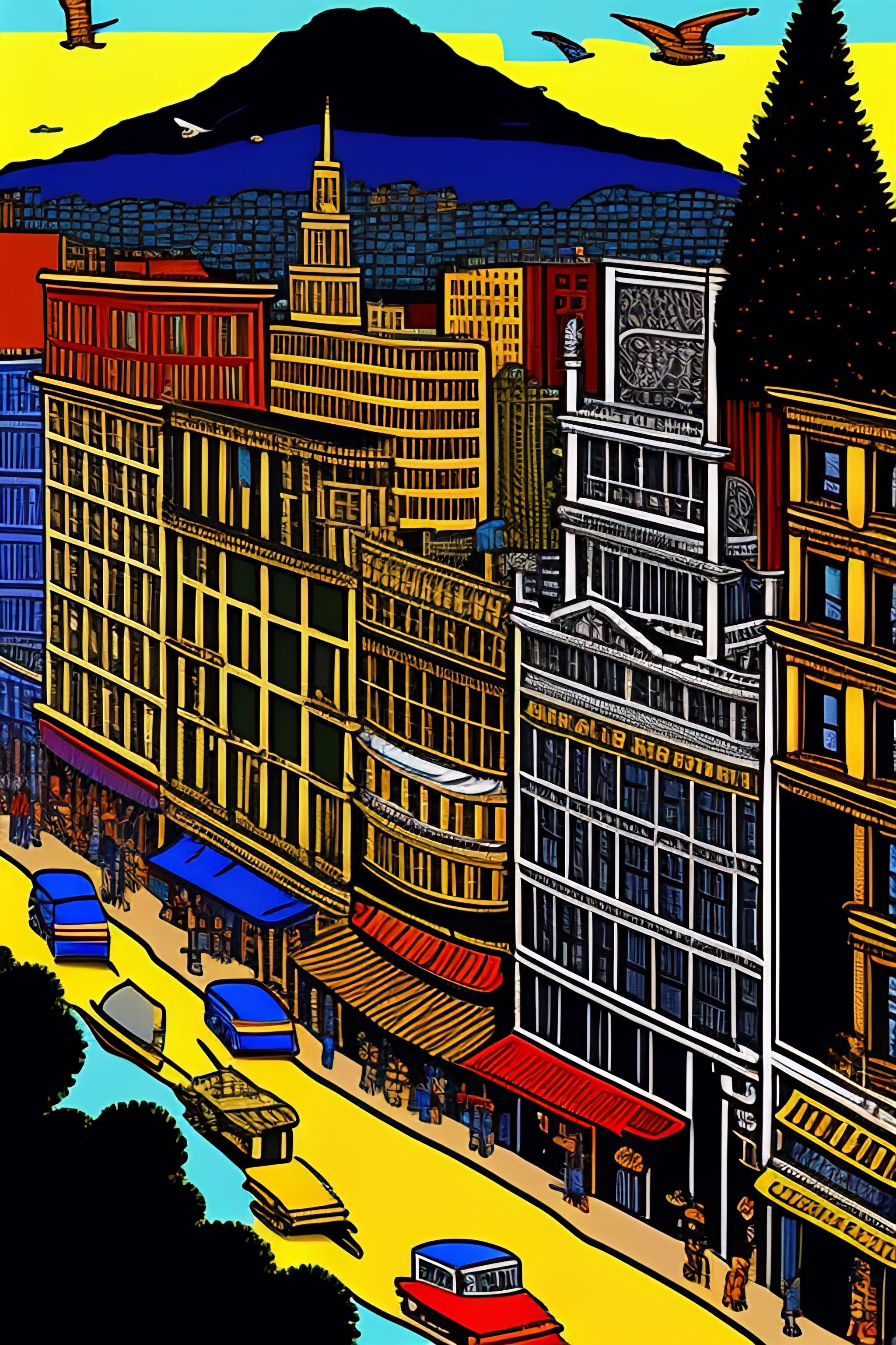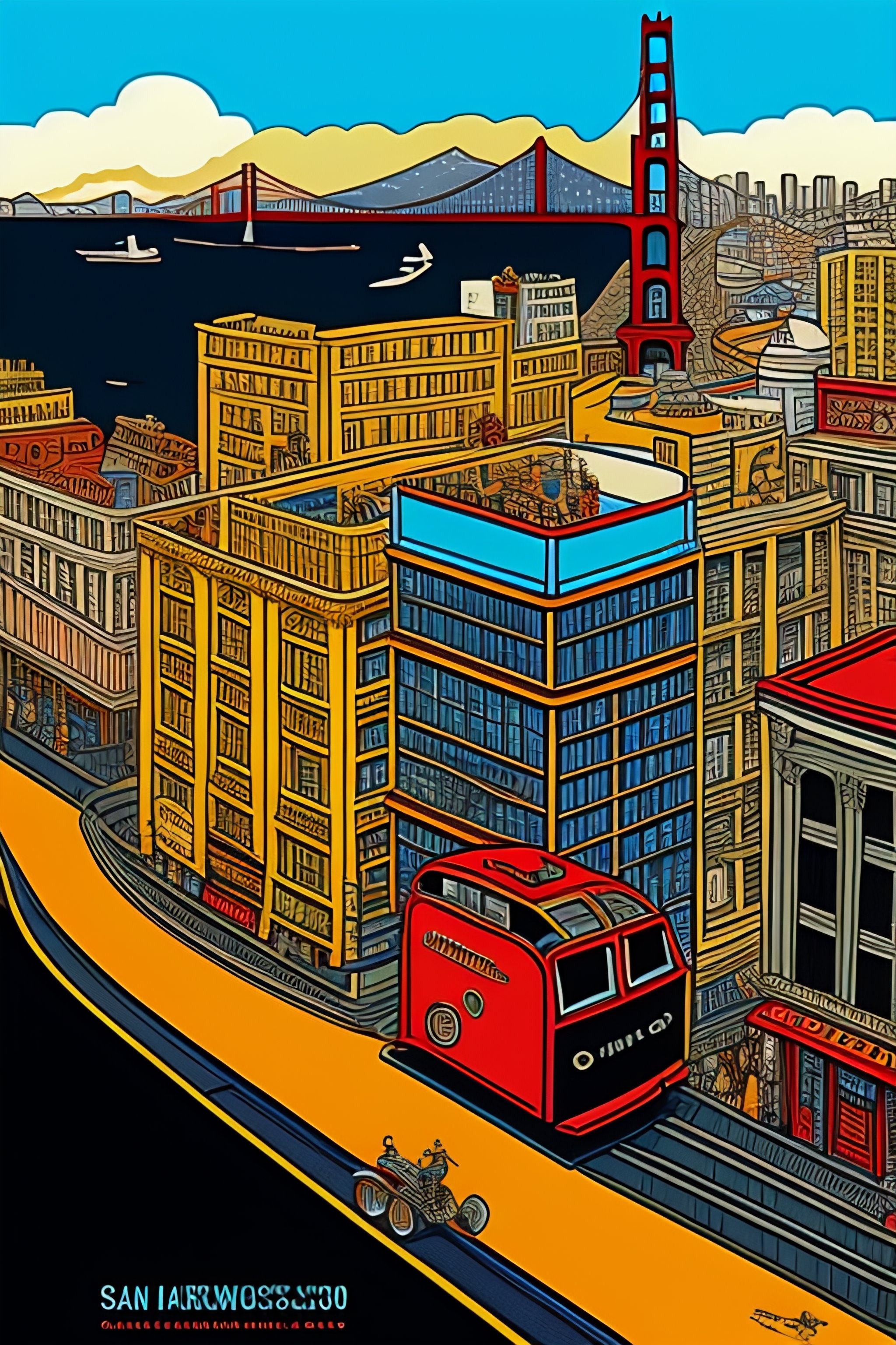 Maximalist san francisco, birds eye view, illustrated by hergé, style of tin tin comics, pen and ink pixel art