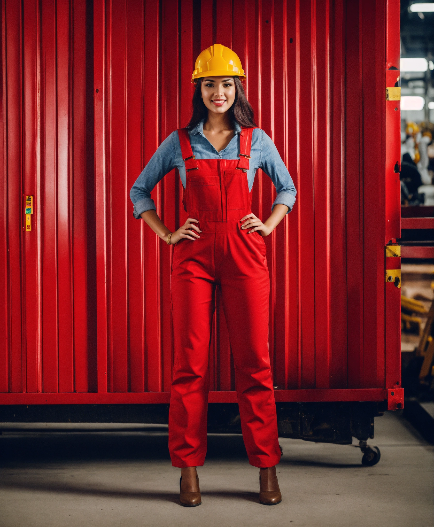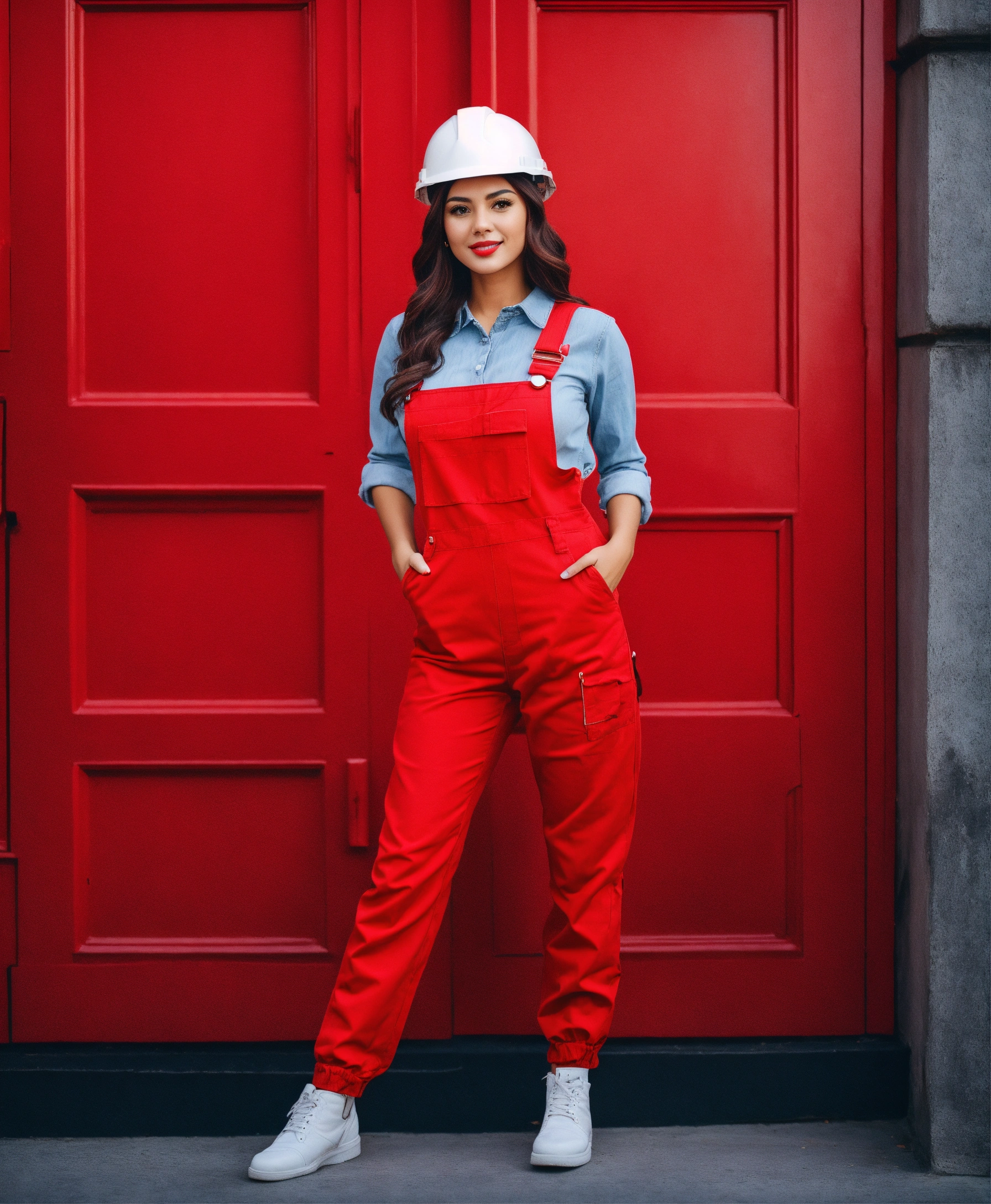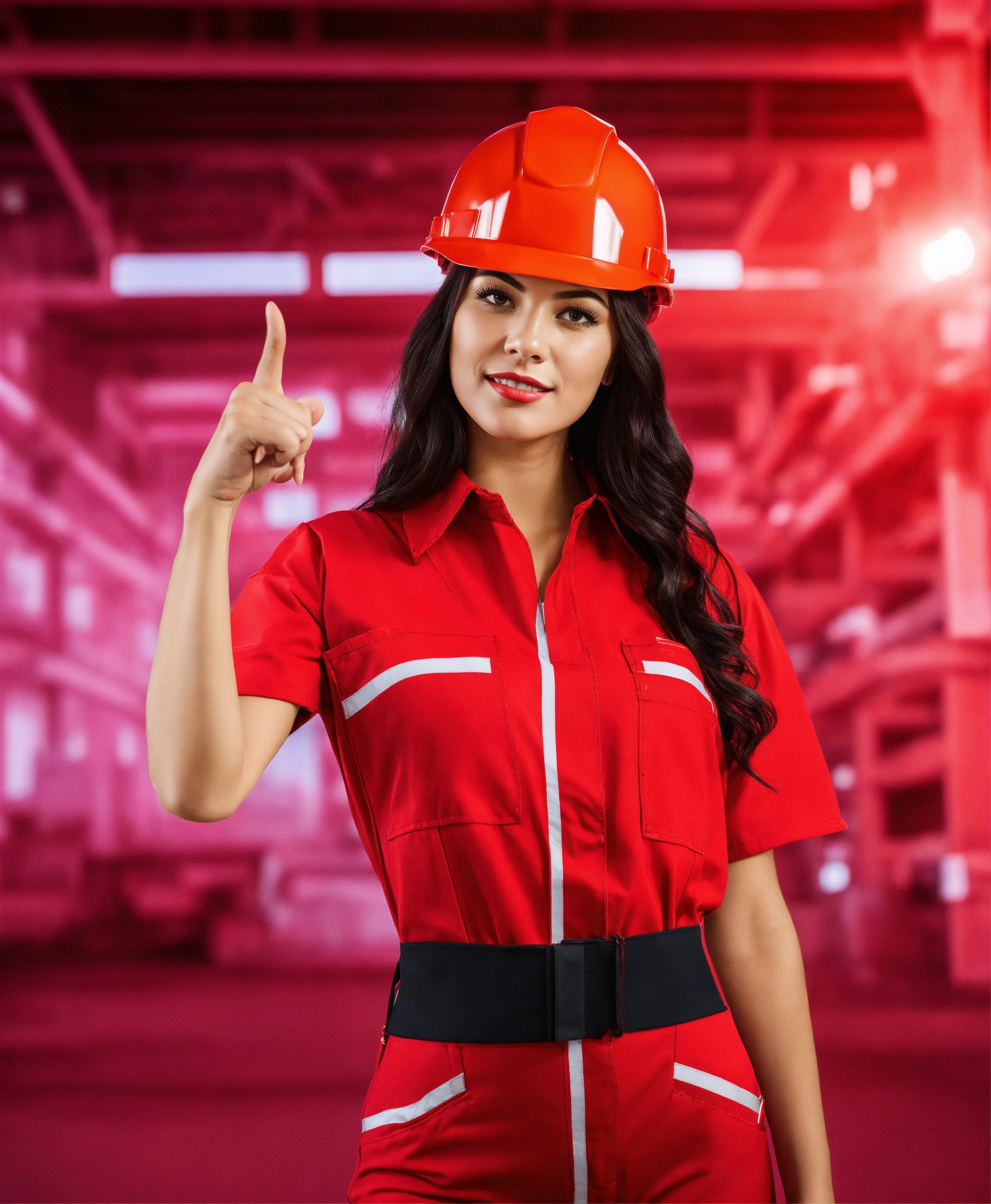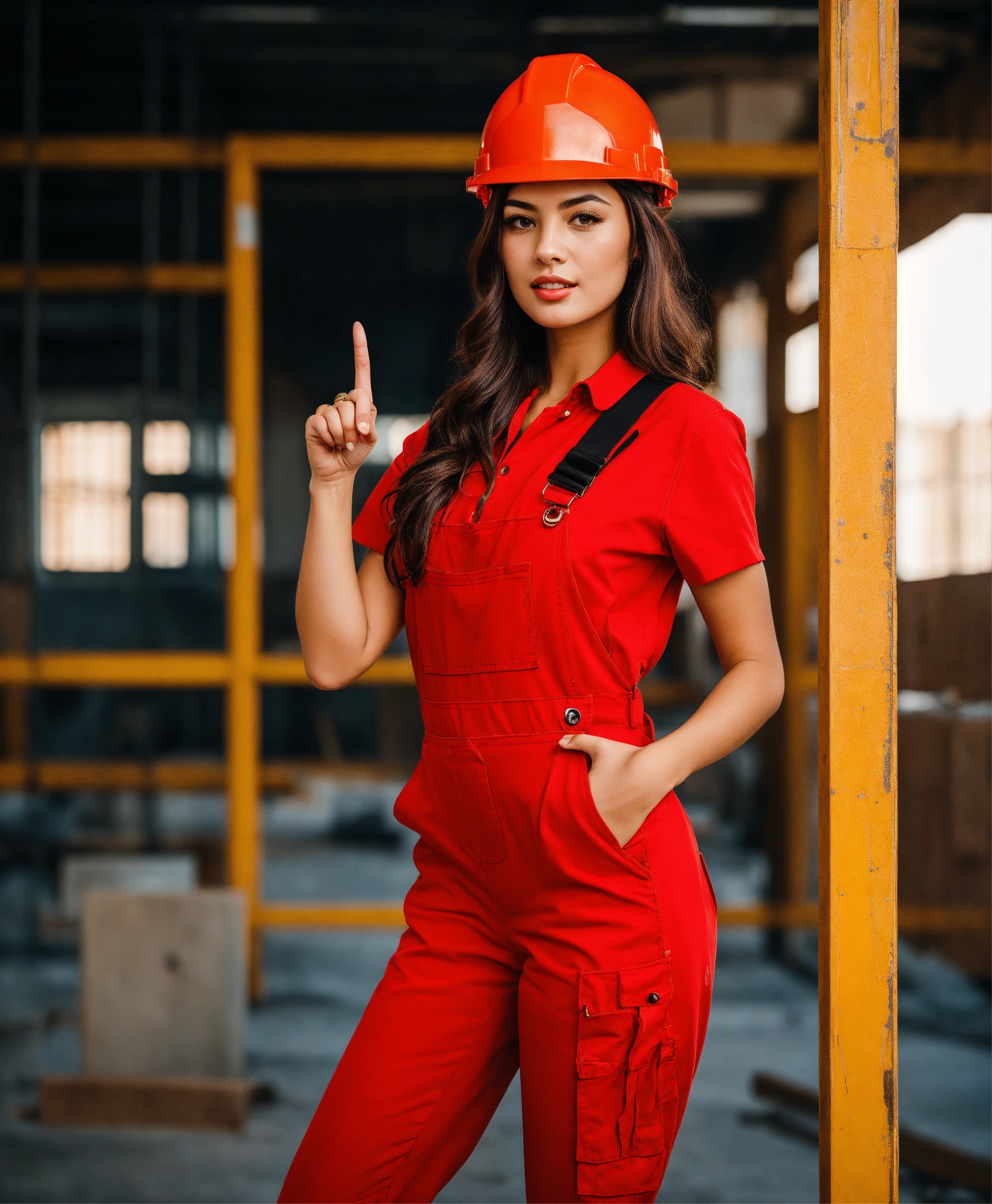 Beautiful woman in a red overall outfit and with a red construction helmet is pointing at the camera