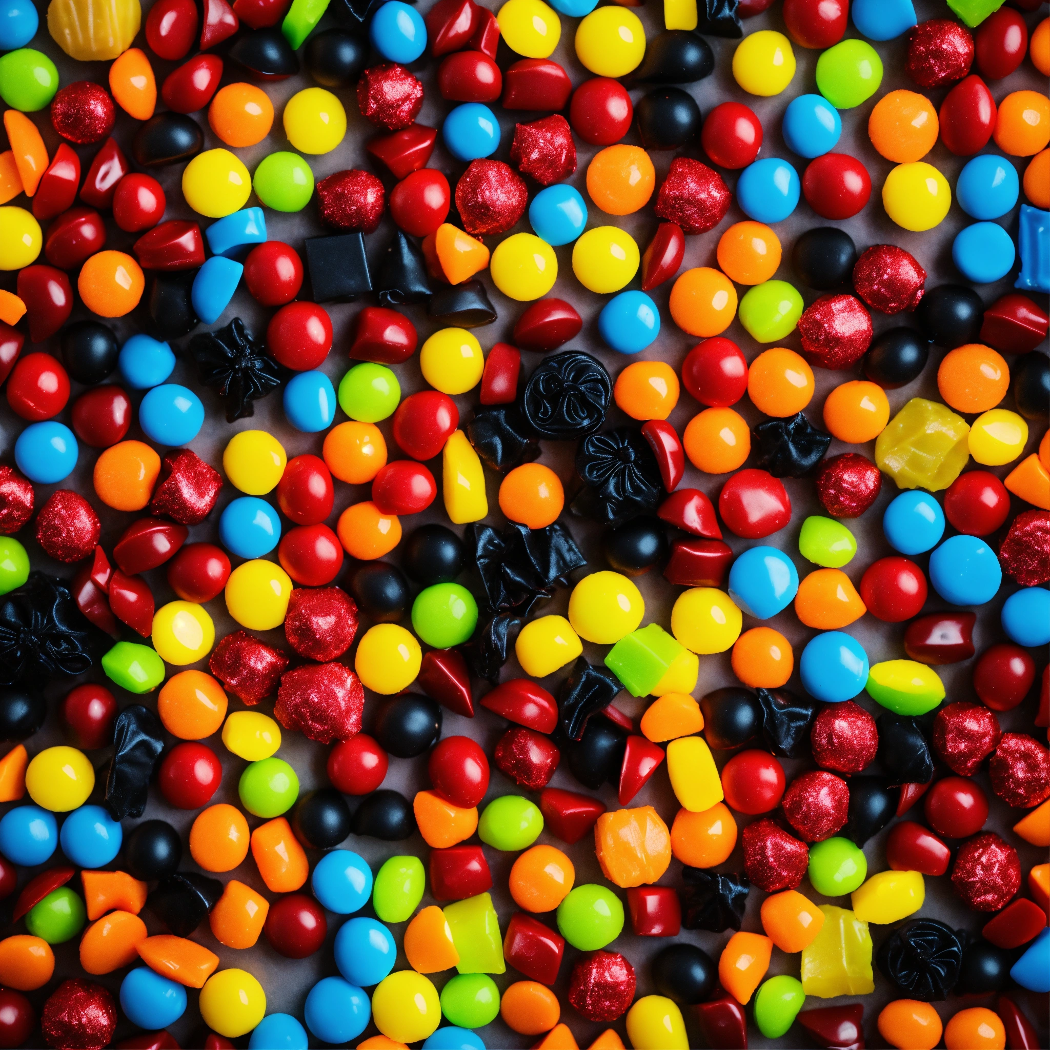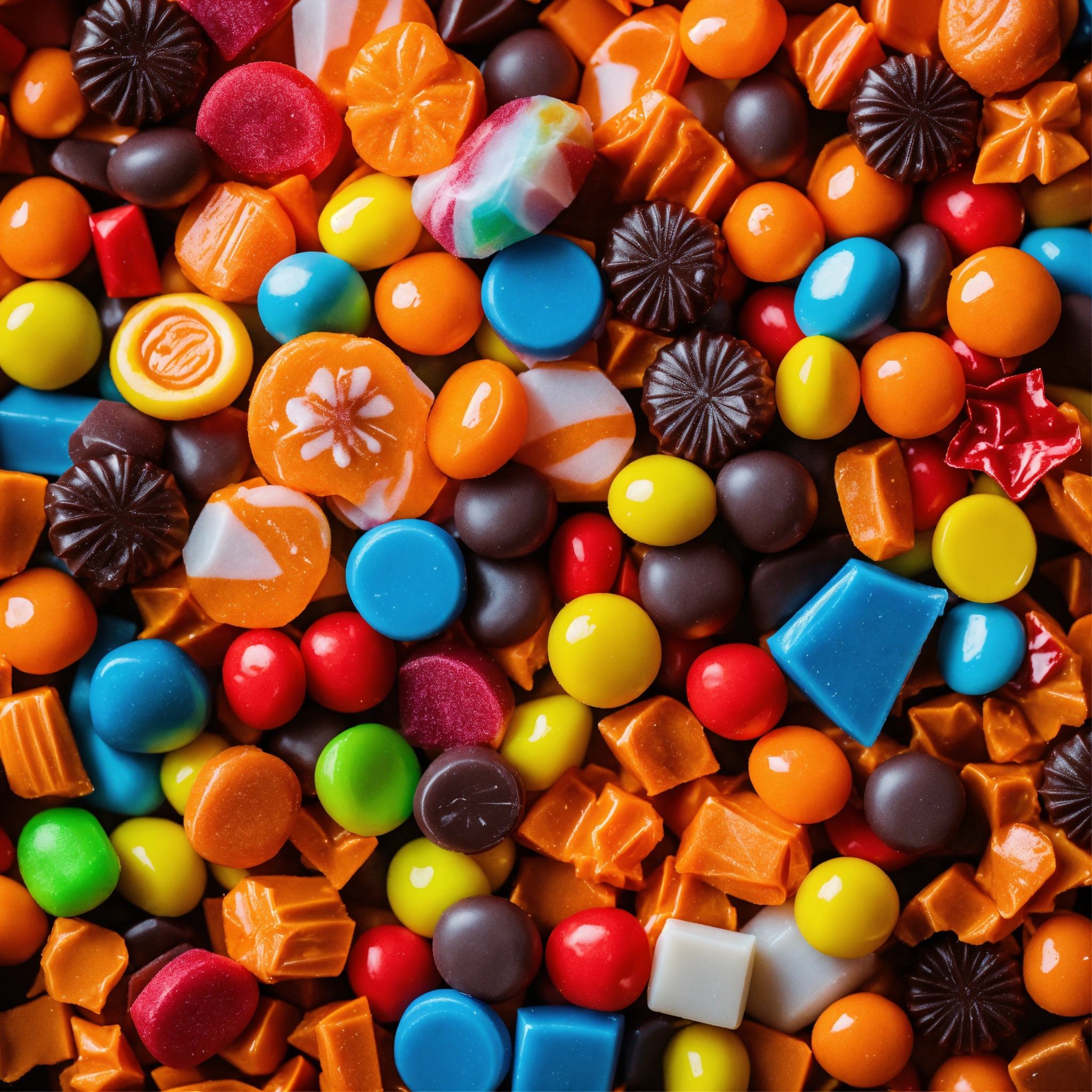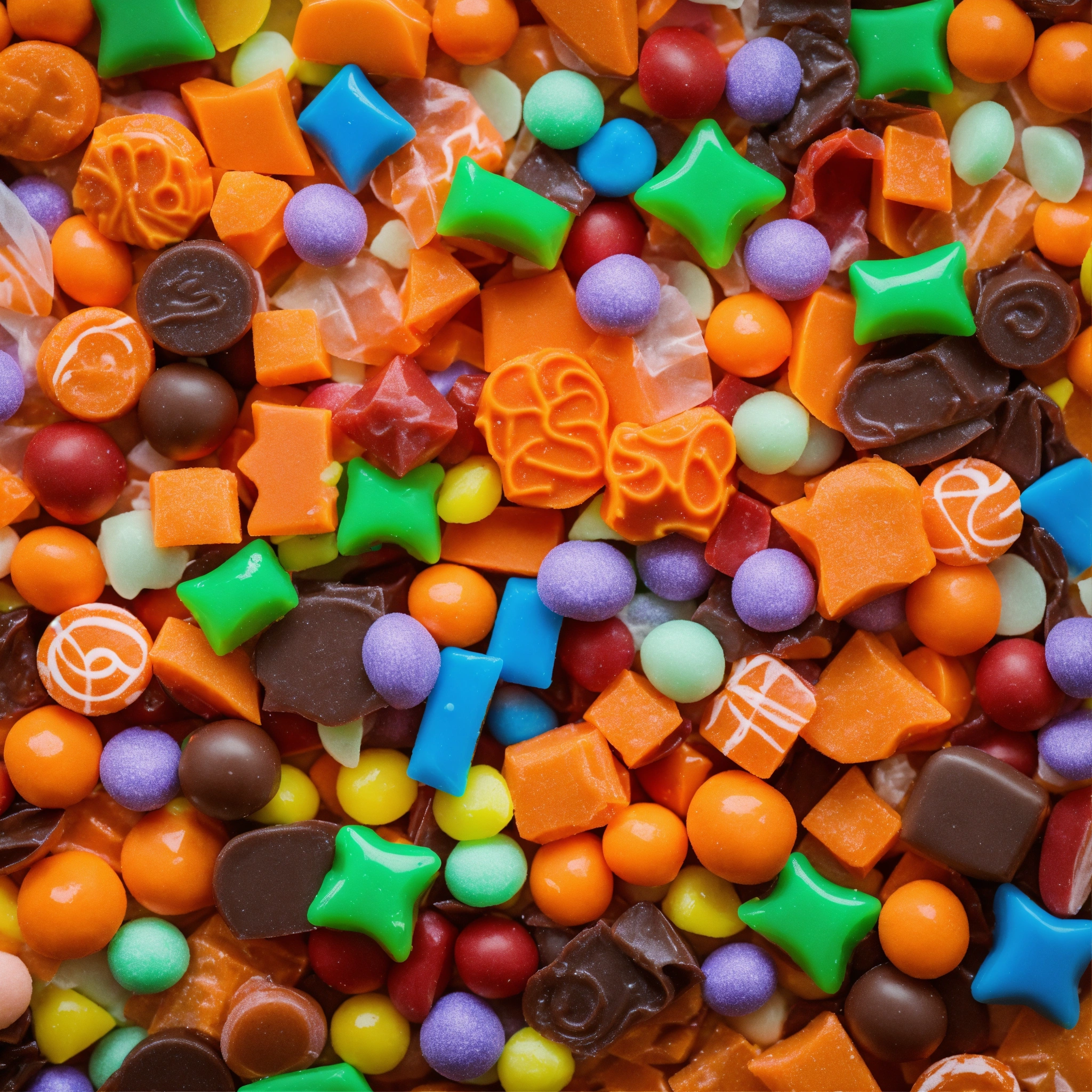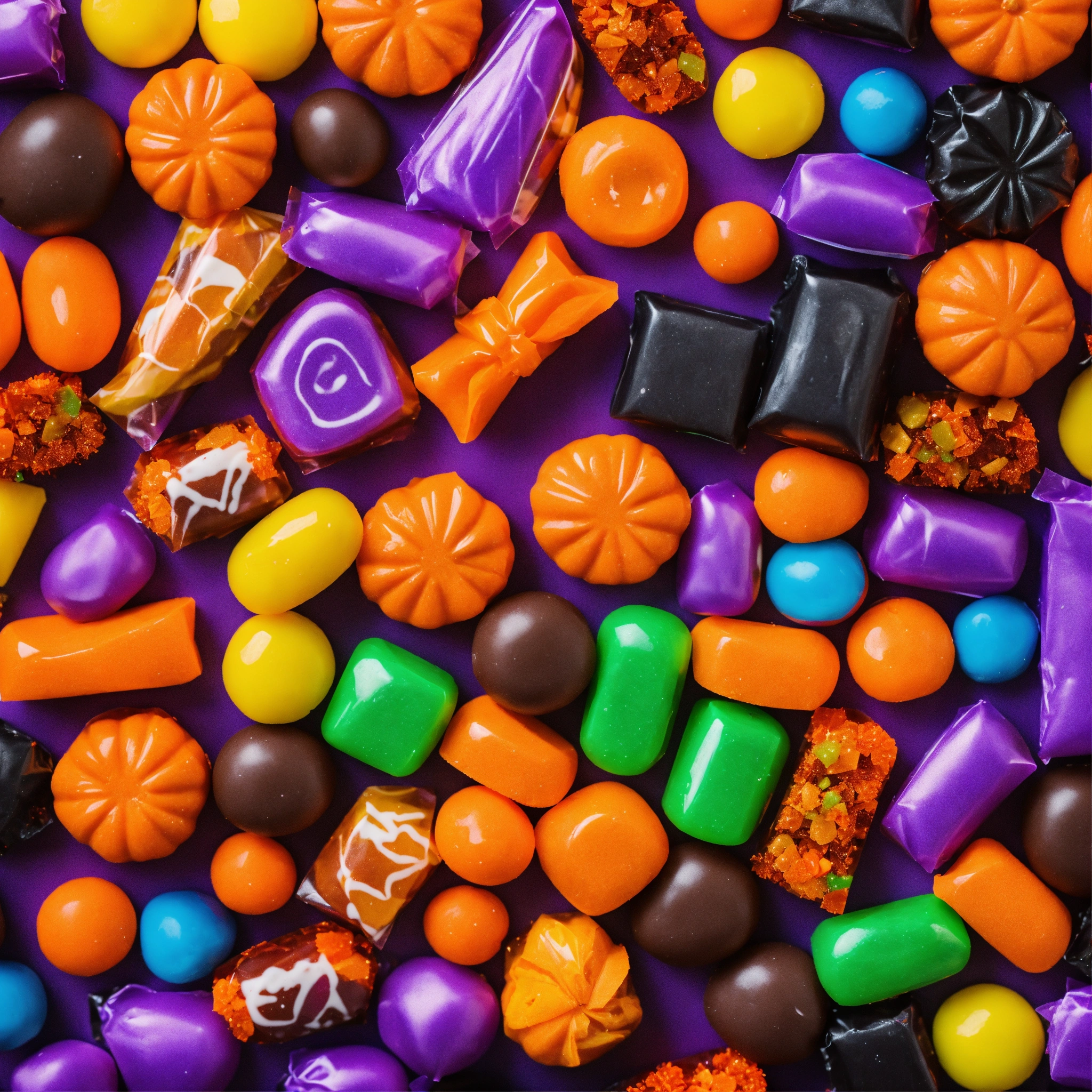 A pile of a variety of halloween candy, various colors, various shapes, rectangular candies in wrapping, top down looking at the pile, zoomed out
