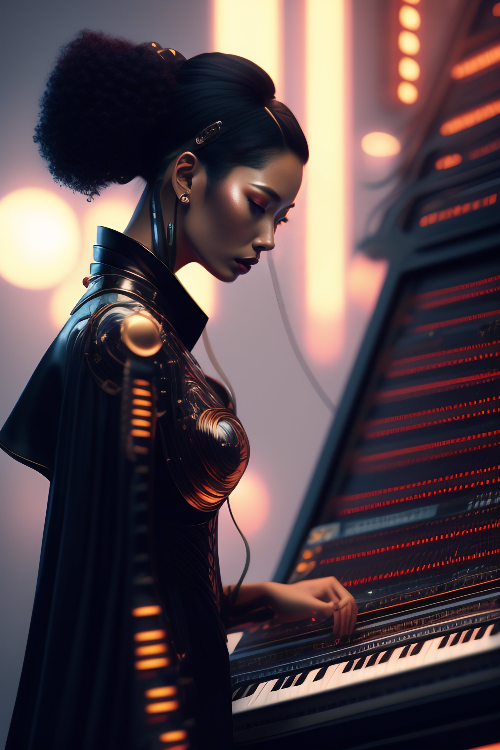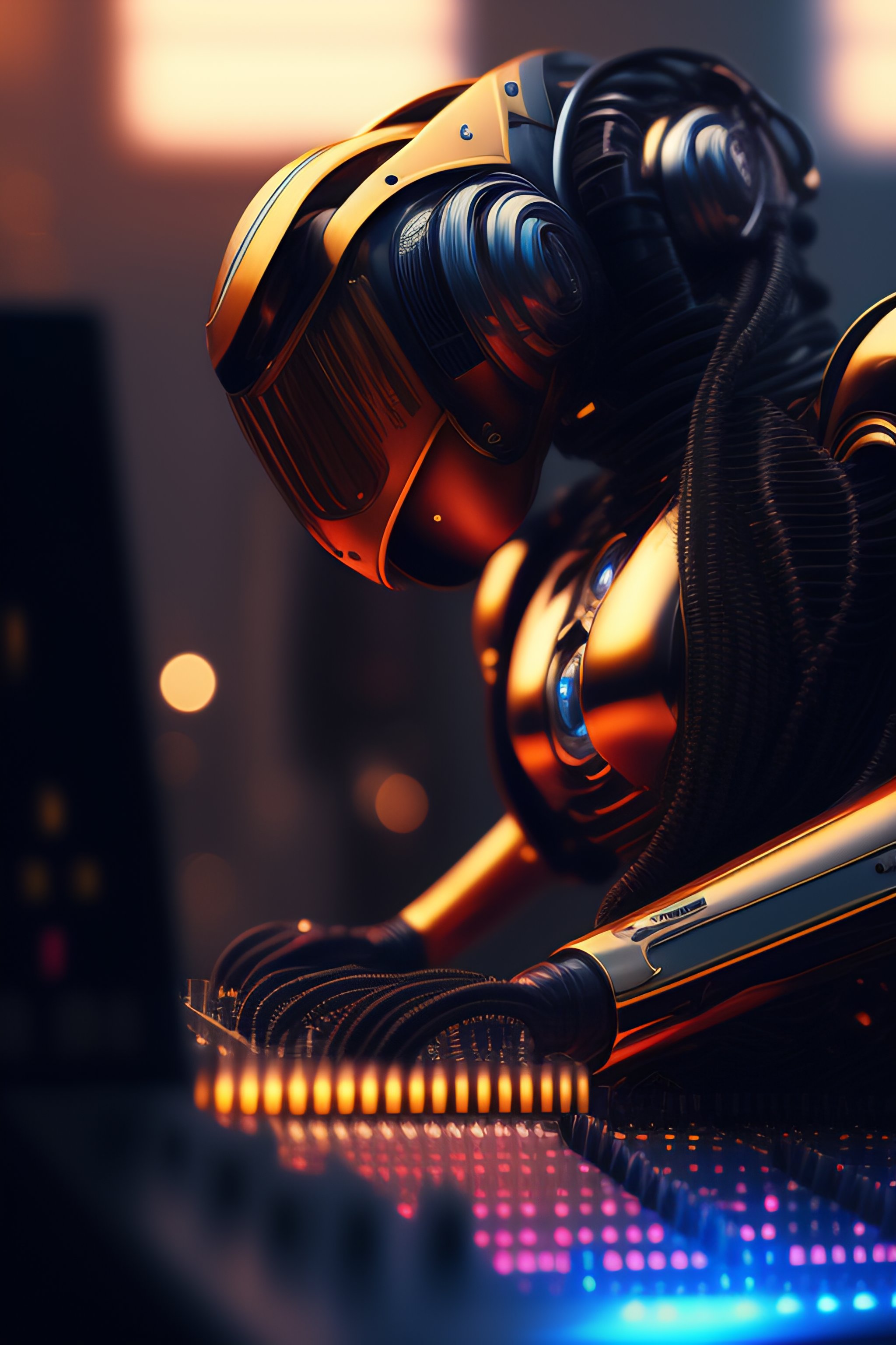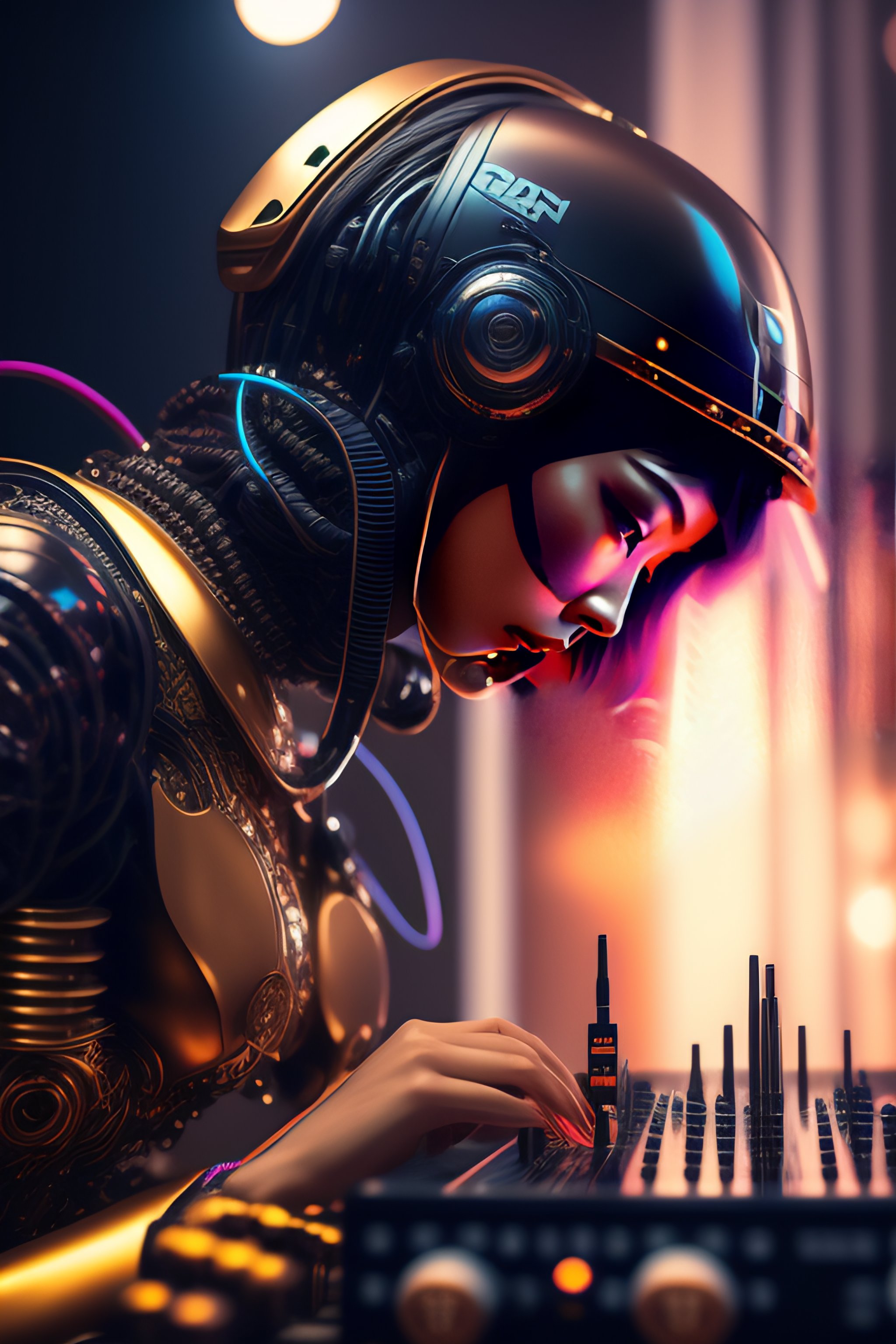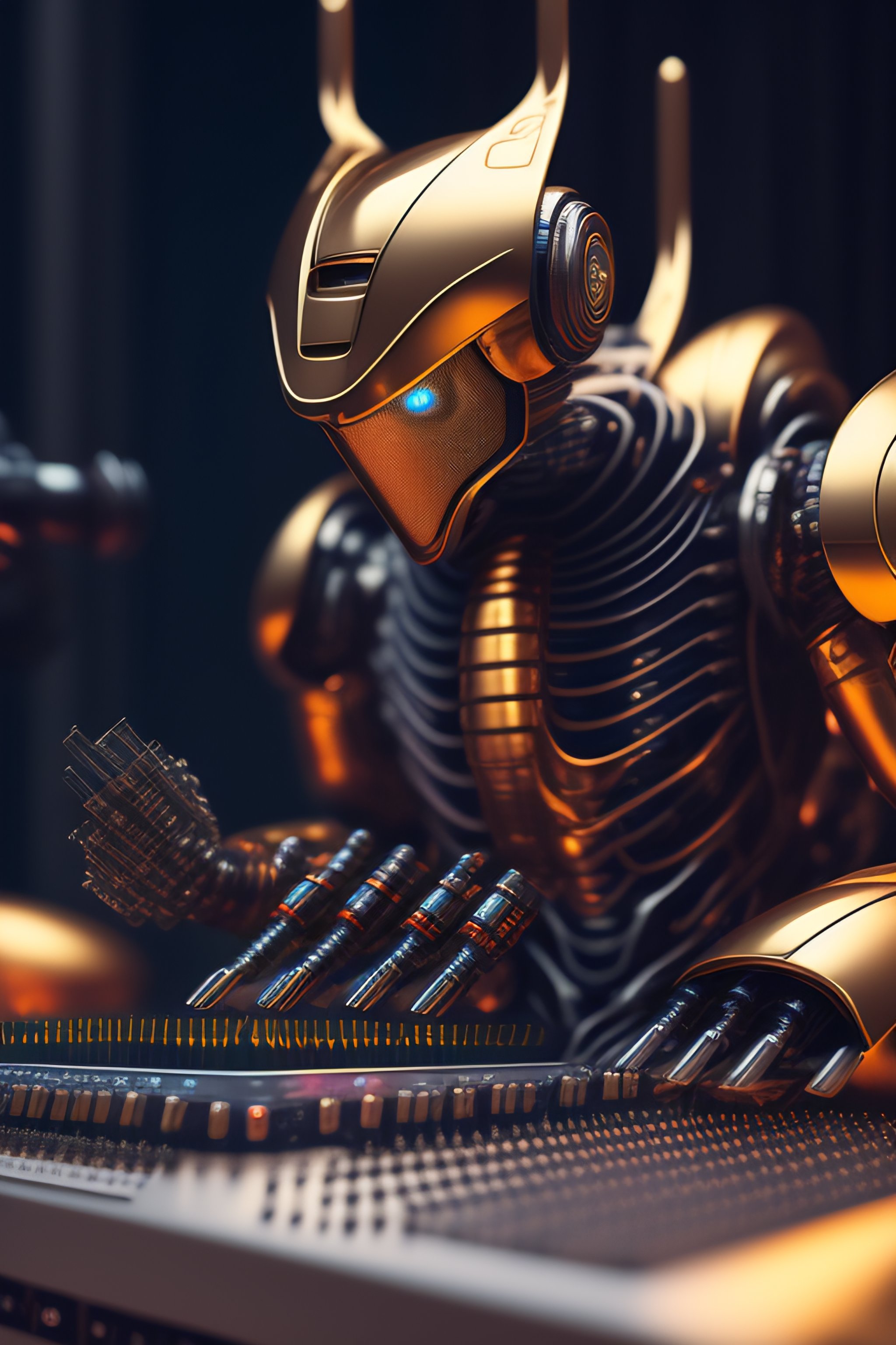 Robot making analog synth music, art by wagner kuroiwa tristan eaton, stanley artgermm, tom bagshaw, greg rutkowski, carne griffiths, ayami kojima, beksinski, giger, trending on deviantart, photorealistic, vray, hdr, hyper detailed, dramatic lighting, octane render, weta digital, 3 d sculpture