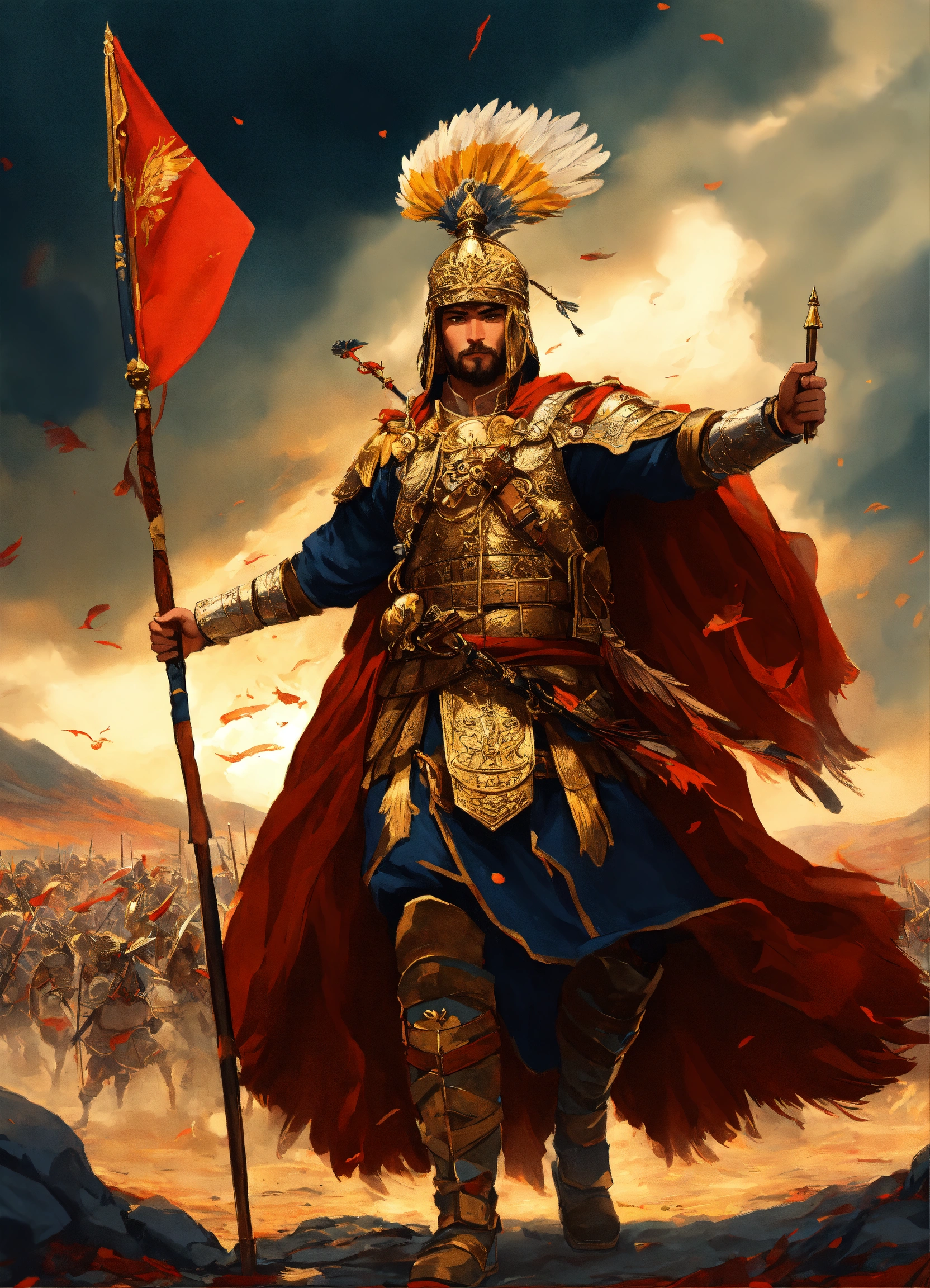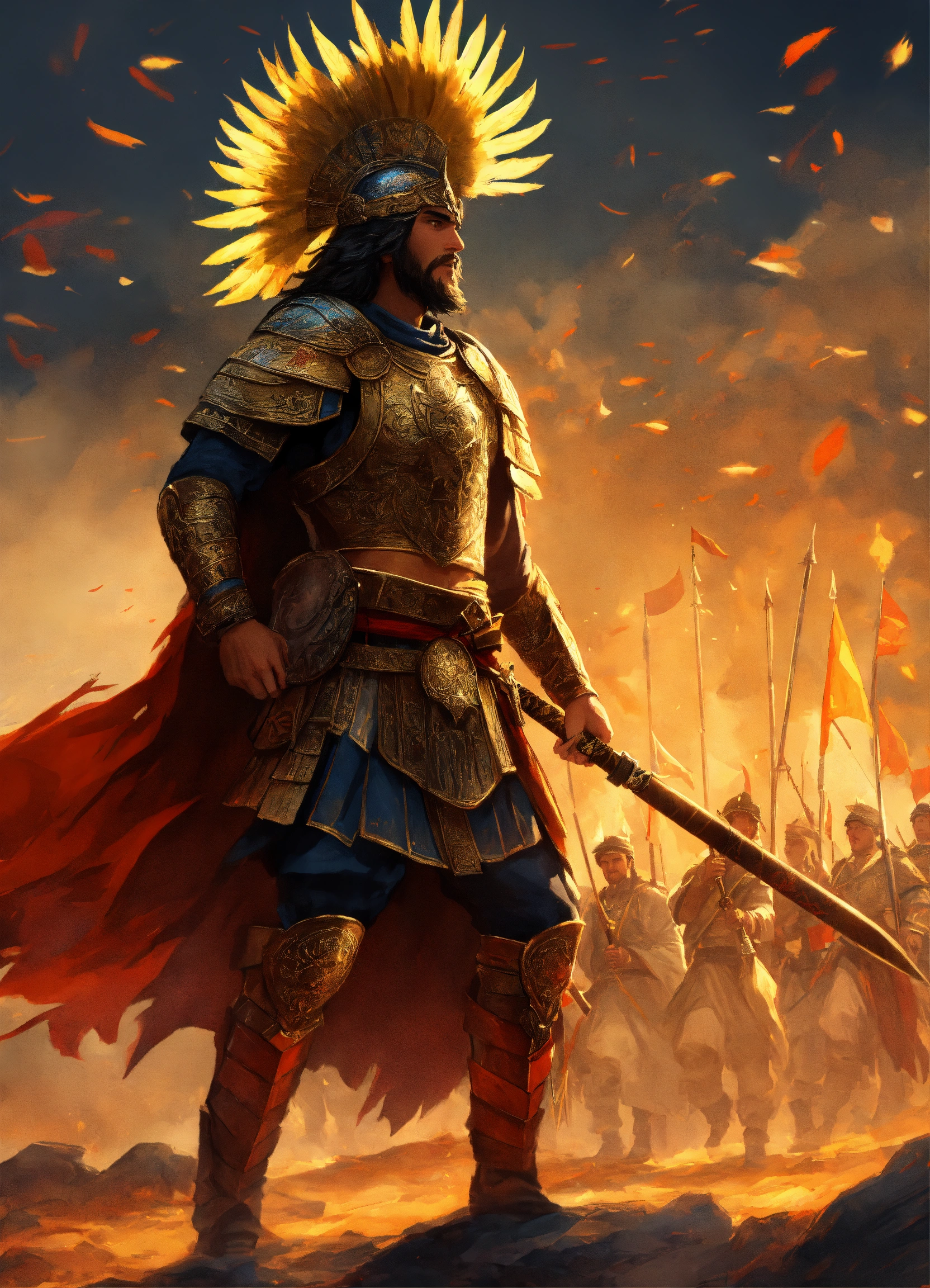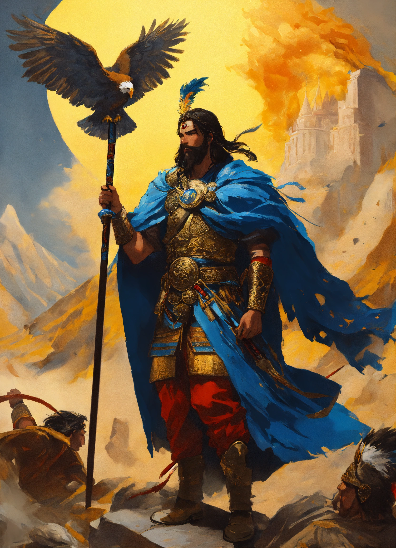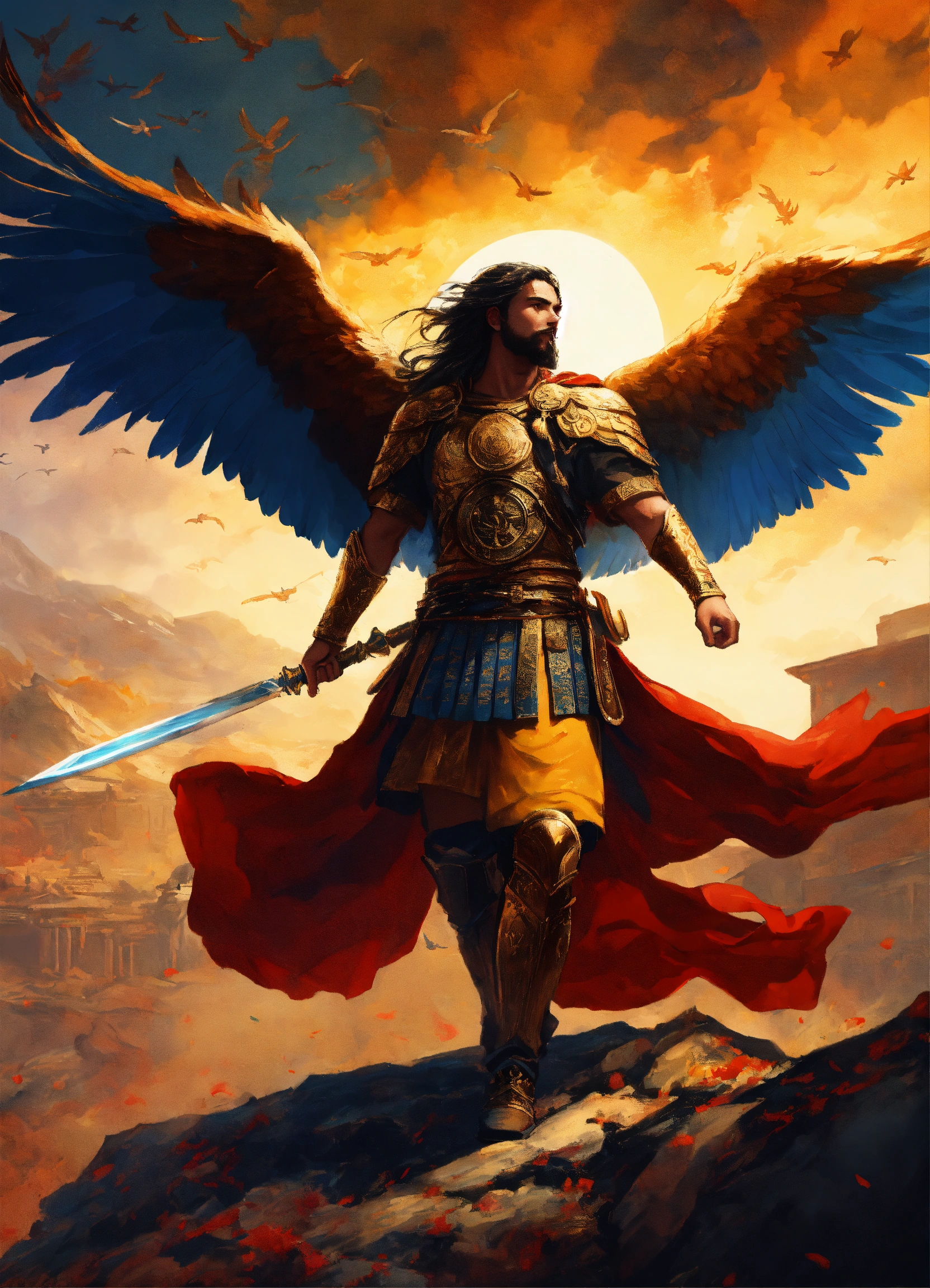 In the center of the image, ninurta is depicted wearing a battle robe and with eagle feather wings. he carries a war spear in one hand and a flag symbolizing victory in the other. background in the background, the chaos of war and the joy of victory can be reflected. a depiction of the battlefield or a moment of victory at the end of the war may be used. colors warm, bold colors can be preferred. colors such as dark blue, golden yellow and red may reflect the warrior and godly nature of the god ninurta.8k