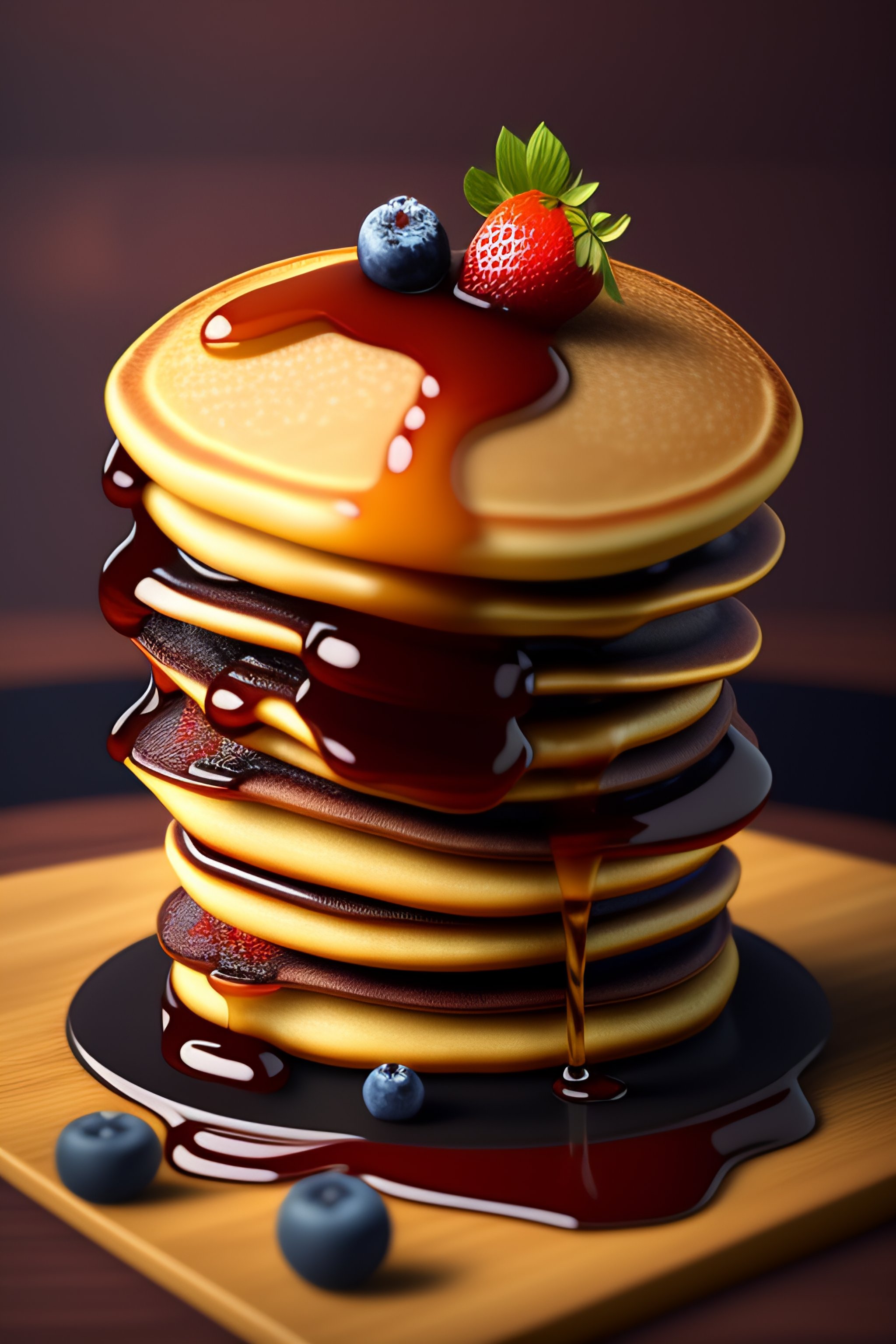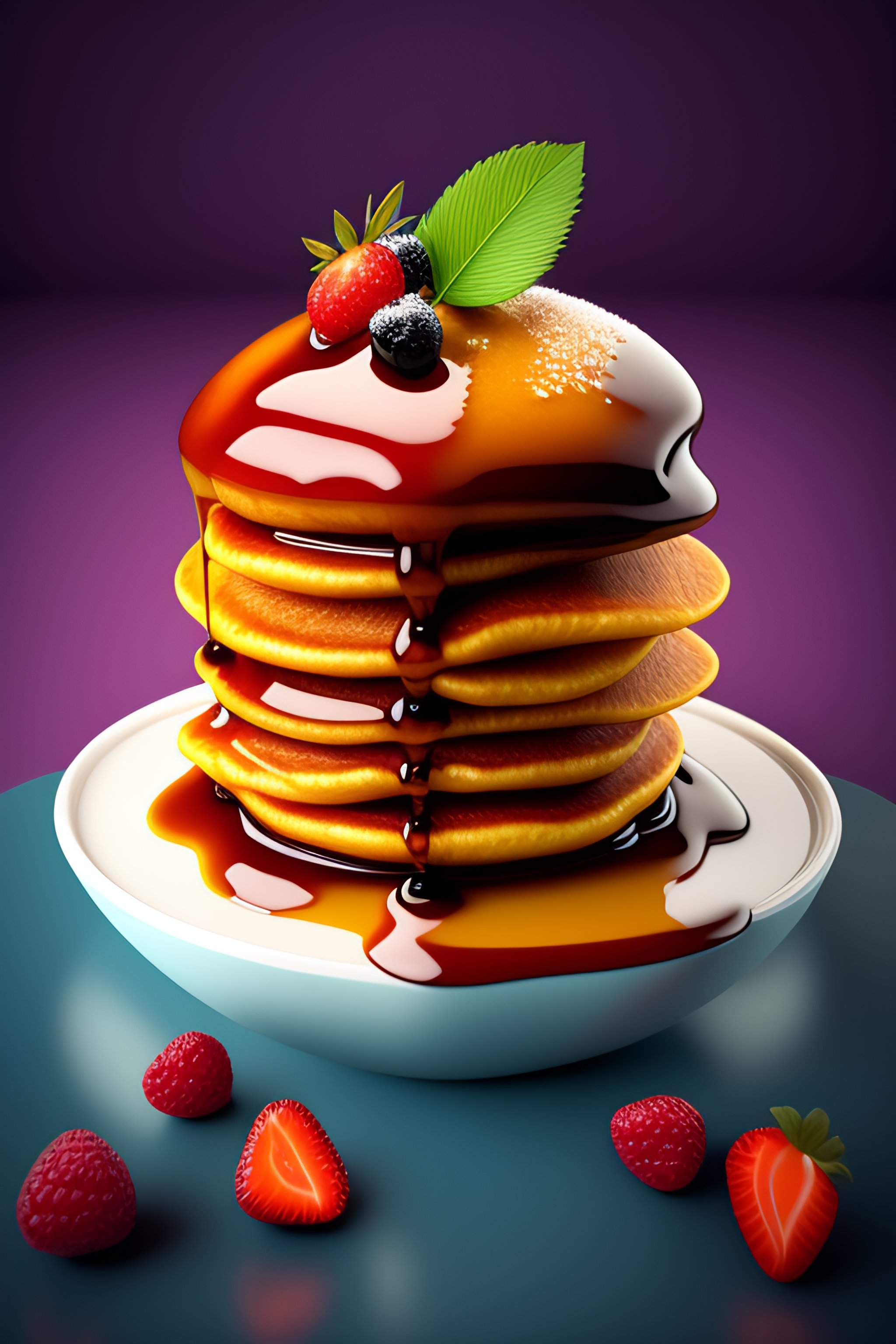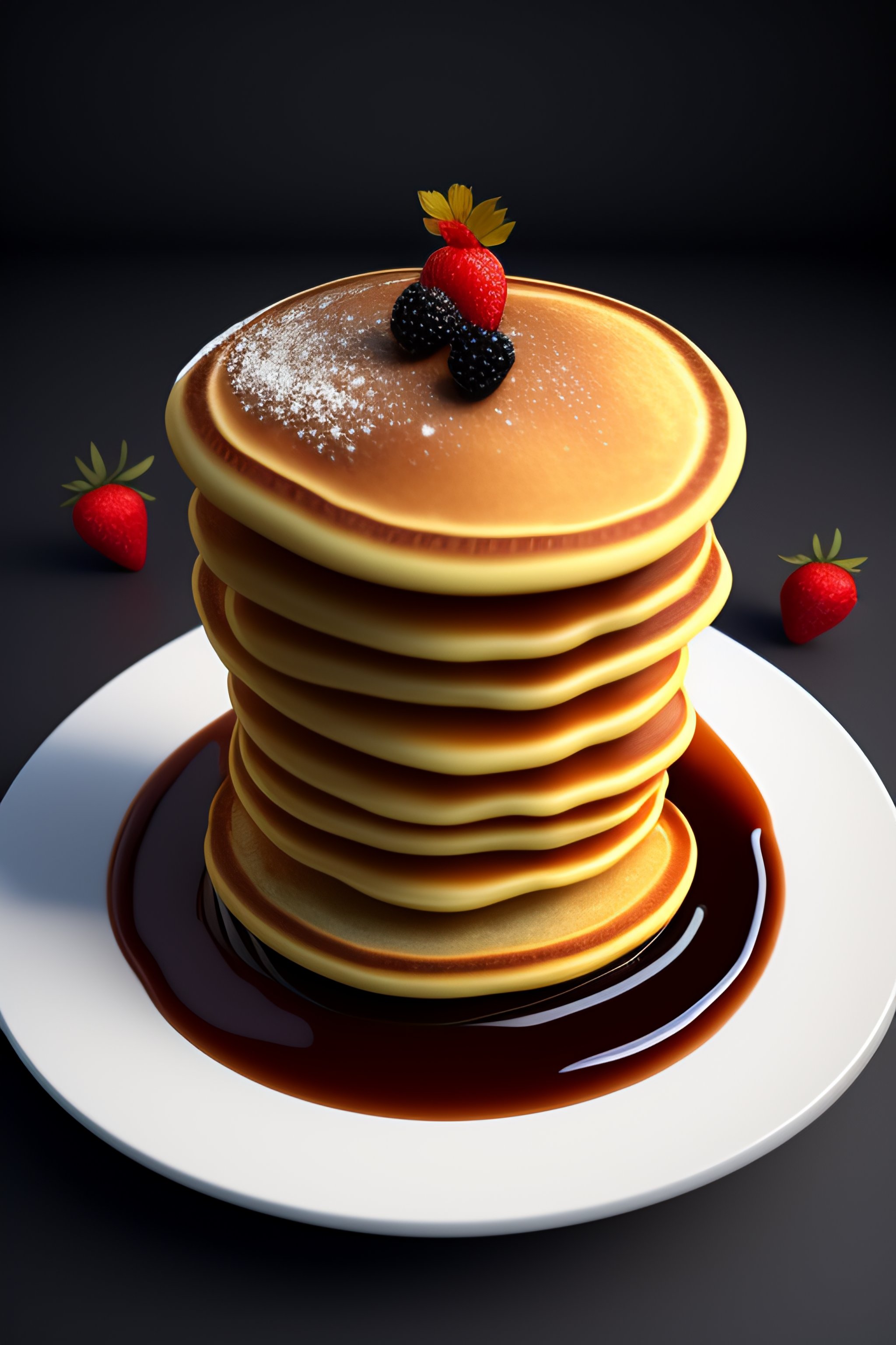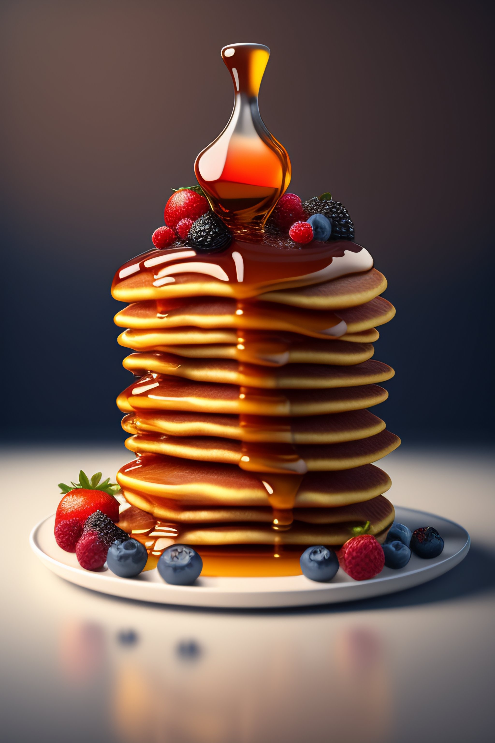 Stack of pancakes covered in syrup and berries, a 3d render by daryush shokof, cg society contest winner, photorealism, behance hd, sketchfab, vray