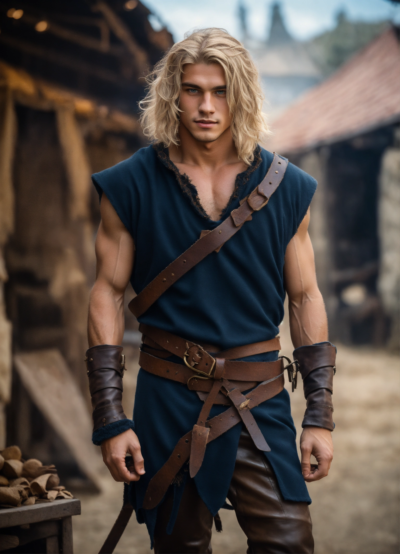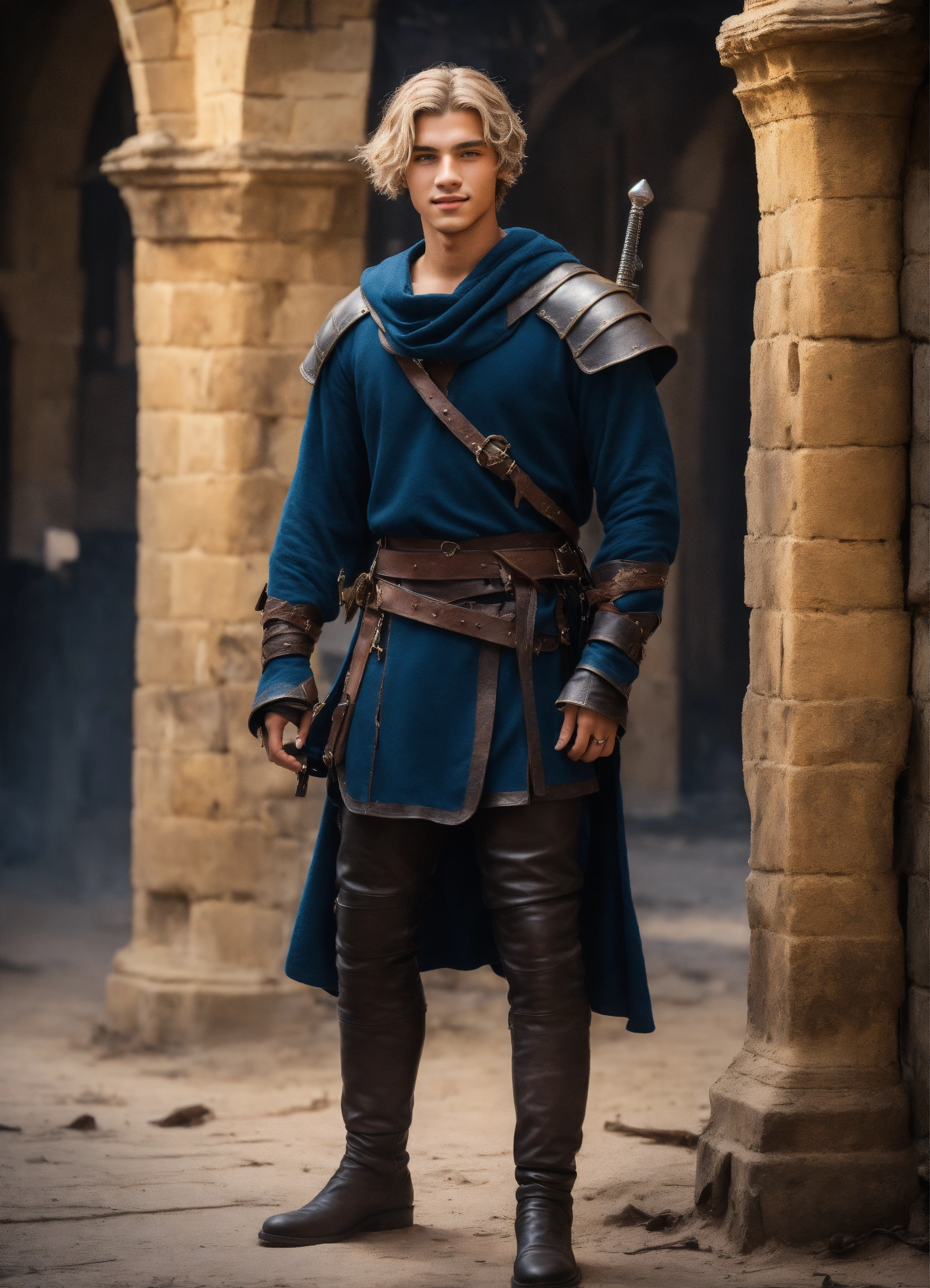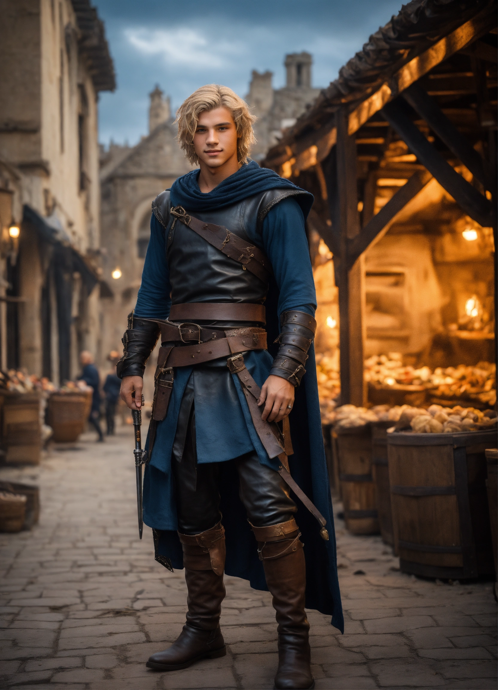 A fantasy male assassin, friendly, happy, muscular, 16-year-old with dark blue eyes and sandy-coloured hair. medieval black tunic and leather trousers. full-bodied picture. abandoned medieval market background. 8k