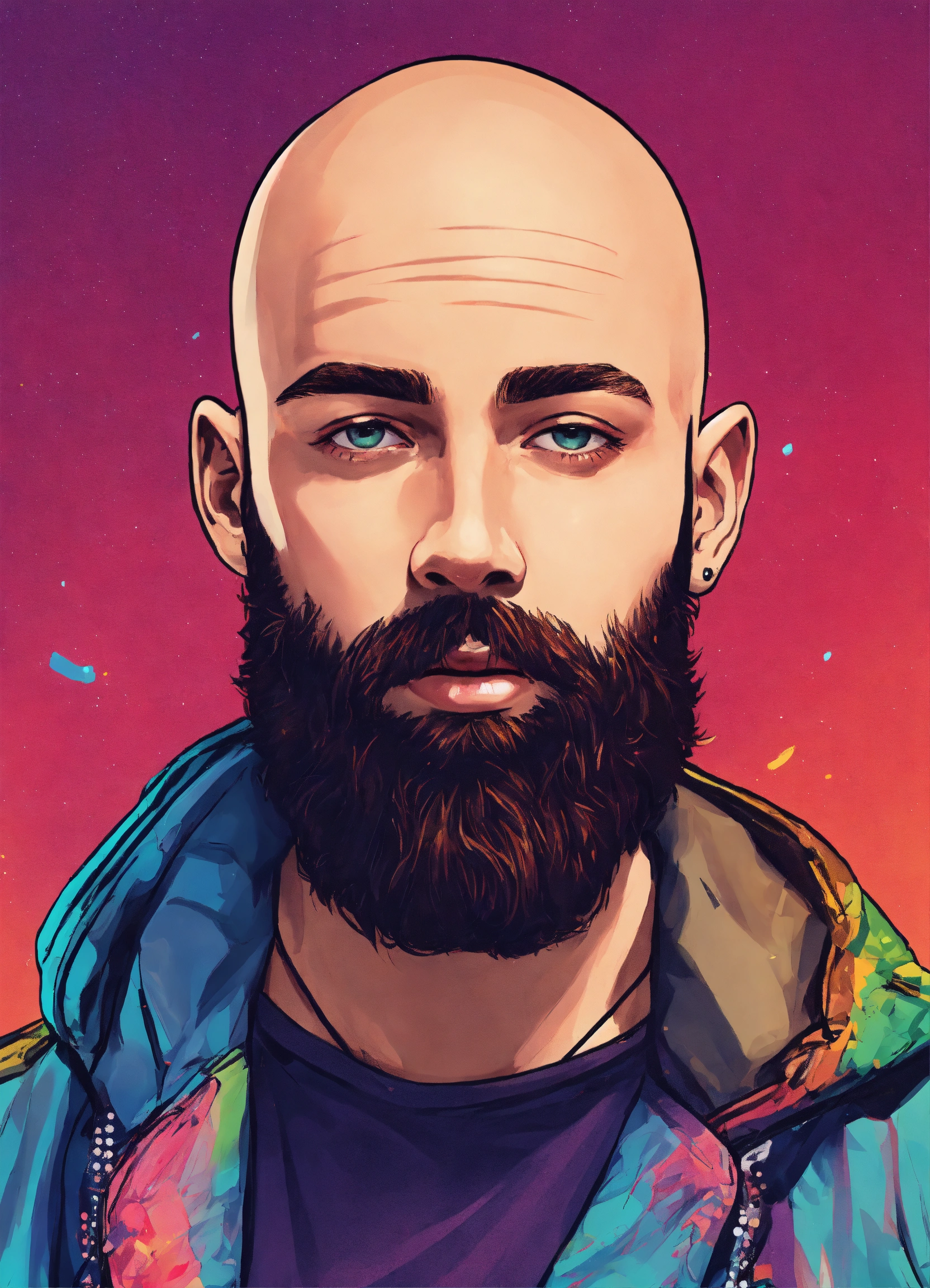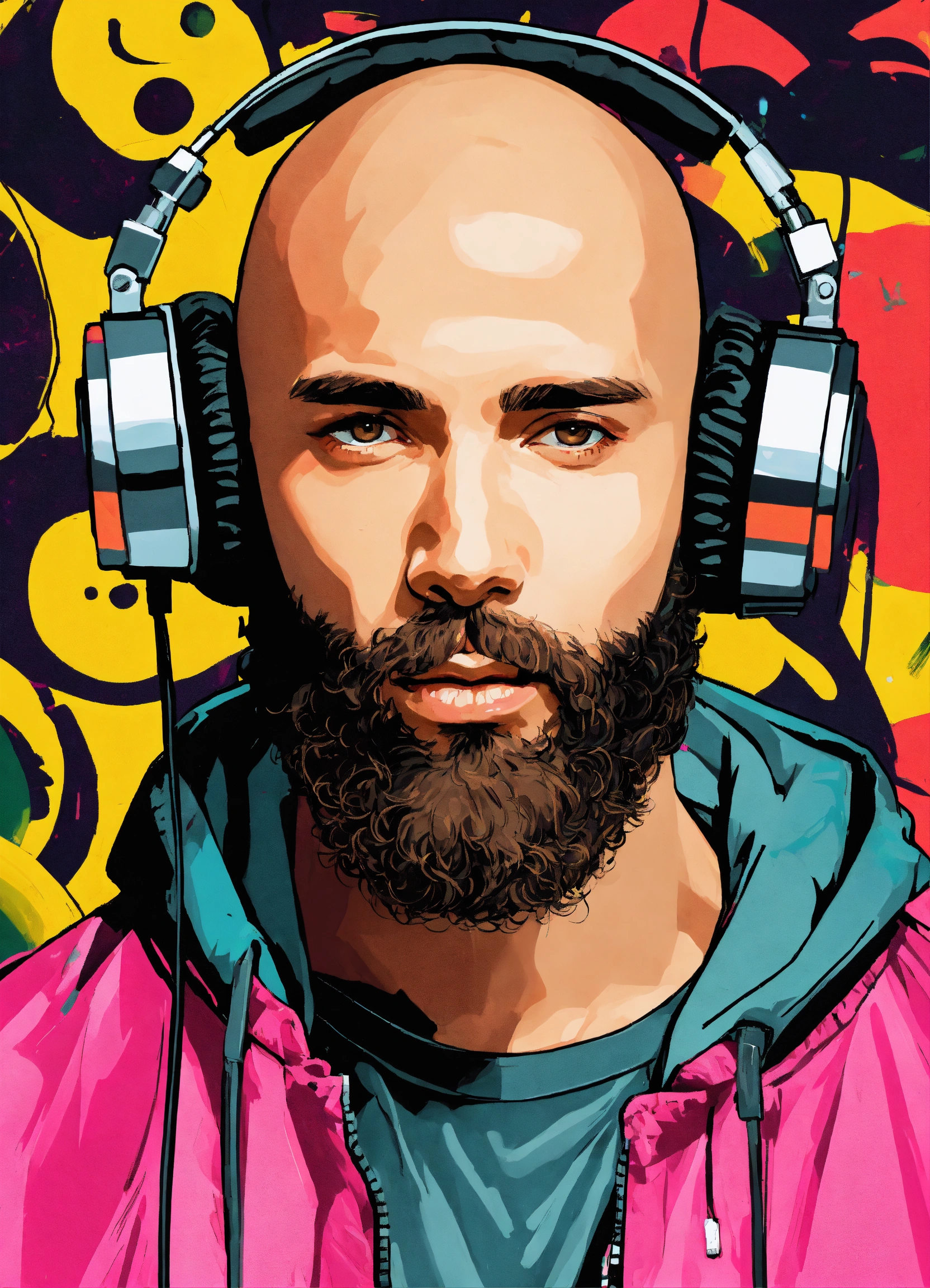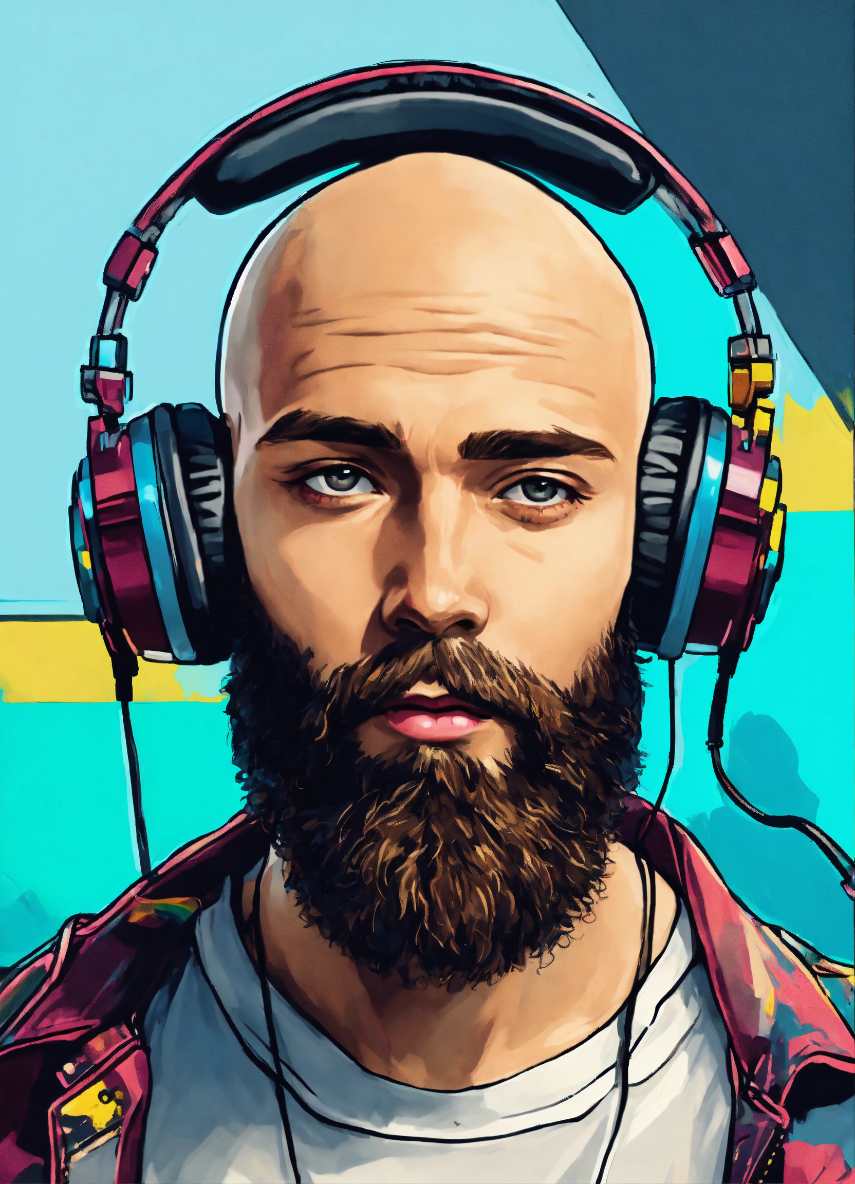 A young man bald head man with beard half body in high quality, popular beauty pinups in a variety of styles and colours, mostly pop art and comic style, 8k modern day the pioneer ddj-1000srt serato dj controller provides 4 channels of dj performance control and deep integration with serato dj
