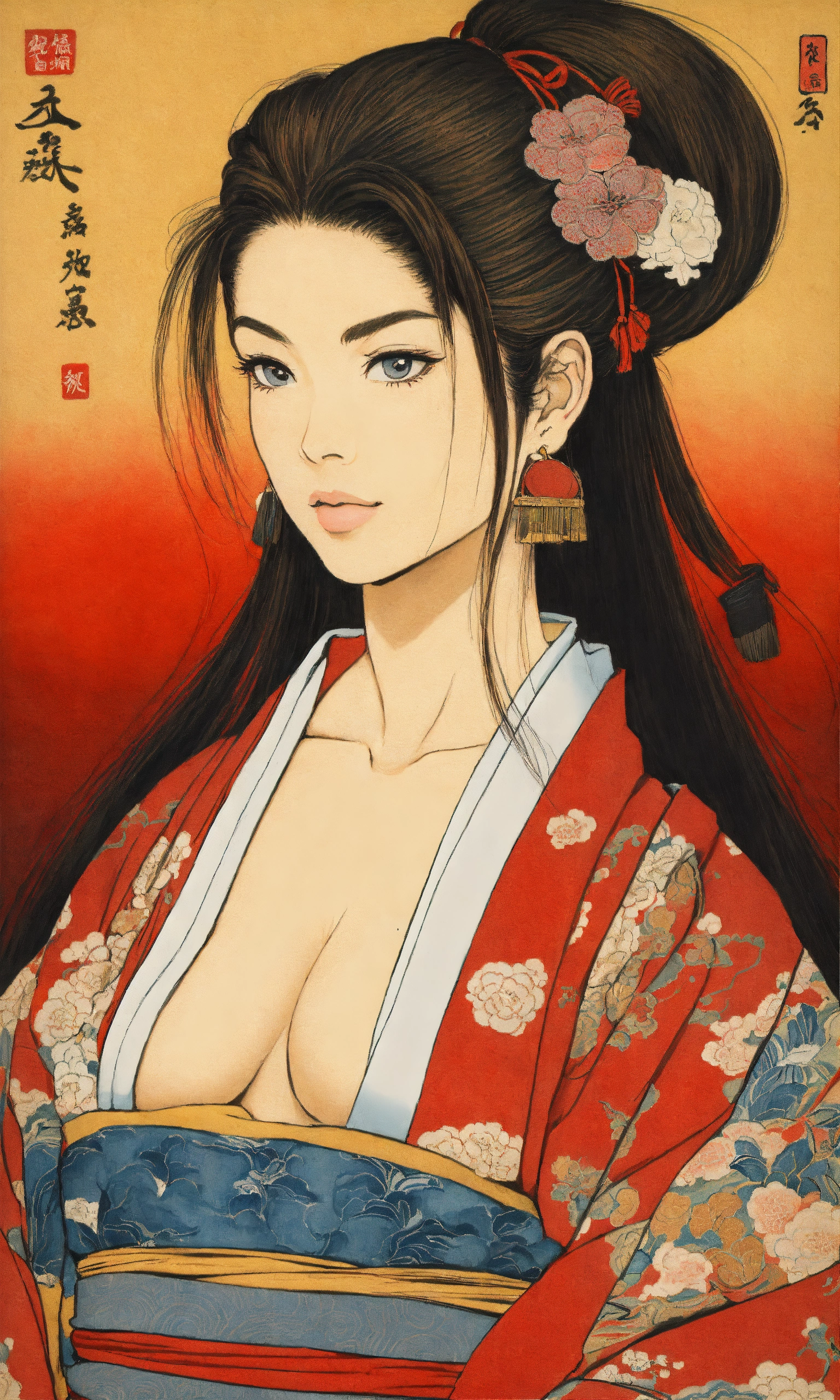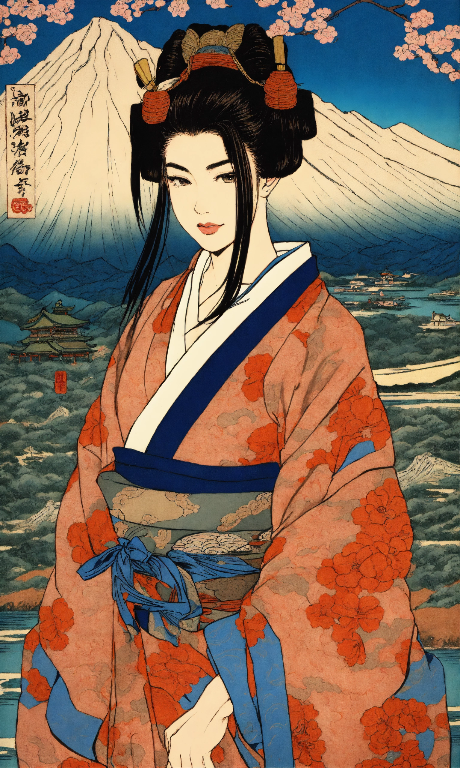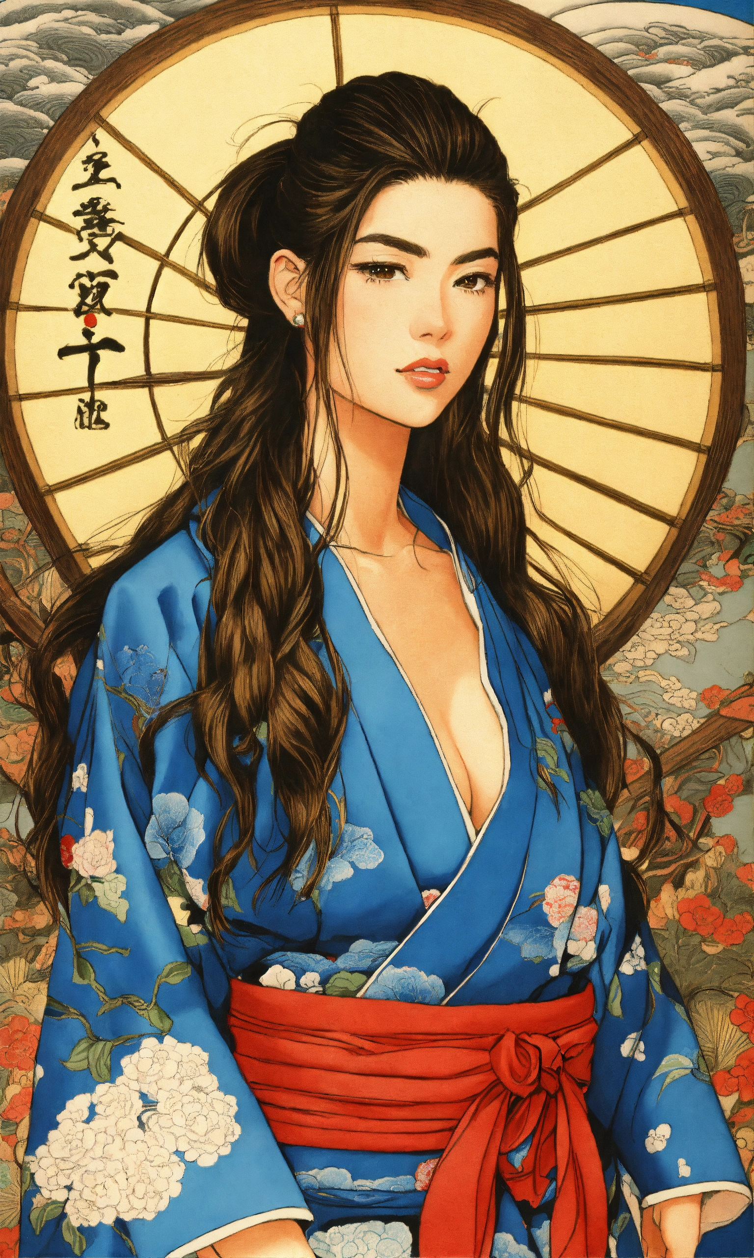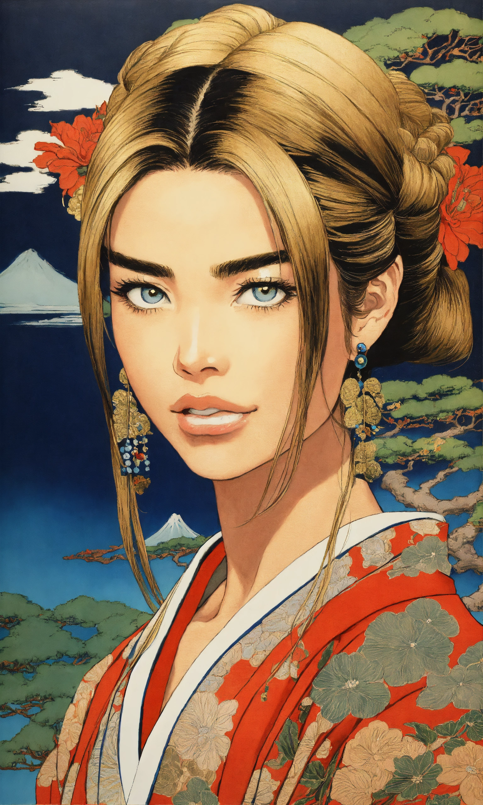 Denise richards, 1999, by kanō tan'yū, highly detailed and colored, in the art style of ukiyo - e, inspired by utagawa kuniyoshi