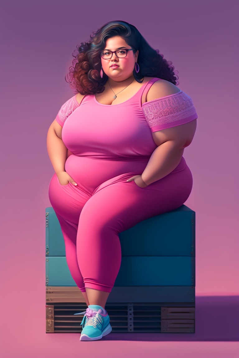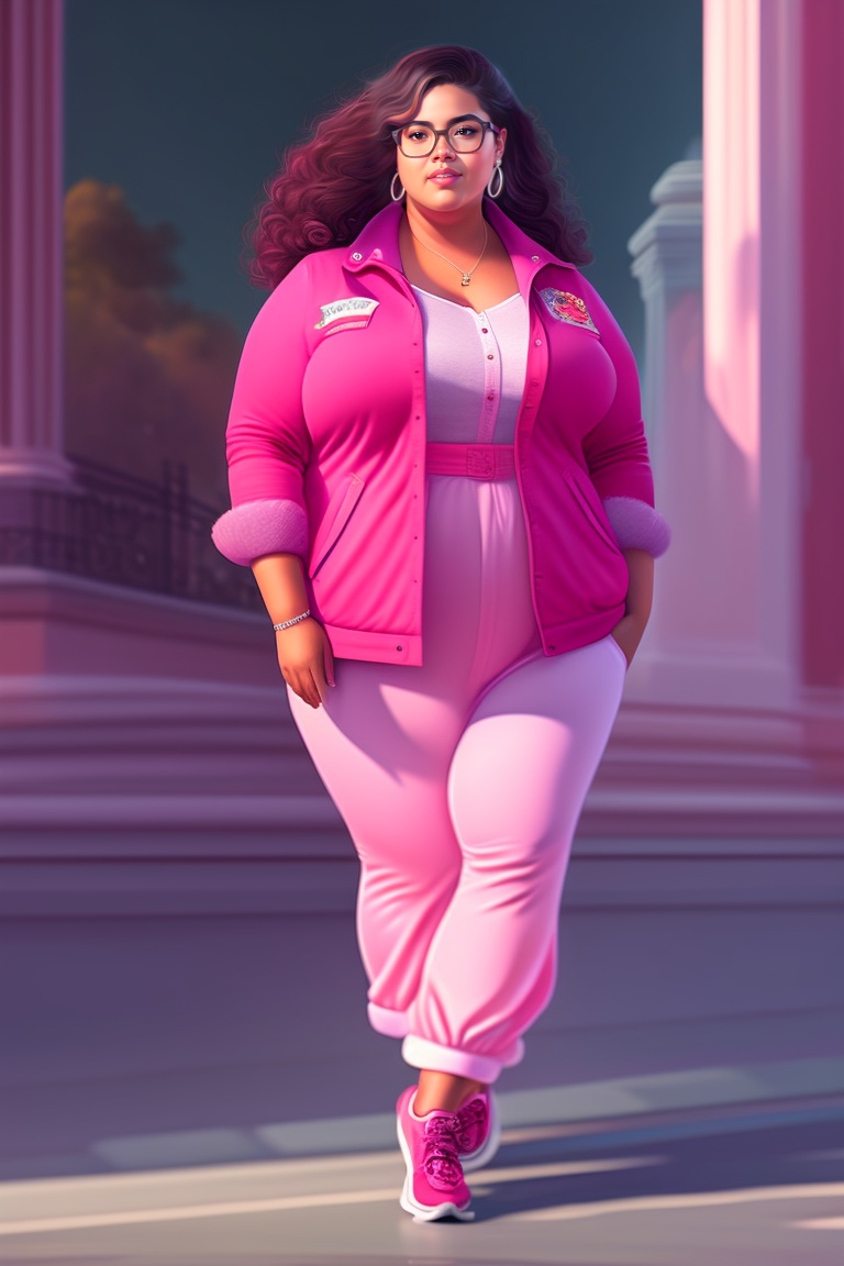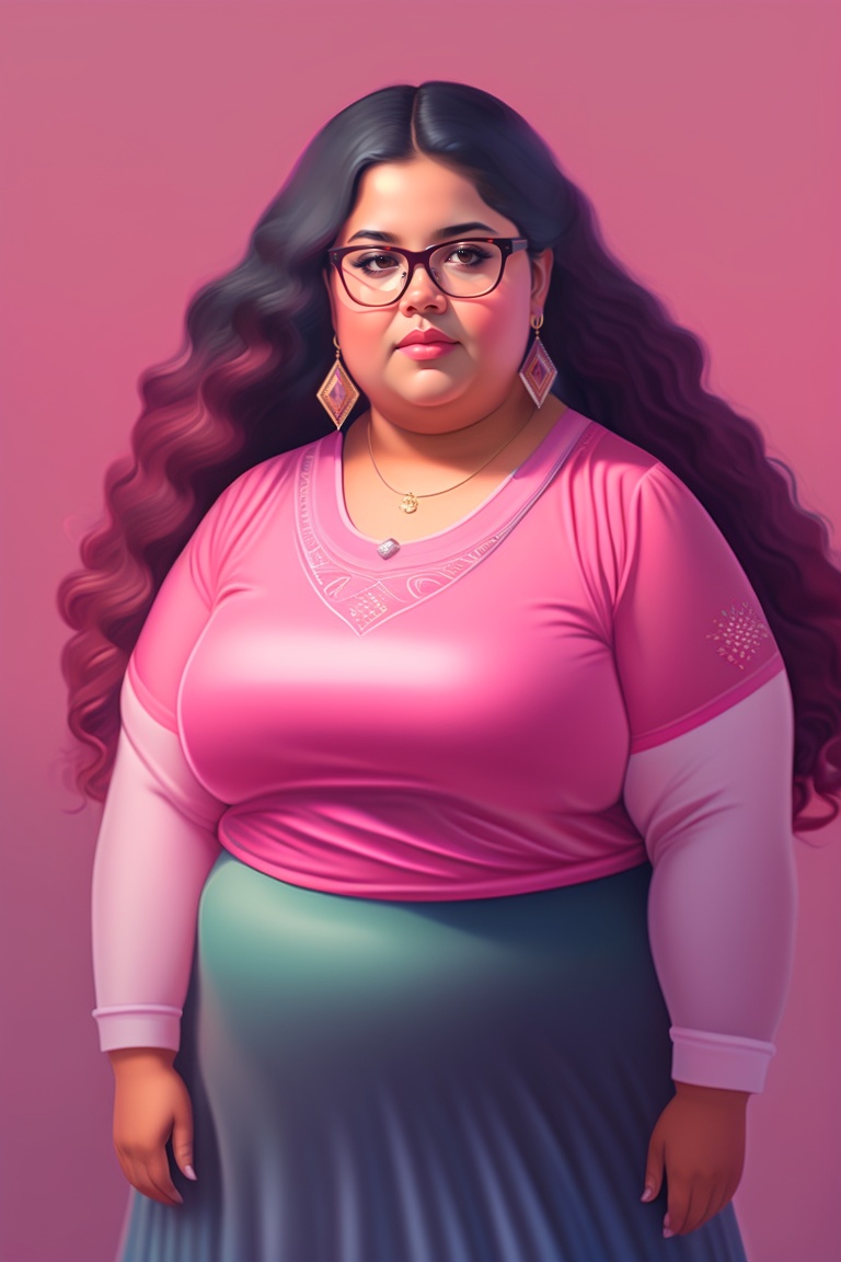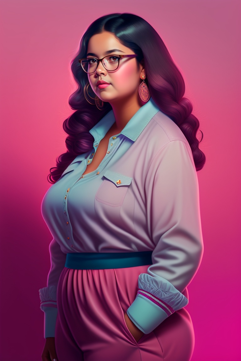 Portrait hispanic young girl, age 16, chubby, pink clothes, glasses, full length, modern, moody shadows, pallet knife, oil painting, brush strokes, intricate design, ethereal, fashion magazine, alphonse mucha, simon stalenhag, chie yoshii, casey weldon, sharp focus, 8 k, octane render