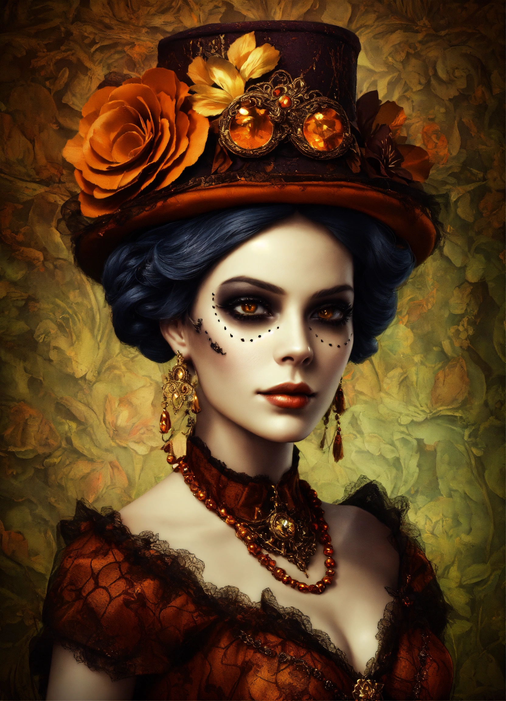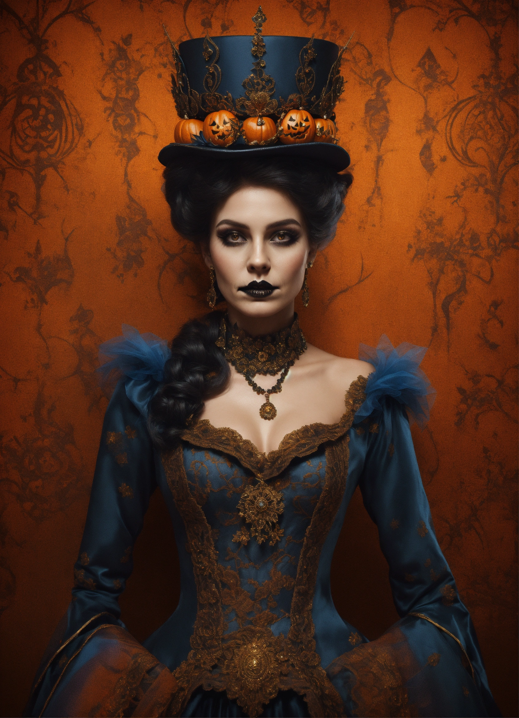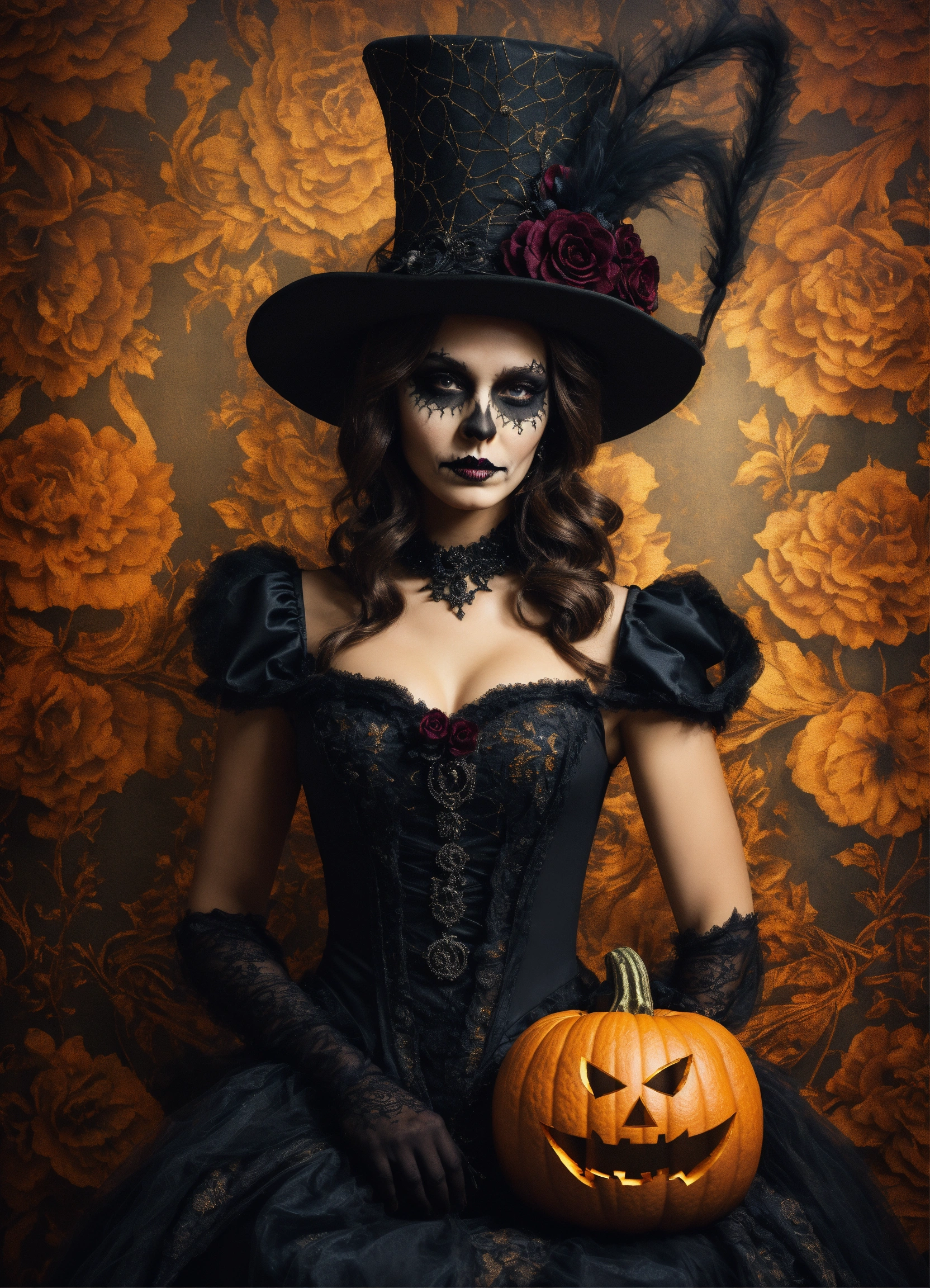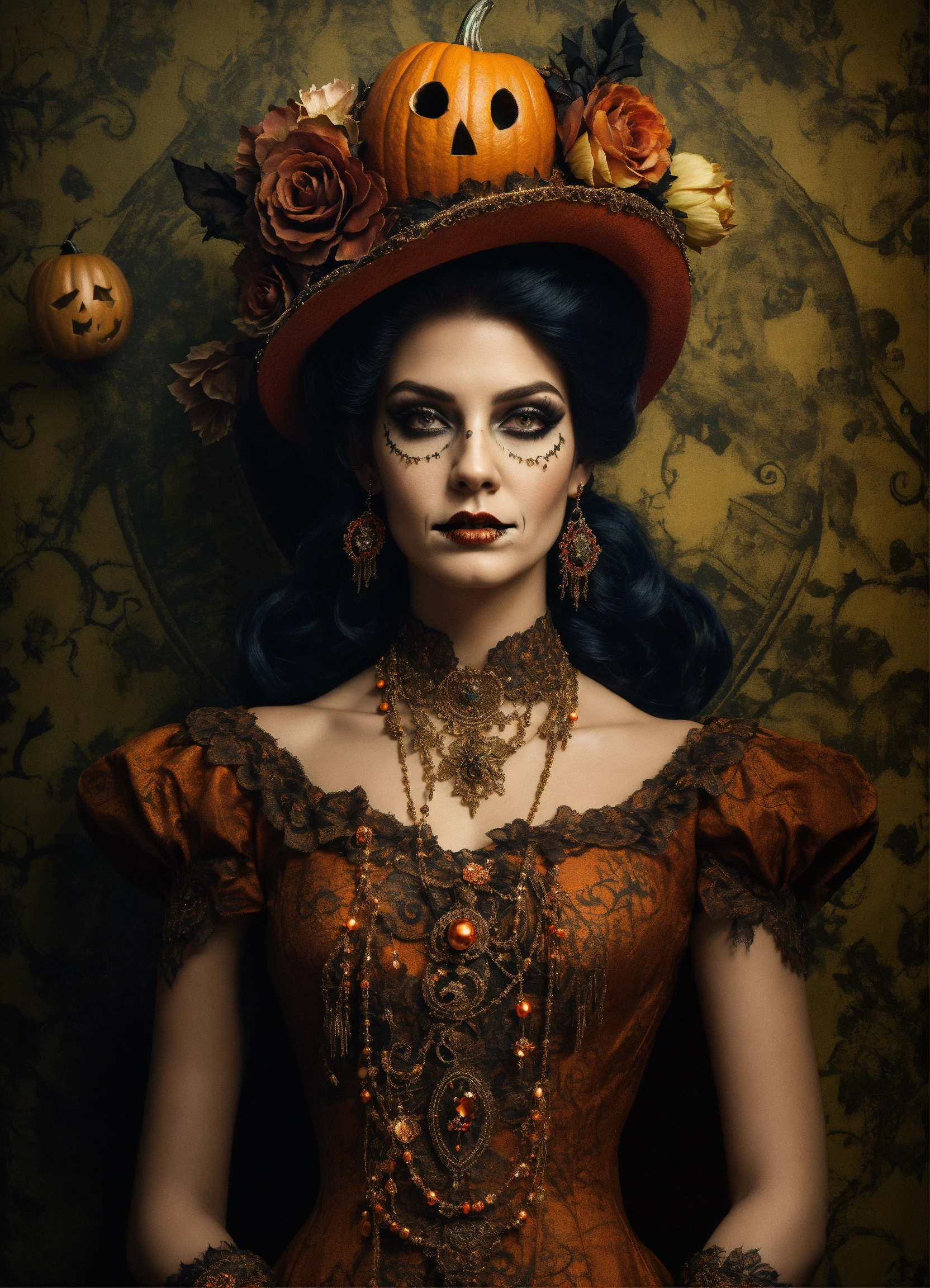 Beautiful spooky version of a 25 year old queen of halloween in an elegant and intricate costume with a fascinating hat, background with grungy wallpaper, 3d, 32k, photorealistic and very detailed. detailed and realistic skin texture, halloween colours and elements