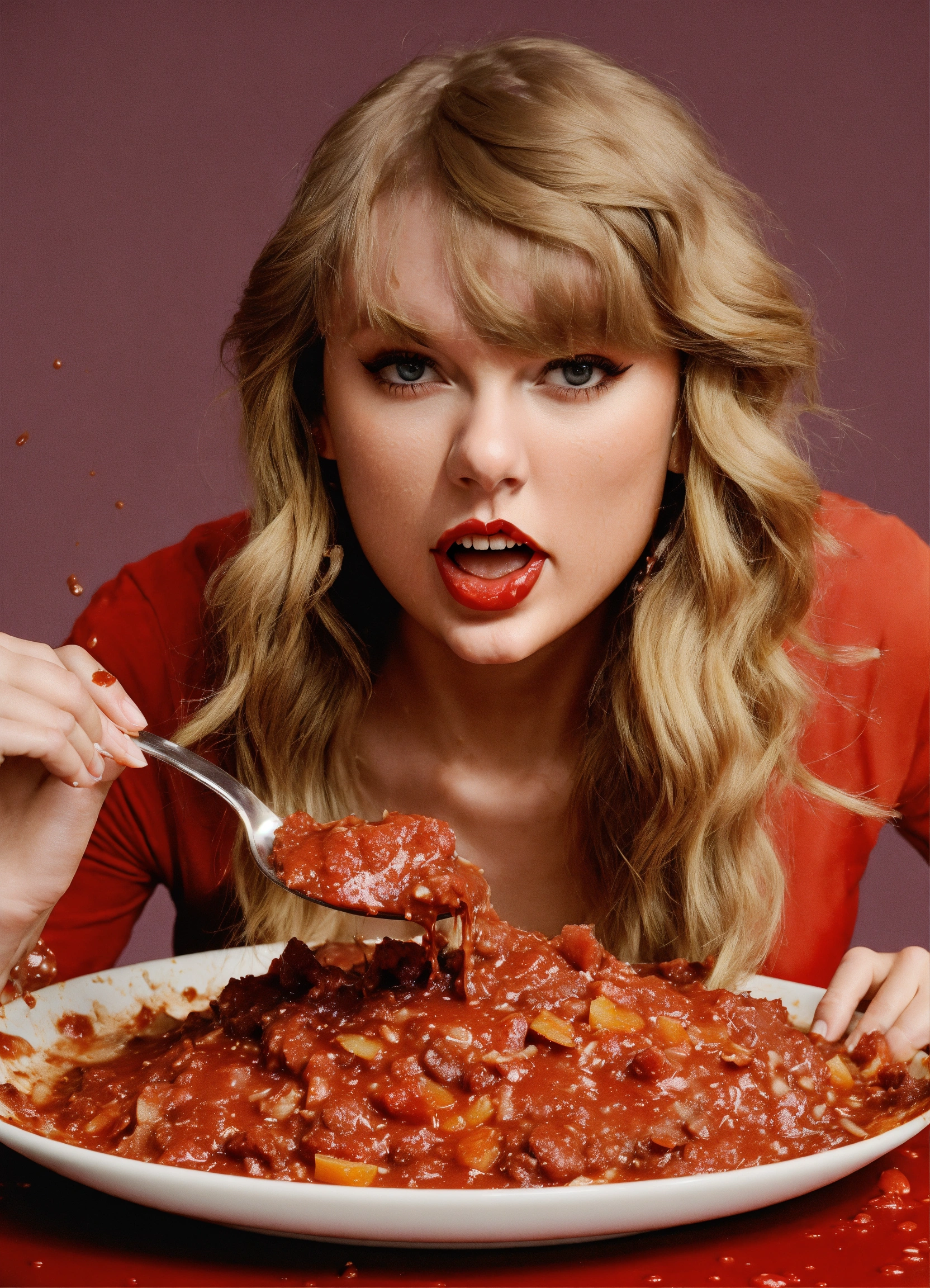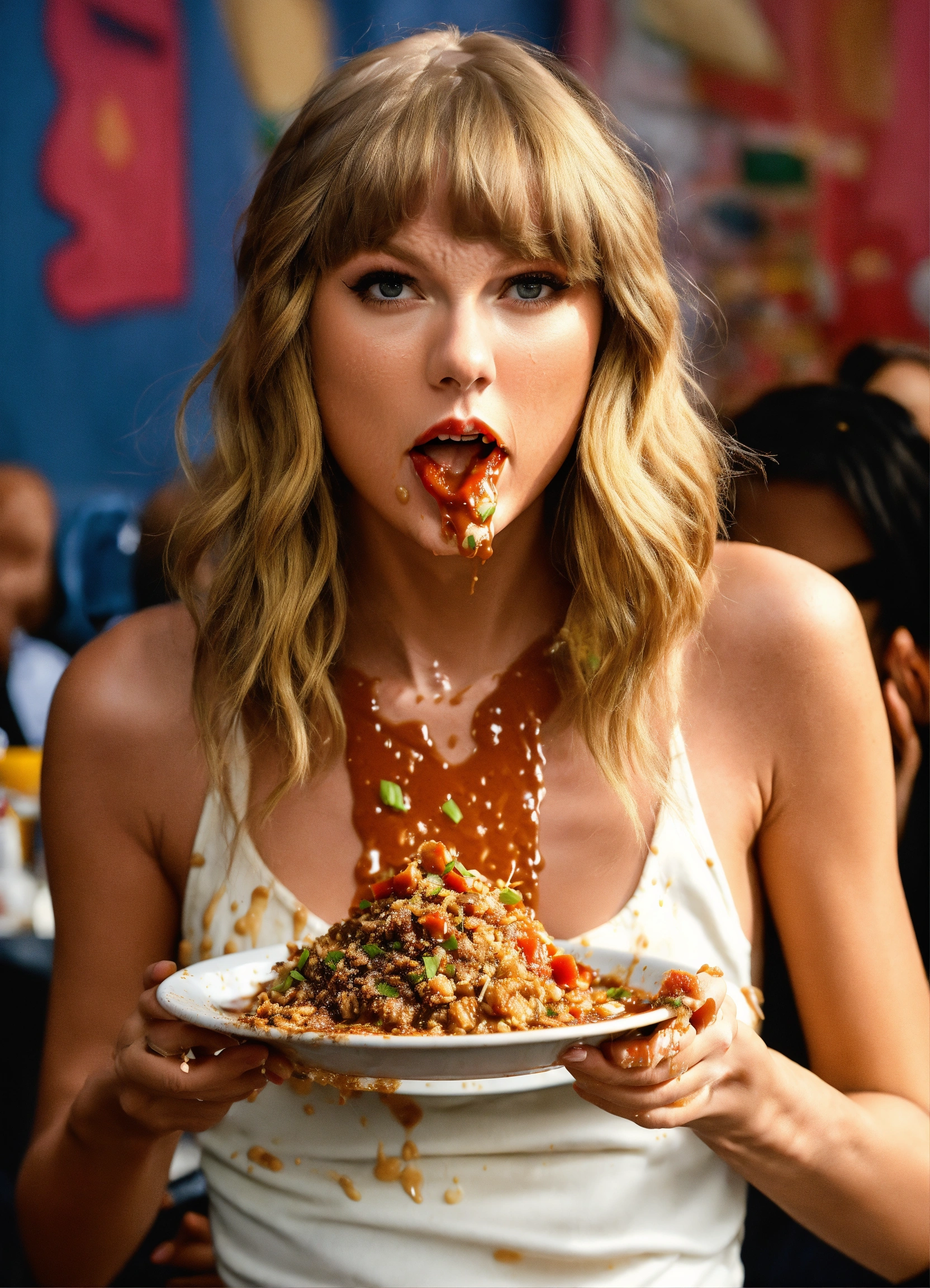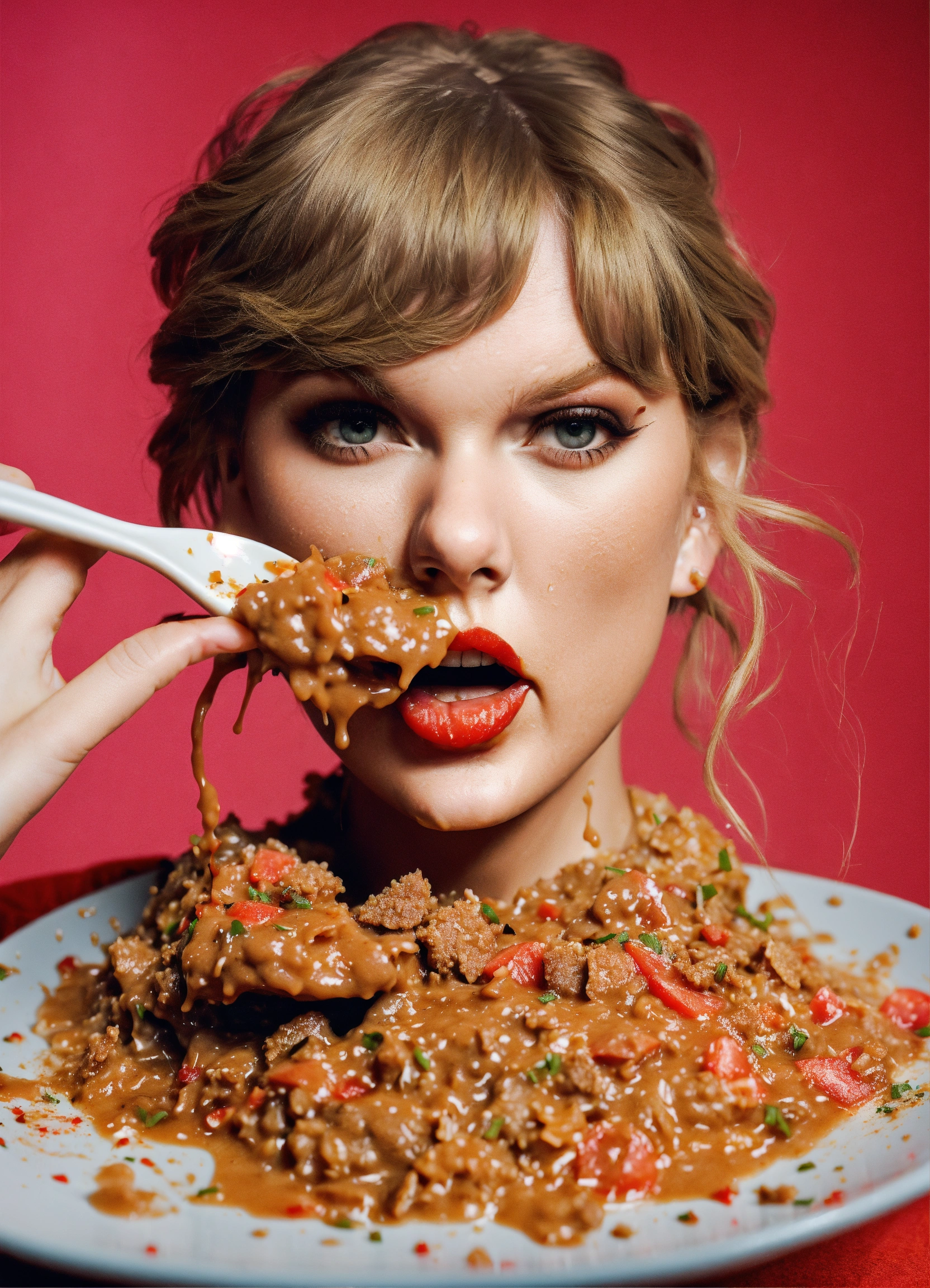 Photo realistic shot of taylor swift eating a disgusting pile of slop with food all over her face and clothes