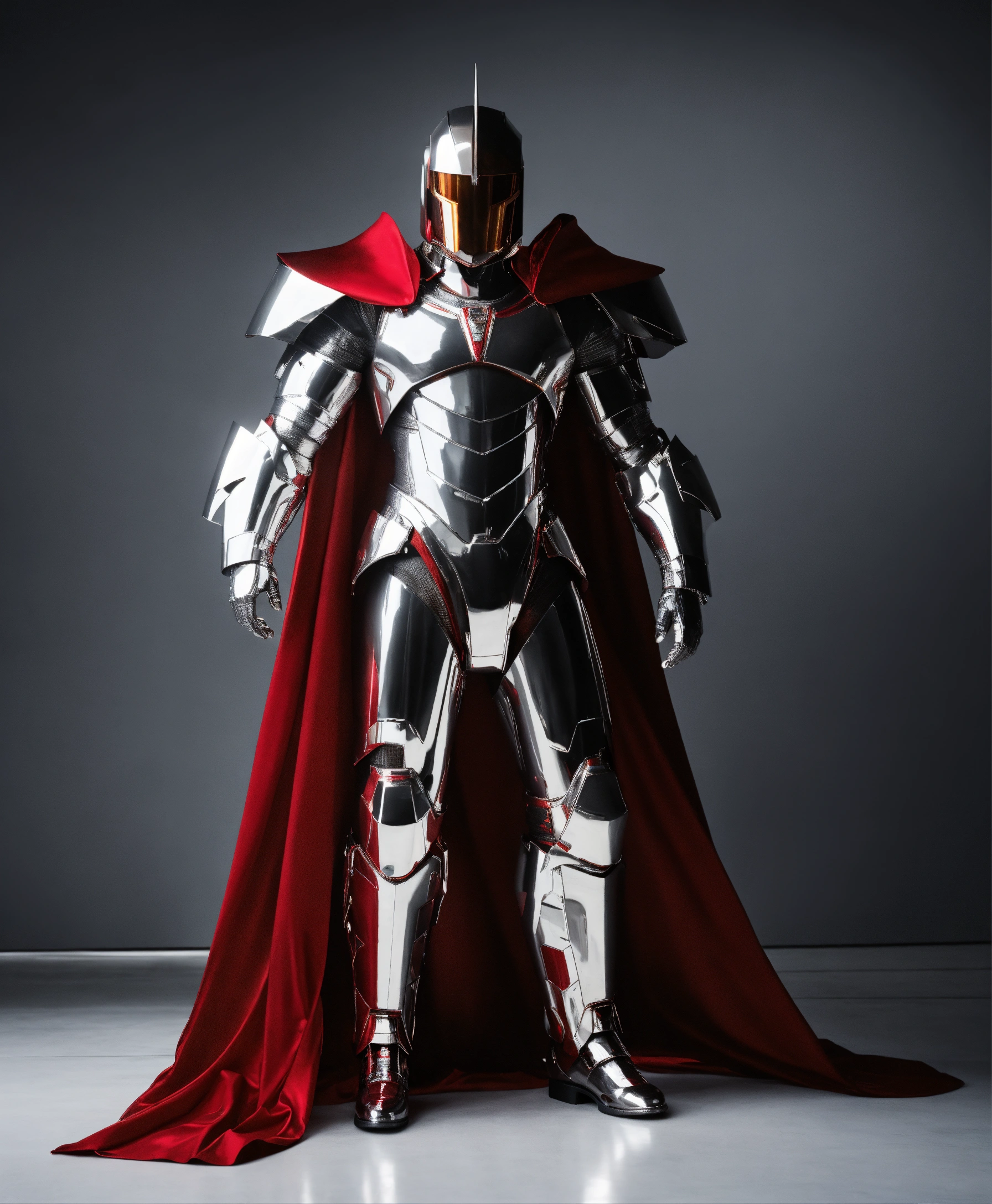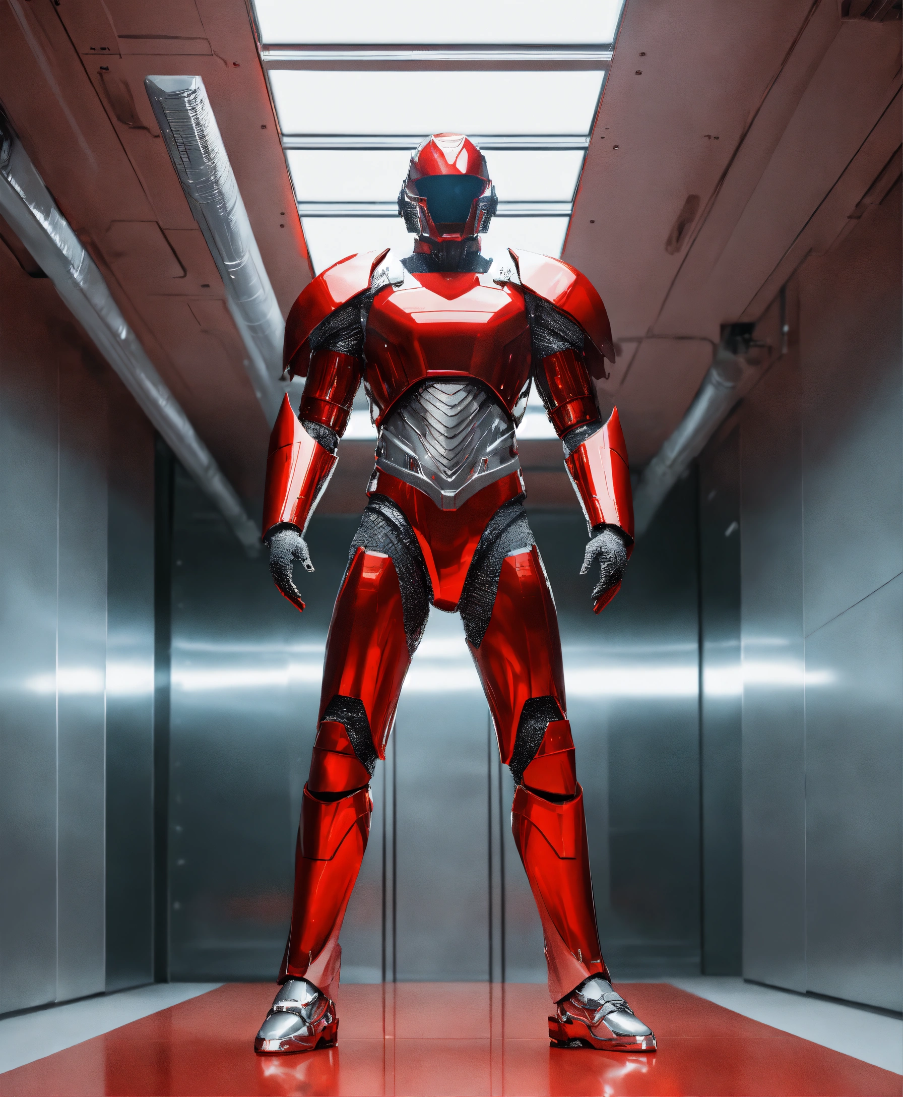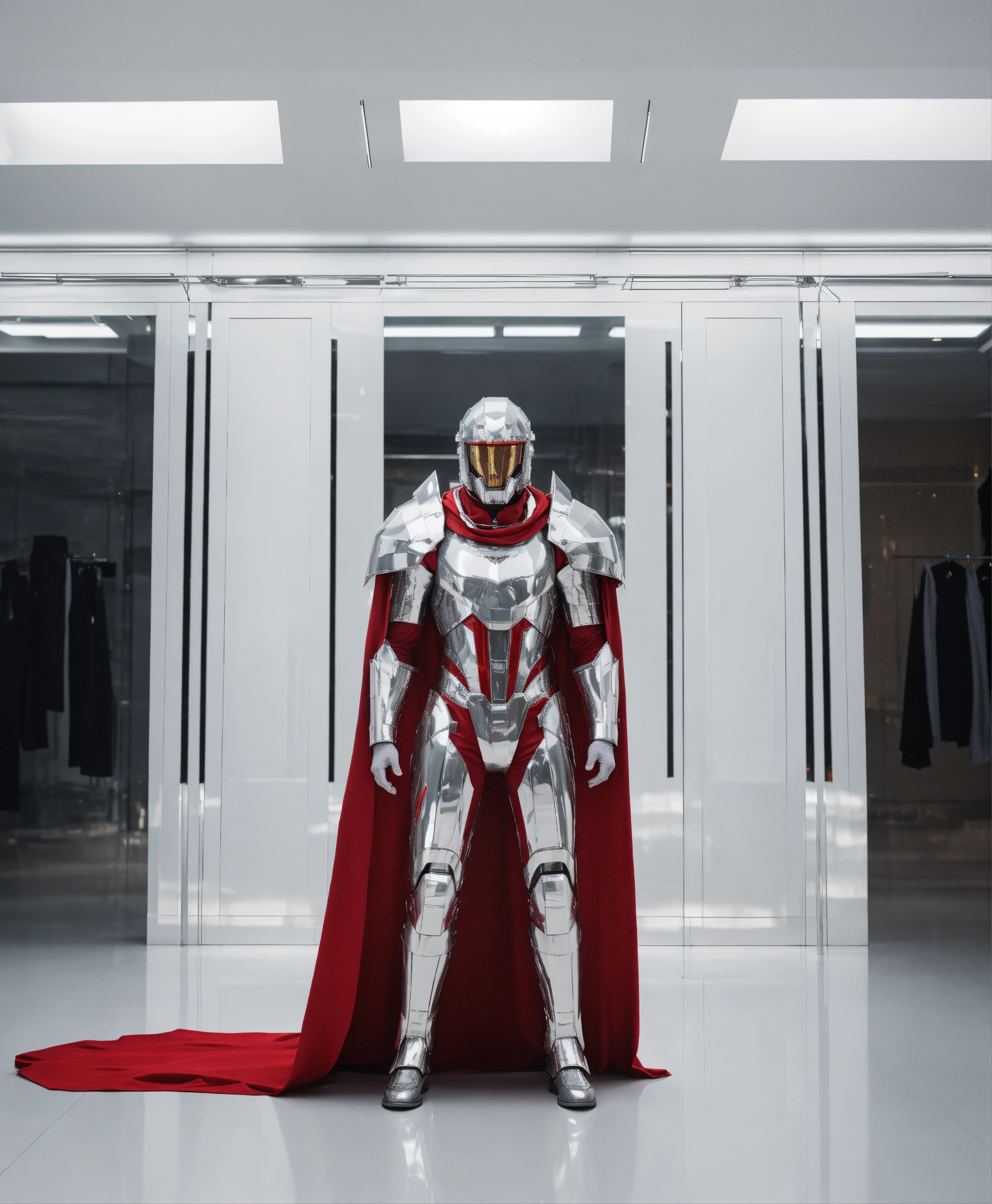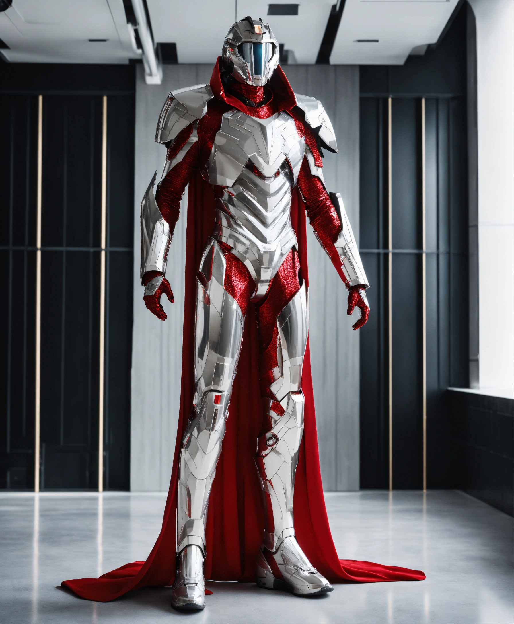 An ultrarealistic photograph of an enormous minimalist sci-fi full body metal power suit, without lights, made of white metal and polymer, full crystal hull, for a muscular man, with a red emperor cape, imposing, modern minimalism, elegant, dystopia, mysterious, godlike, scary, in a white room, 8k