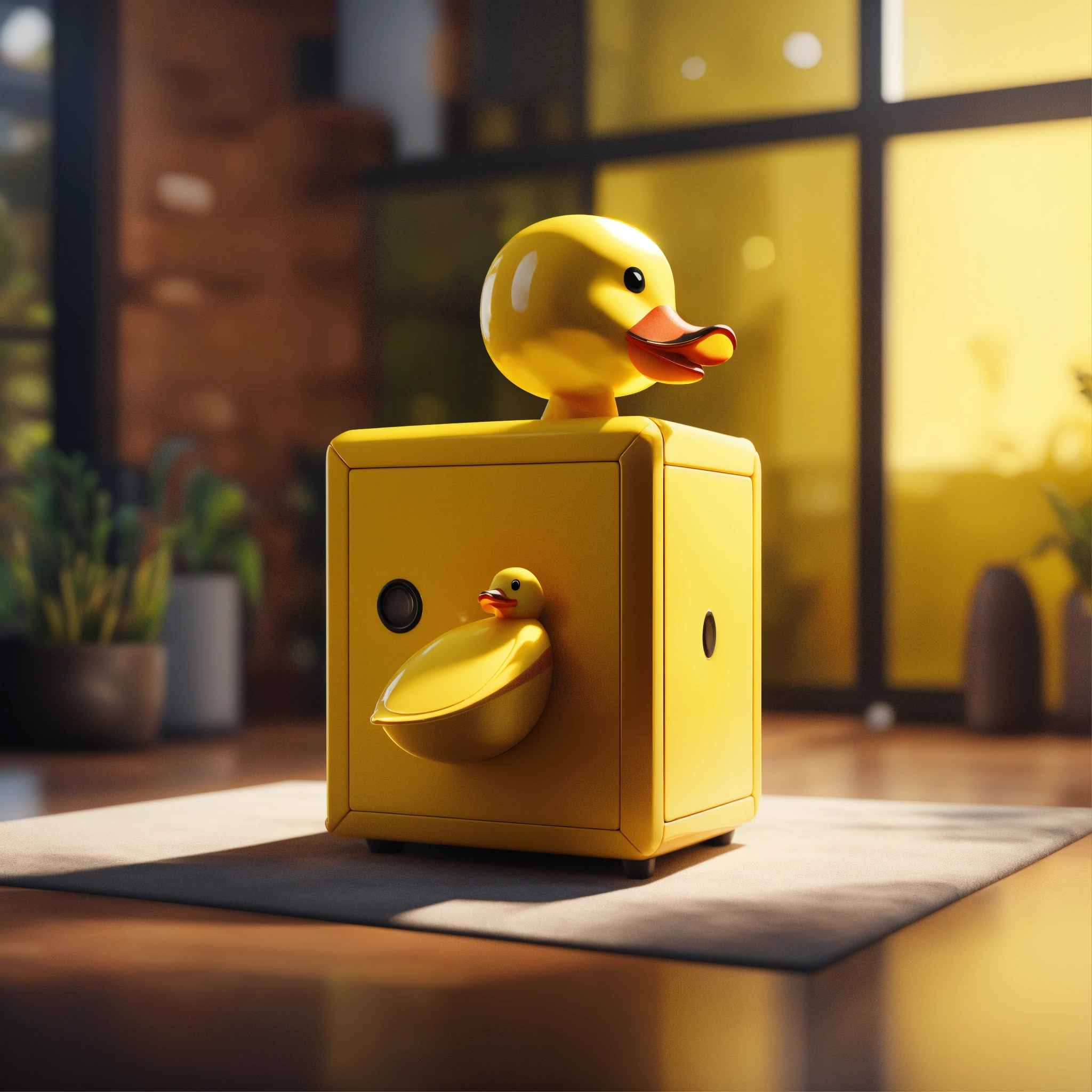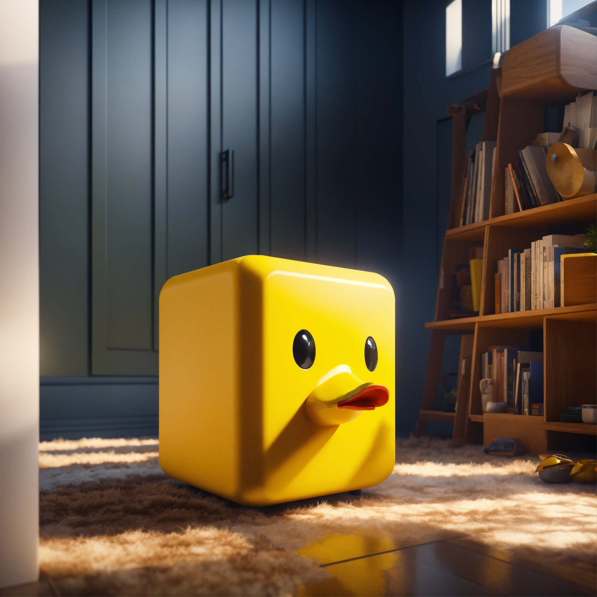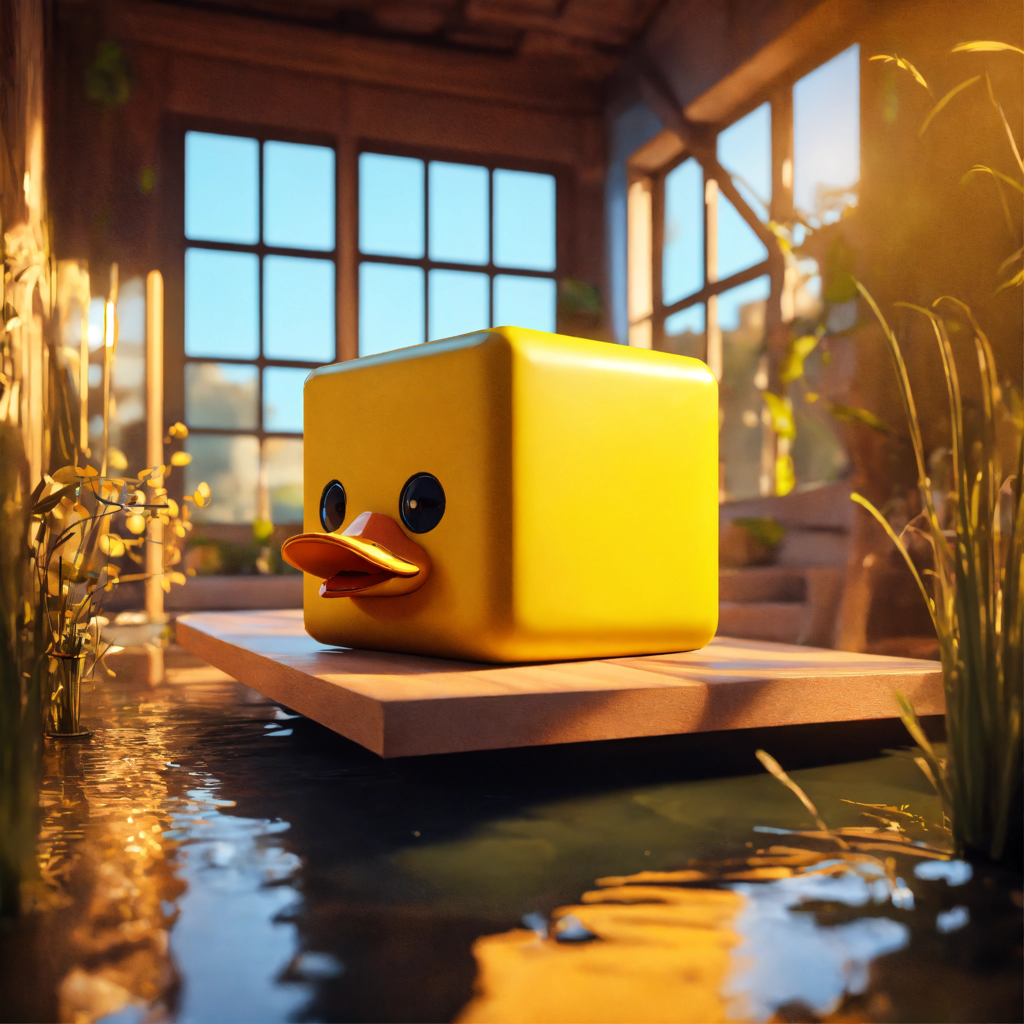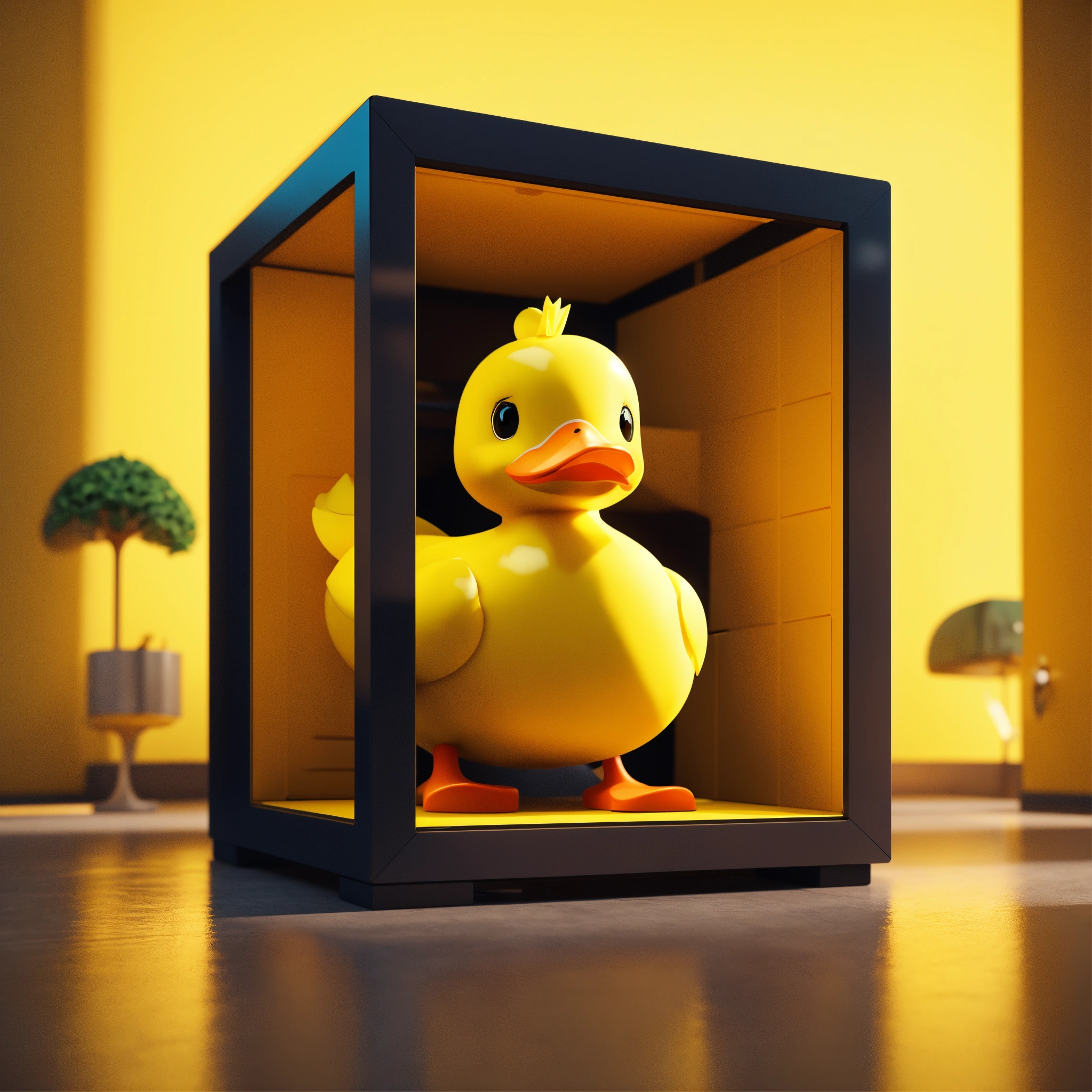 A cute yellow cube duck in a perfect neat cube house