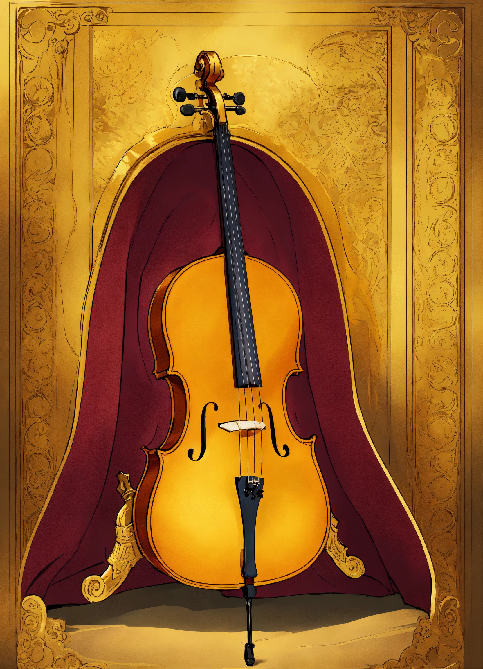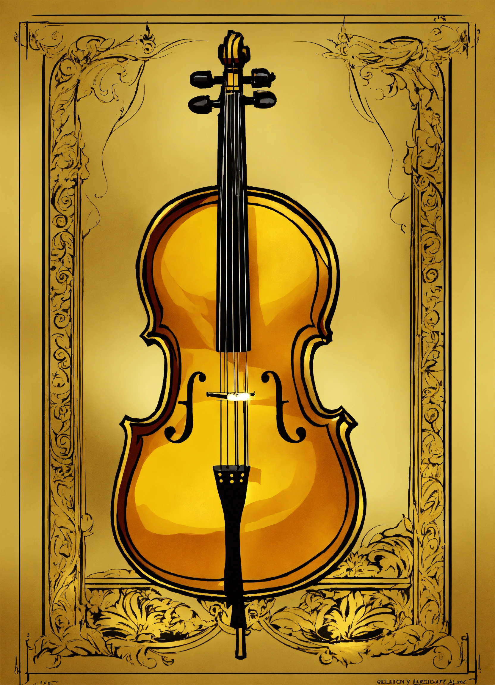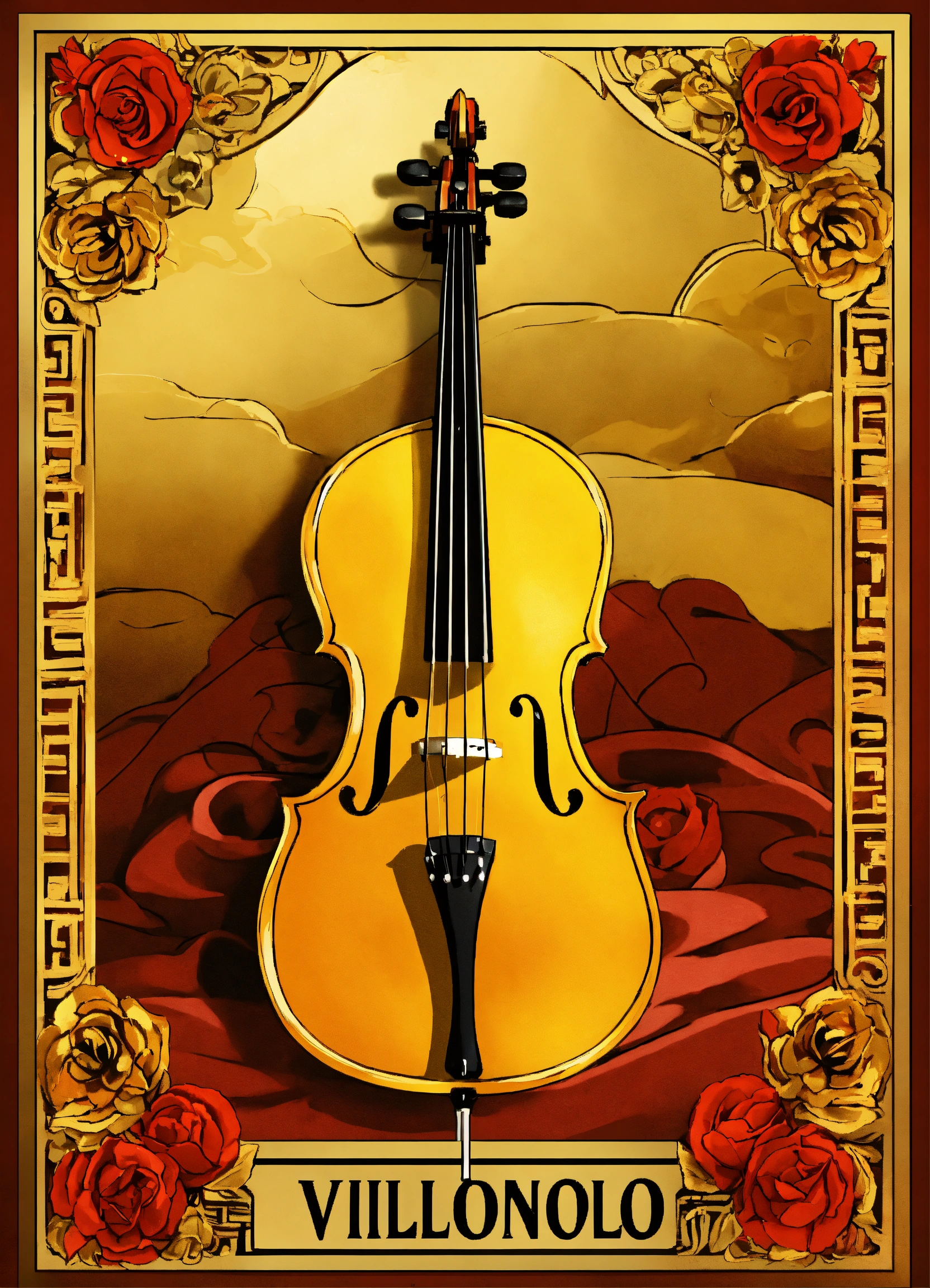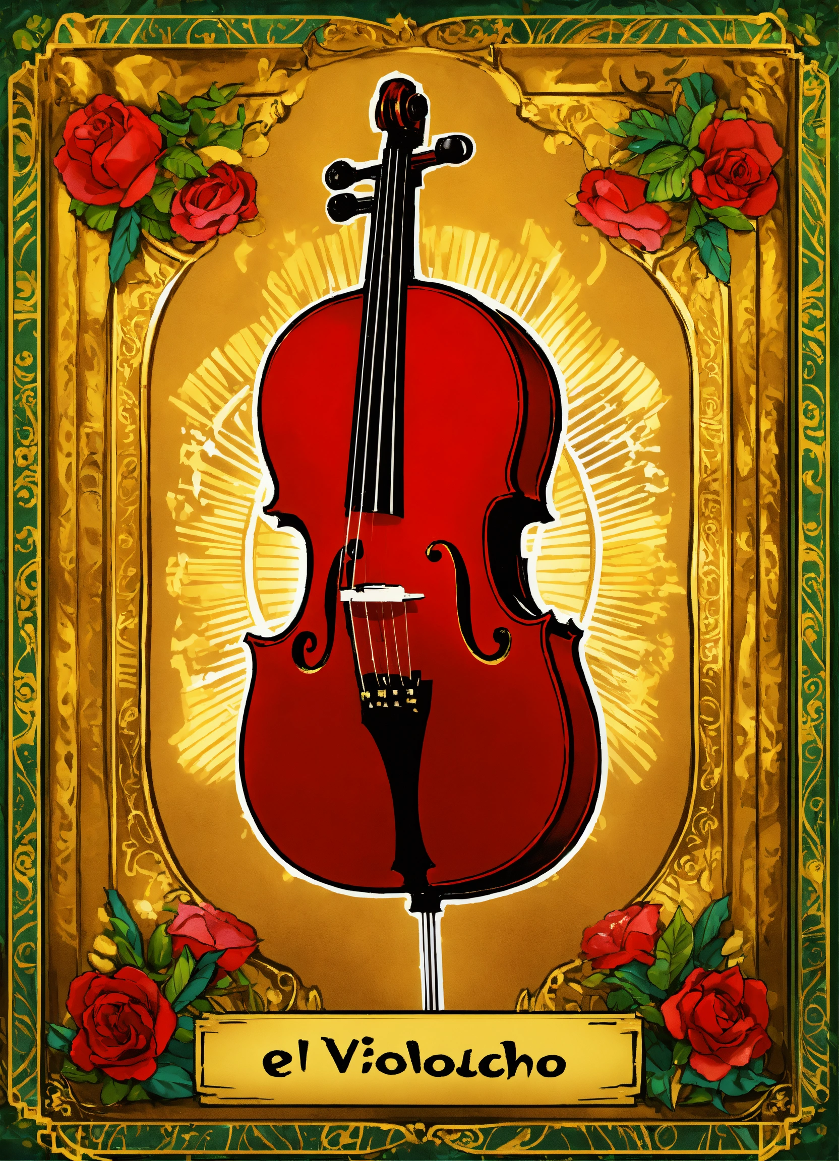 A cello, based on the card "el violonchelo" of the mexican lottery deck in anime style. gold background card styled.