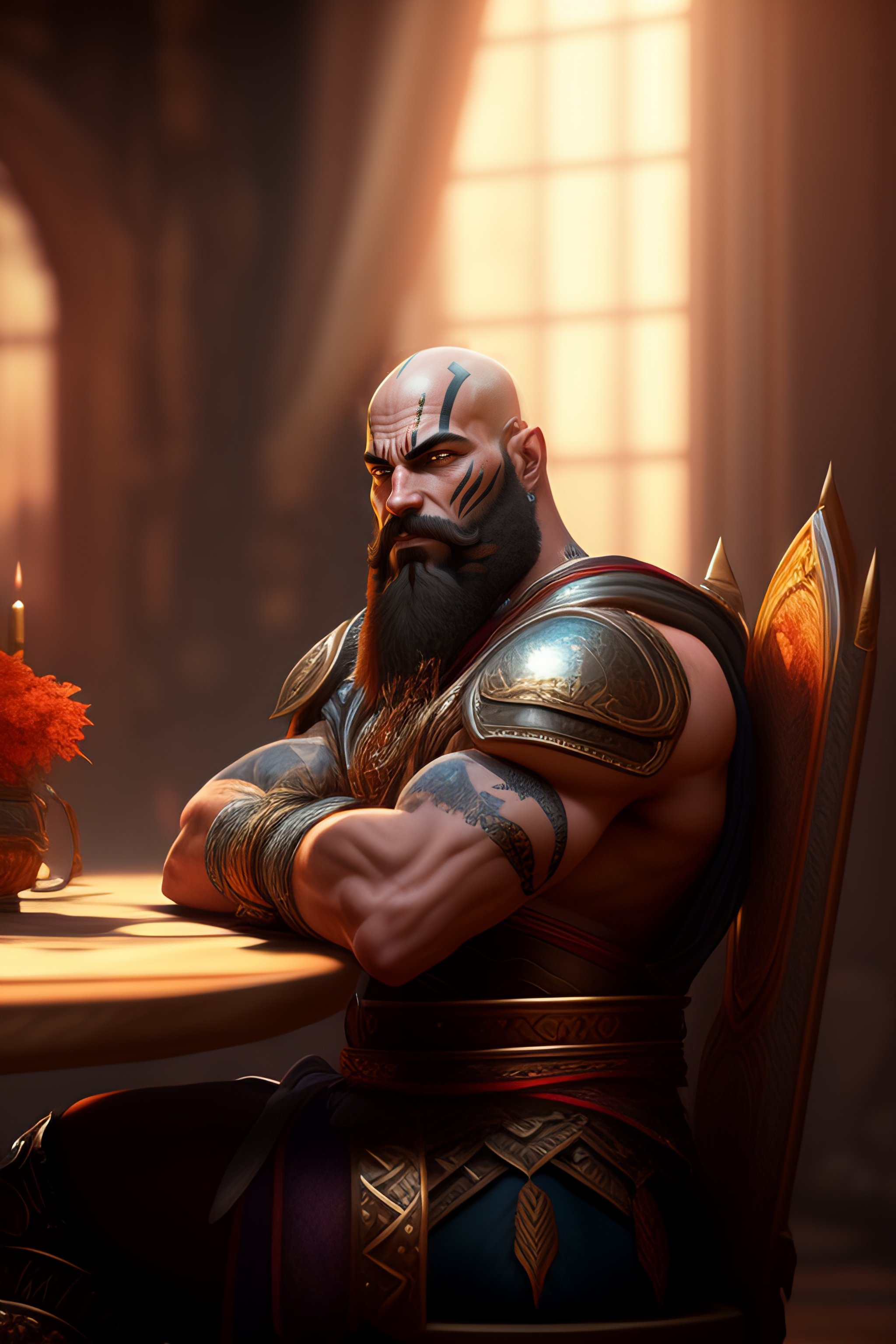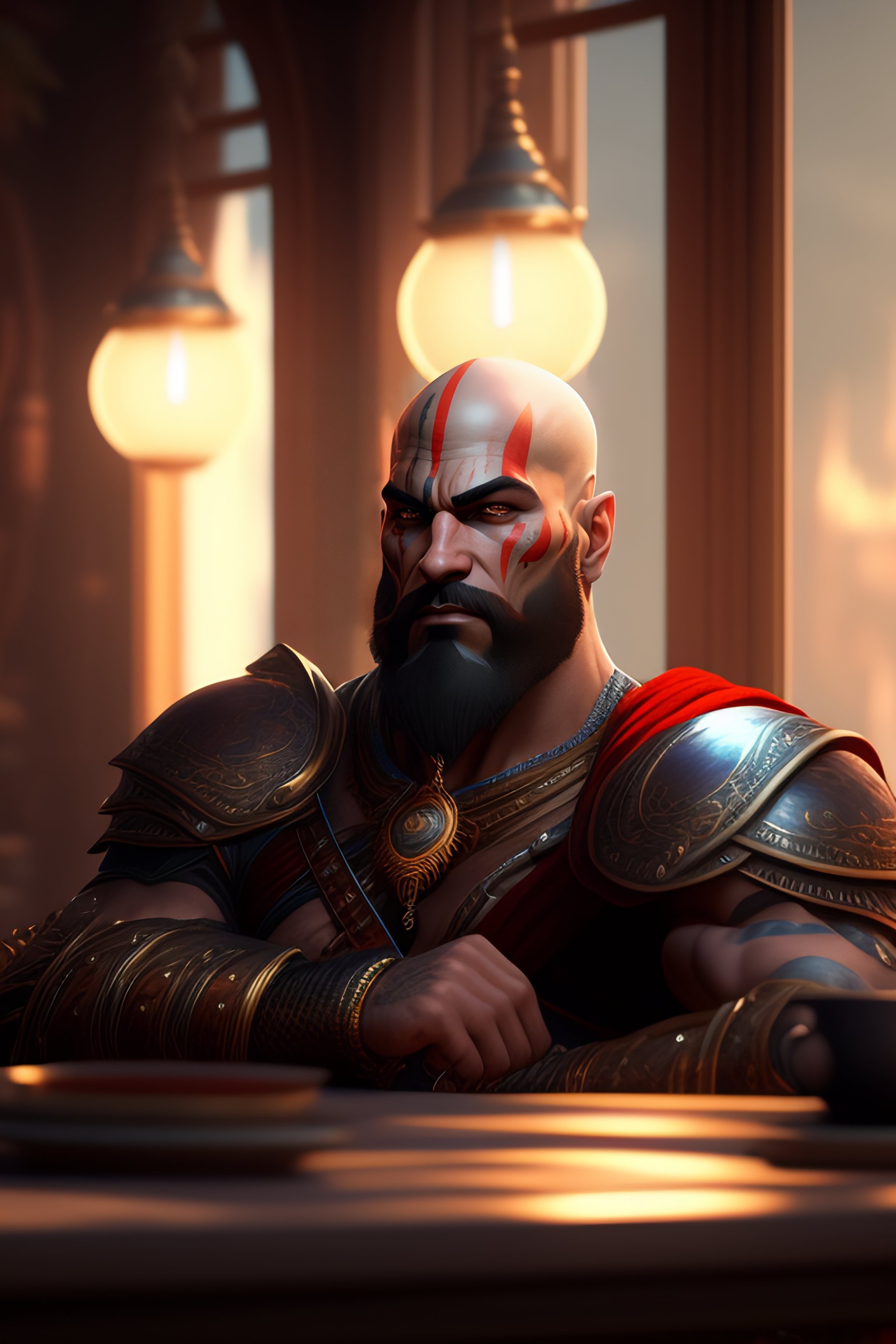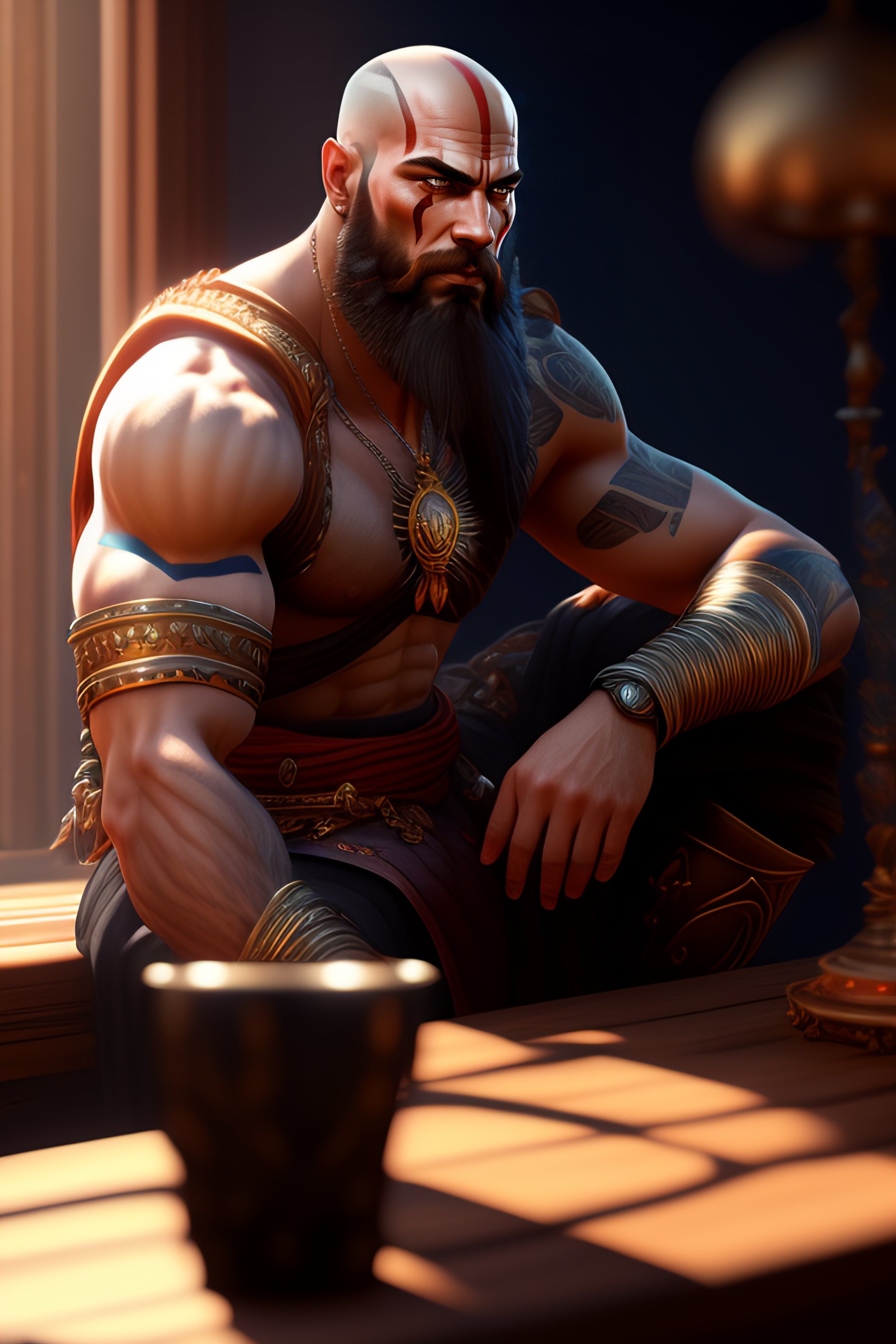 Kratos, sitting in the chair sitting on a table by morning light, sunny day, digital art, concept art, intricate details, trending on artstation, 2 d game art, digital painting, photorealistic, 8