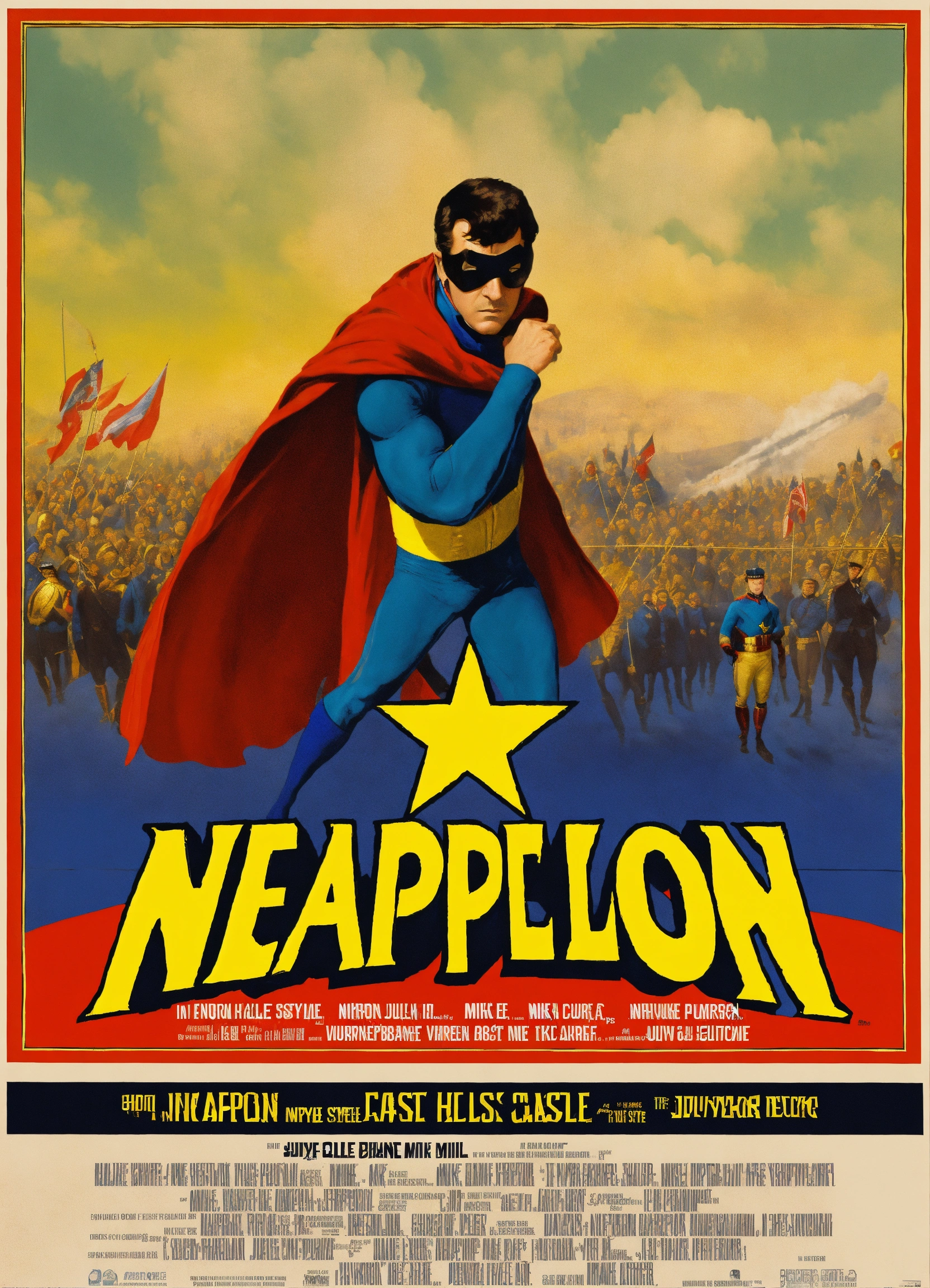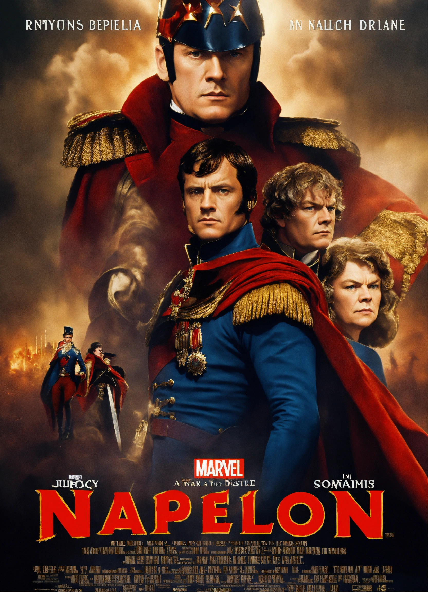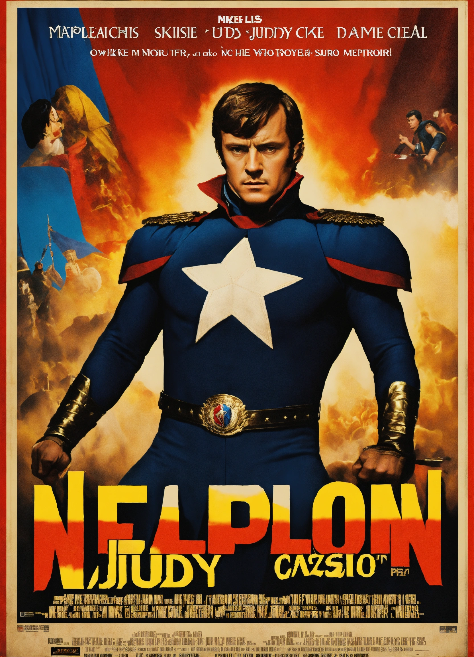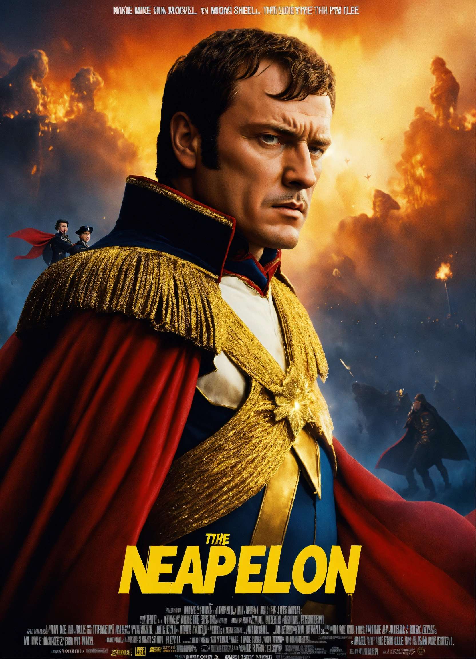 In the style of a marvel movie, a movie poster about napoleon showing him as a superhero who is strong and also very short compared to his peers. the movie is titled, "napoleon" and that word must be spelled correctly. listed actors are "mike castle" and "dame judy dench."