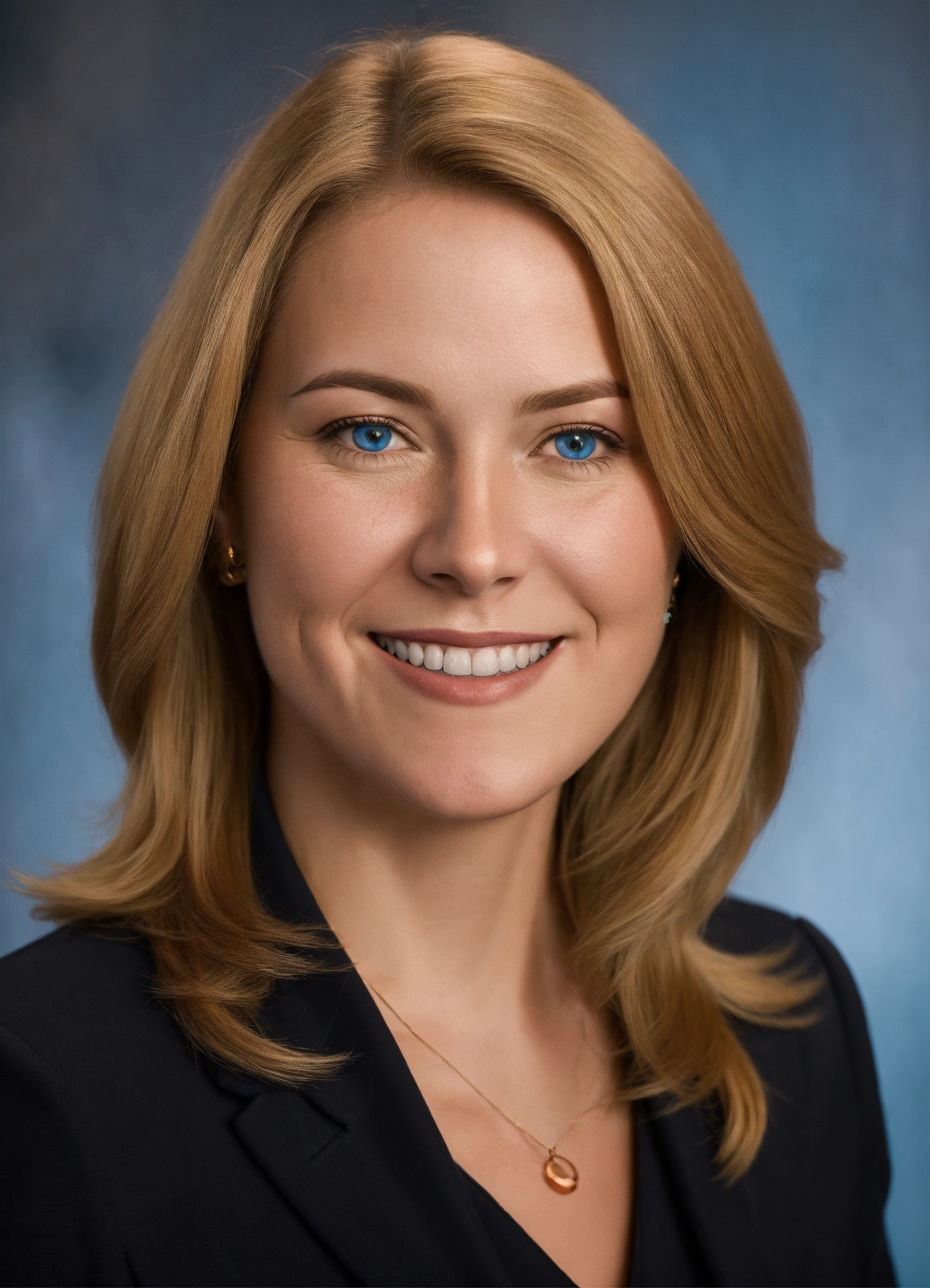 Headshot of an adult woman politician in her mid 30s, she has shoulder length copper blonde hair, she has blue eyes, she is wearing a black suit, she is facing forward smiling, realistic photo