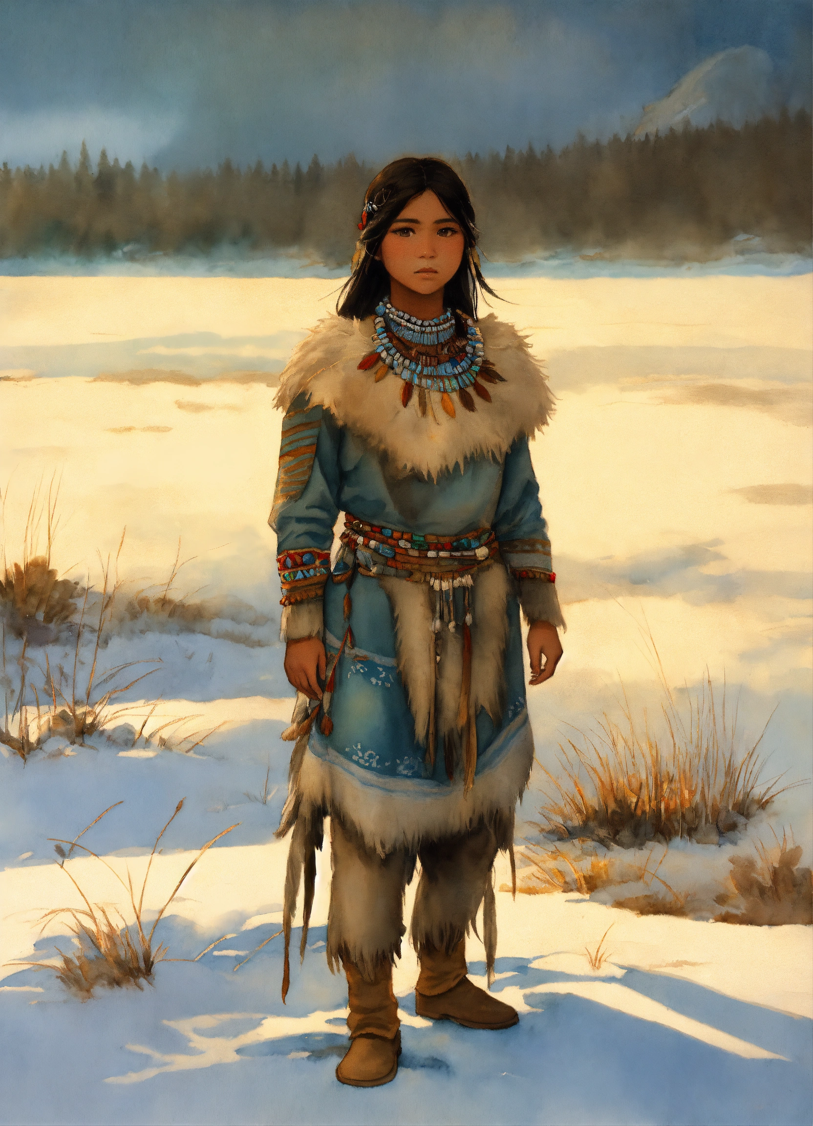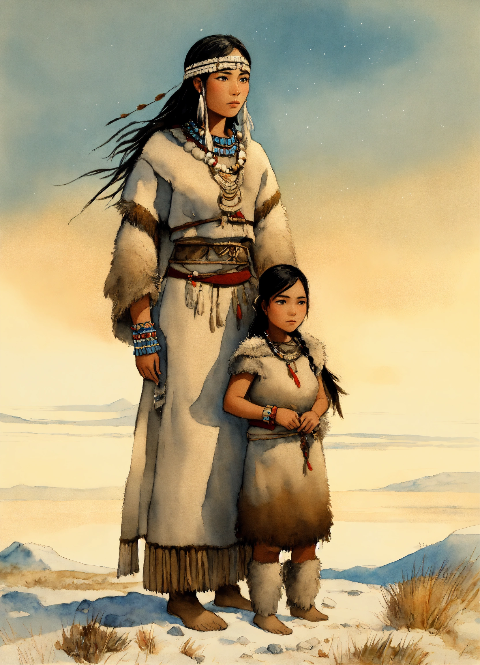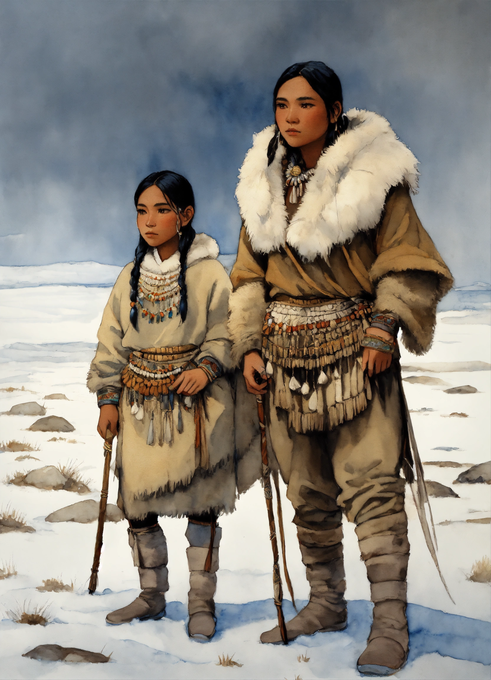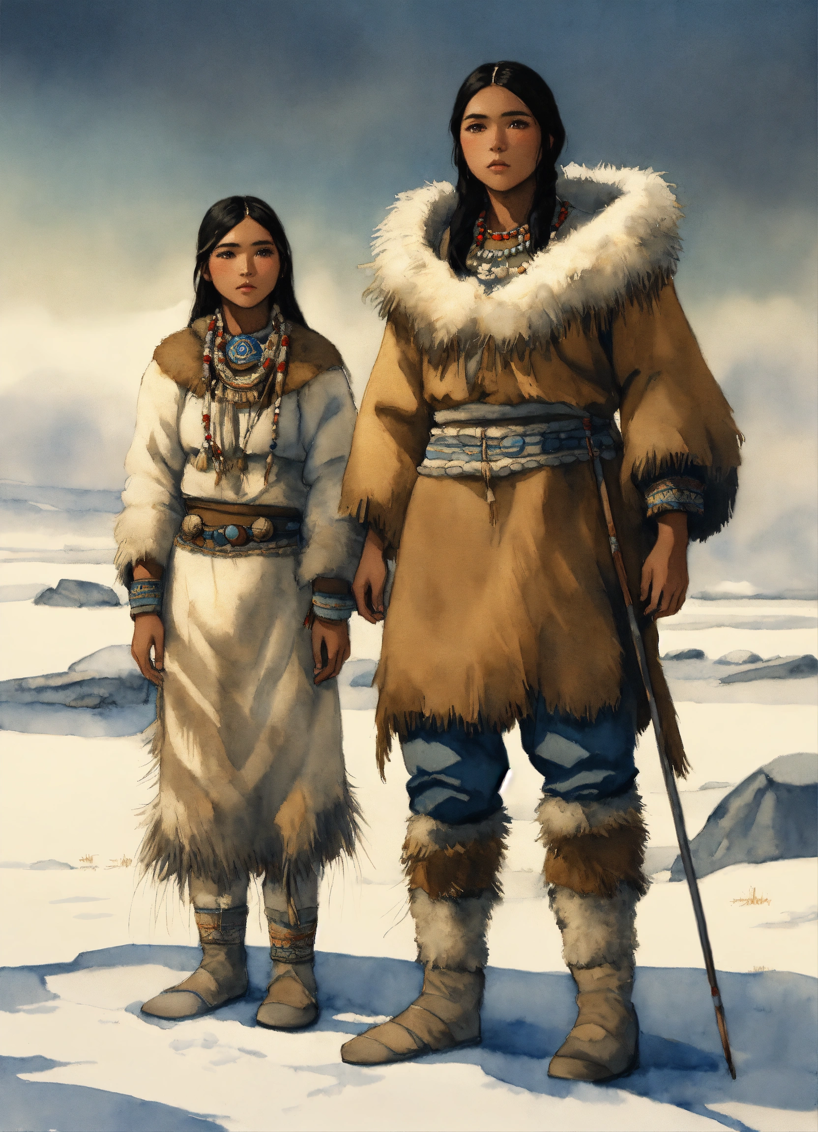 Full body illustration of an inuit woman, young, 18 years old, beautiful, native american phenotype, wearing stone age clothing made from natural fabrics like linen, cotton, or furs, adorned with feathers, beads and shells, stading on the tundra steppe with her youth brother, watercolors, gloomy and depressing ambient, artwork by tom björklund