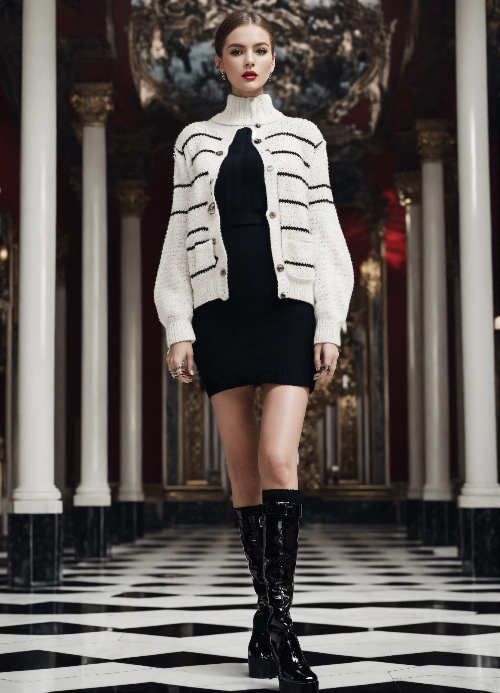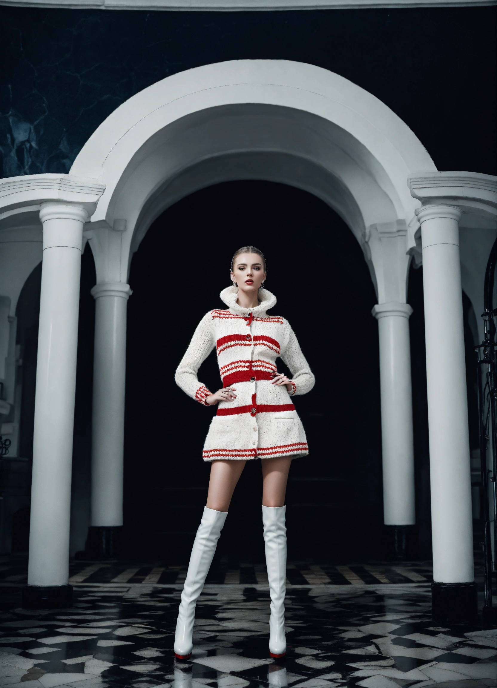 Portrait of haute couture beautiful russian fashion model editorial, white and chrome, structured outfit, platform shoes, iso 400, surrealistic, 8k, full frame, landscape, architecture, wearing a black and white knitted short cardigan and skirt outfit chanel style and over the knee red patent boots, federico fellini movie scene