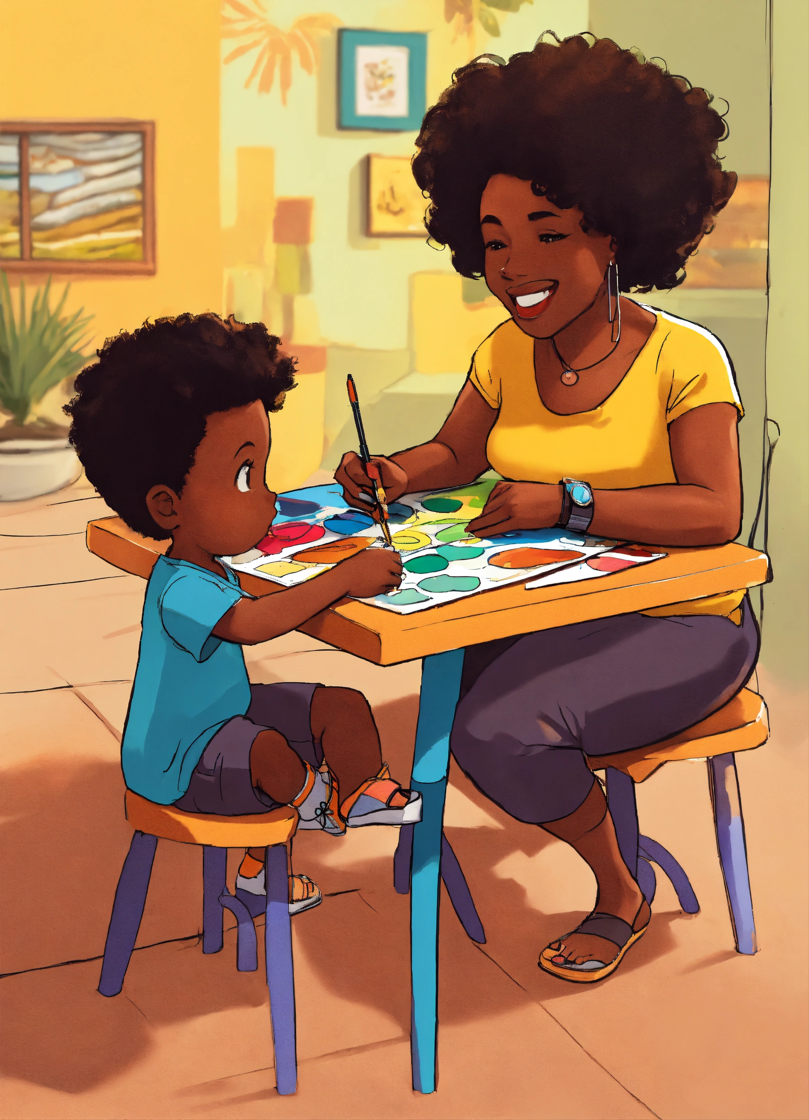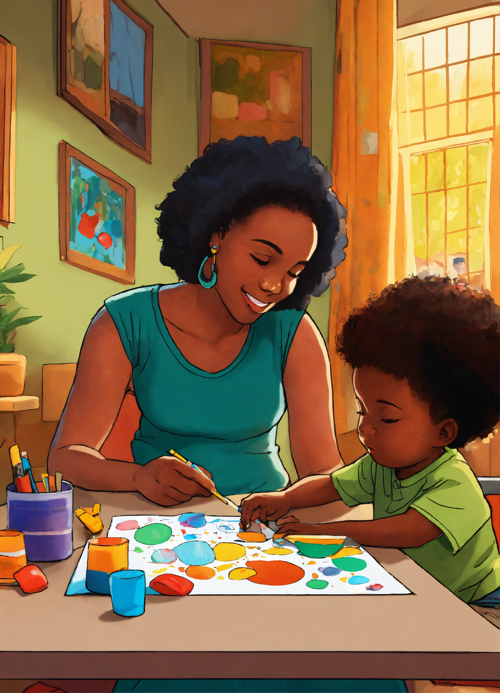 Cartoon, colorful, illustrate a black toddler boy and black mom, sitting at a table, making a art project.