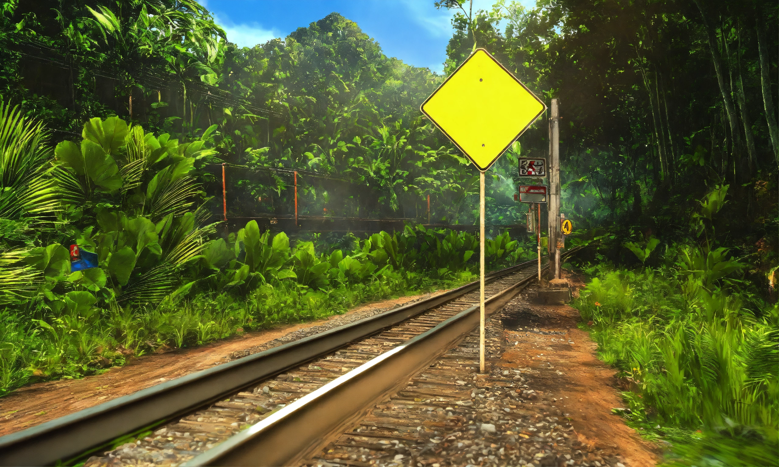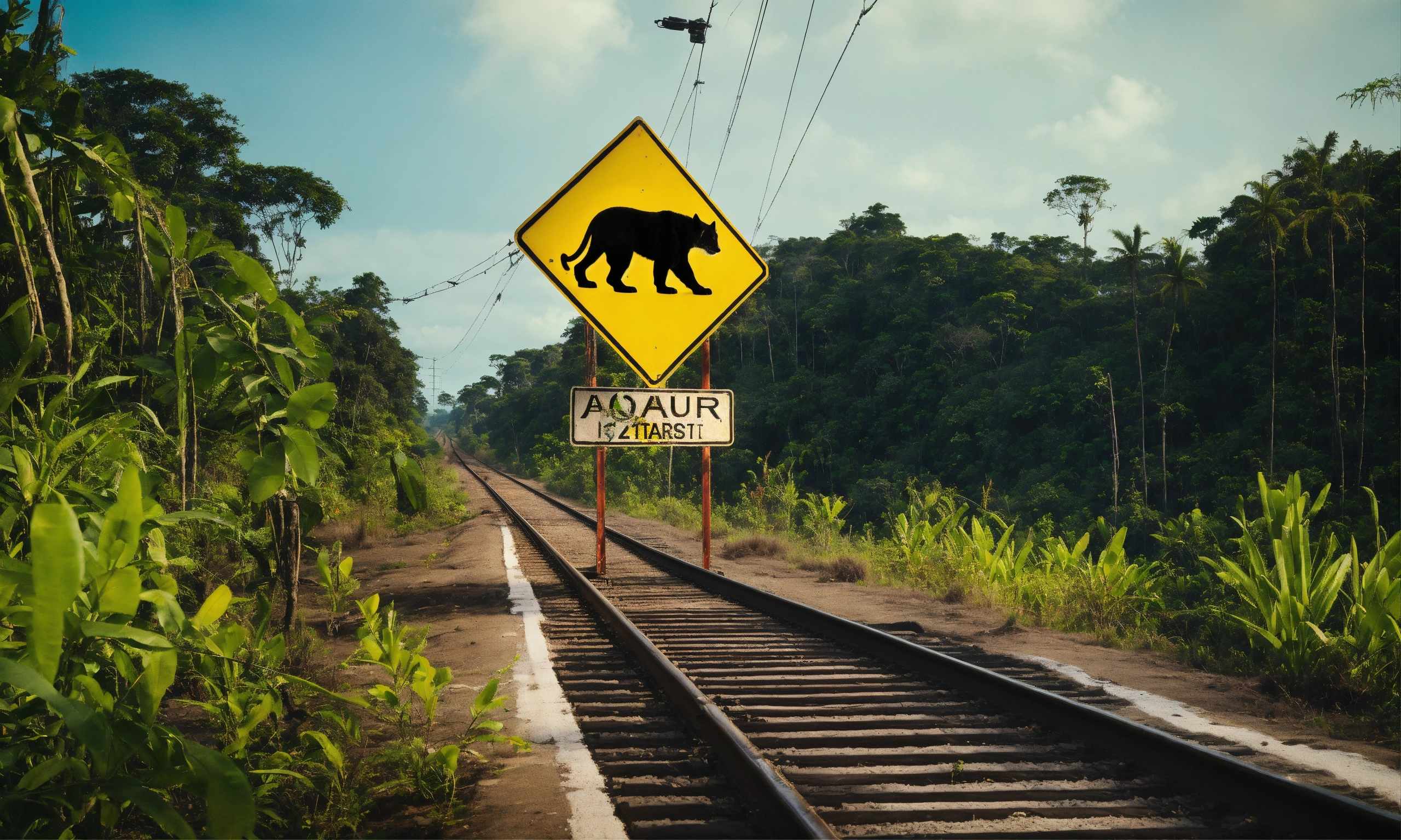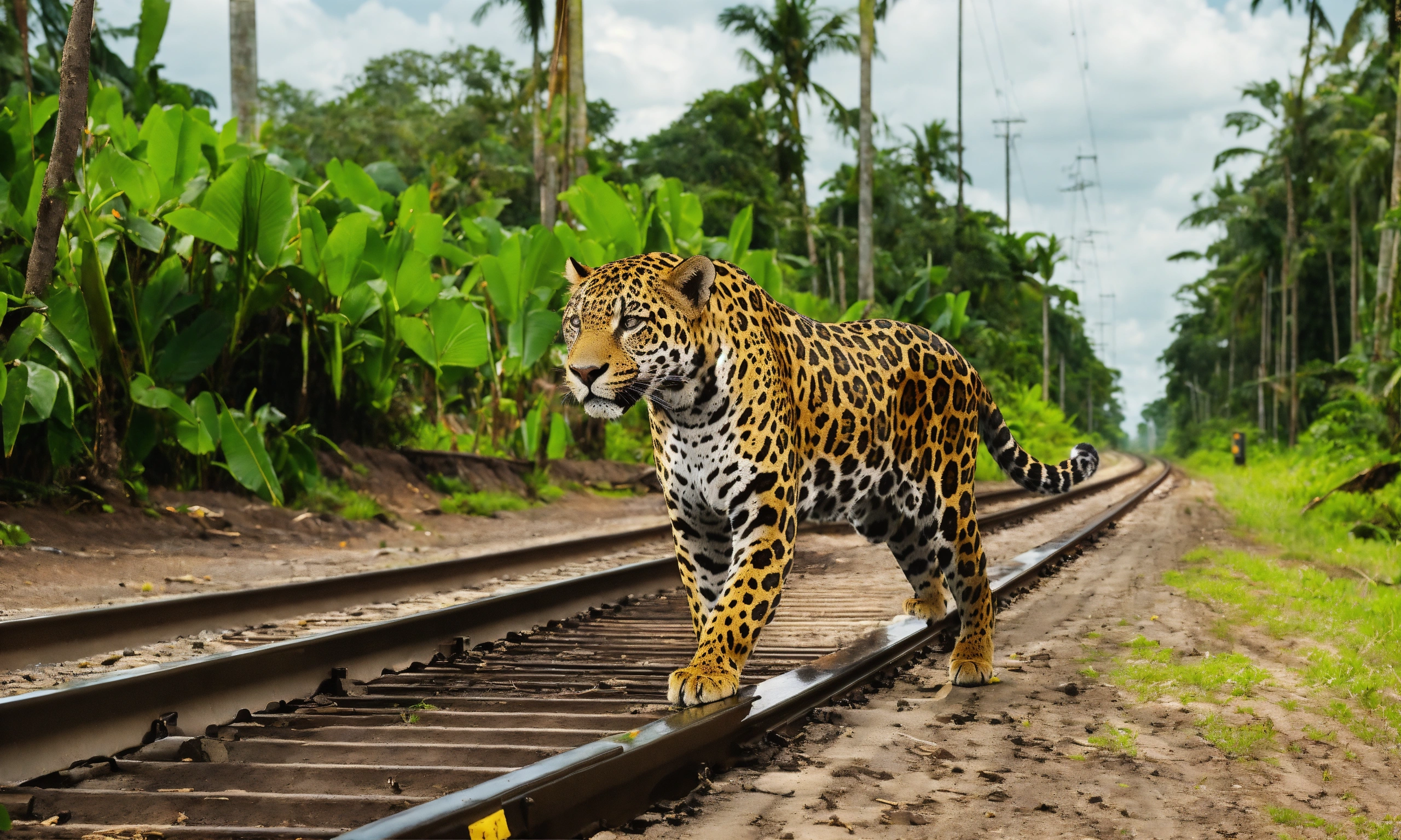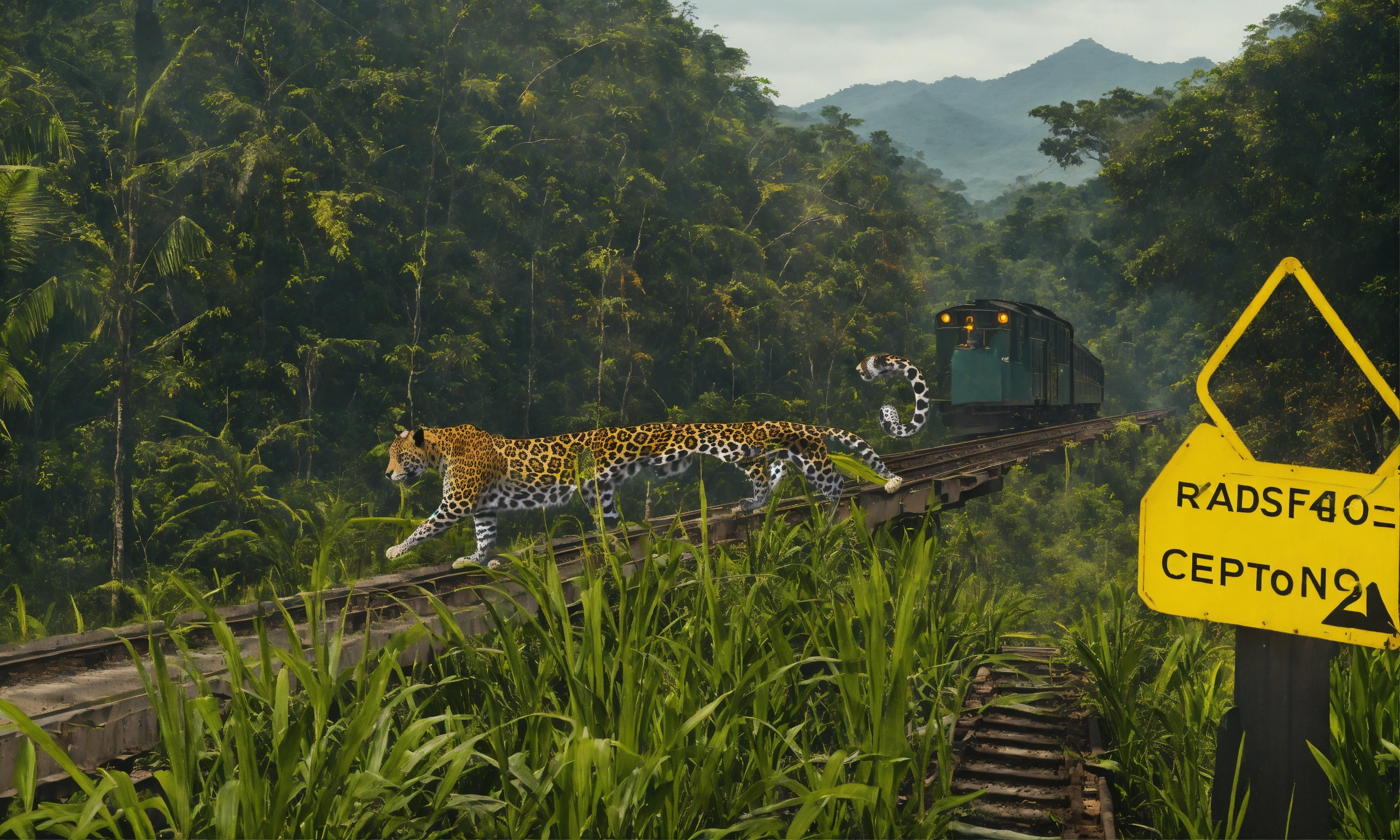 A jaguar crossing a railroad from left to right in the middle of the jungle, on the right side of the railroad we see a yellow traffic sign