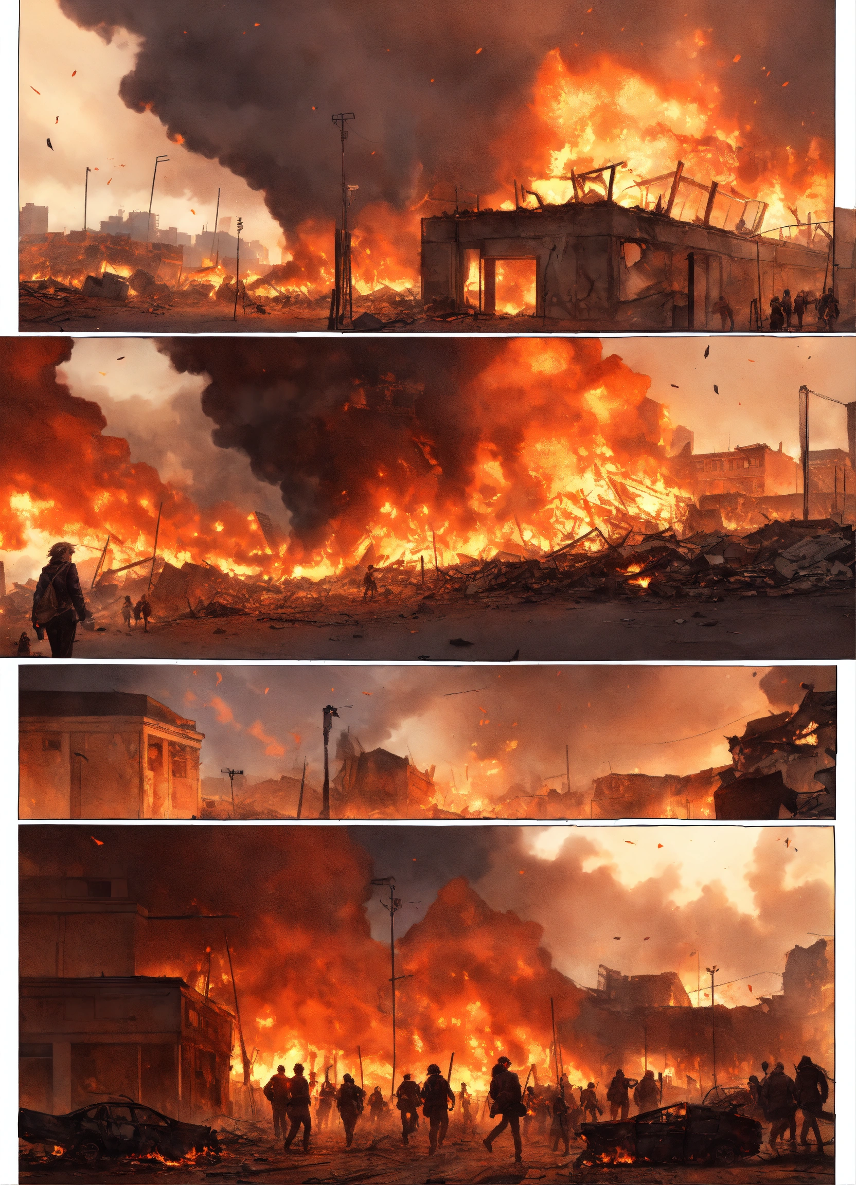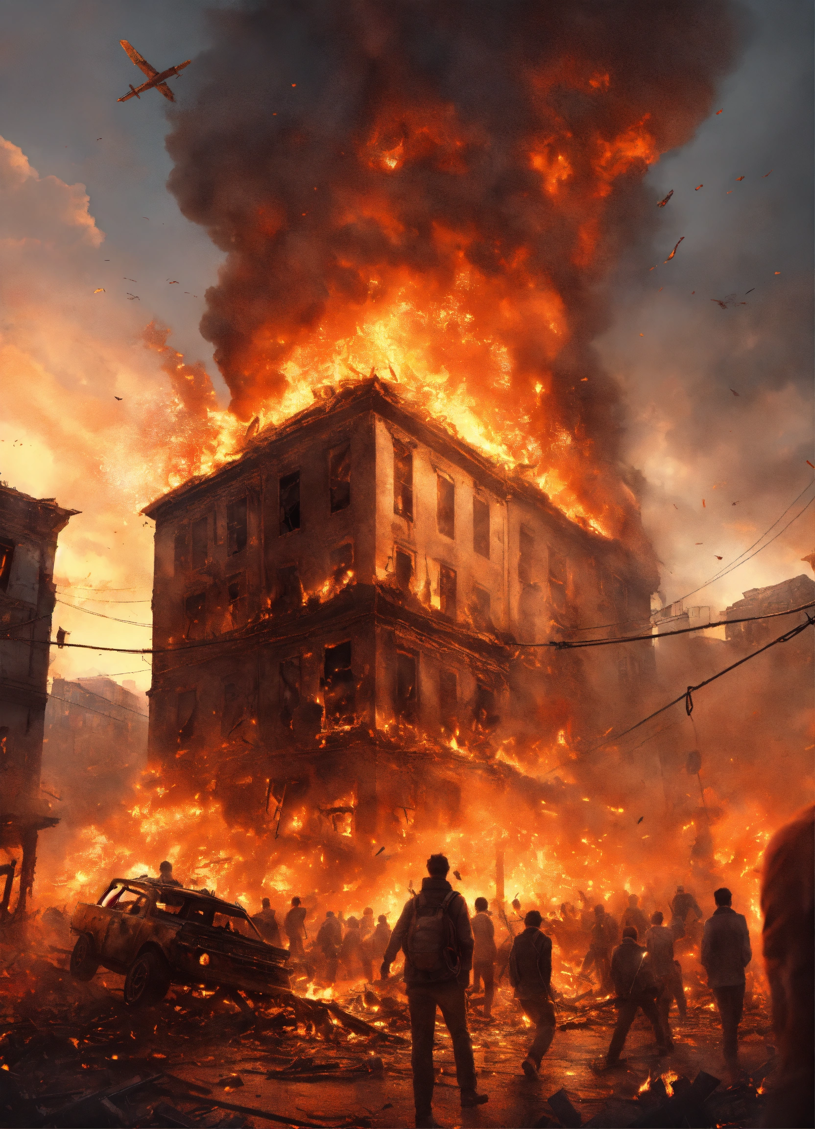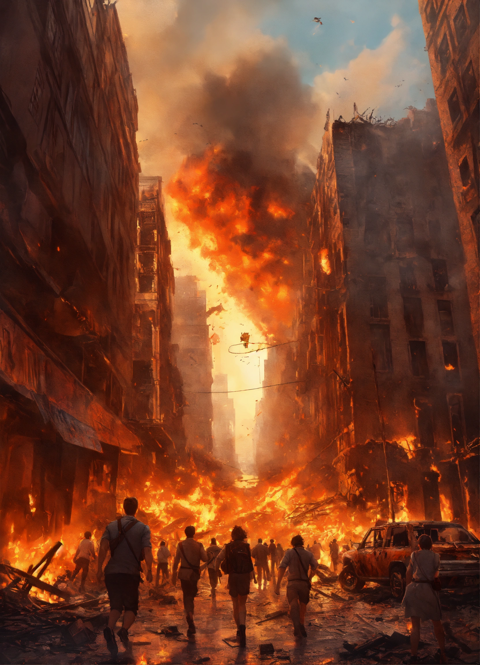 A sworn of people running crazy in fear, looking up to sky, and burning fire everywhere, chaos, falling buildings, burnt cars, city destroyed