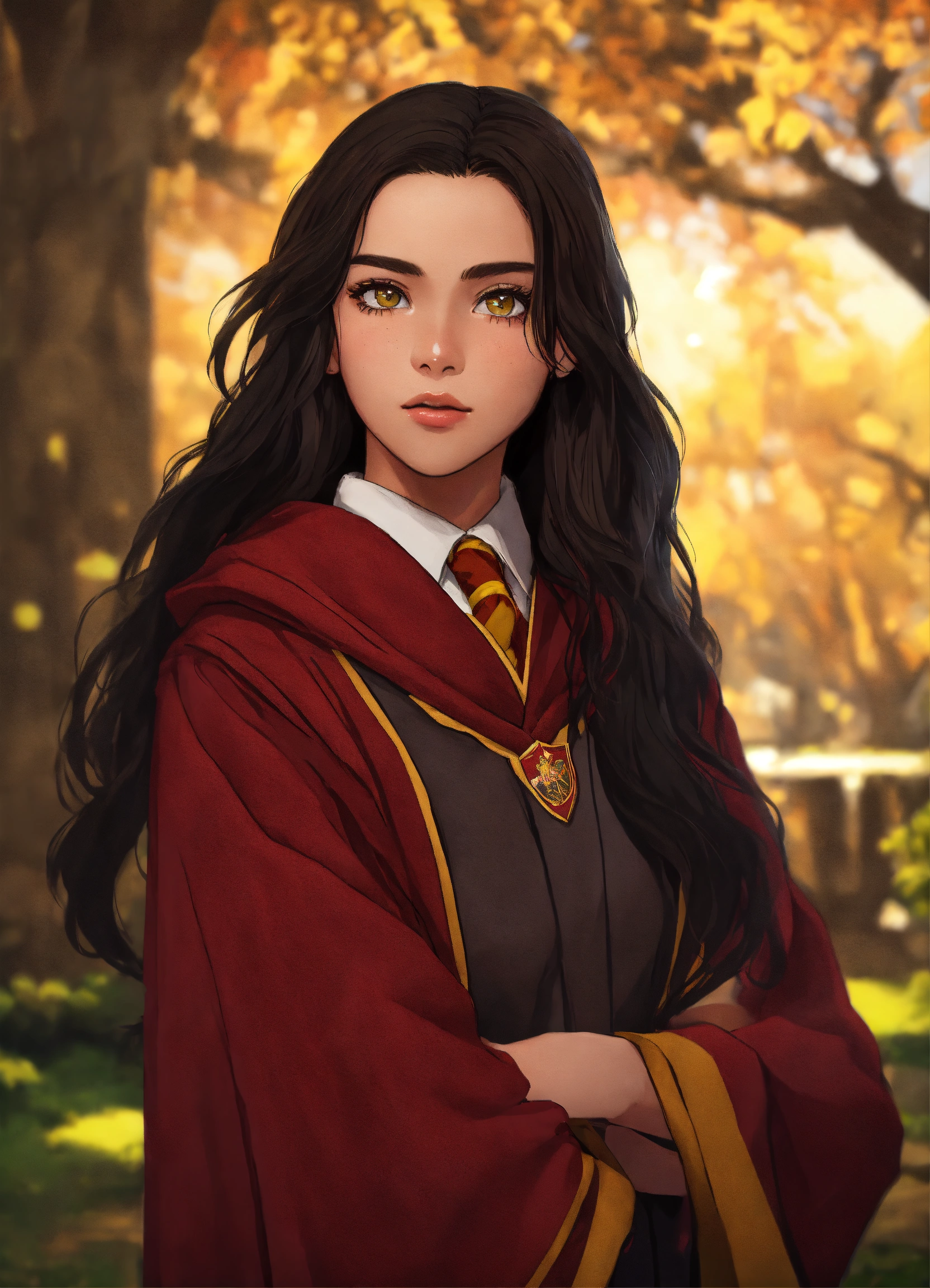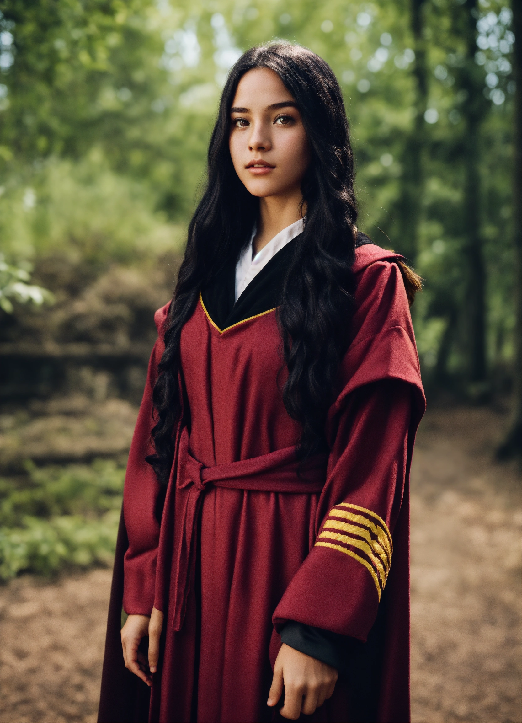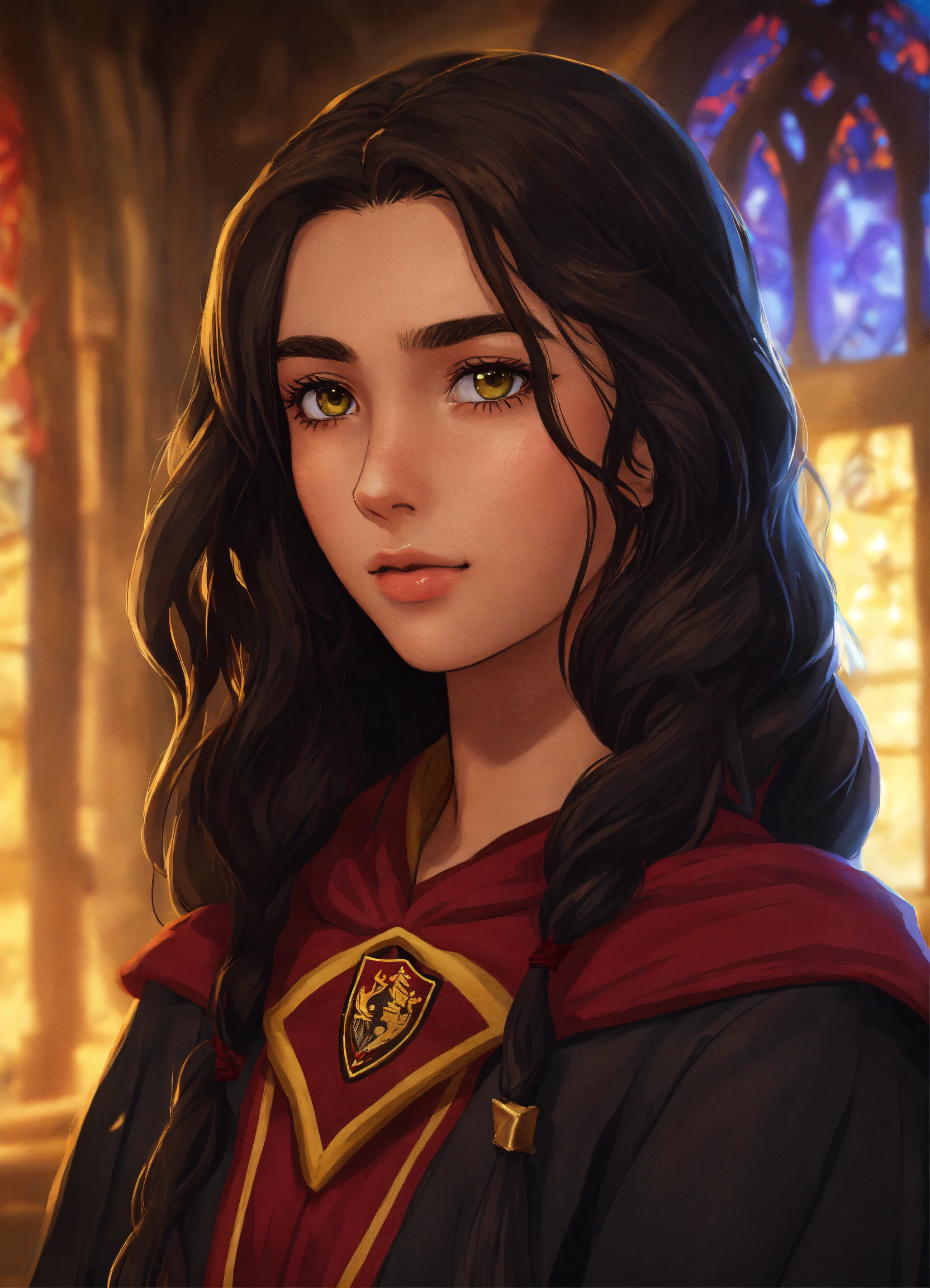 17-year-old female, olive-toned skin, hazel eyes, long black hair, gryffindor robes, facing camera, facing forward, animated, up close
