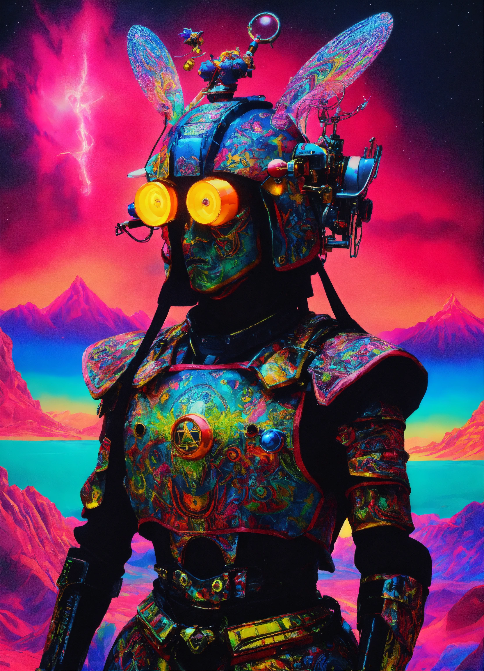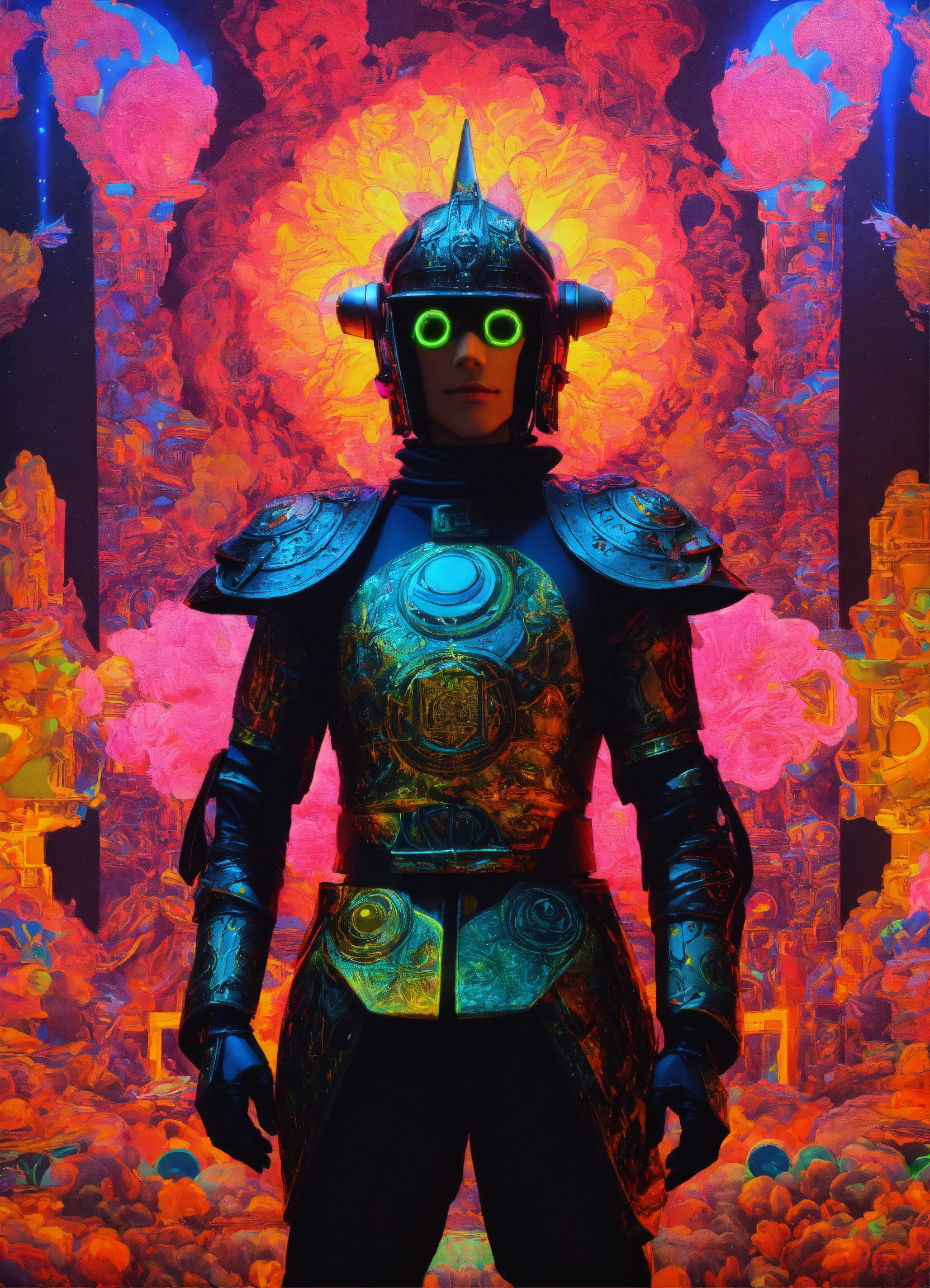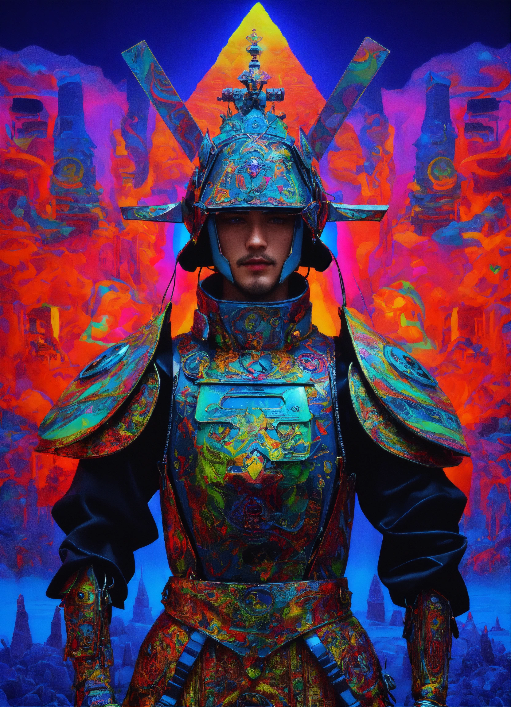 Hyperion holy mountain the movie photorealistic 3d 35 mm portrait of gothic samurai robot wear prada male tantric warrior man ai god dmt laughing psytrance grimes punk rock anime haute couture costume, baptized in a cosmic alex grey painting in a dmt black laser light neon black glitter holographic techno club art by salvador dali and holy mountain the movie.