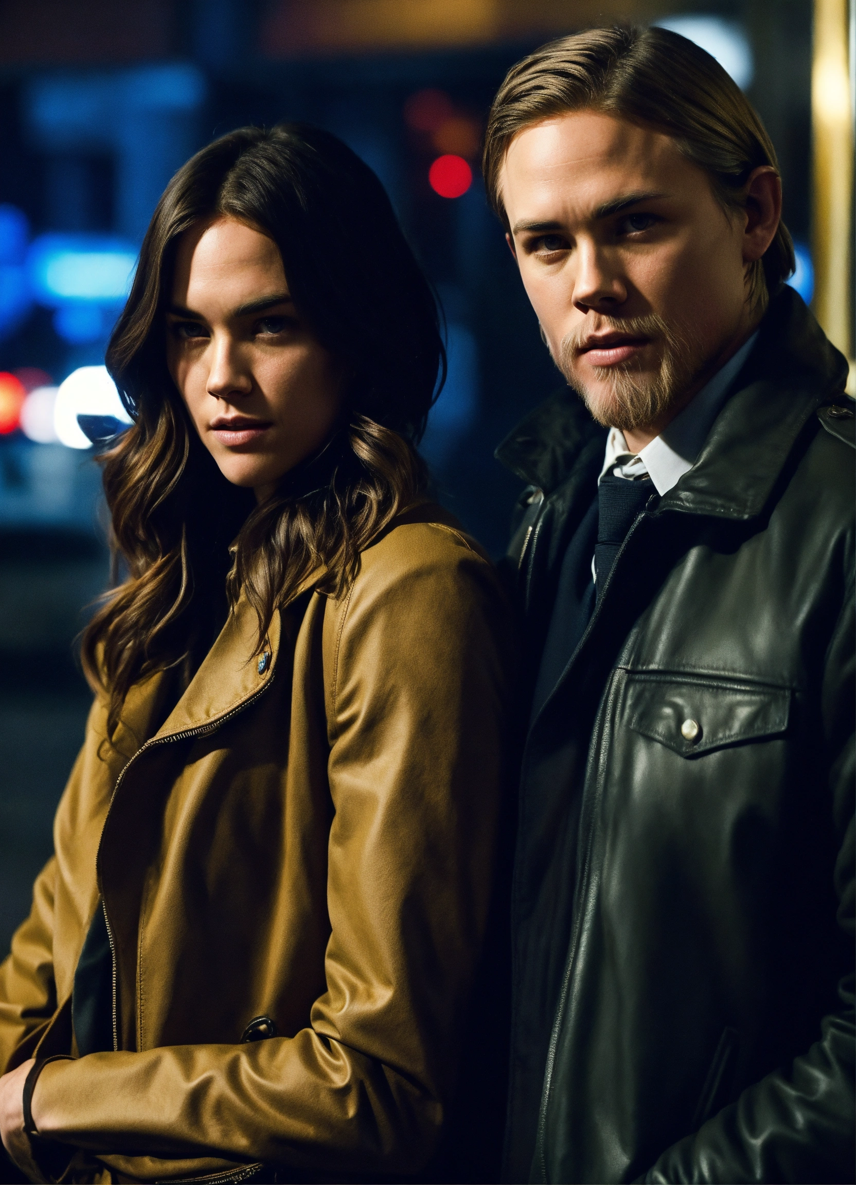 Beautiful odette annable couple together with charlie hunnam fbi agent, crime style. serial killer hunt, cinematic, night chicago, dangerous situation, suspense, cinematic