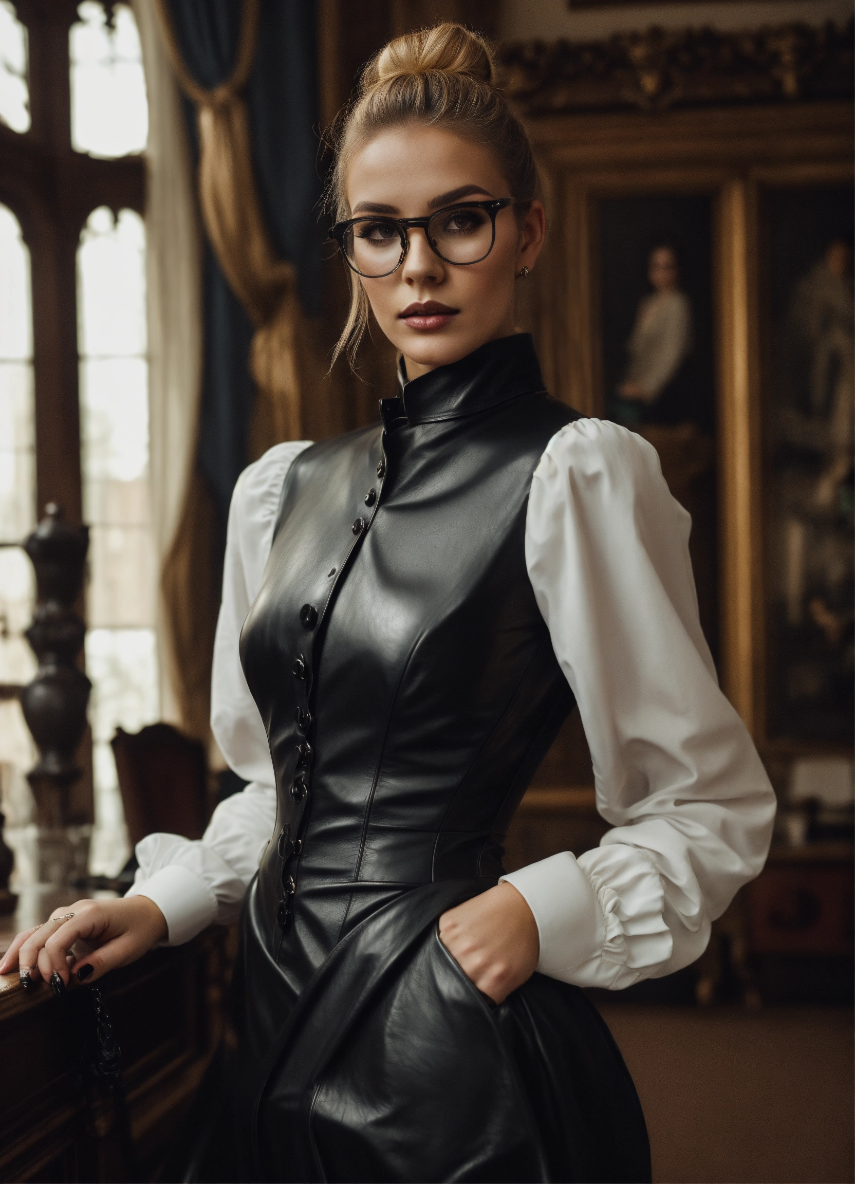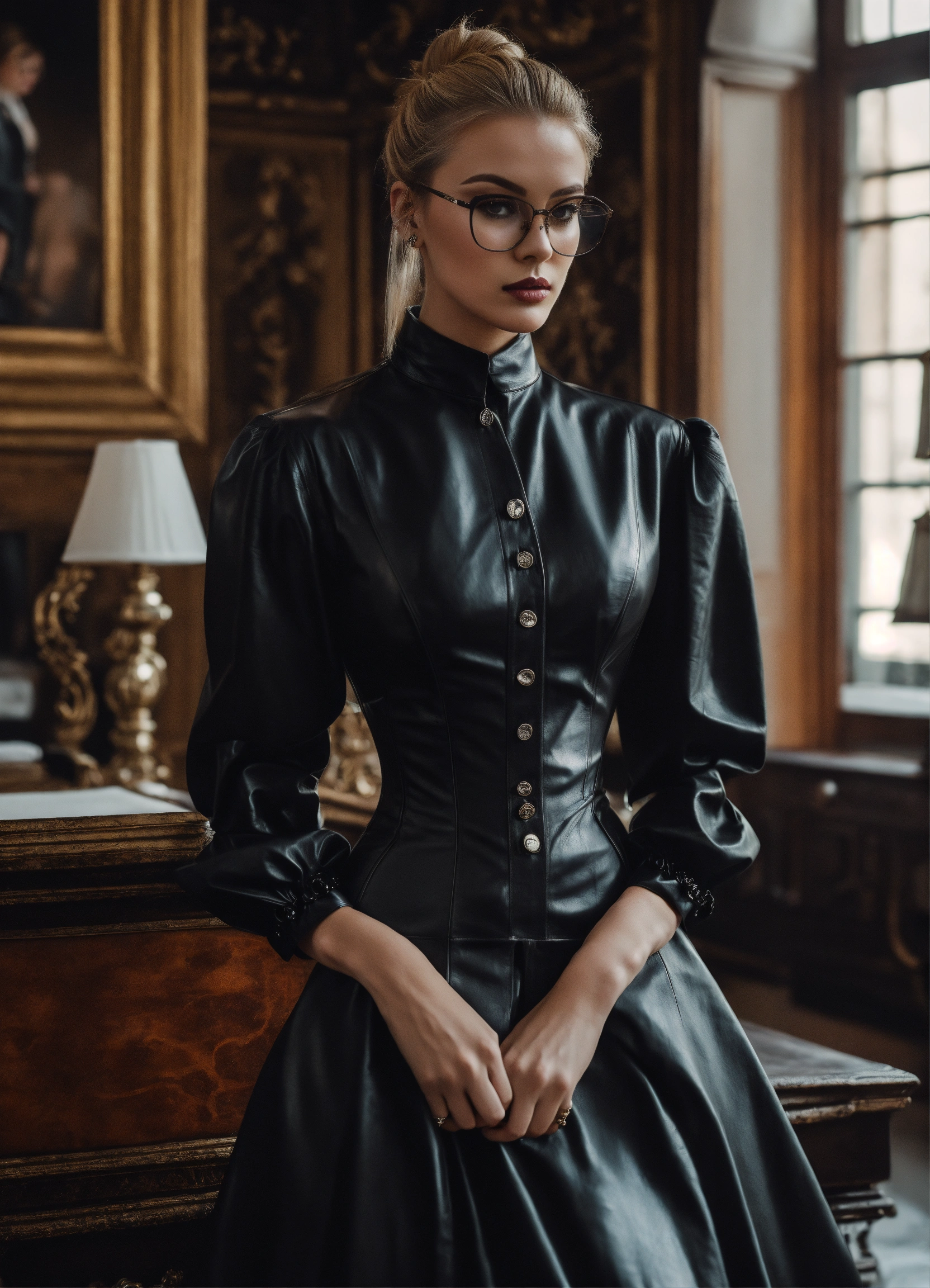 Stunning french seductress woman fashion model looking strict, blonde straight hair bun, glasses, black leather corset, long strict victorian governess wide black long leather shirt dress with long big puff sleeves and big buttons, mansion room, white office shirt, eyeliner makeup