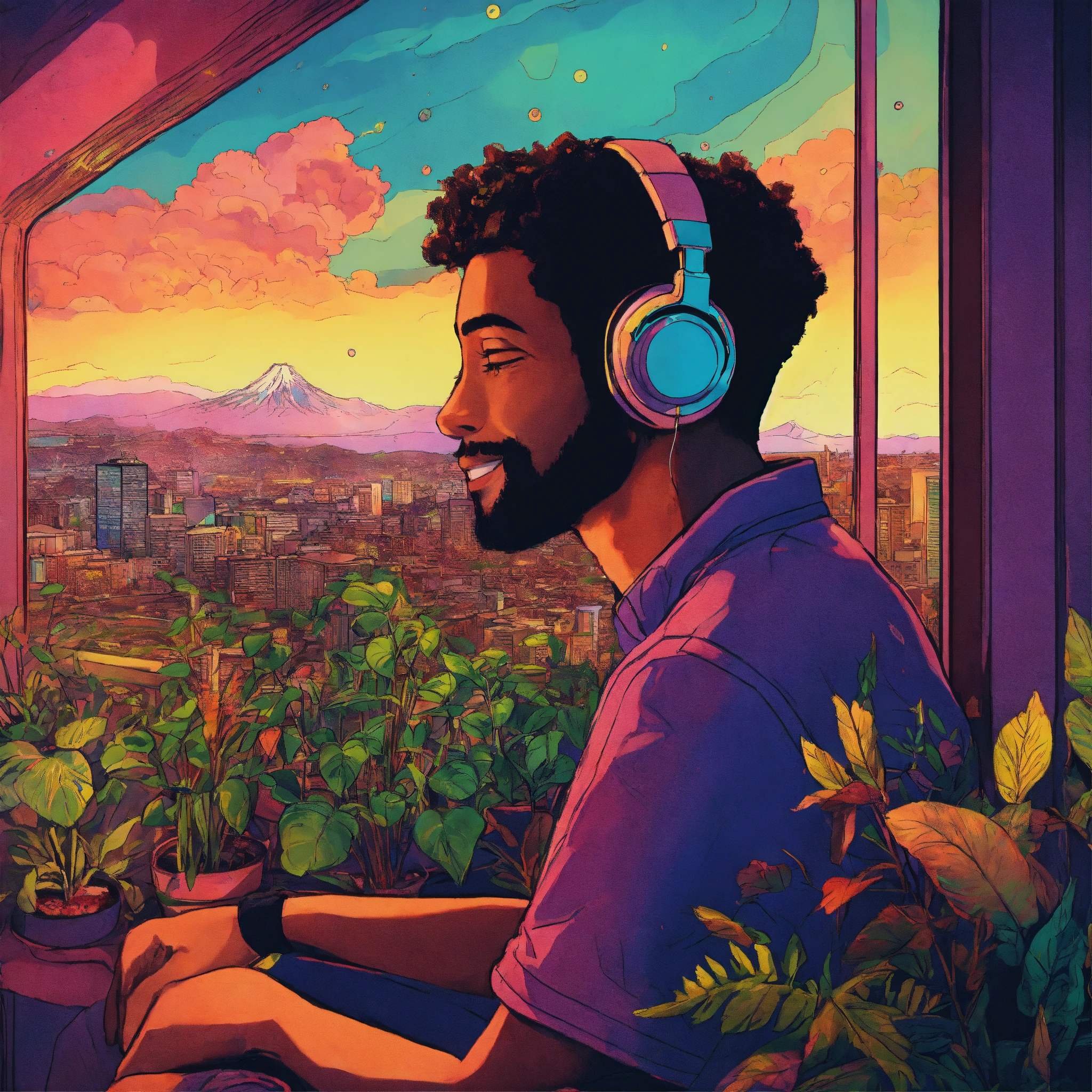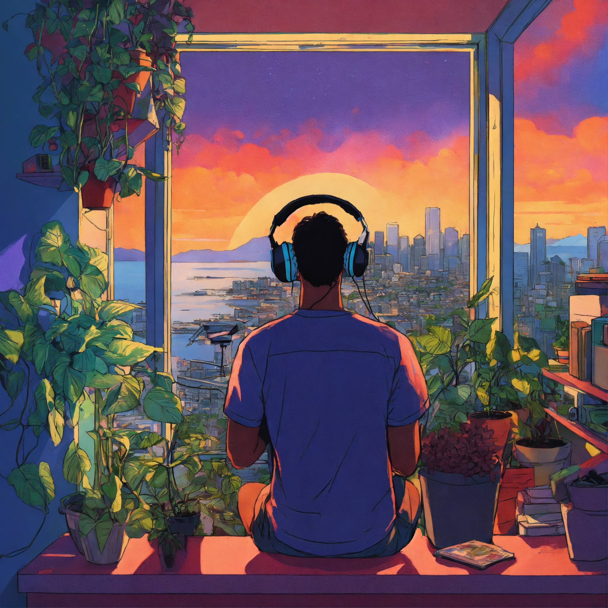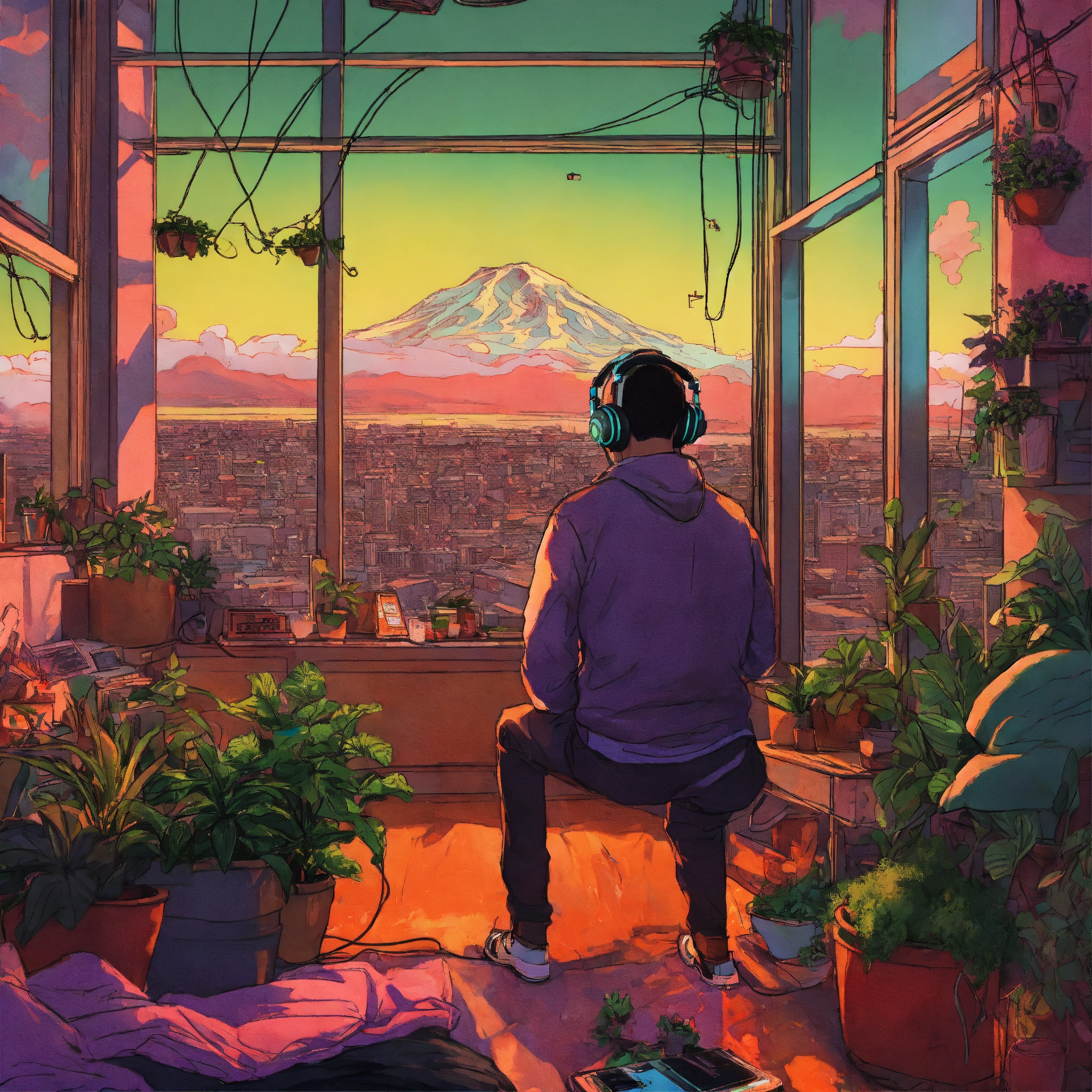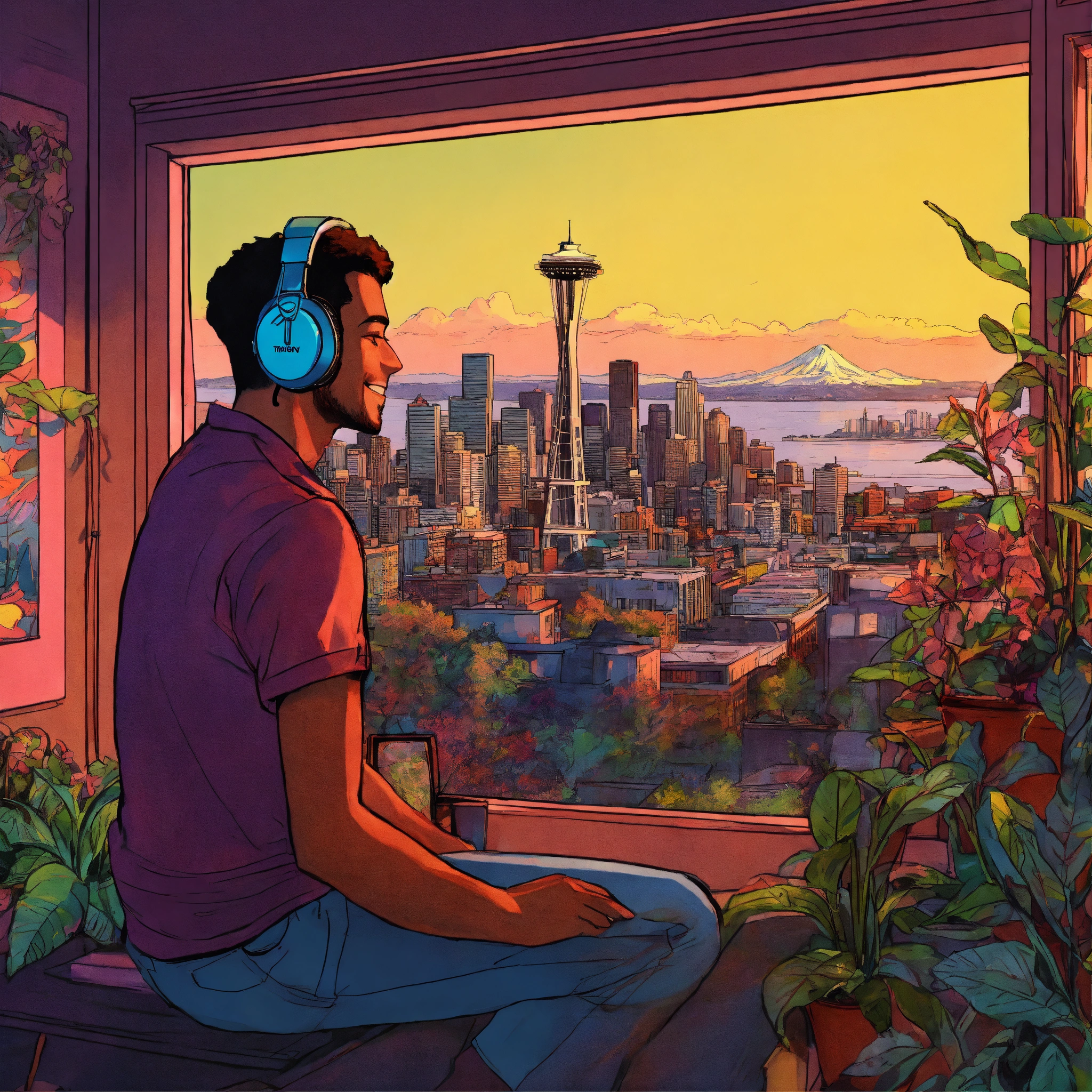 Tow man wearing headphones looking out over seattle, smiling, wide shot, messy room with plants, psychedelic henry schein illustration, dramatic lighting, vibey colors