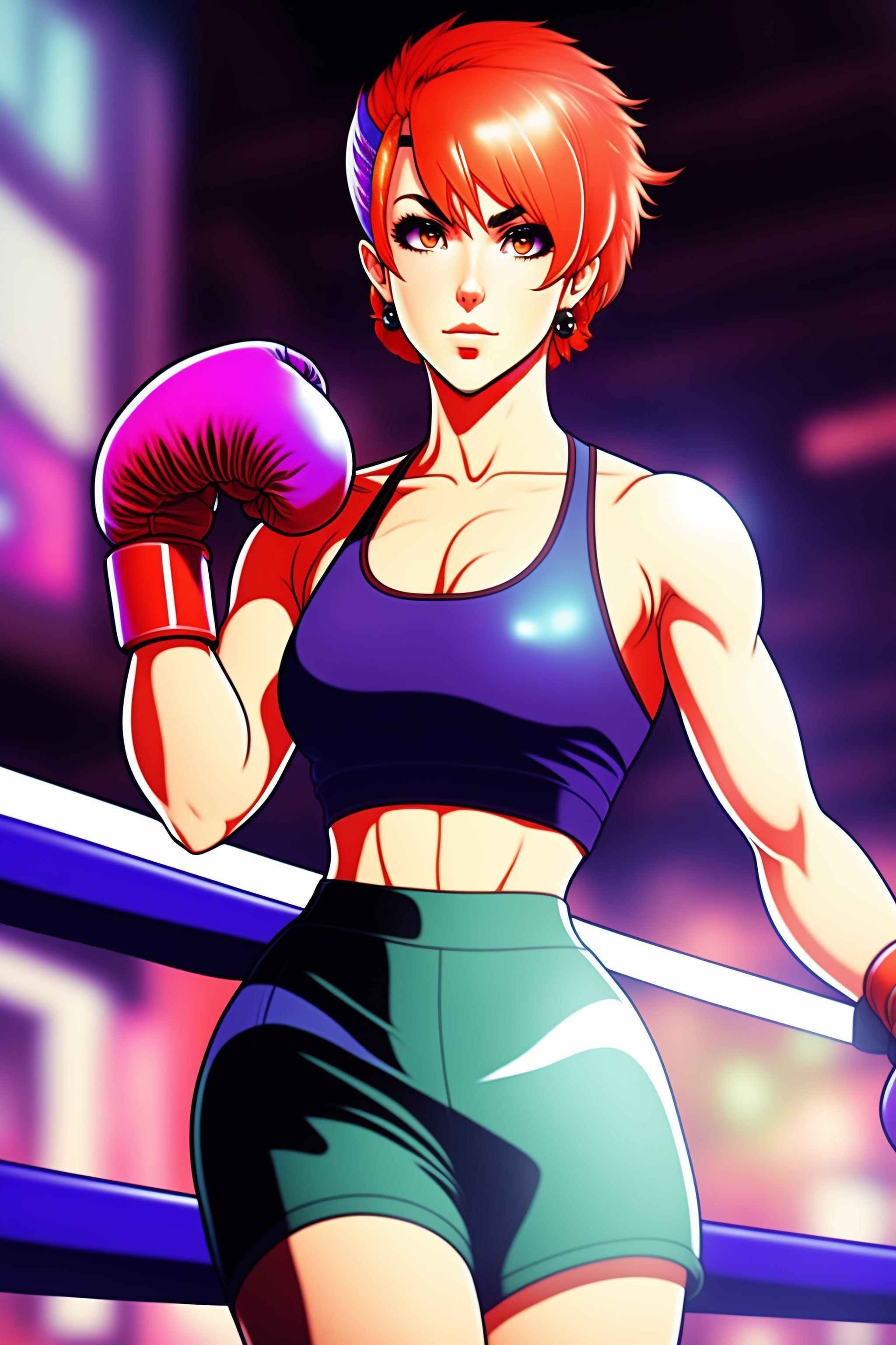 A short haired female boxer in a bright tight tank top and tight leggings wearing boxing gloves, 90s anime, cel-shaded, highly detailed, desaturated, gothic, oppressively atmosphere, poster