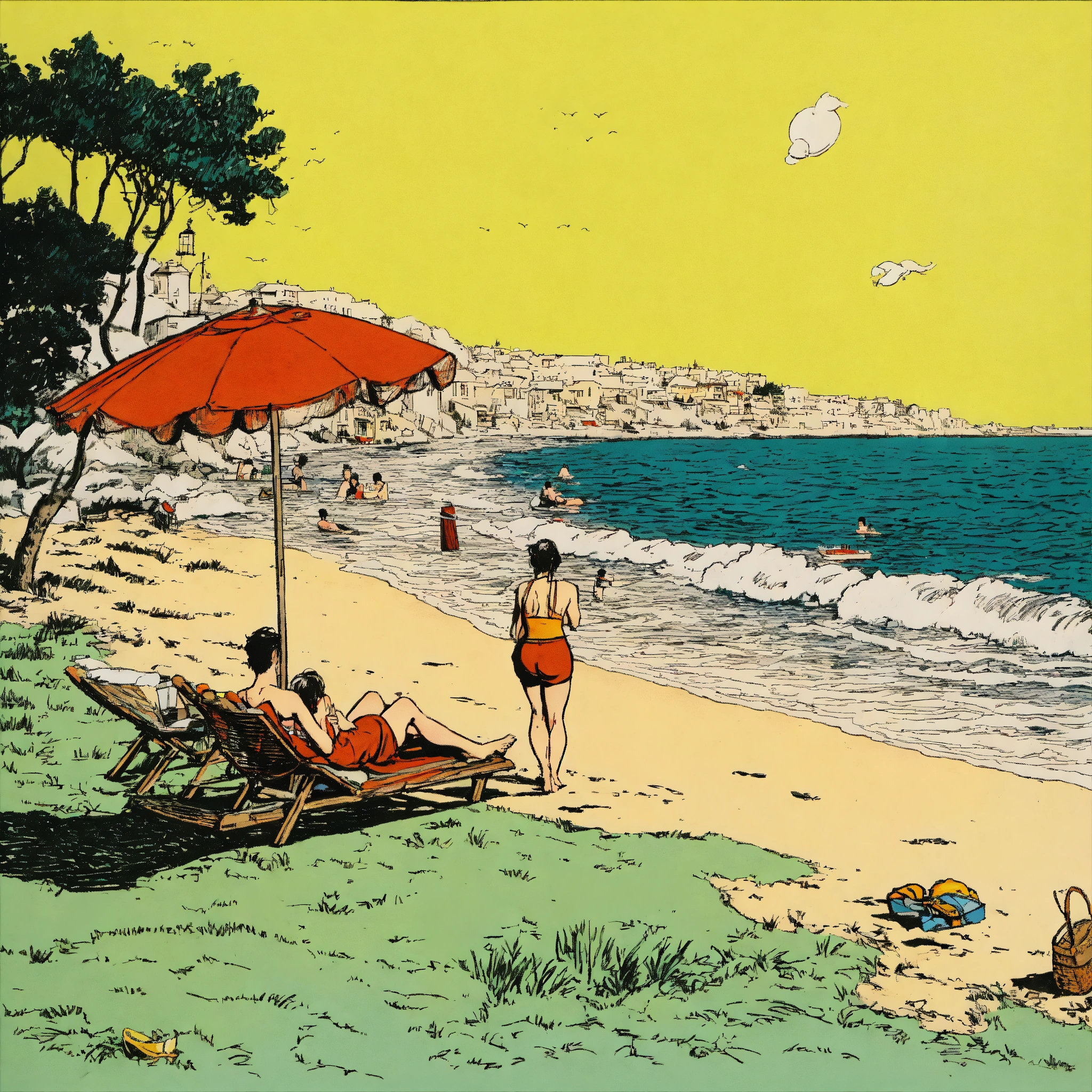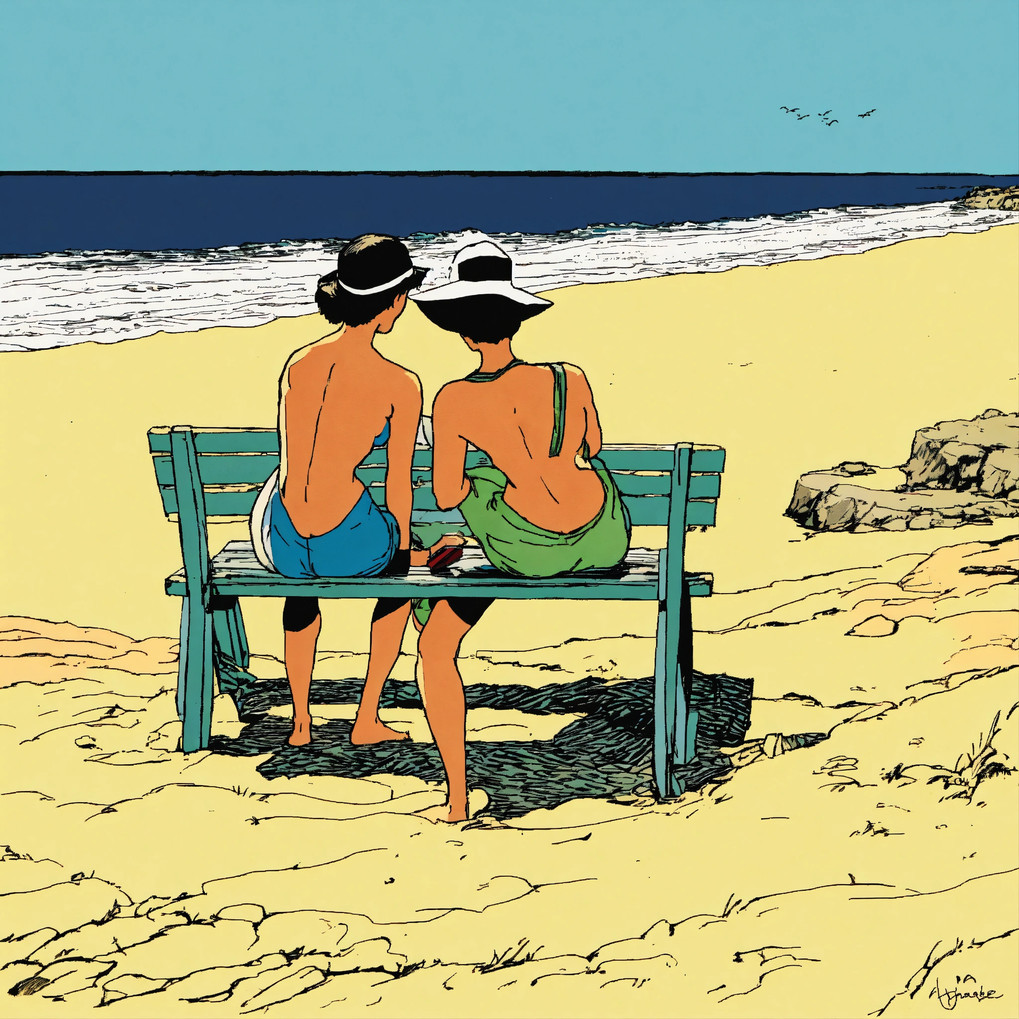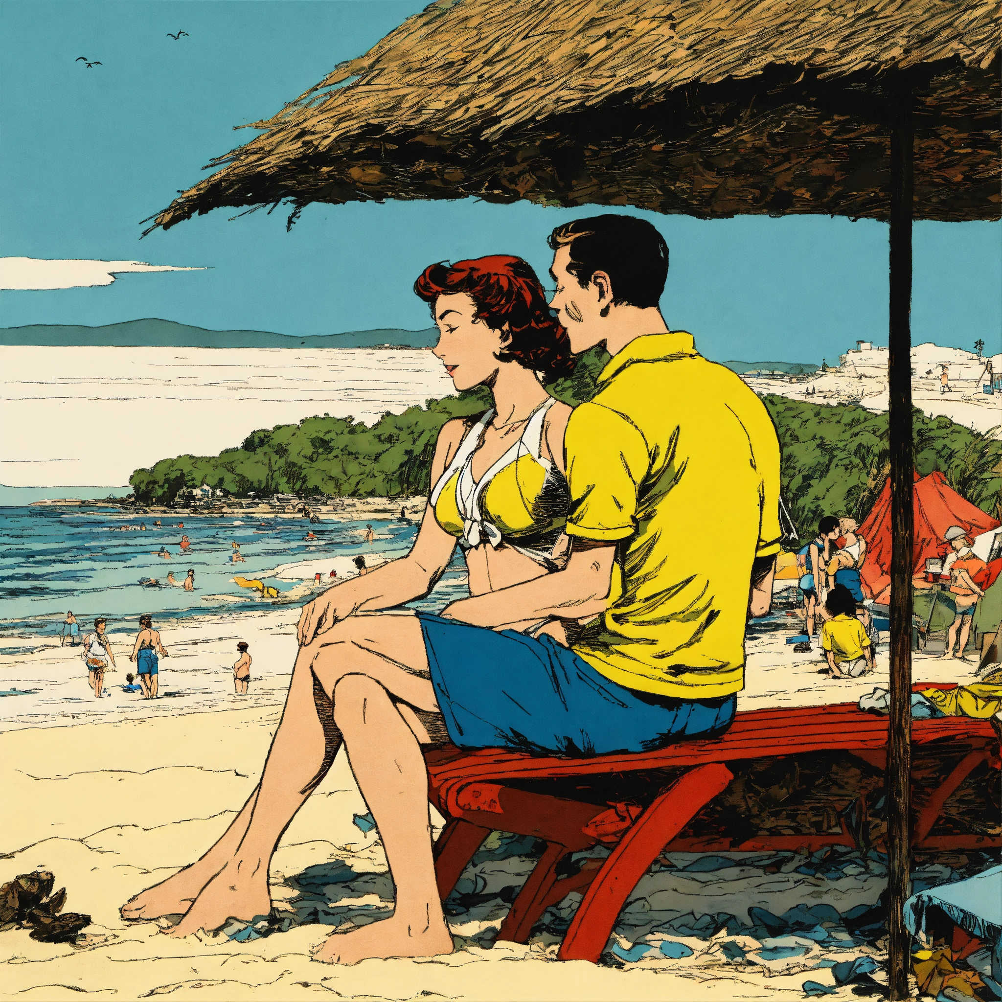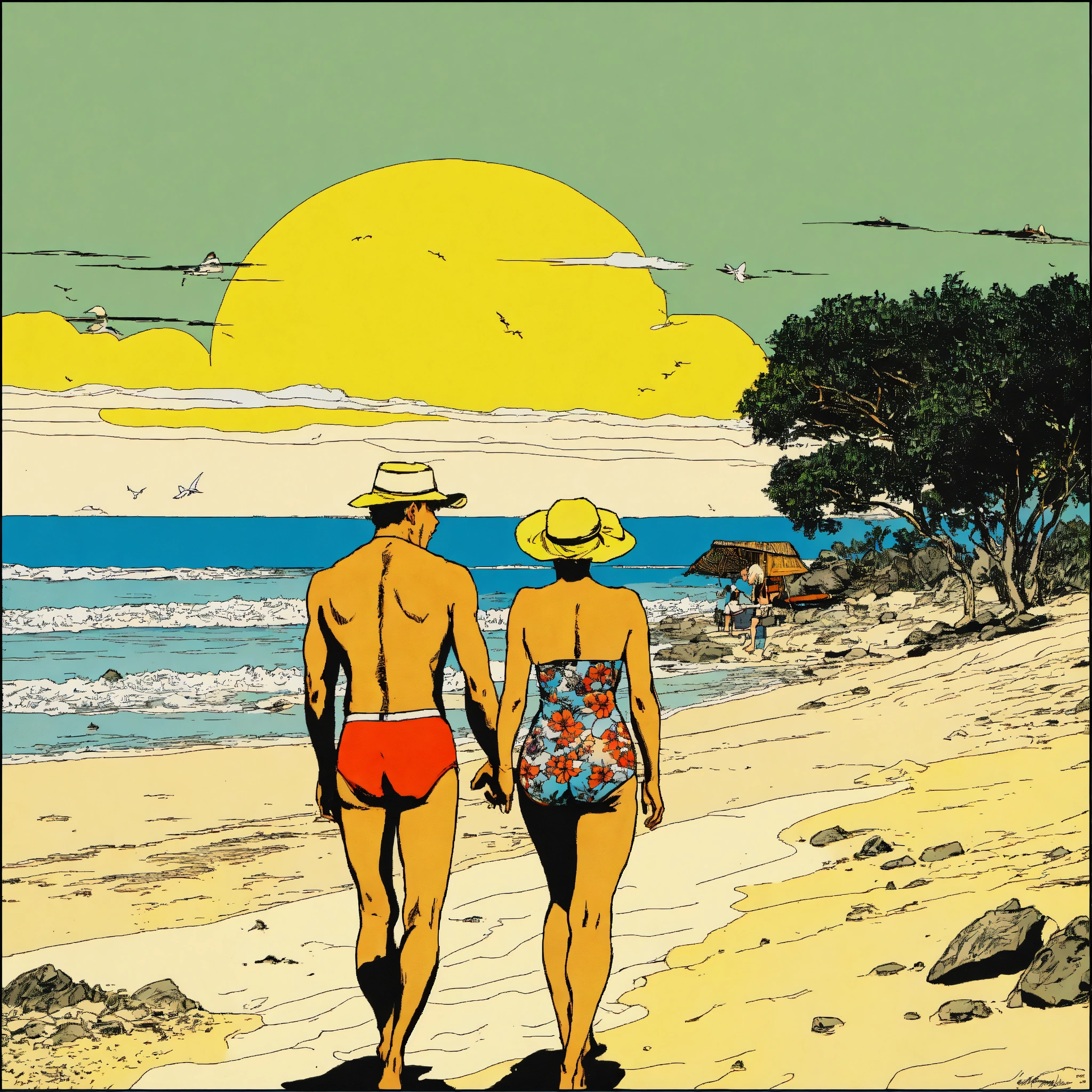 Pen and ink, illustrated by hergé, a loving couple in swim suits alone forever. stunning color scheme, masterpiece.beach scene
