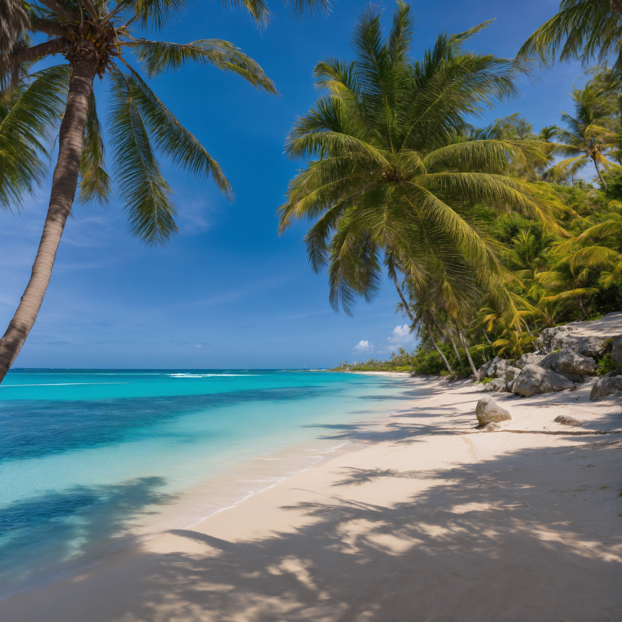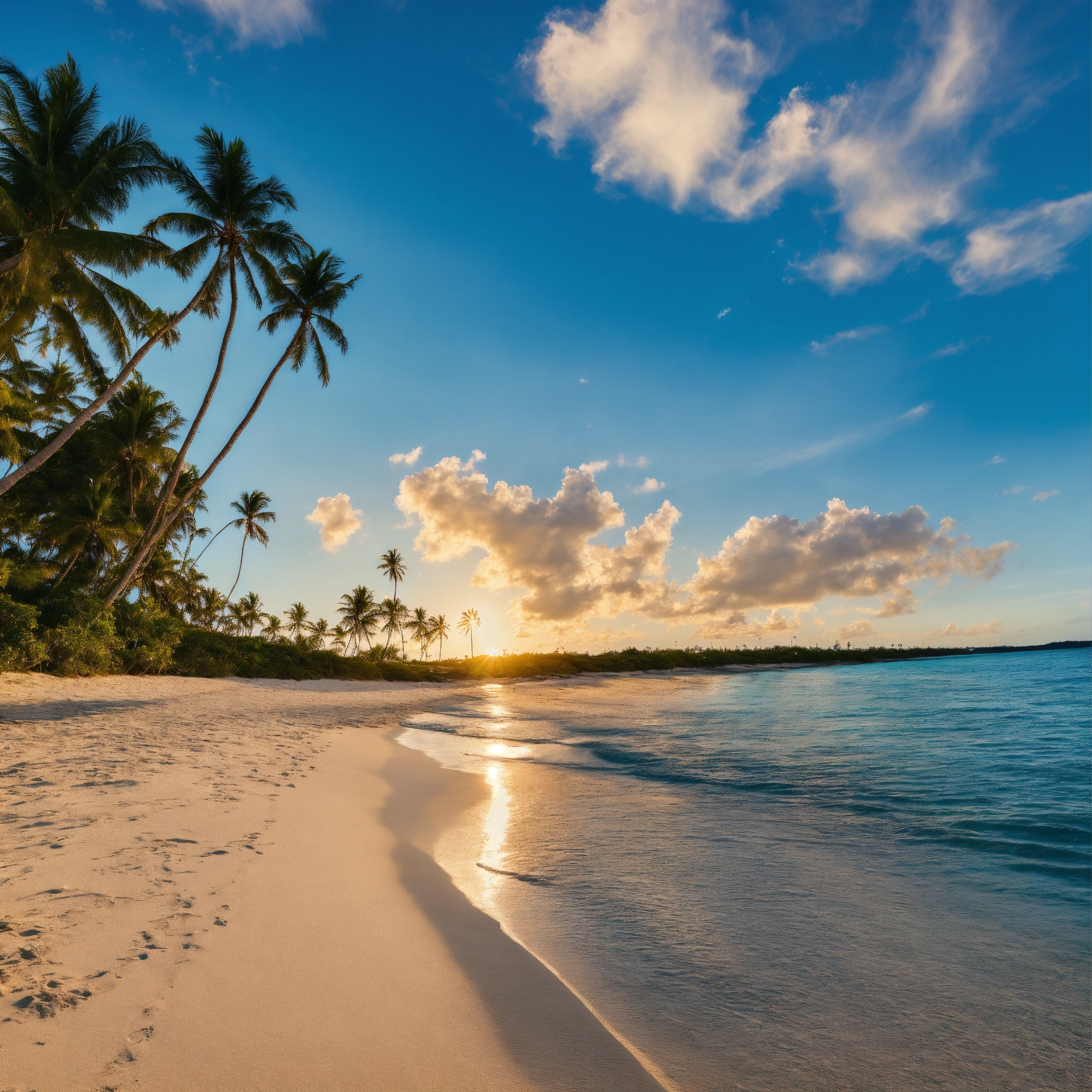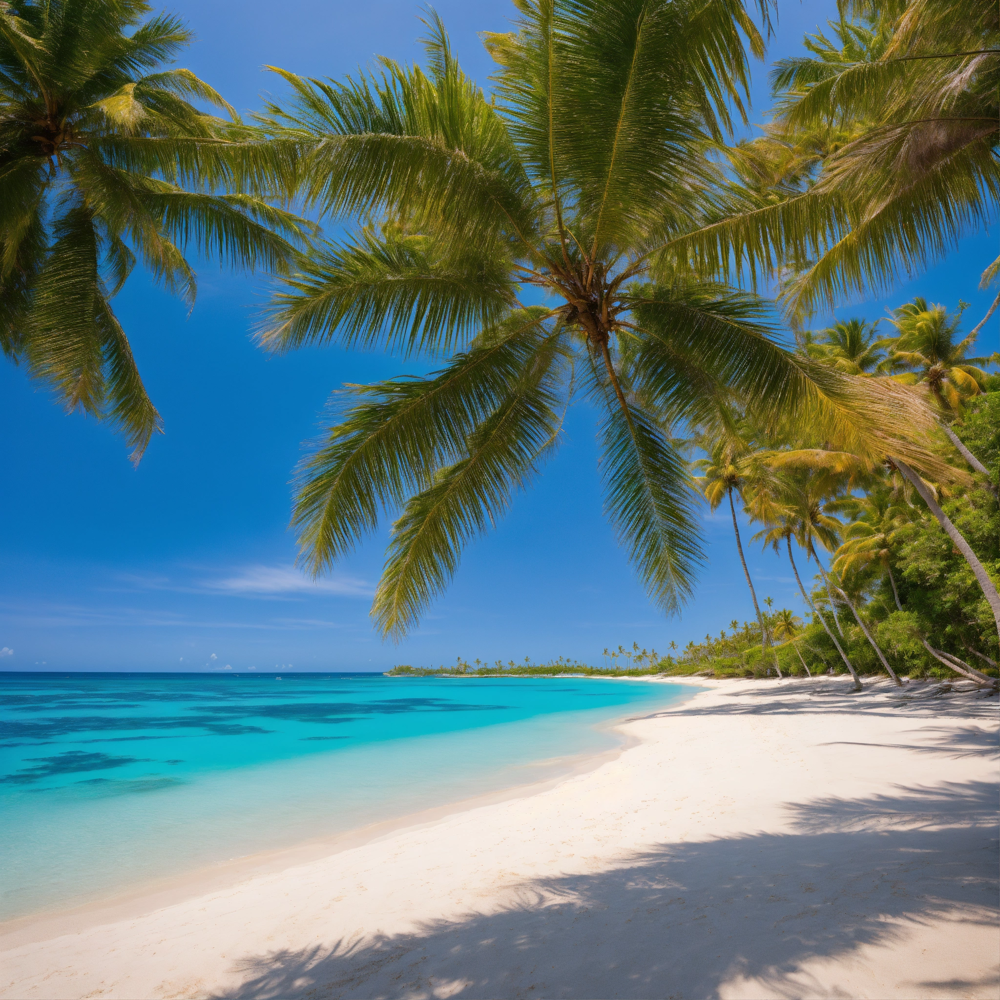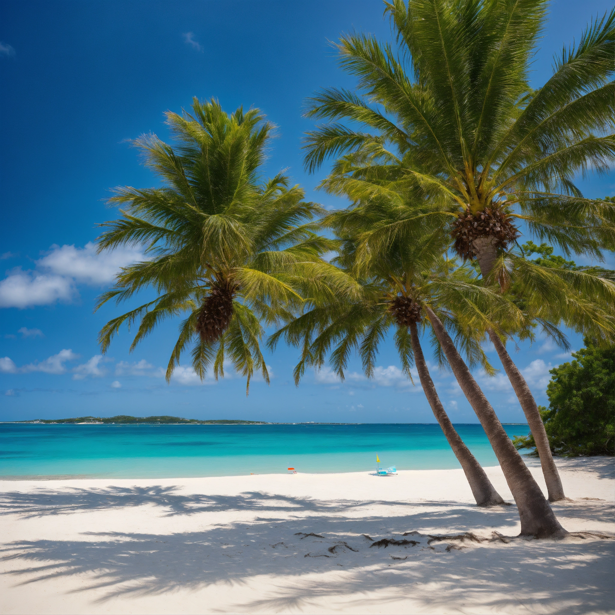 A photo of a beach with clear blue water and white sand, there are palm trees and a blue sky in the background