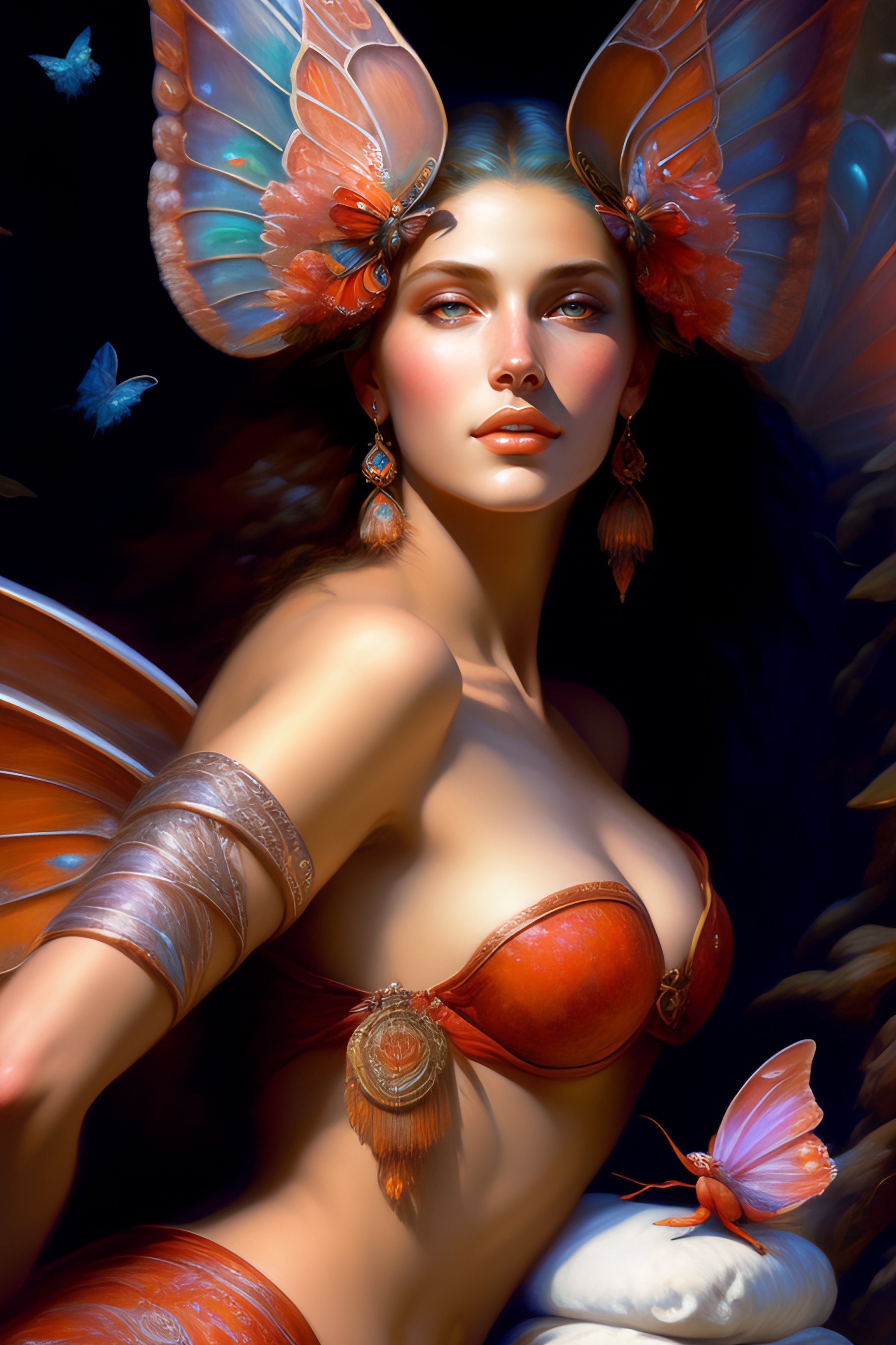 Detailed paint of mermaid with butterfly wings, highly detailed paiting by gaston bussiere, craig mullins, j.c. leyendecker, 8k, royal paiting, dynamic lighting, colorfull lighting