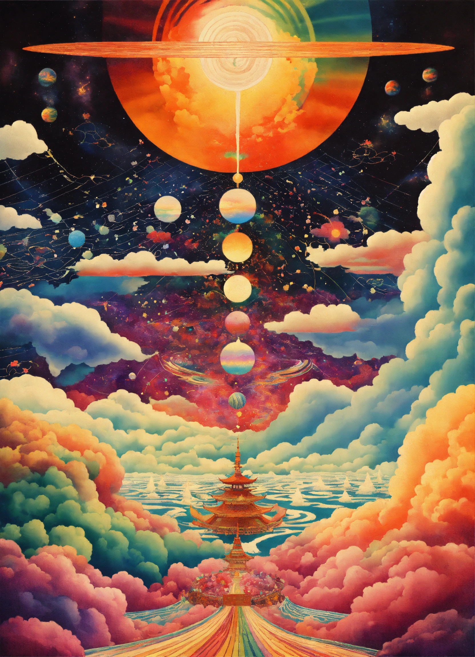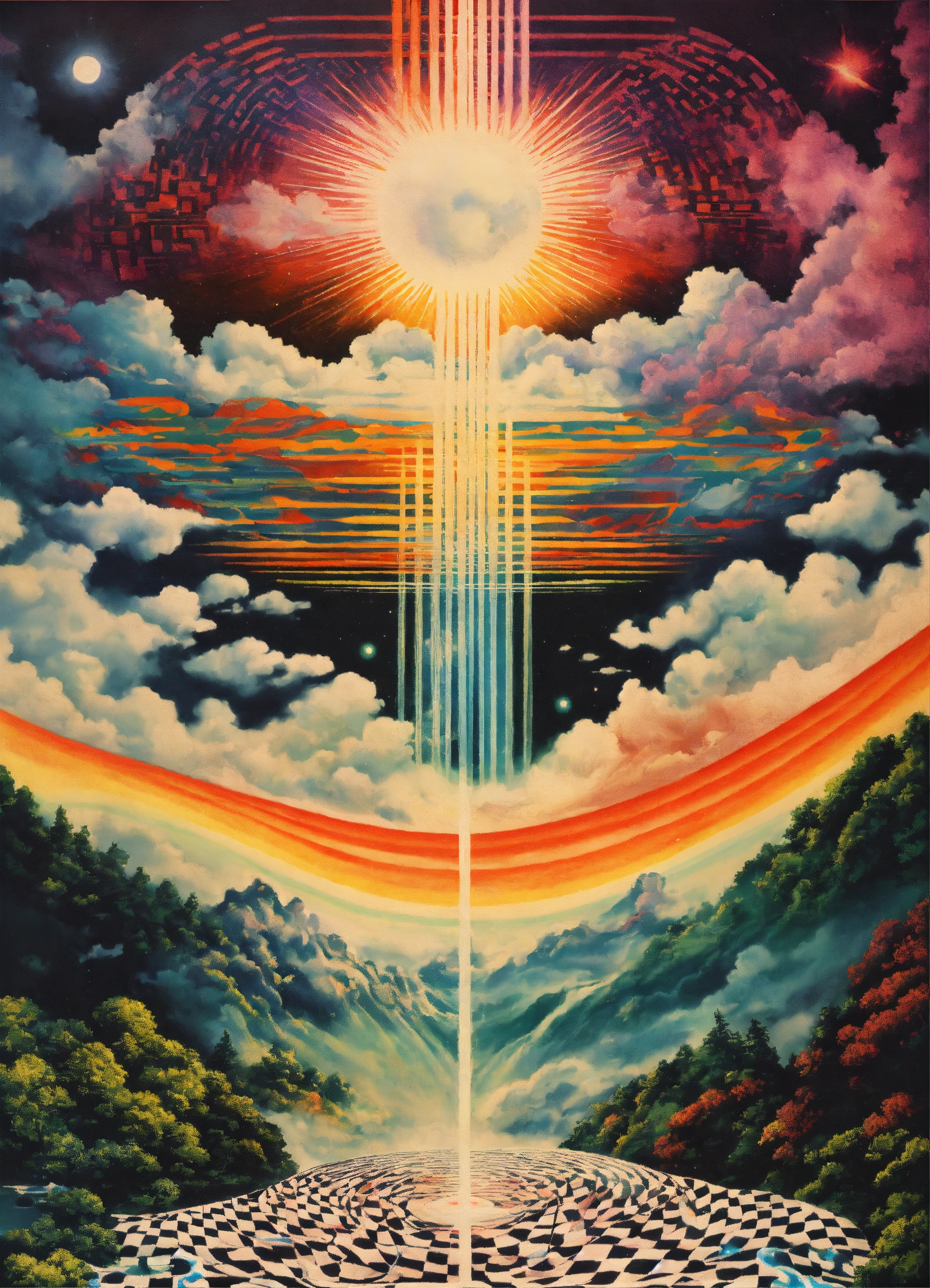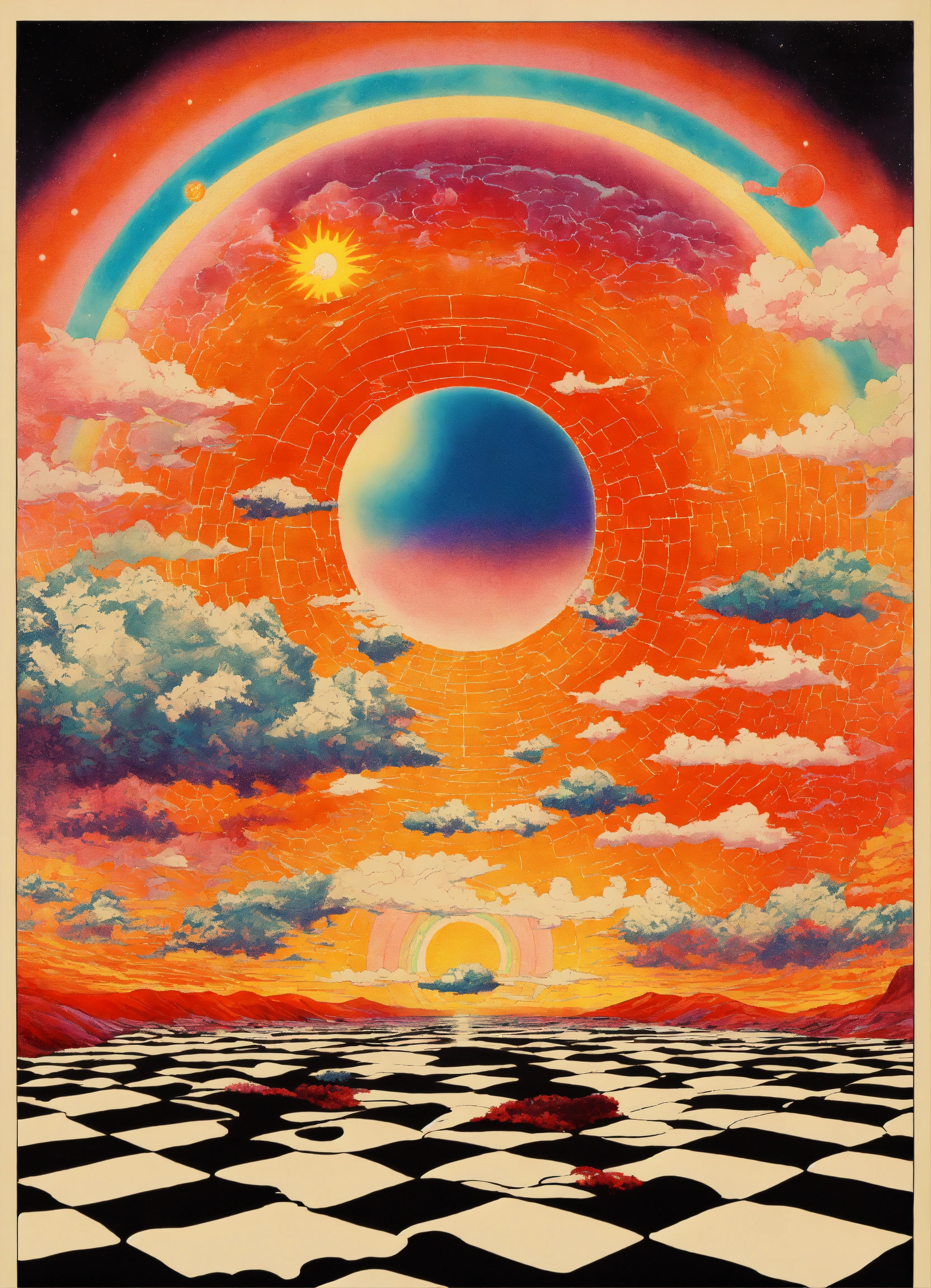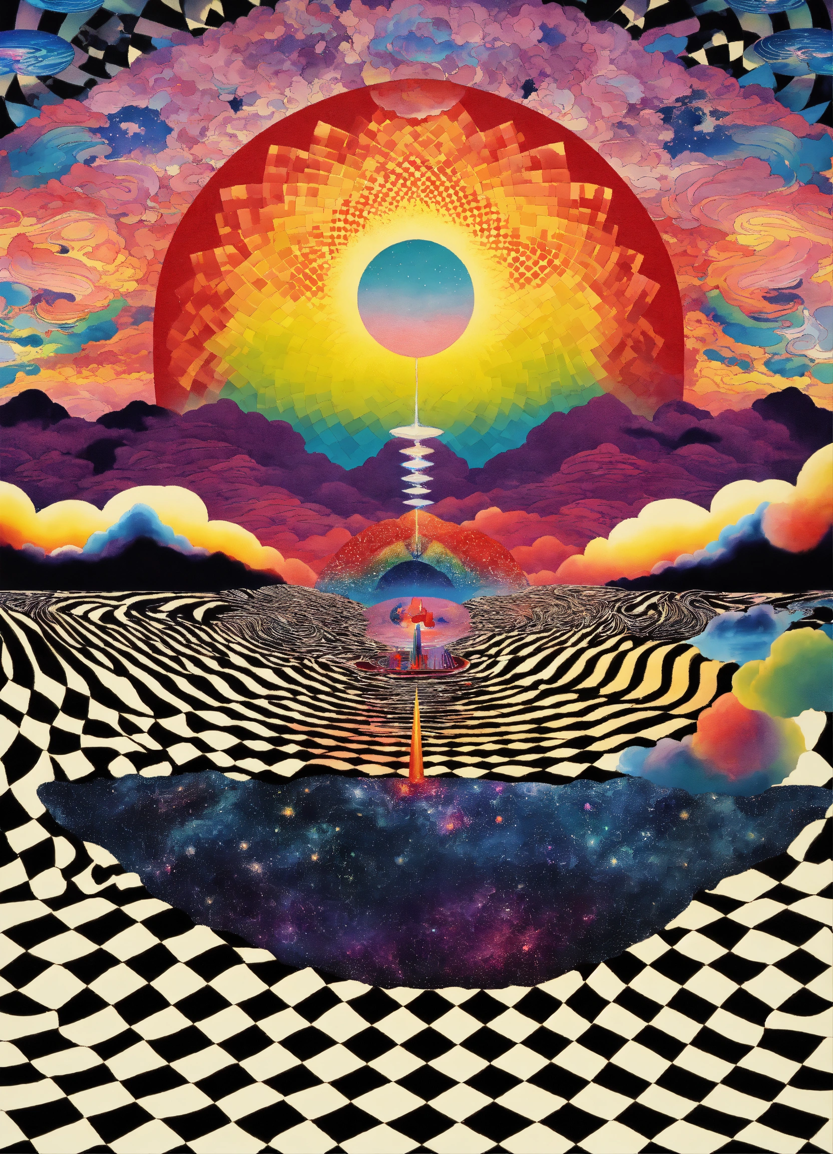 Japanese vintage poster, oriental, psychedelic realm, dream dimension merging into nebula merging into sun, geometrical clouds, the four corners of the cosmos, rainbow wavy black and white checkerboard patterns dripping, by victor-jesus escobedo.