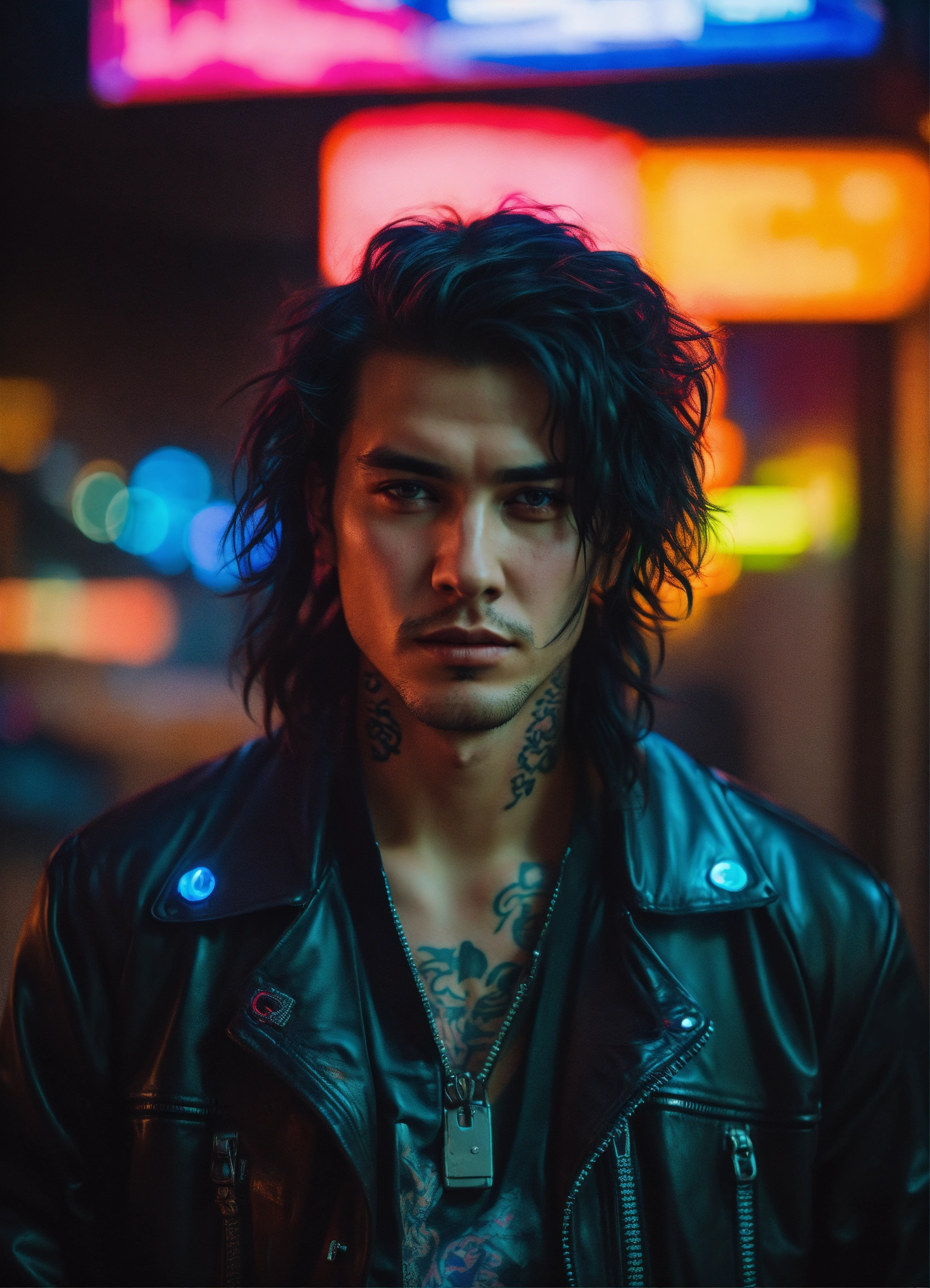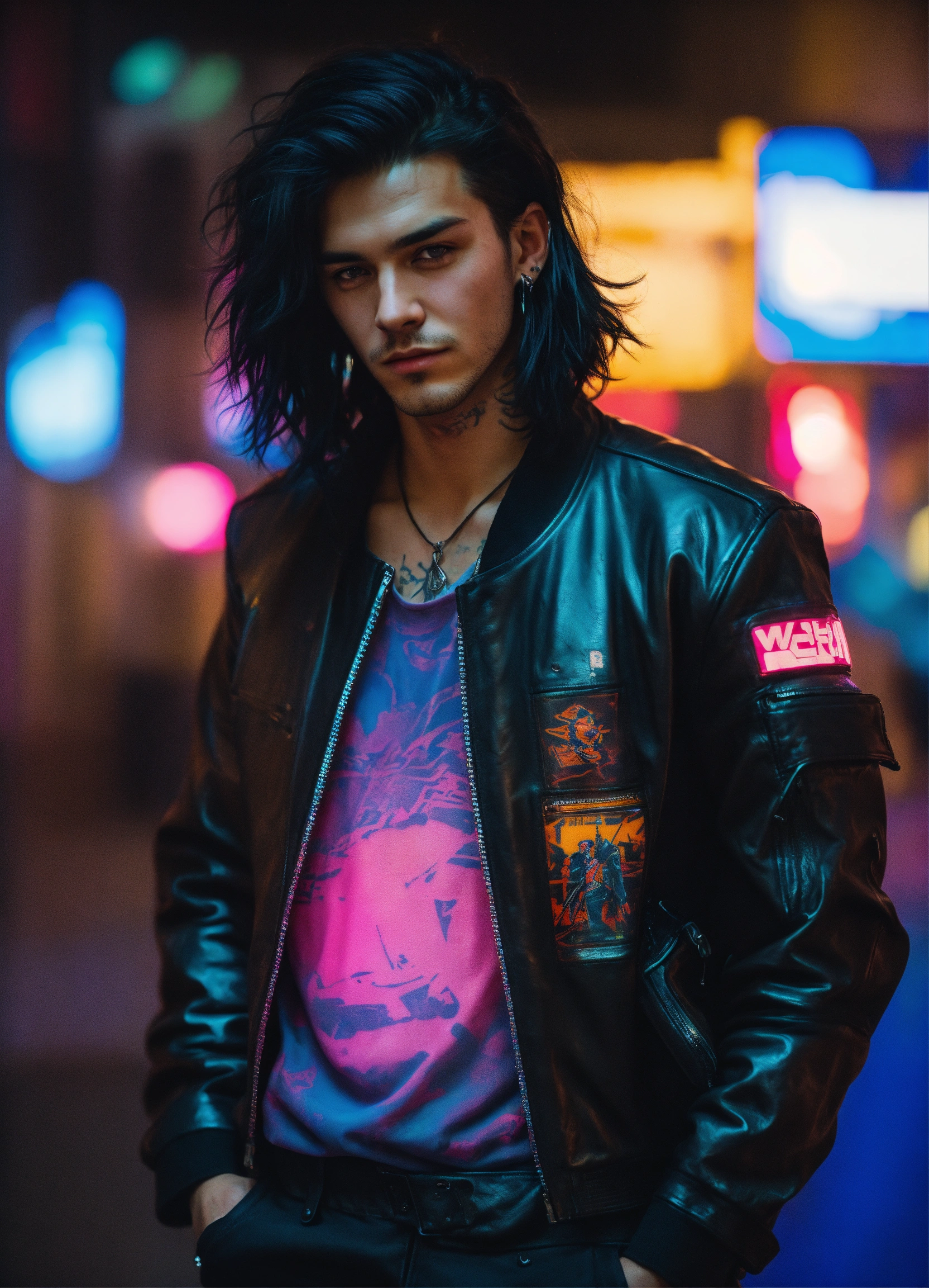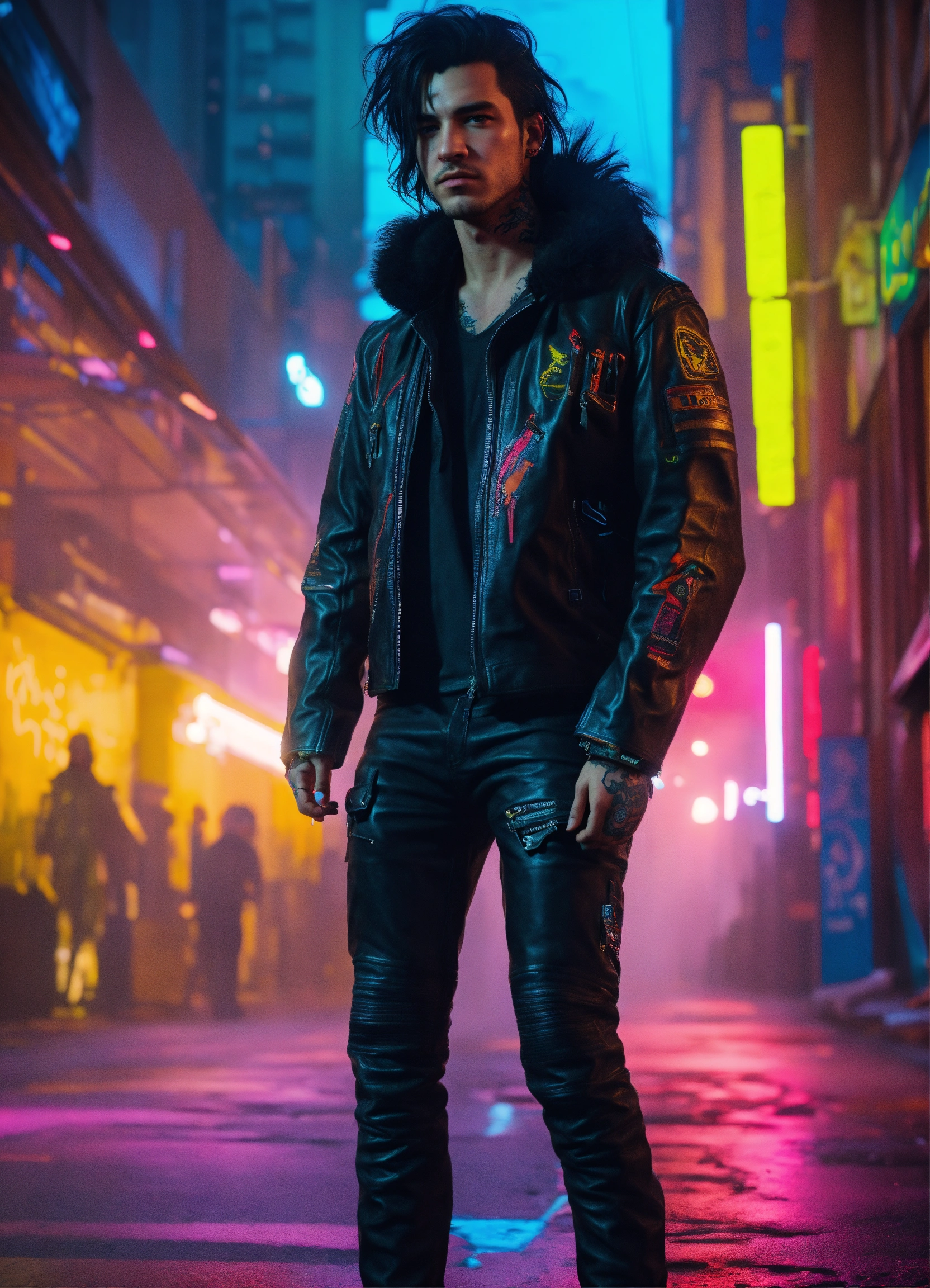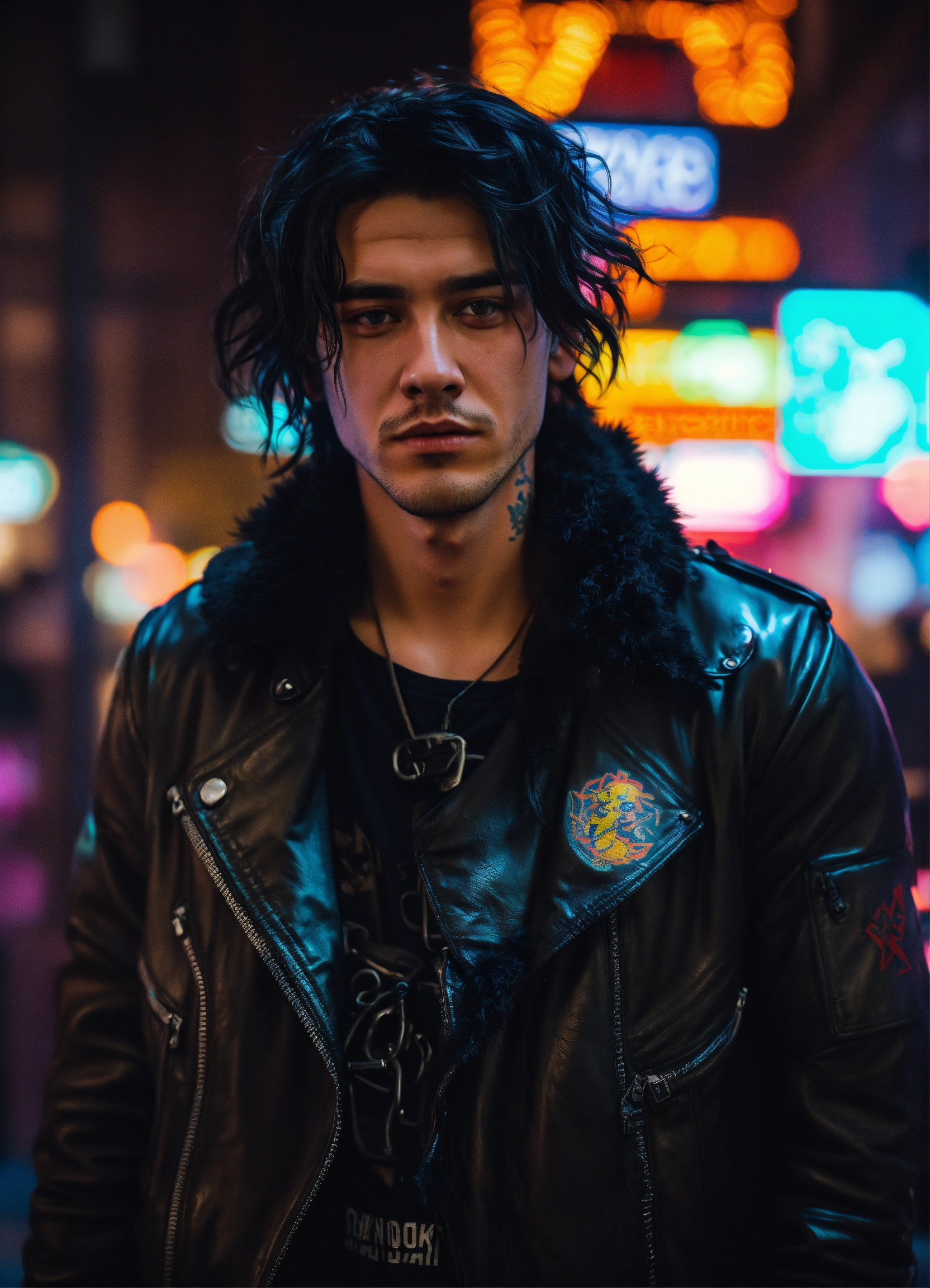 25 year old man, black fluffy hair, fair skin, russian, brown eyes, calm, cyberpunk, neon, street kid, cyberpunk 2077, tech, black leather jacket, handsome, grunge, tattoos, noah sebastian