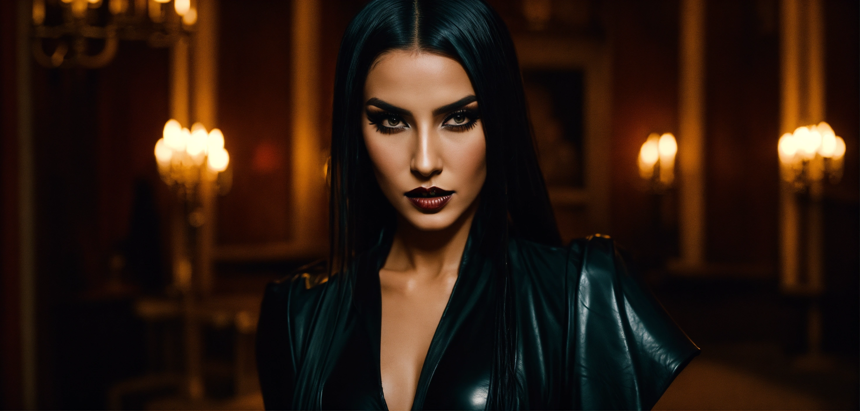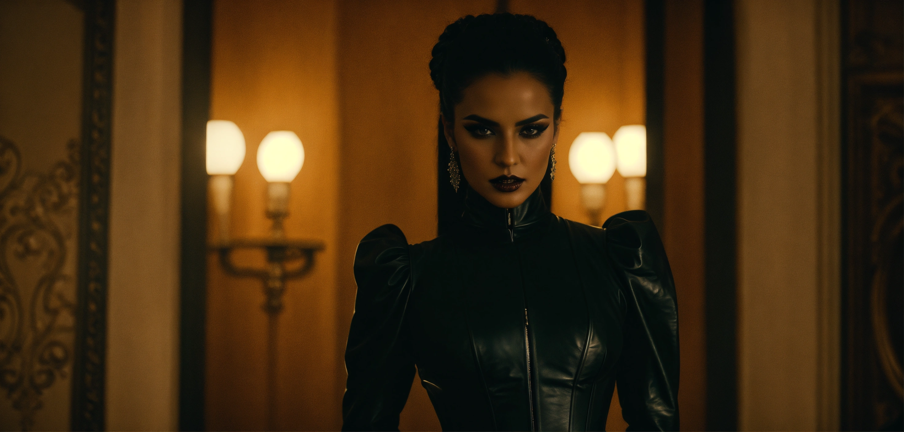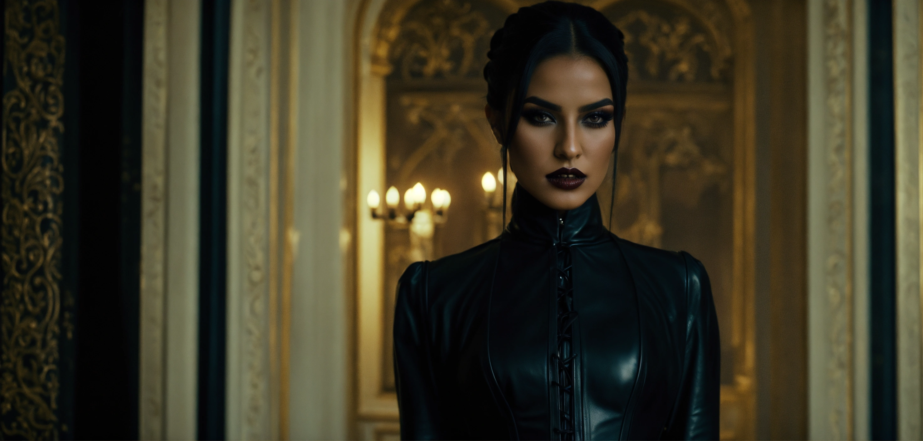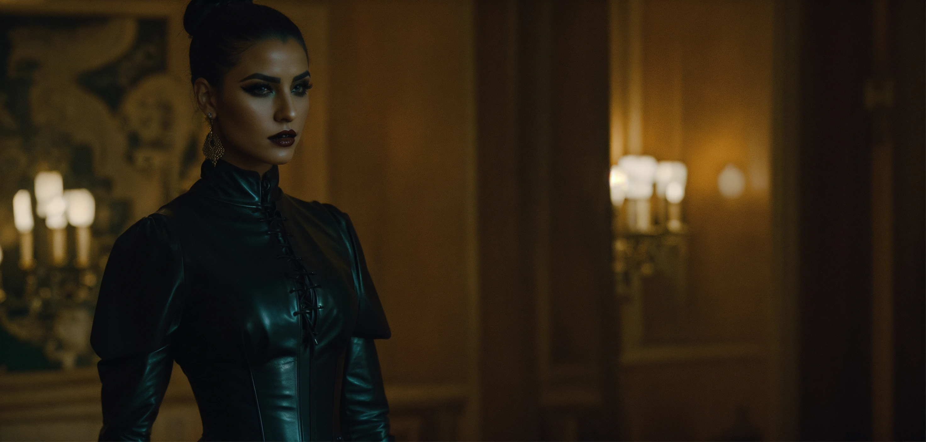 Lighting from the front, cinematic vampire underworld movie look, stunning dominant arab woman fashion model, head slightly tilted, looking arrogant, straight black high ponytail hair, eyeliner makeup, strict black leather dress with big long puff sleeves, black leather waist corset, french mansion room by night, haze