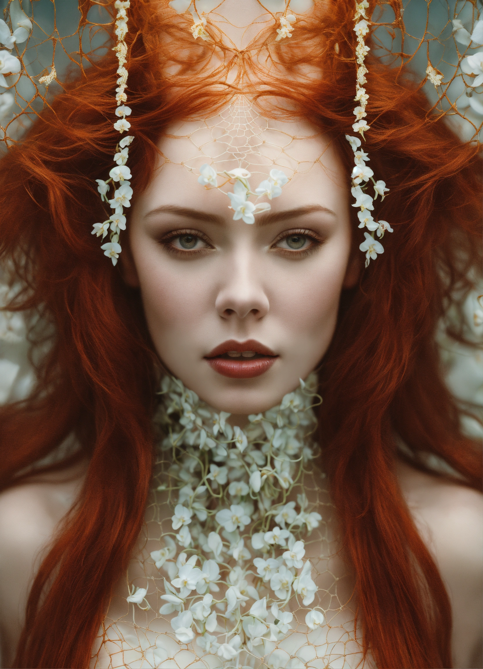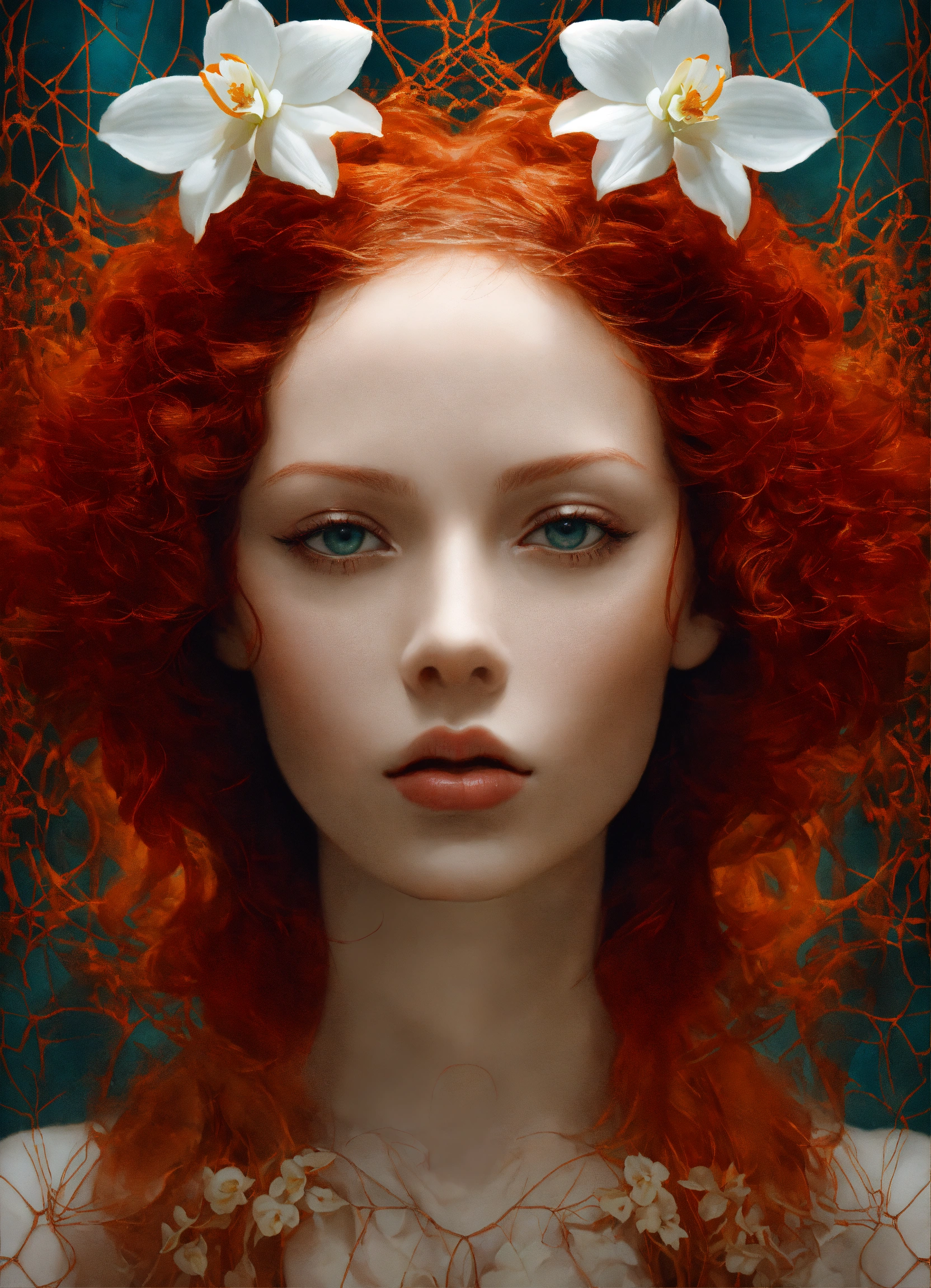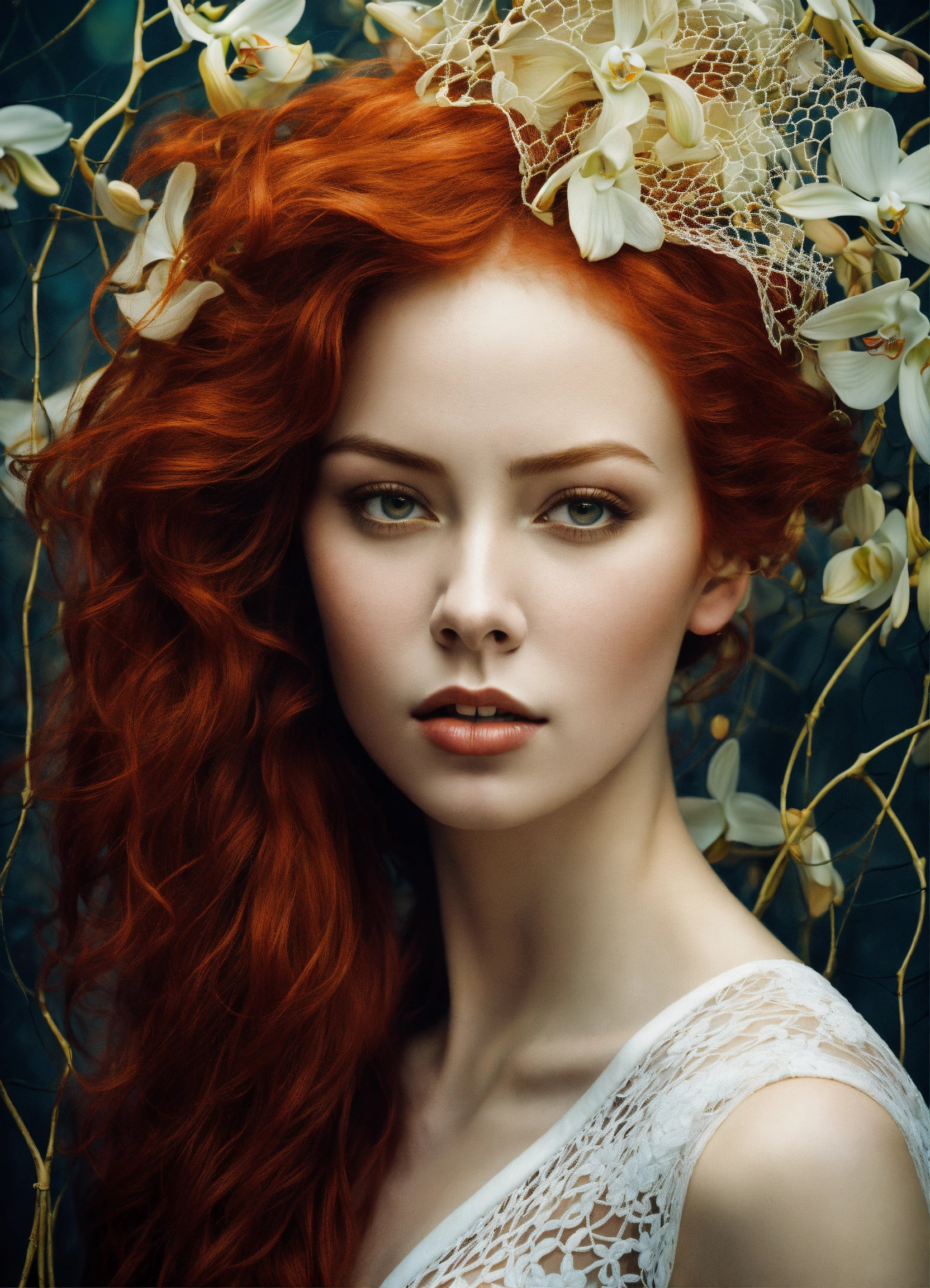 Joy, on a woman’s facebiomechanical beautiful, intricate, chiaroscuro, surrealism, net art, contradiction with red hair the emotions of her reality", in perfect symmetry, contrast, net art, layered impasto, and photography by alex lavrov, karol bak, white, white orchids backdrops perfectly paired a cinematic photograph"