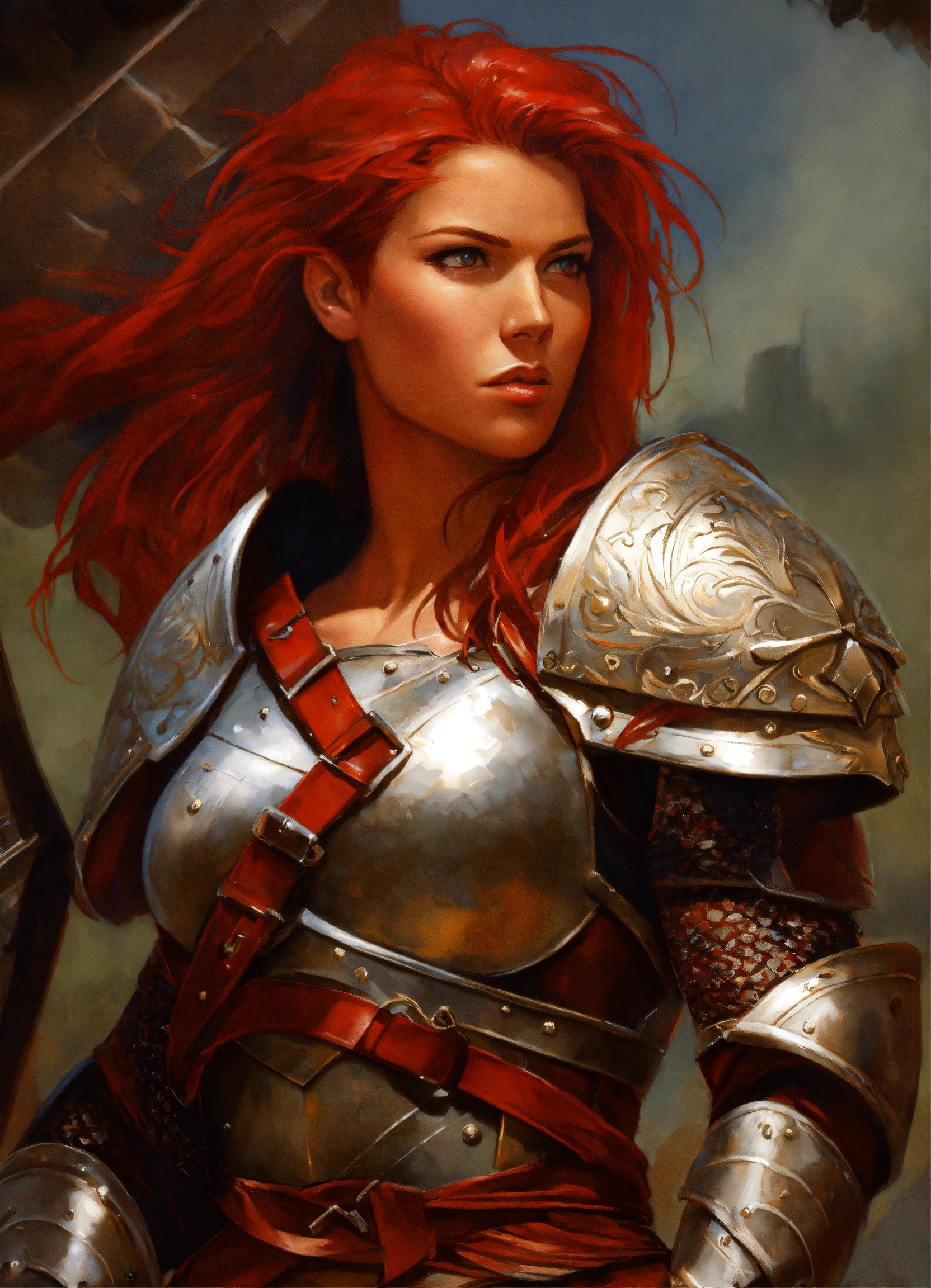 Fantasy art, keith parkinson, female, red hair, shaved on one side of head, armor, fighter, gladiator, metal armor, bulky, viking, strong arms, big shoulders