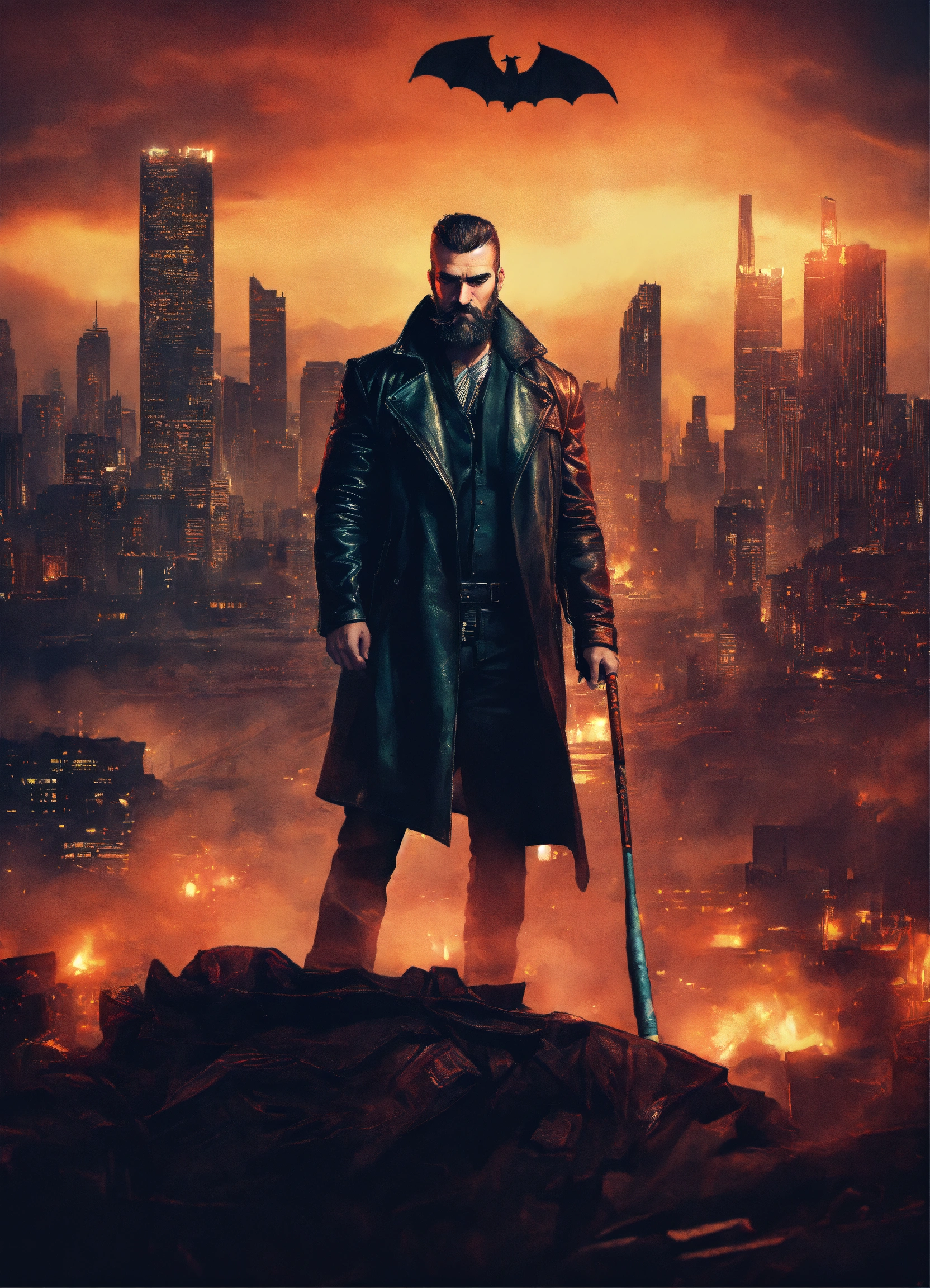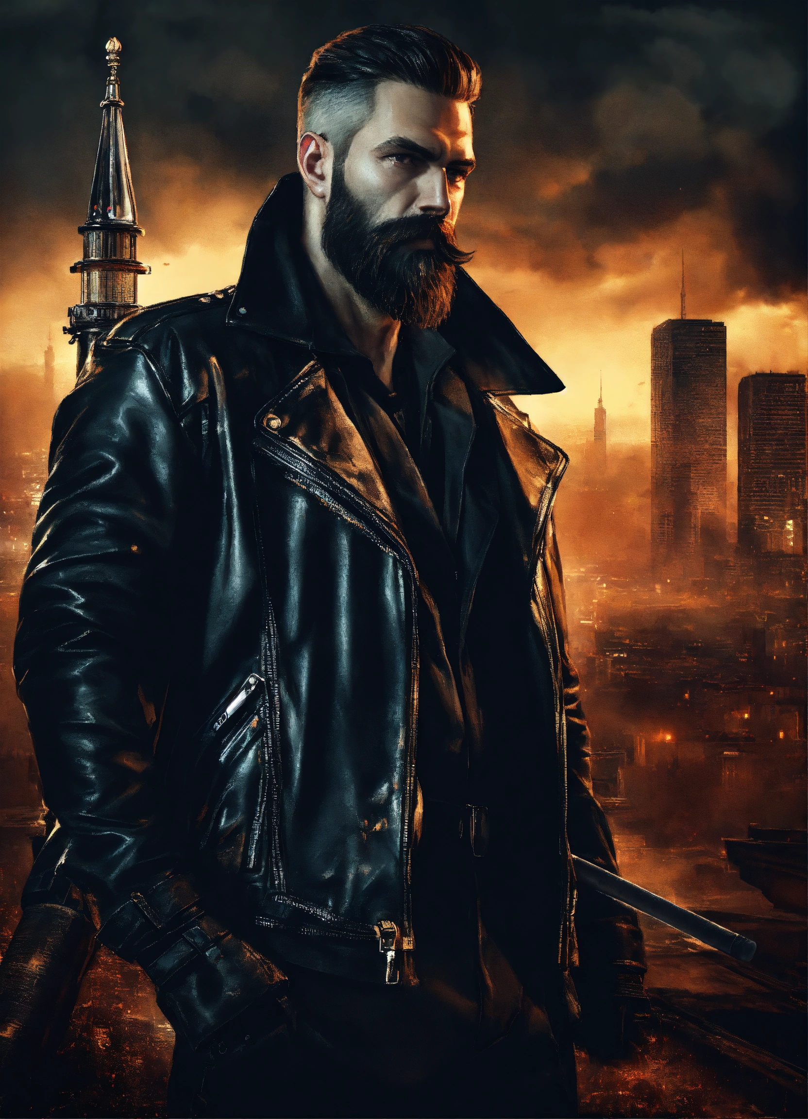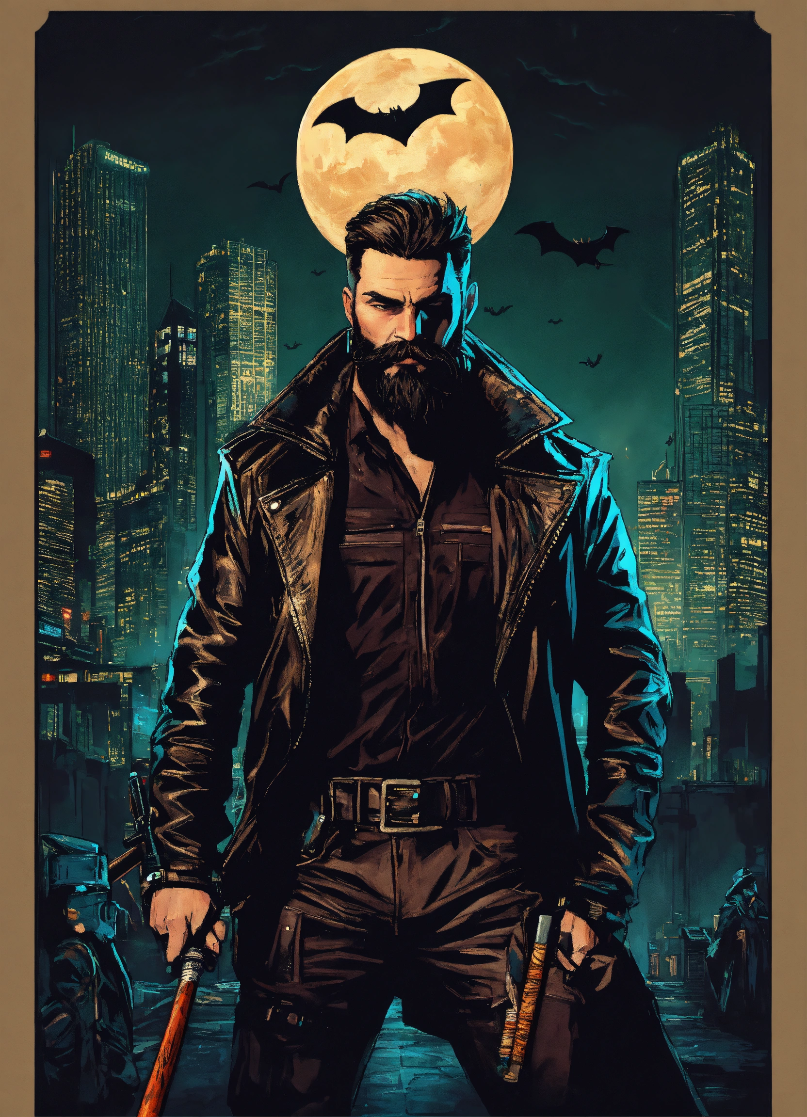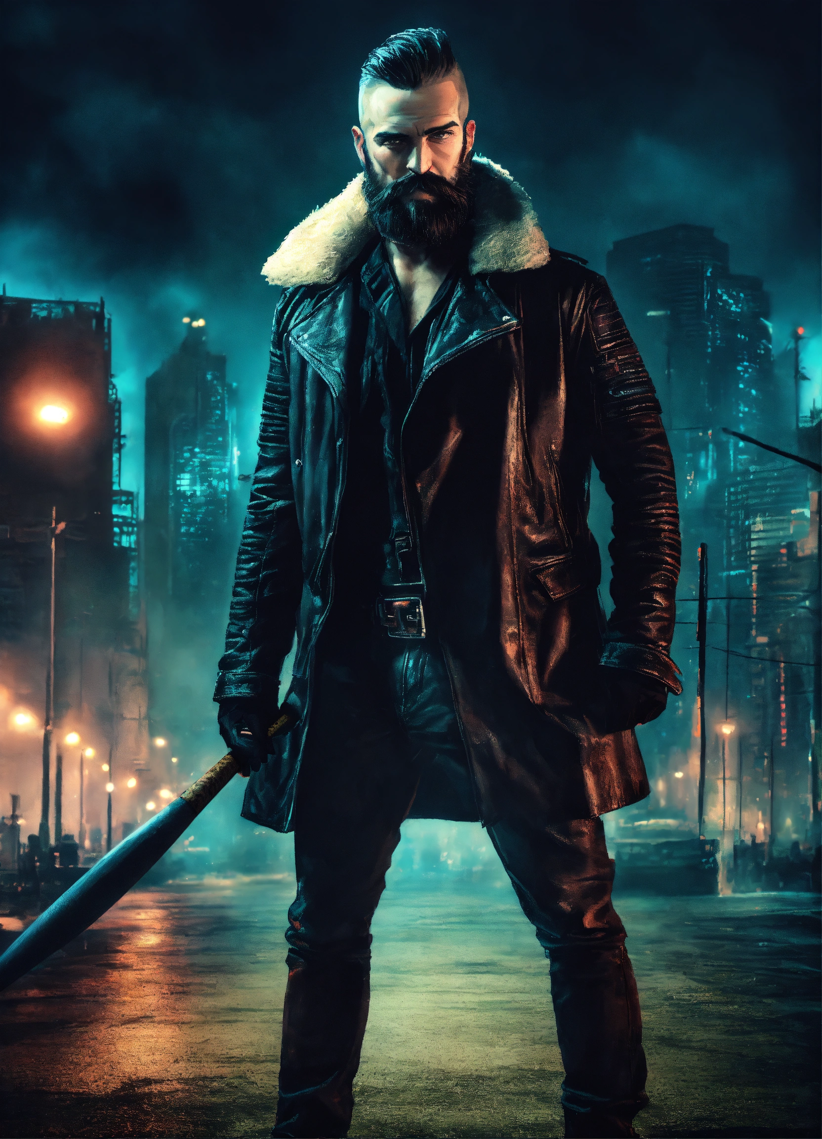 Brutal man in the leather jacket beard mustache with cigarette holding a bat dark city on the background cover style fantasy