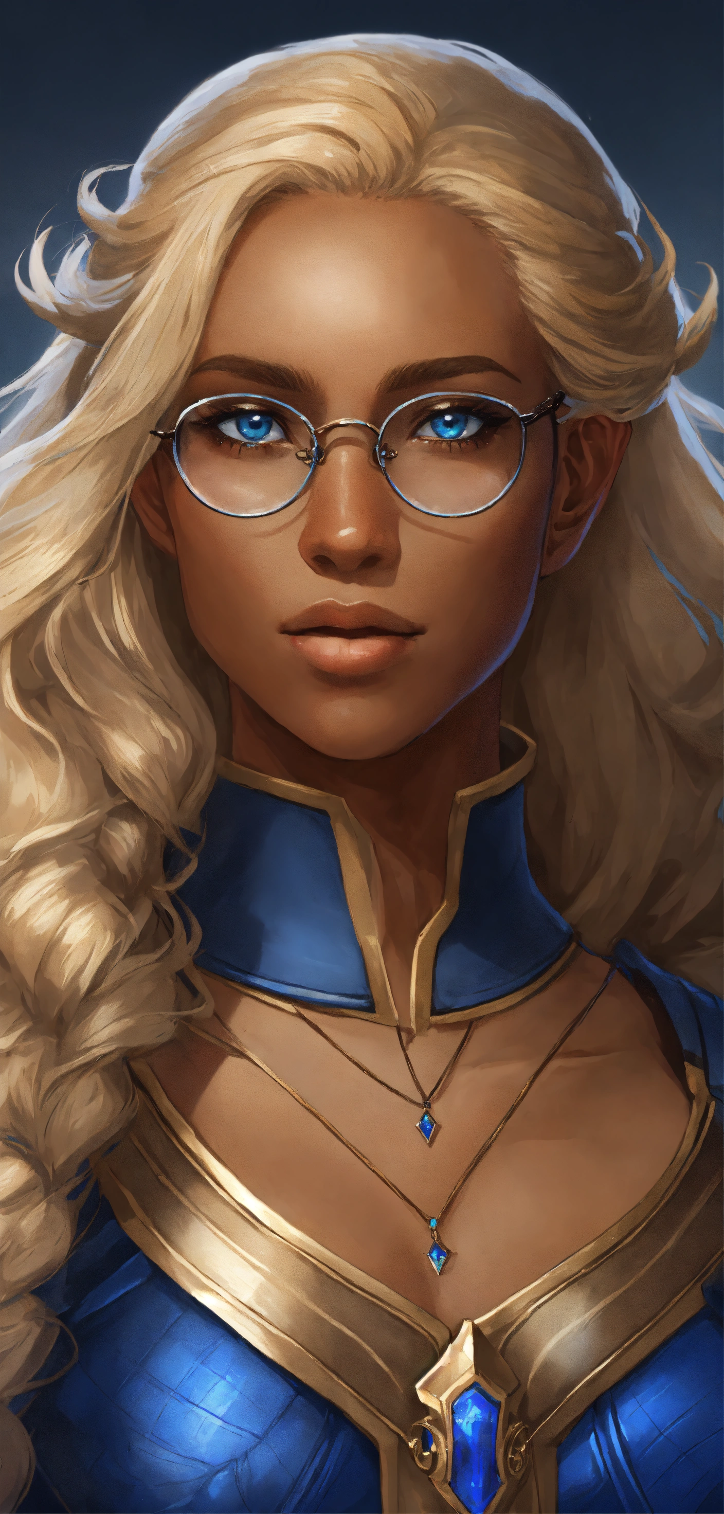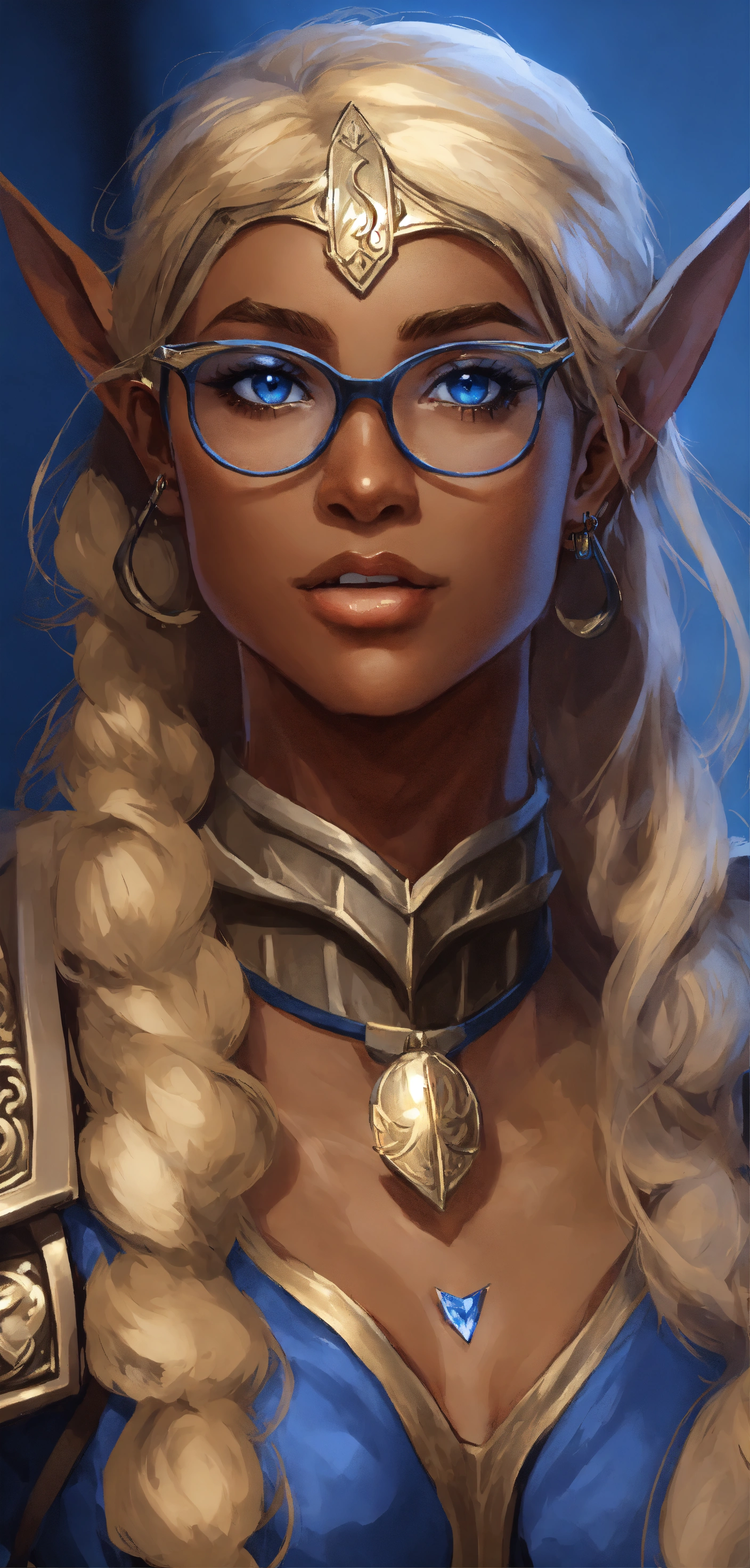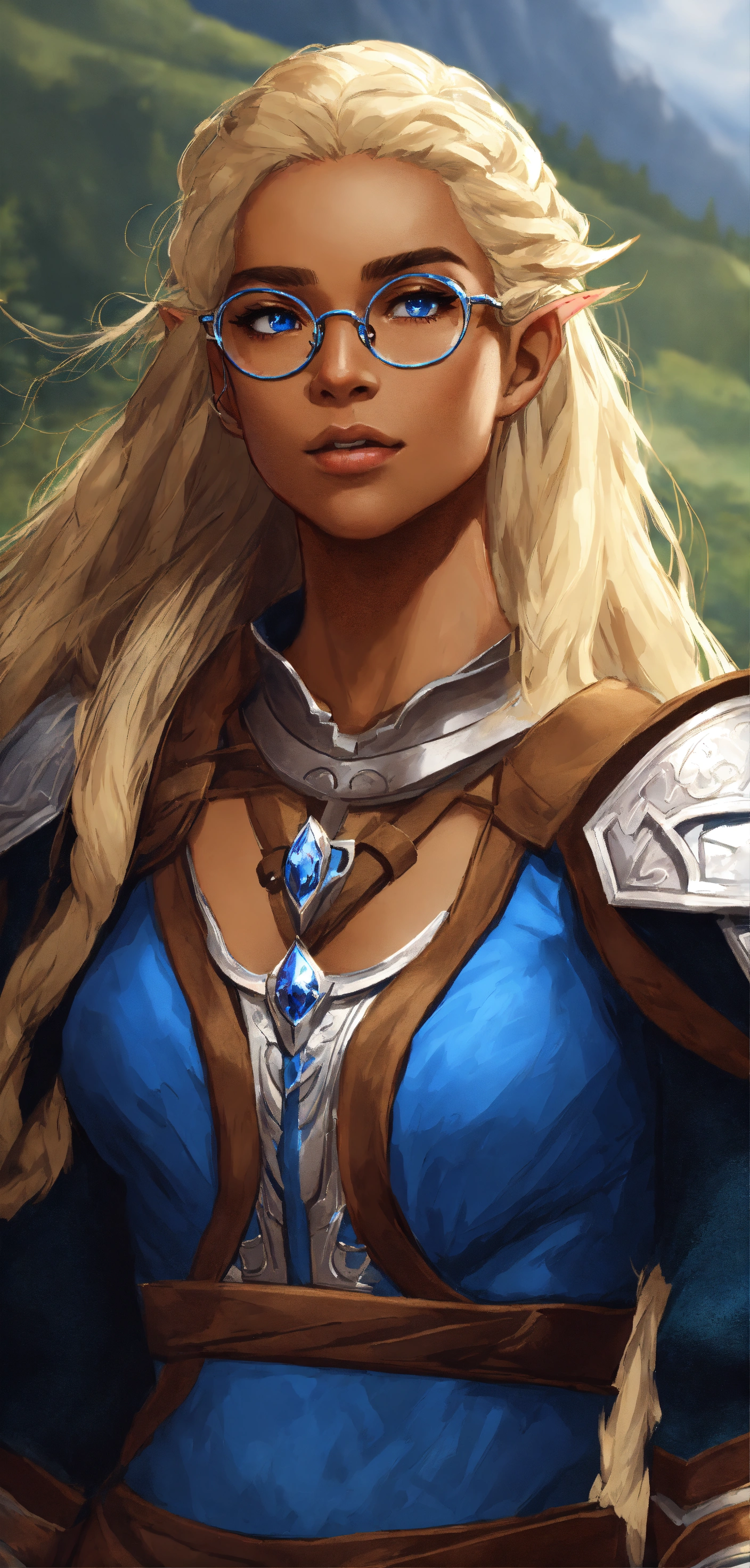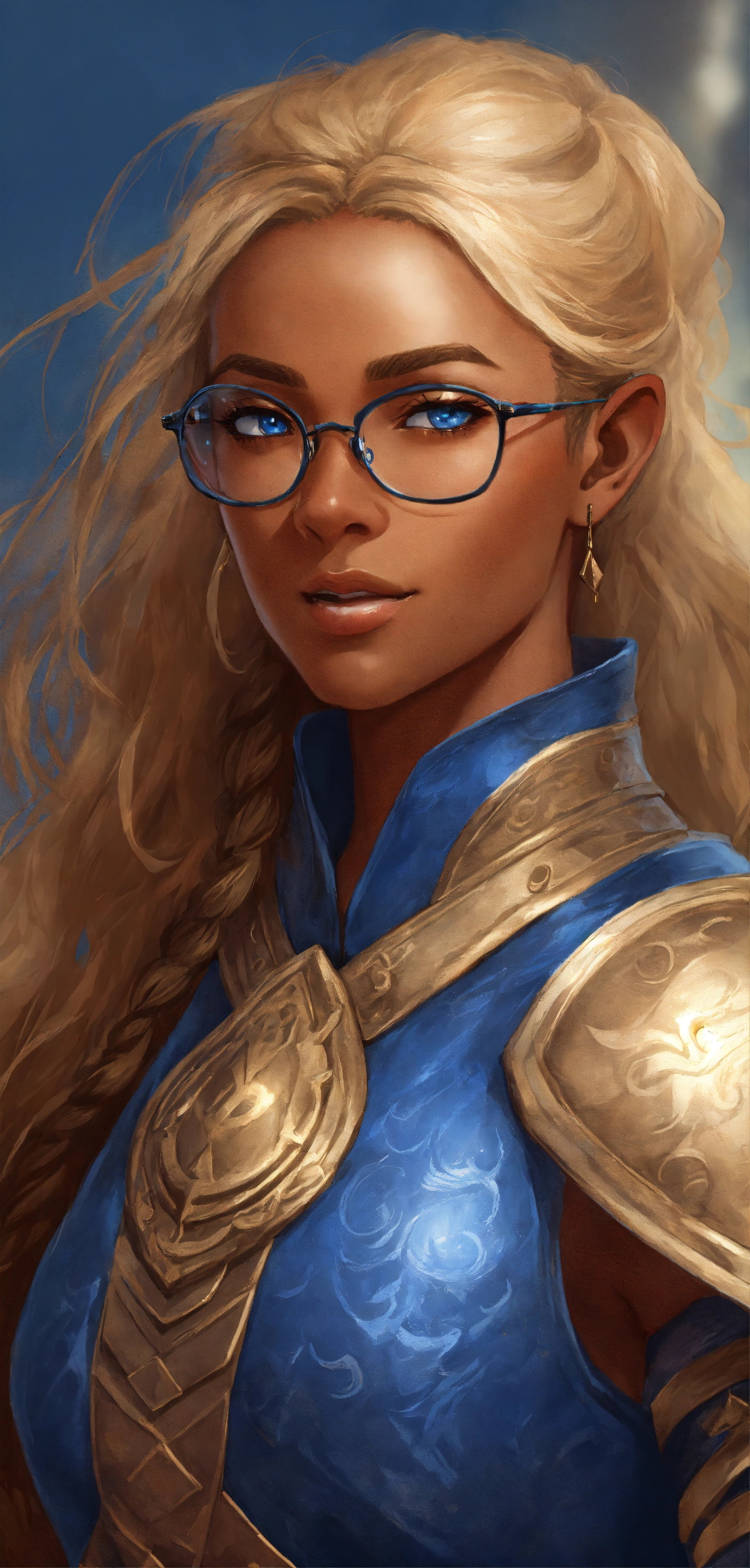 A very brown skinned half elf woman, wearing glasses with deep azure blue eyes, long wavy blonde hair in a ponytail, wearing mail armor