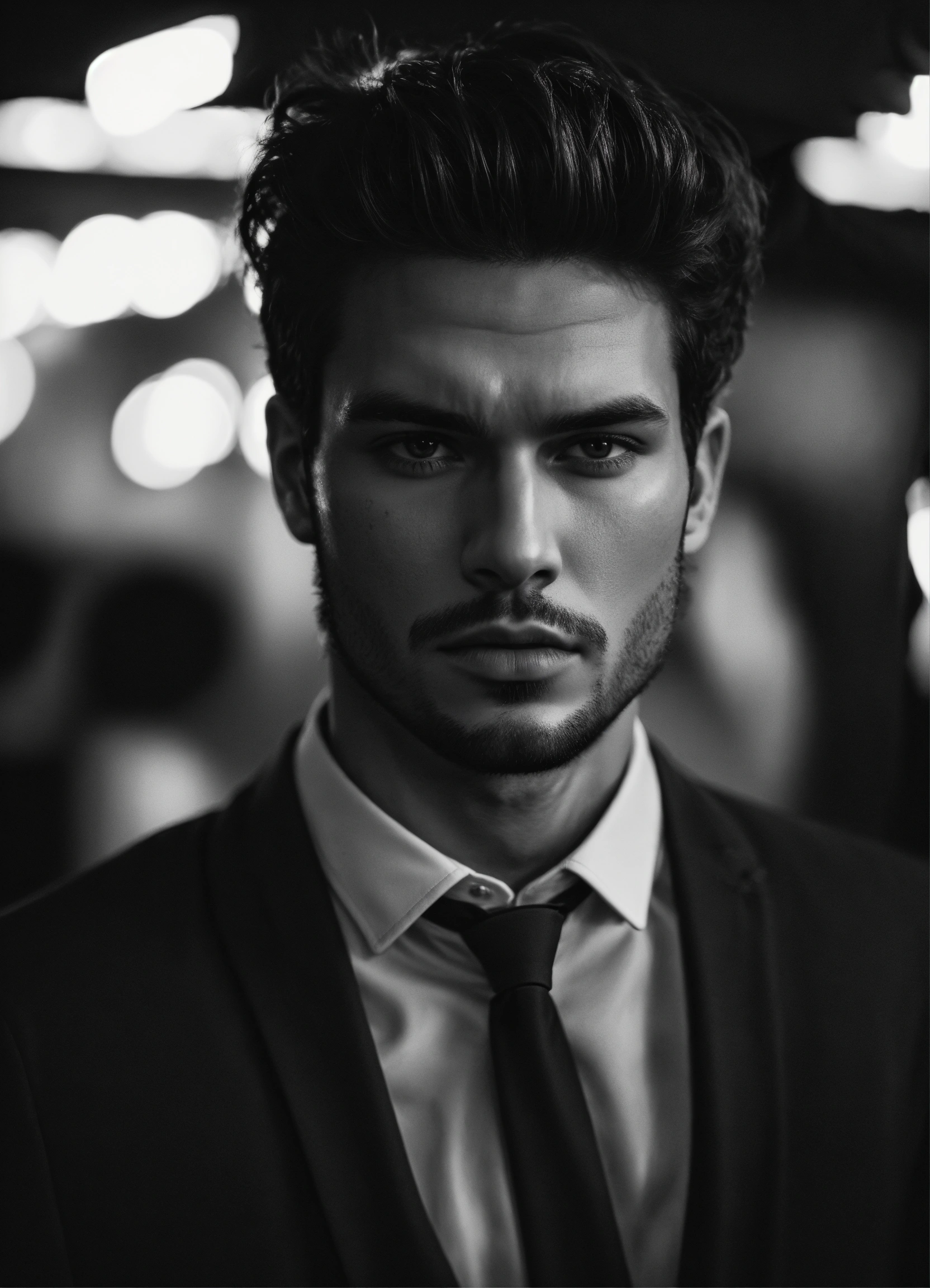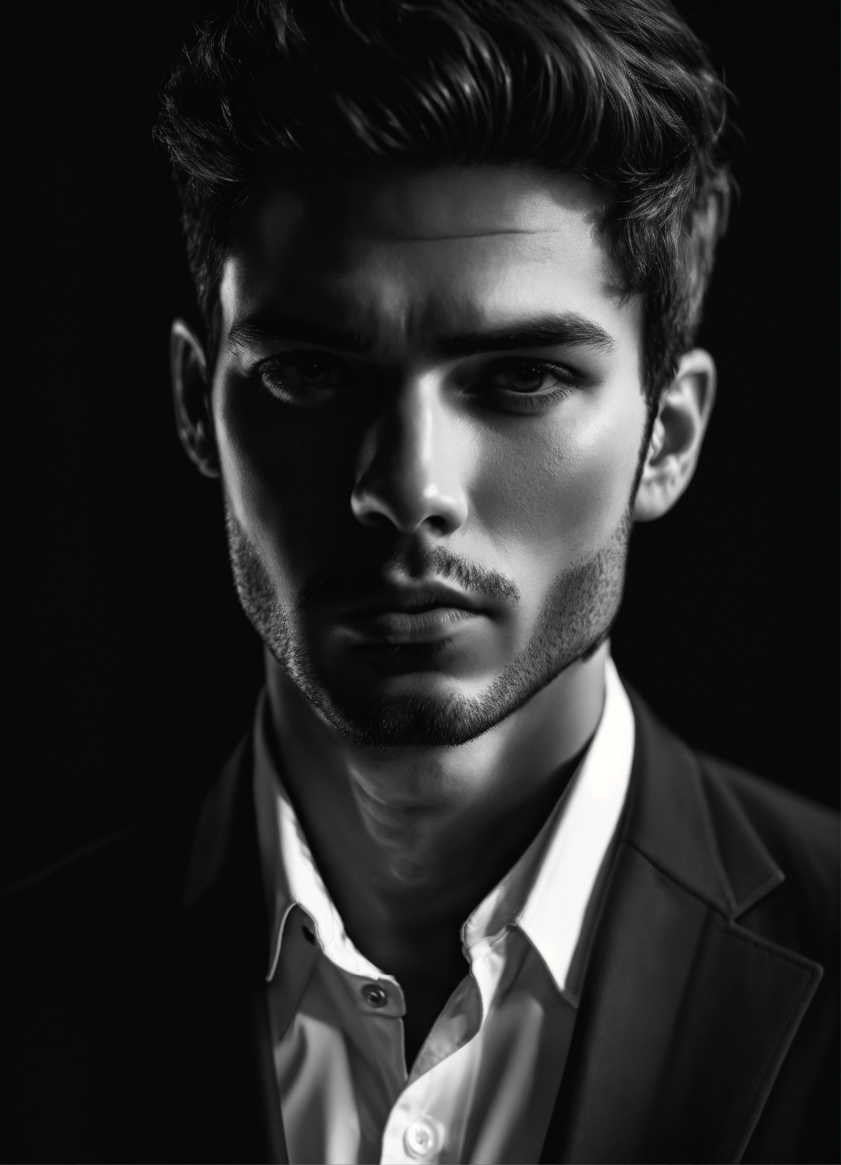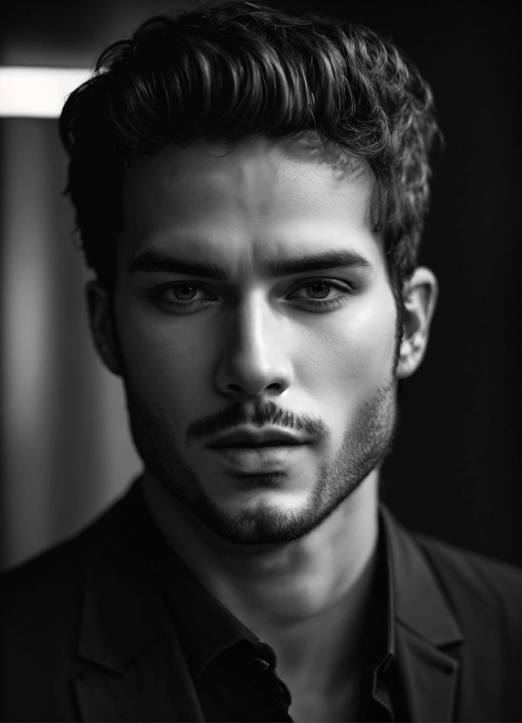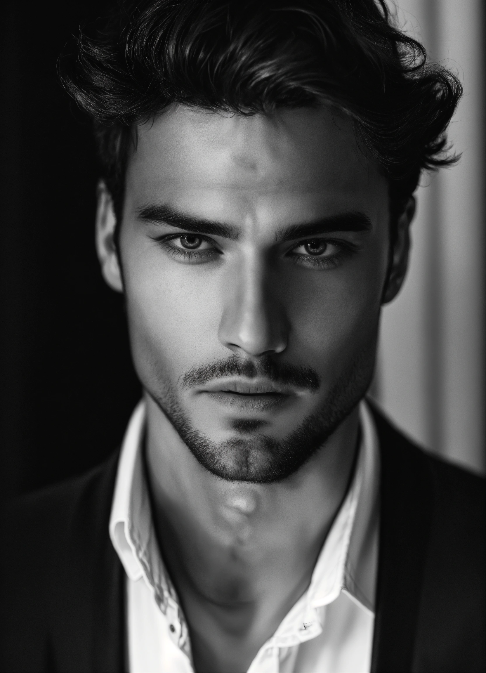Photo of male model gonçalo teixeira, black and white, realistic, poster, not painted, very detailed faces, skin with pores, 4 k, dark suit, black plain background, skin not smoothed, face from left to right, desire in the eyes, half profile, glowering, looking into the camera, dark shirt