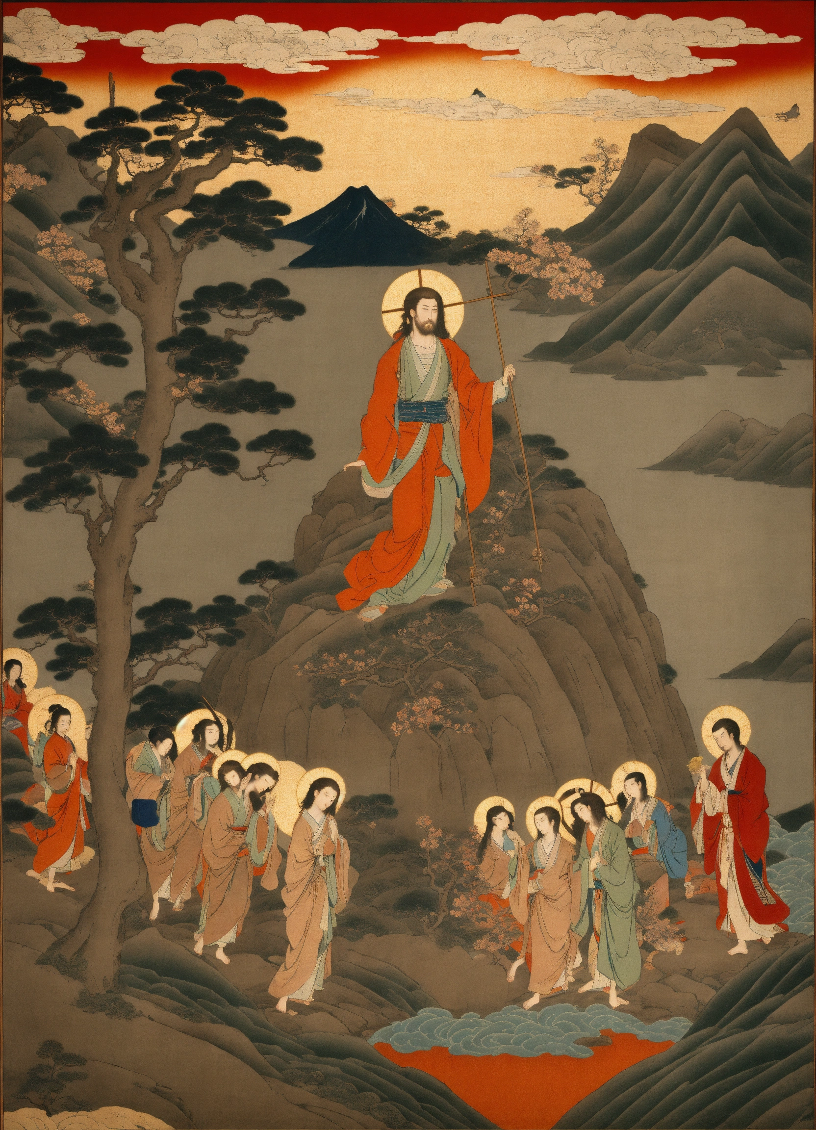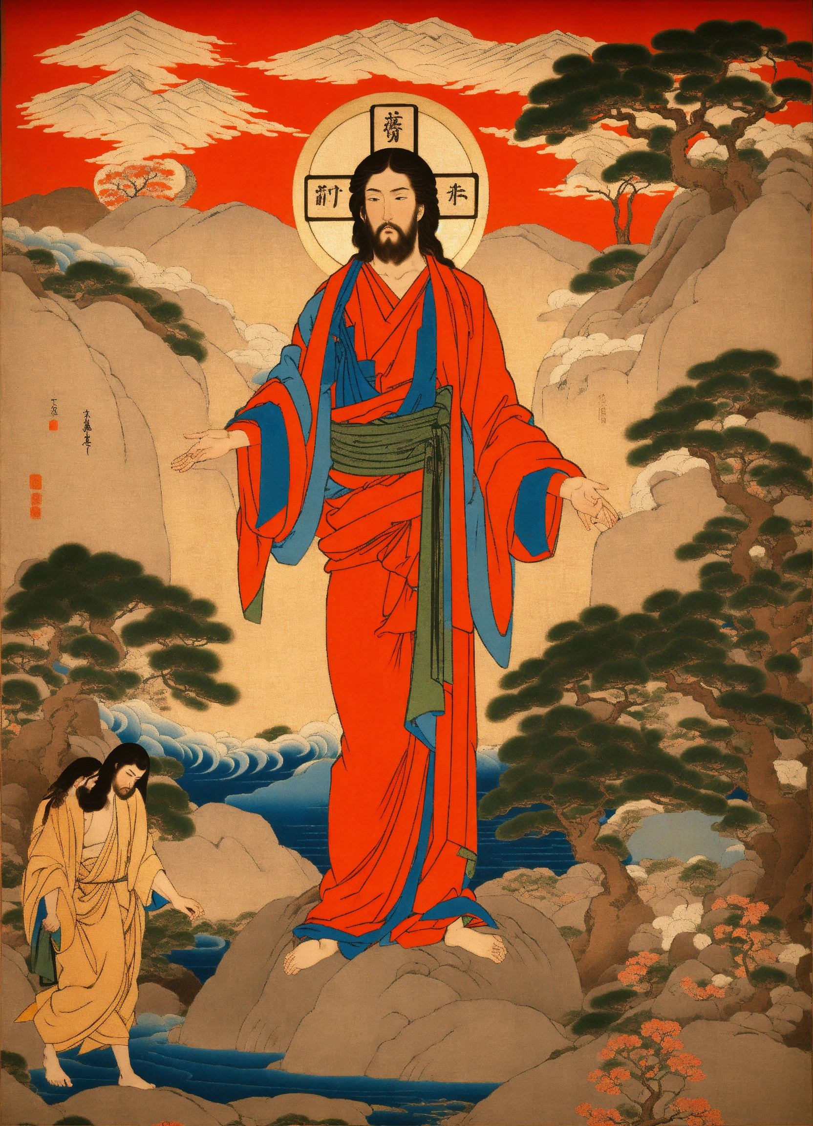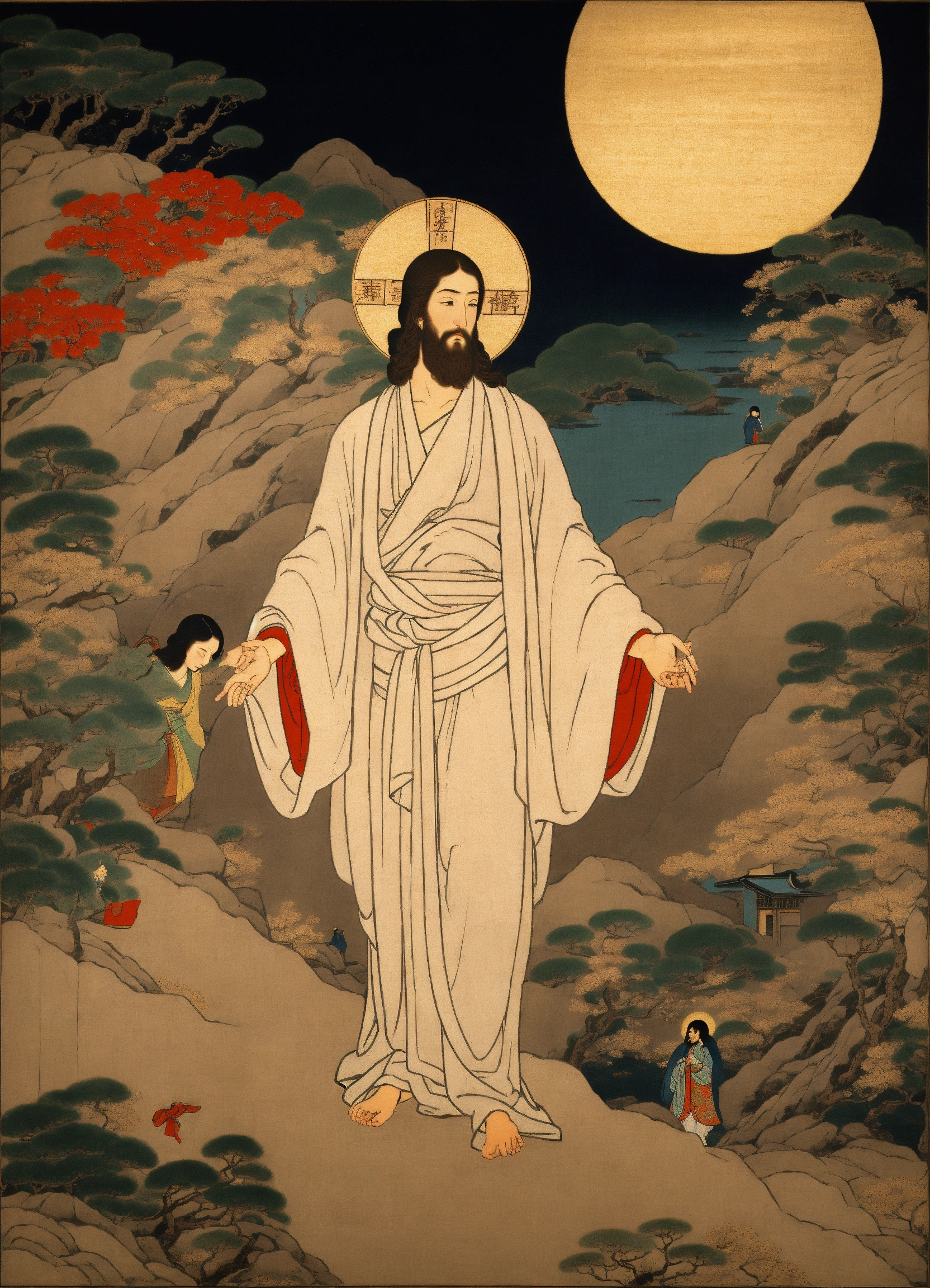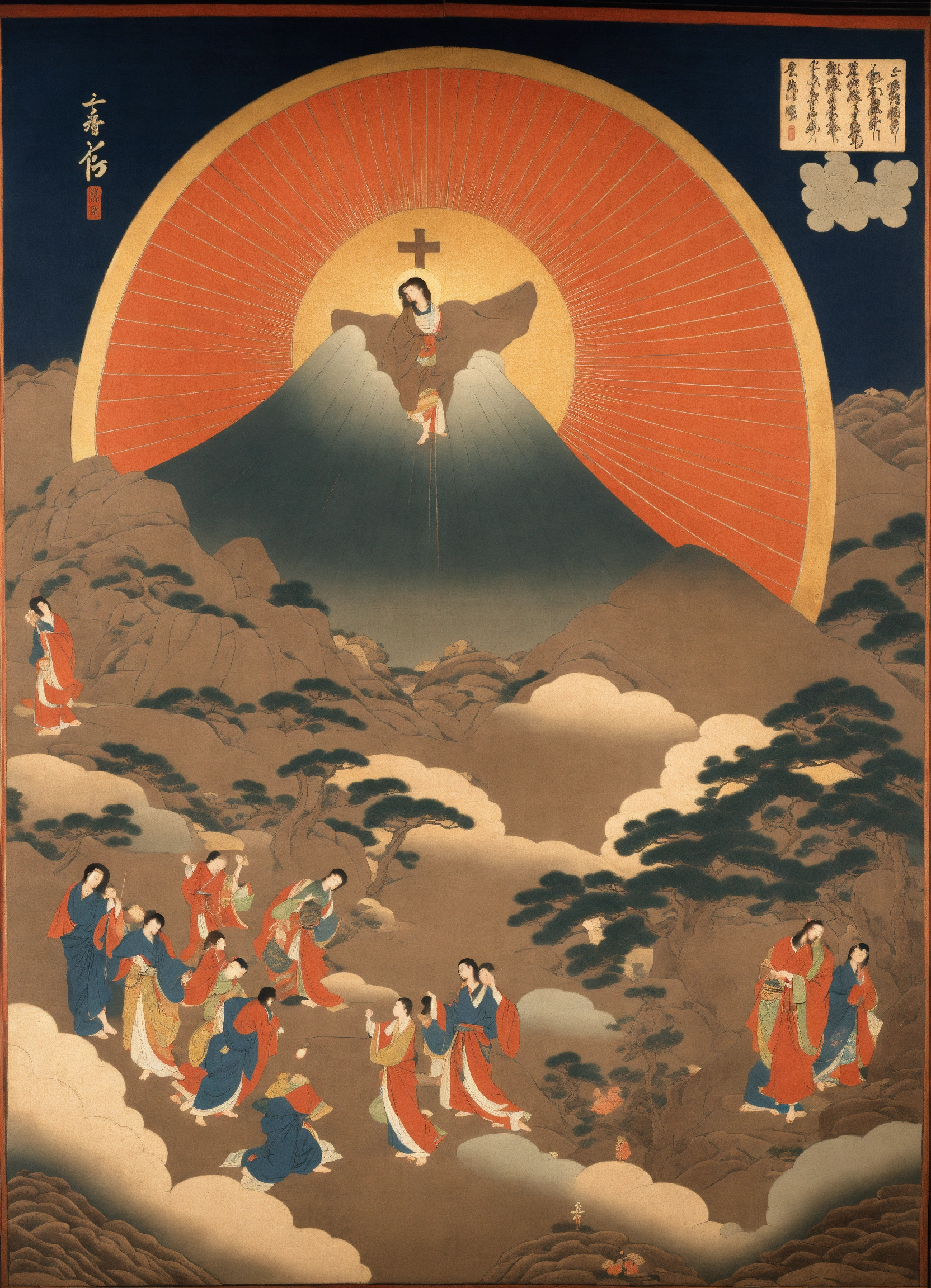 Jesus christ rising from the dead in glory, empty tomb, edo period art, adam and eve, japanese art, beautiful, detailed scenery, icon of the resurrection, ukiyoe, masterpiece