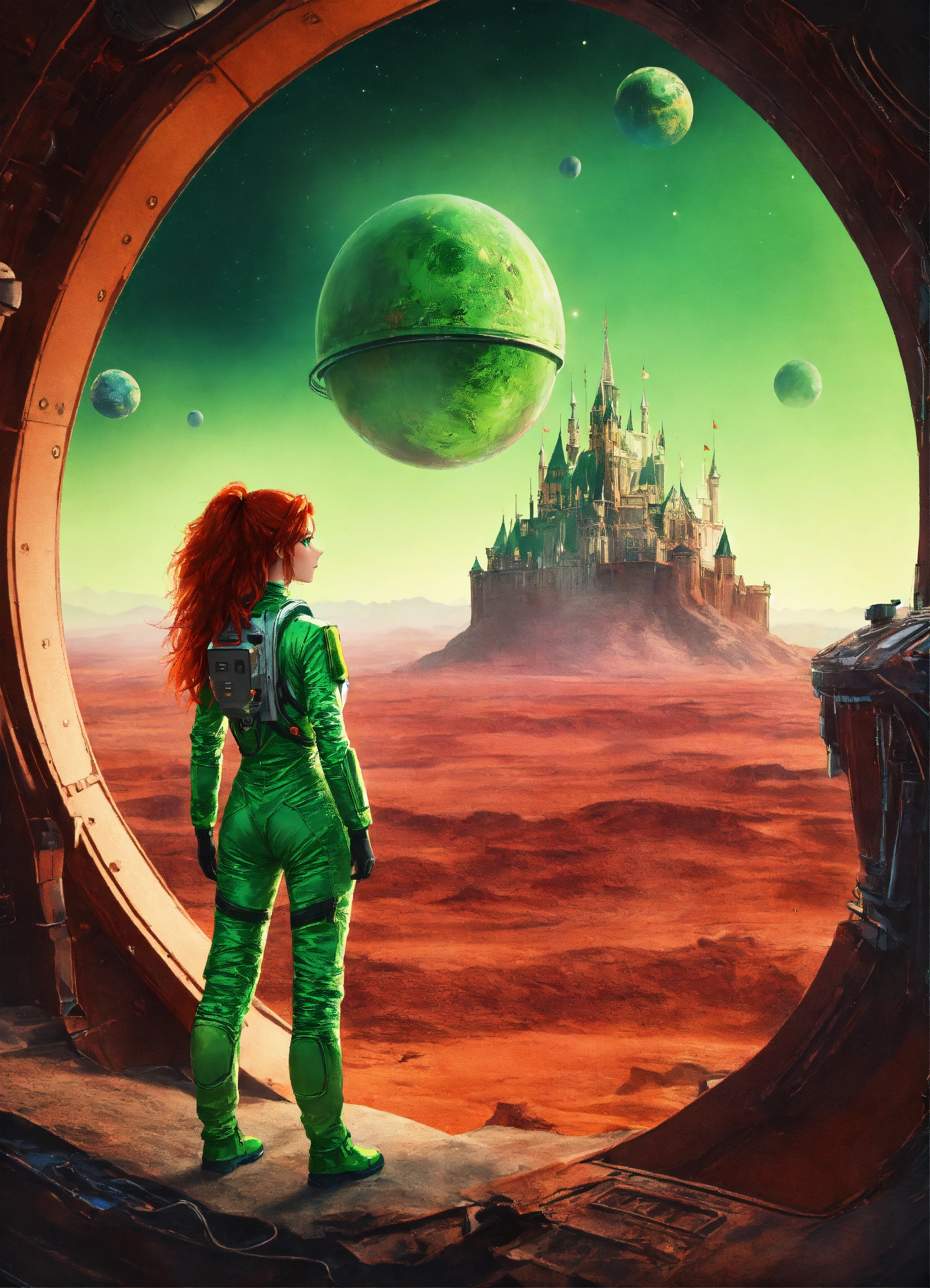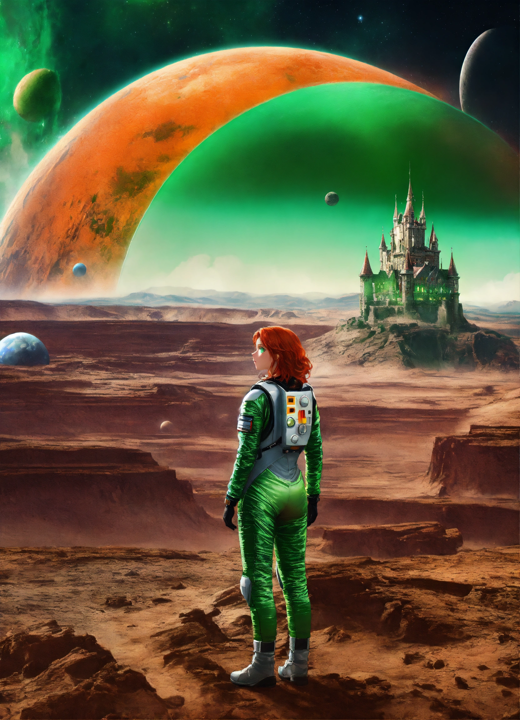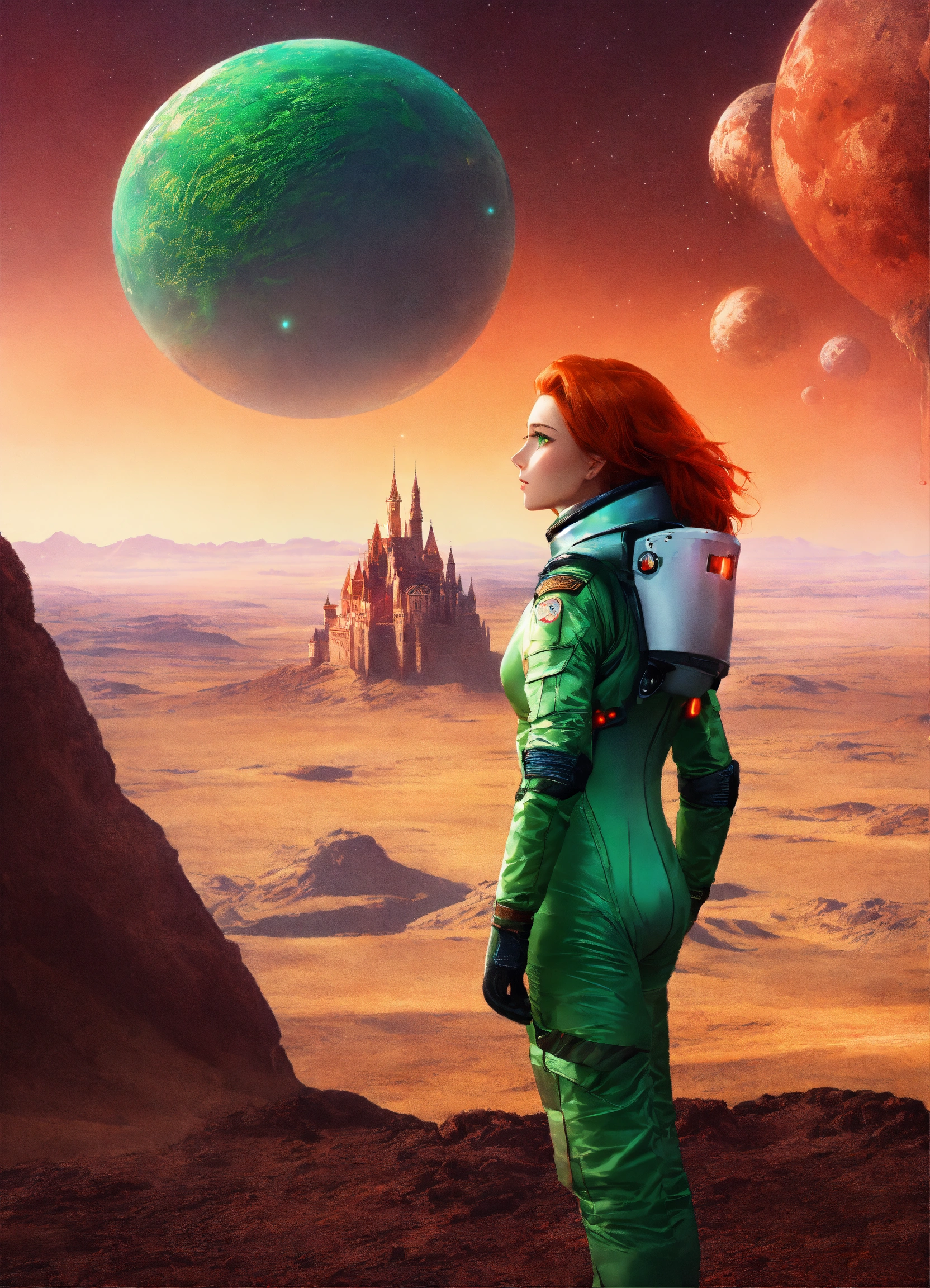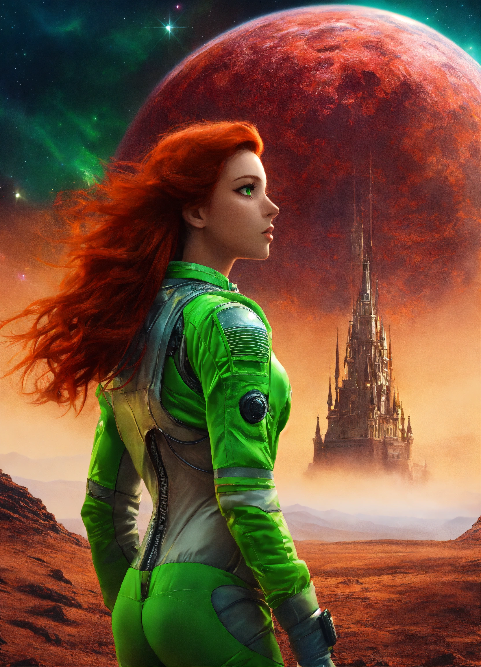 Red haired green eyes woman in a space suit looking over a alien landscape towards a castle