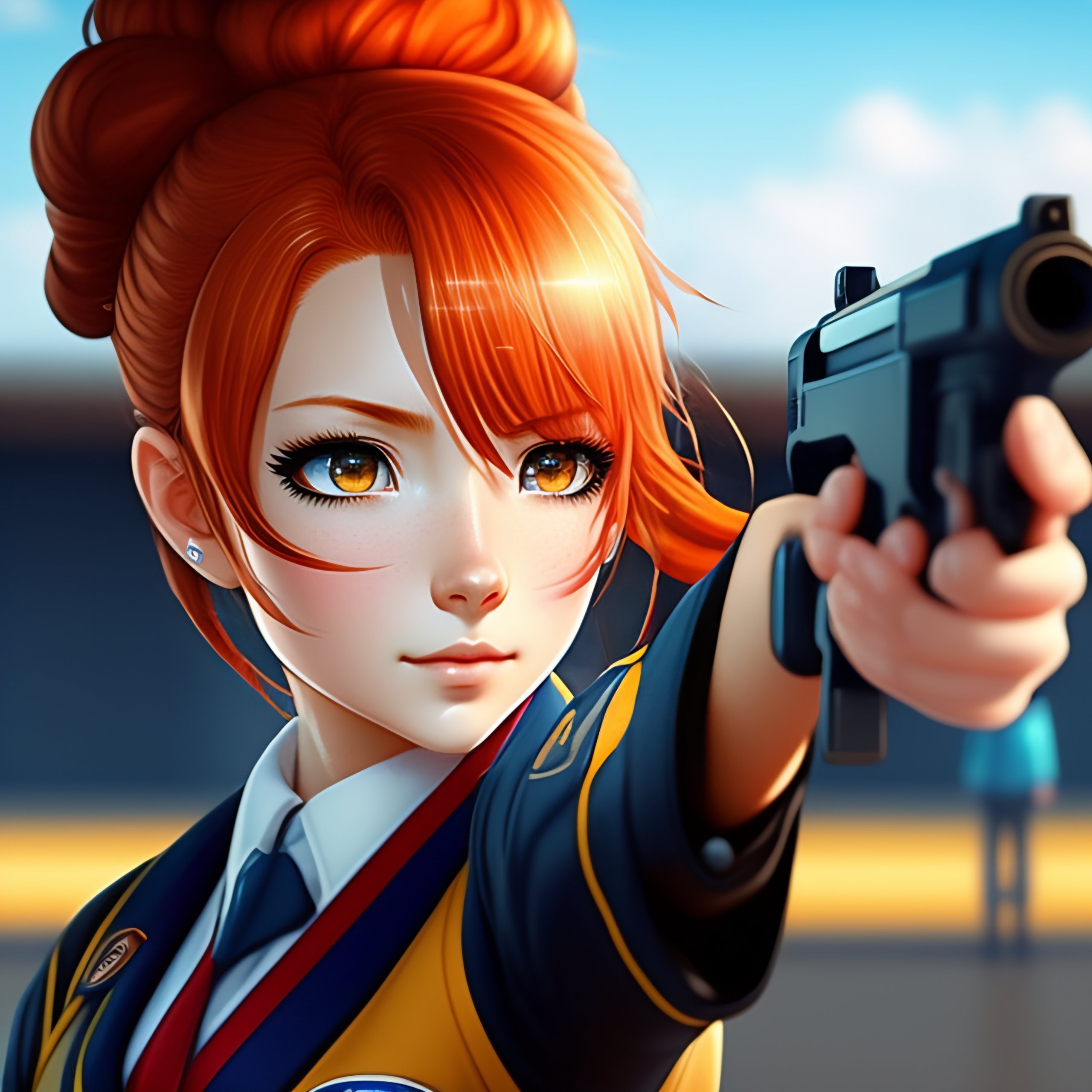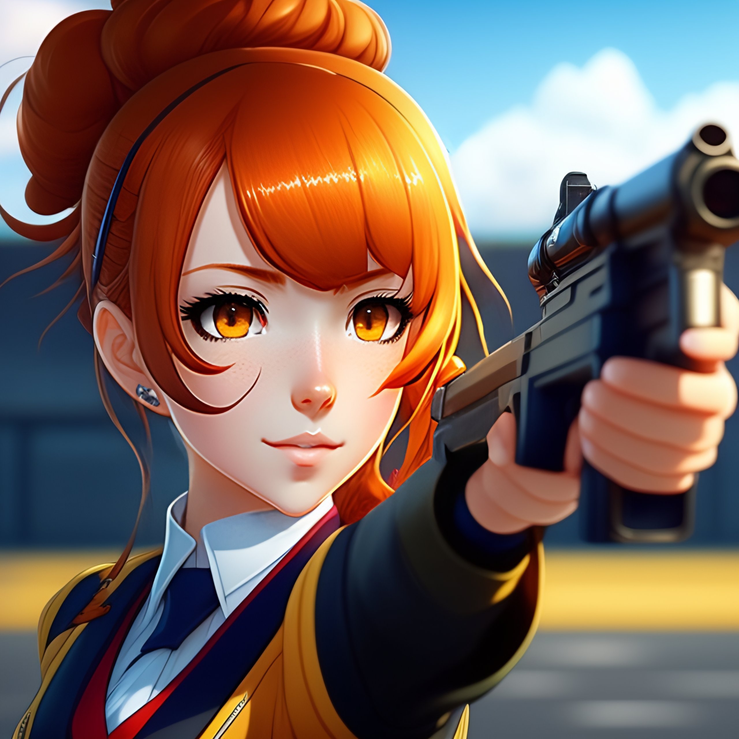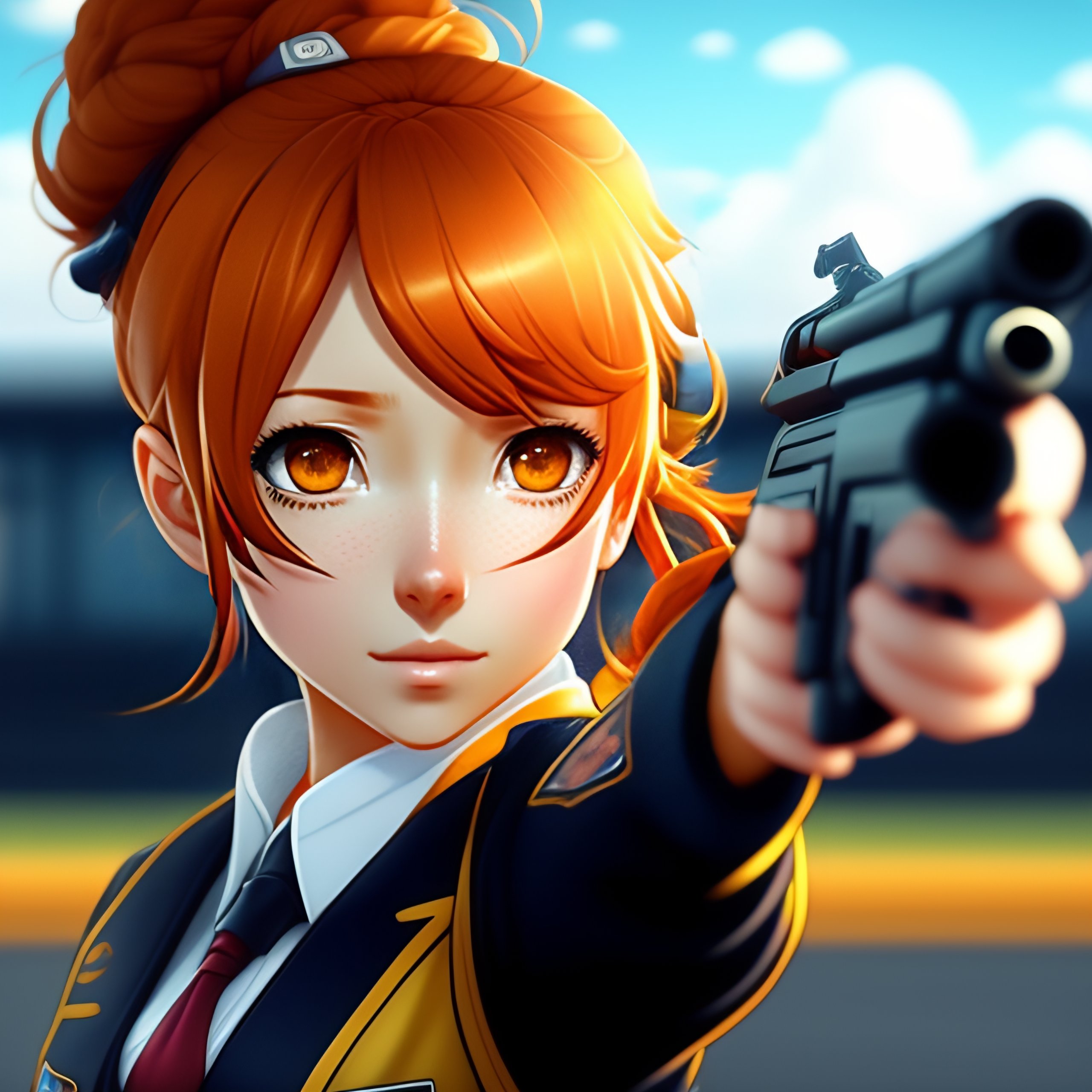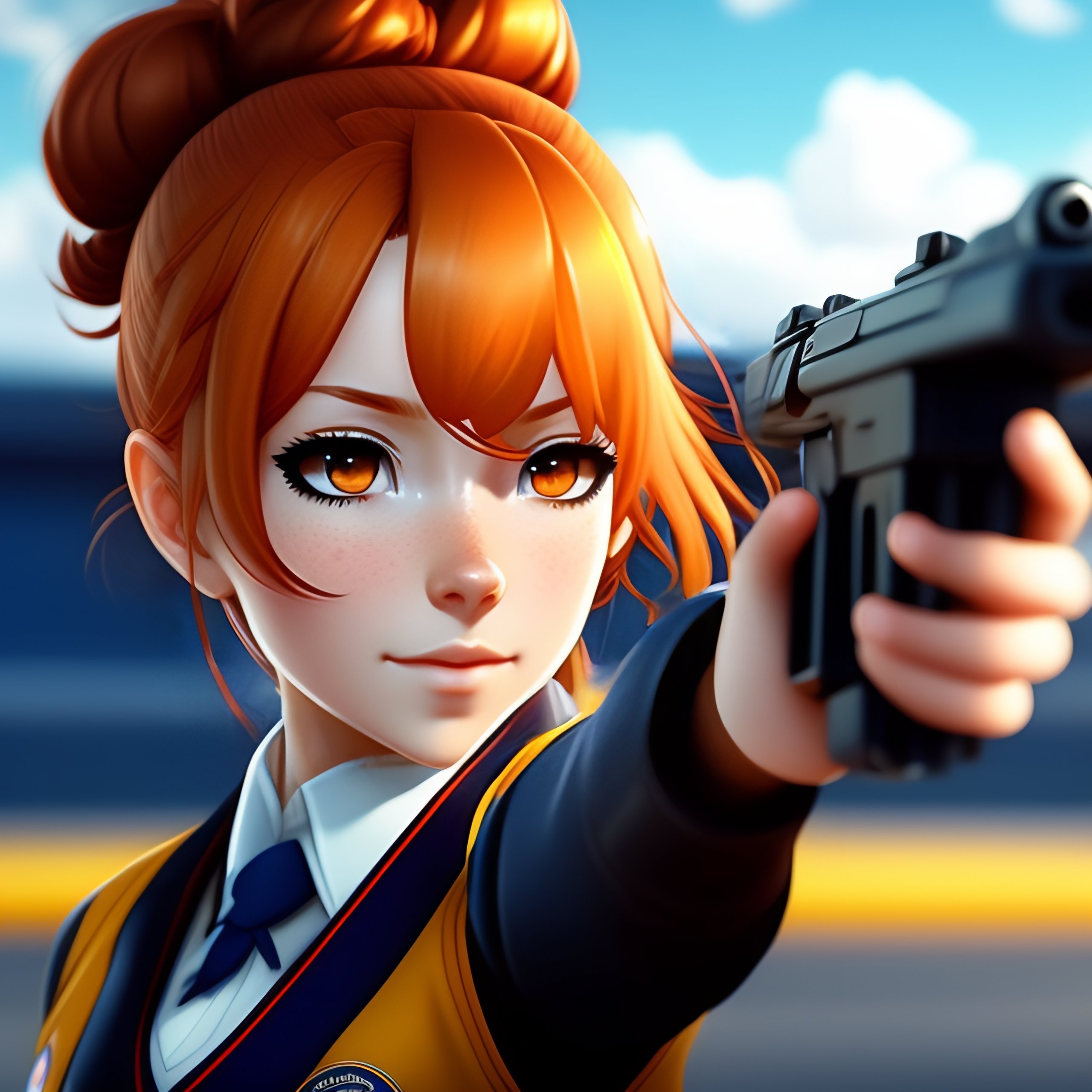 Anime style girl with ginger hair - in a ponytail and in a blue school uniform is pointing a gun at you