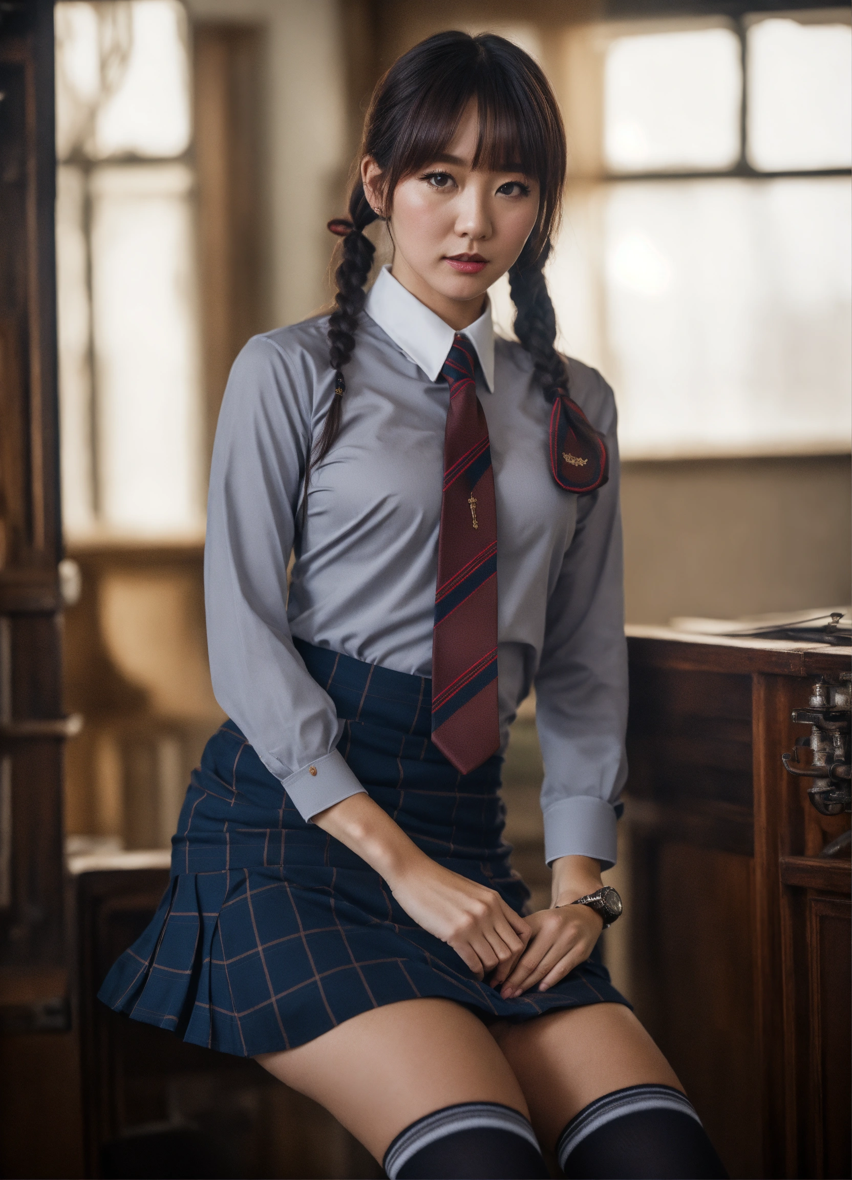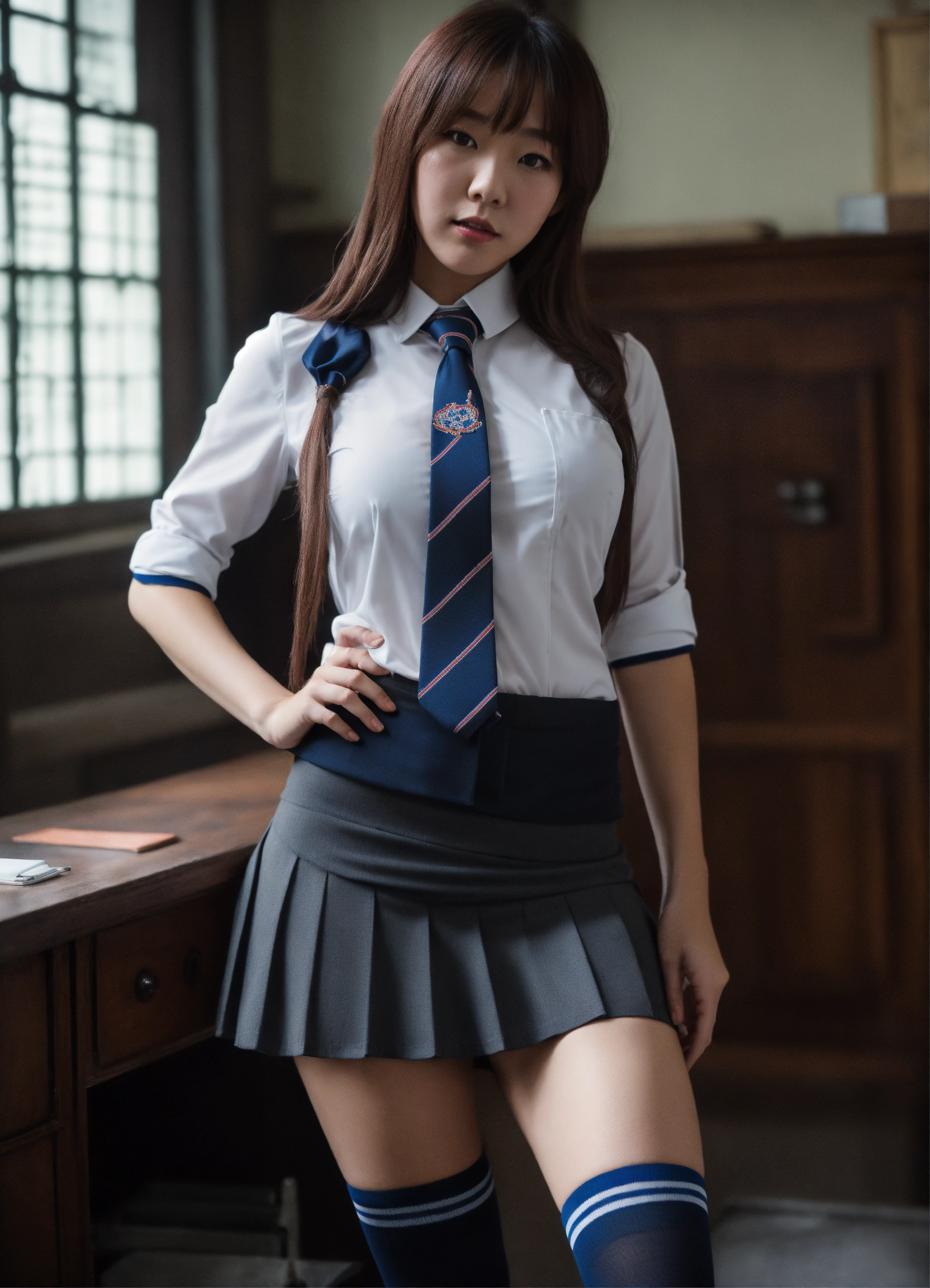 Unbuttoned, released tie, the british lady wearing a school uniform, tight shirt, skirt, socks, is posing in a room, in the style of dark academia, gongbi, dark bronze and gray, back button focus, fawncore, candid atmosphere, industrial chic, very tight shirt, wide bust