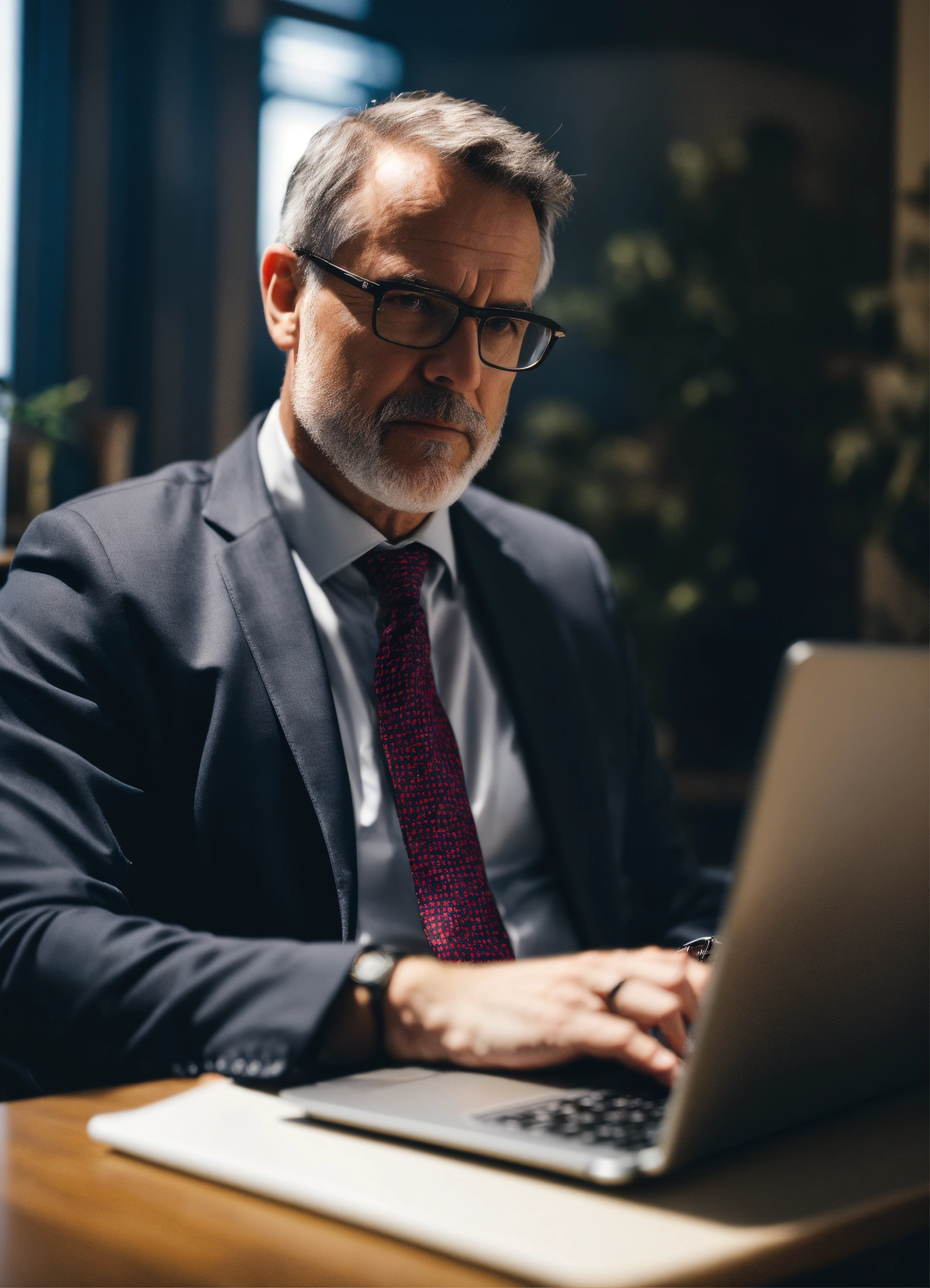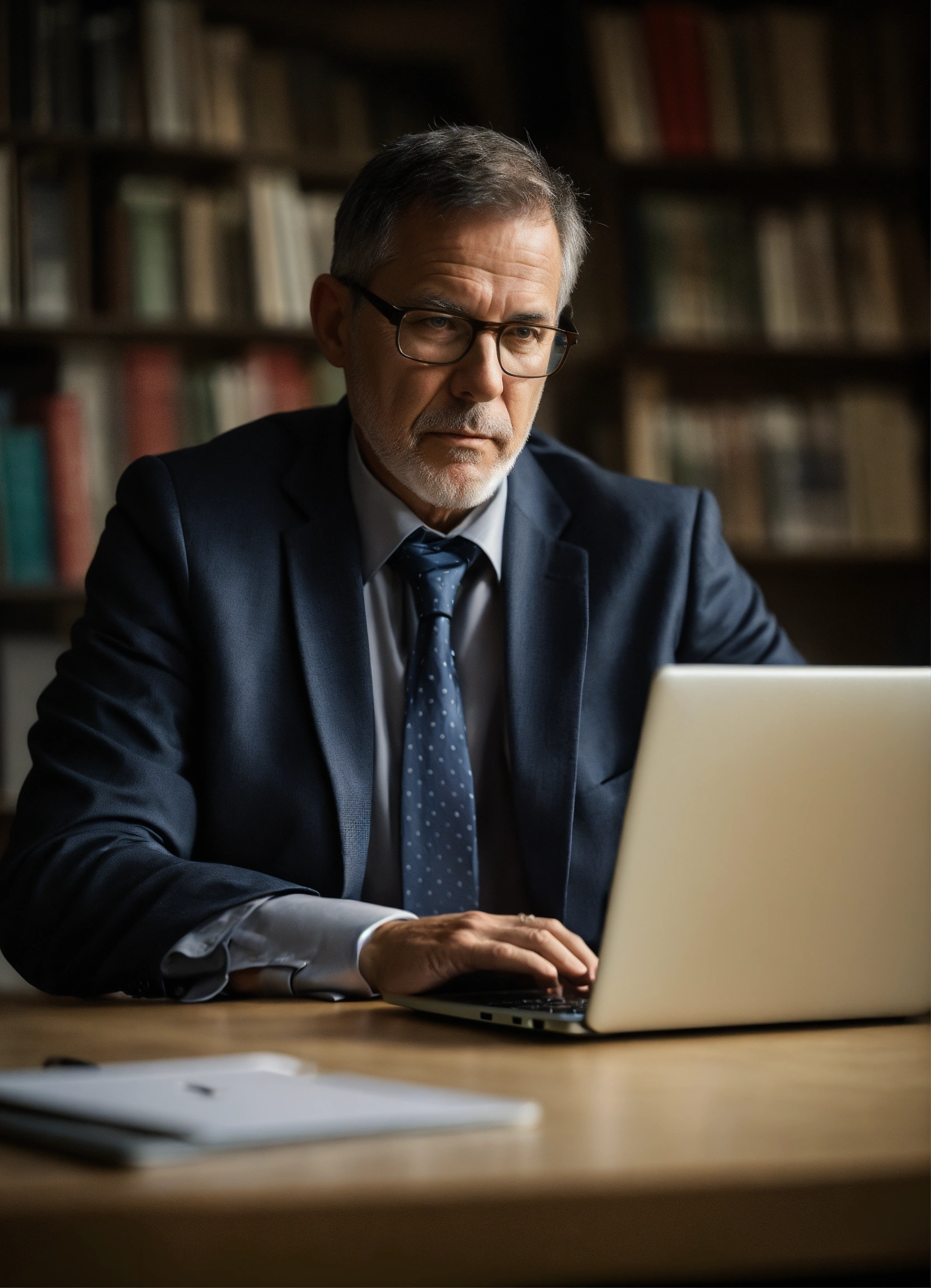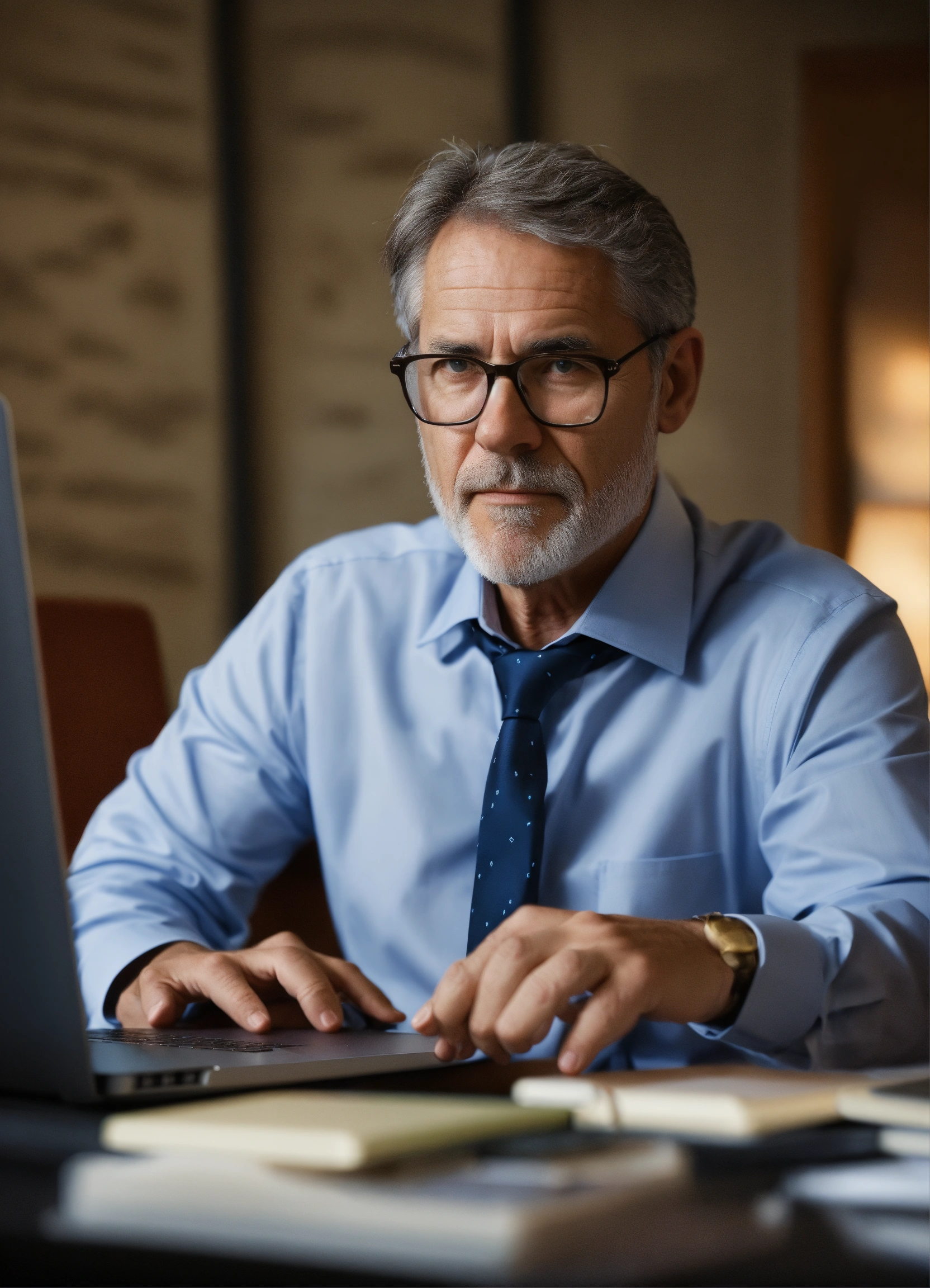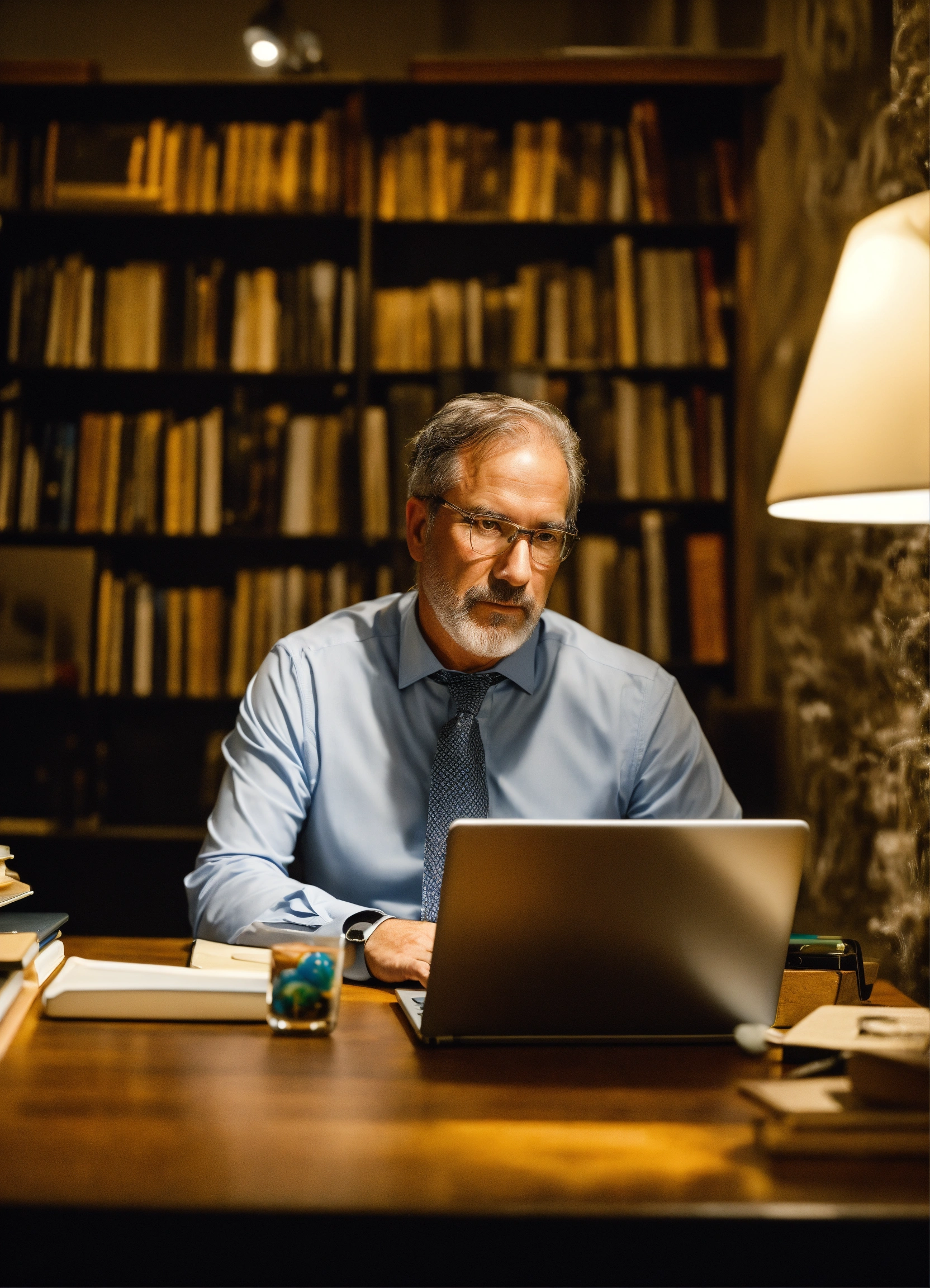 The modern author, a man in his late fifties, in a shirt and tie, seated at an open laptop on a desk. the world behind him is a blur of motion as he focuses on the laptop.