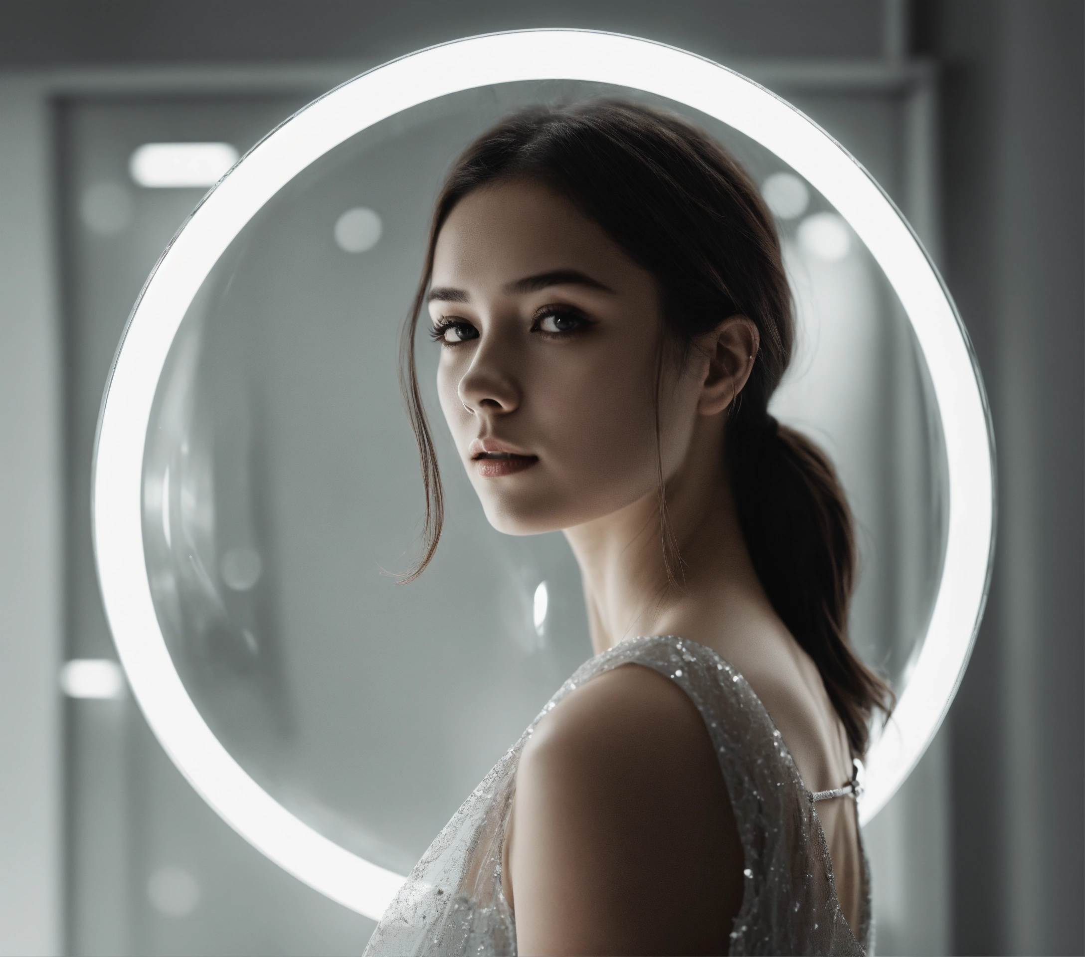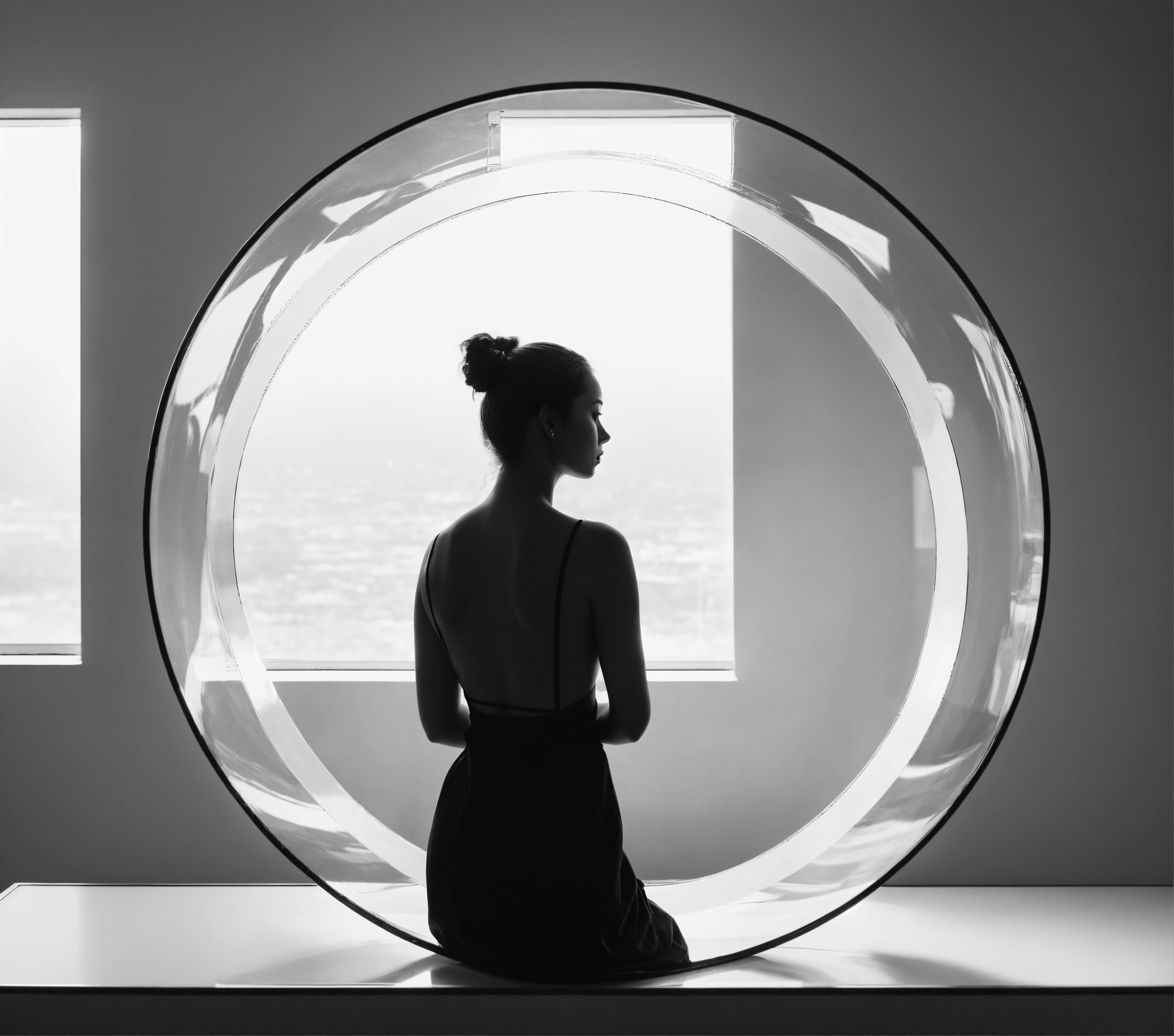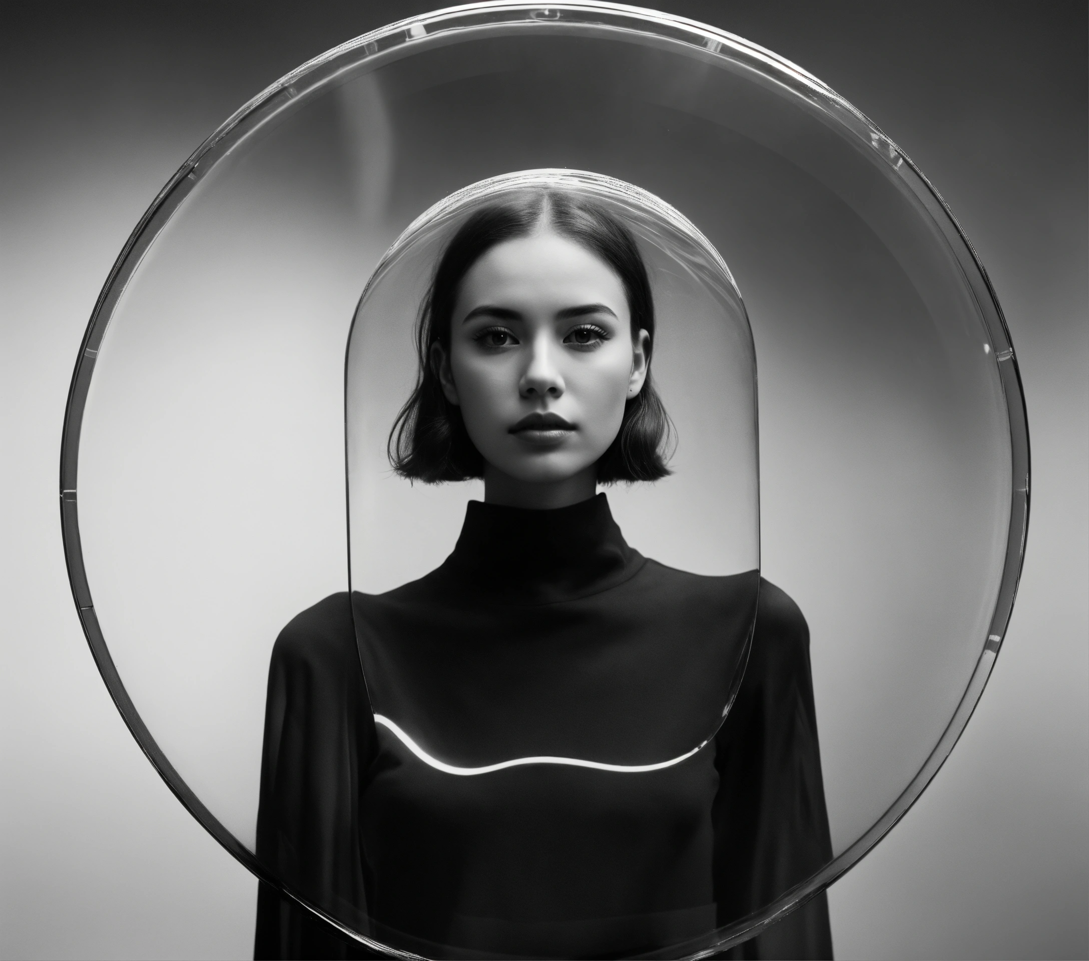 Women look in clear looking transparent glass circle, black white photo, white background, future minimalist style 8 k