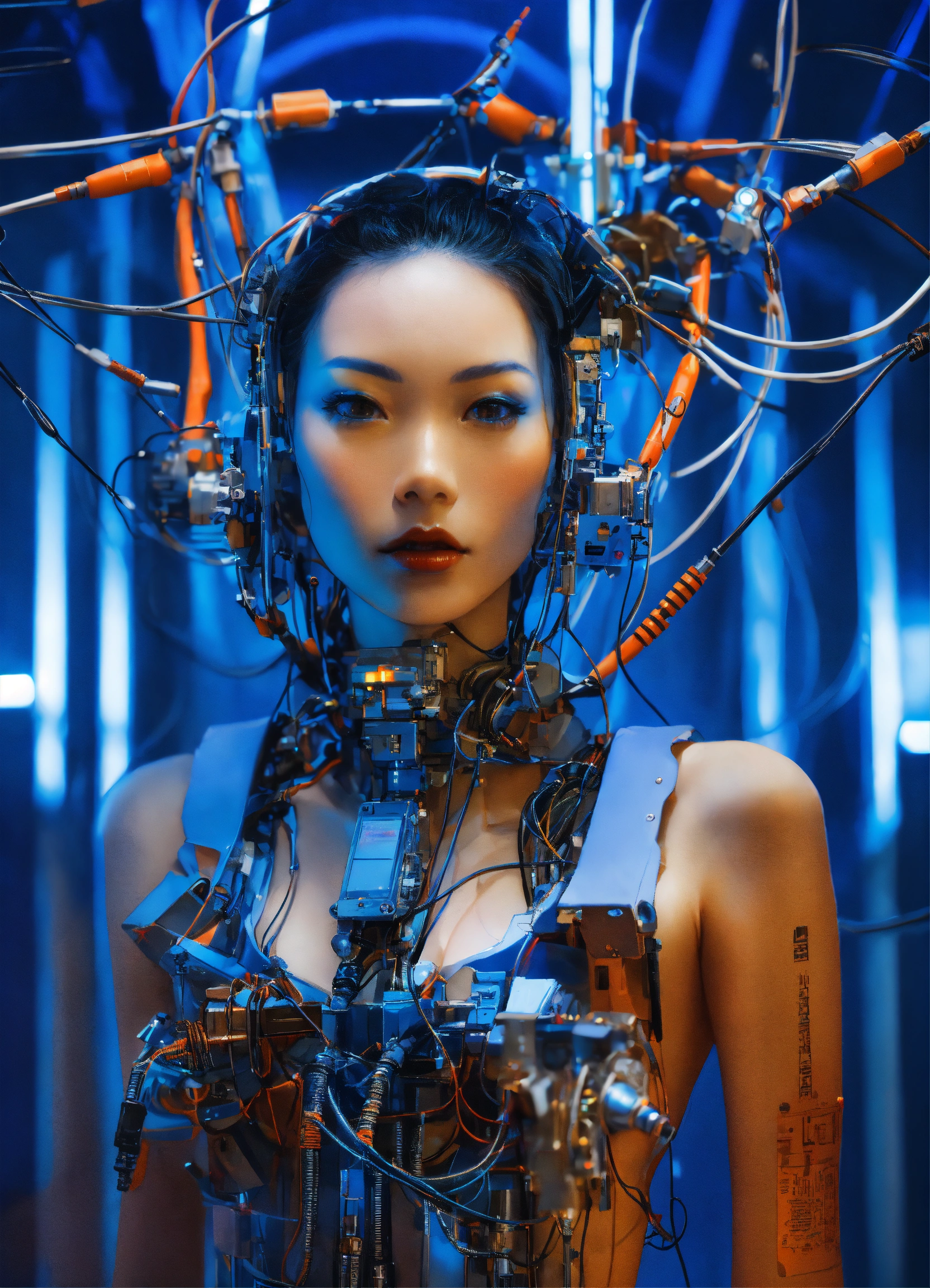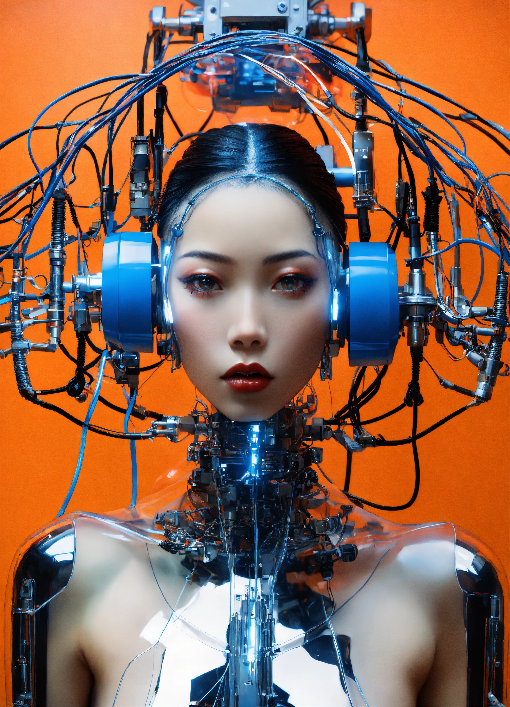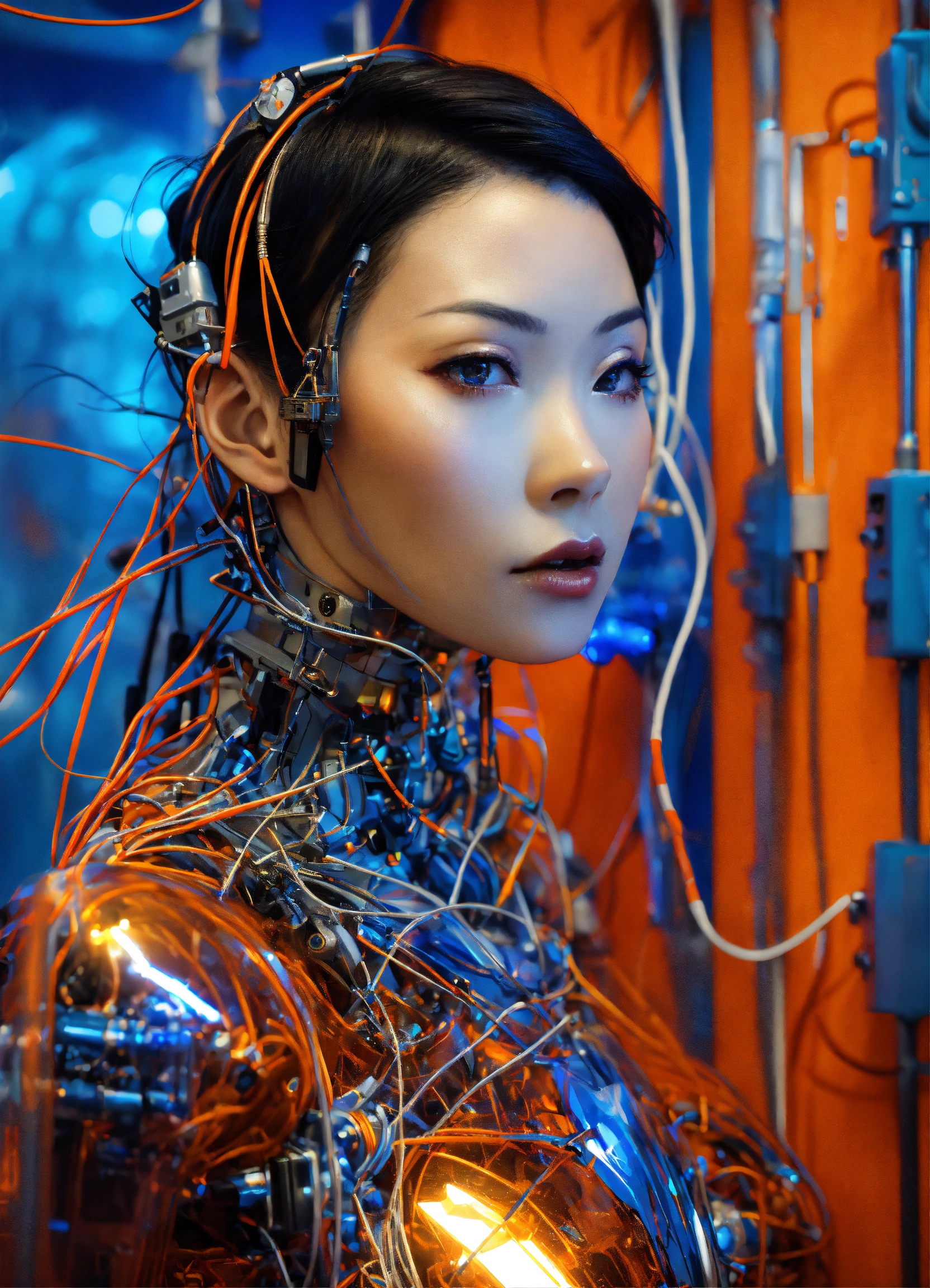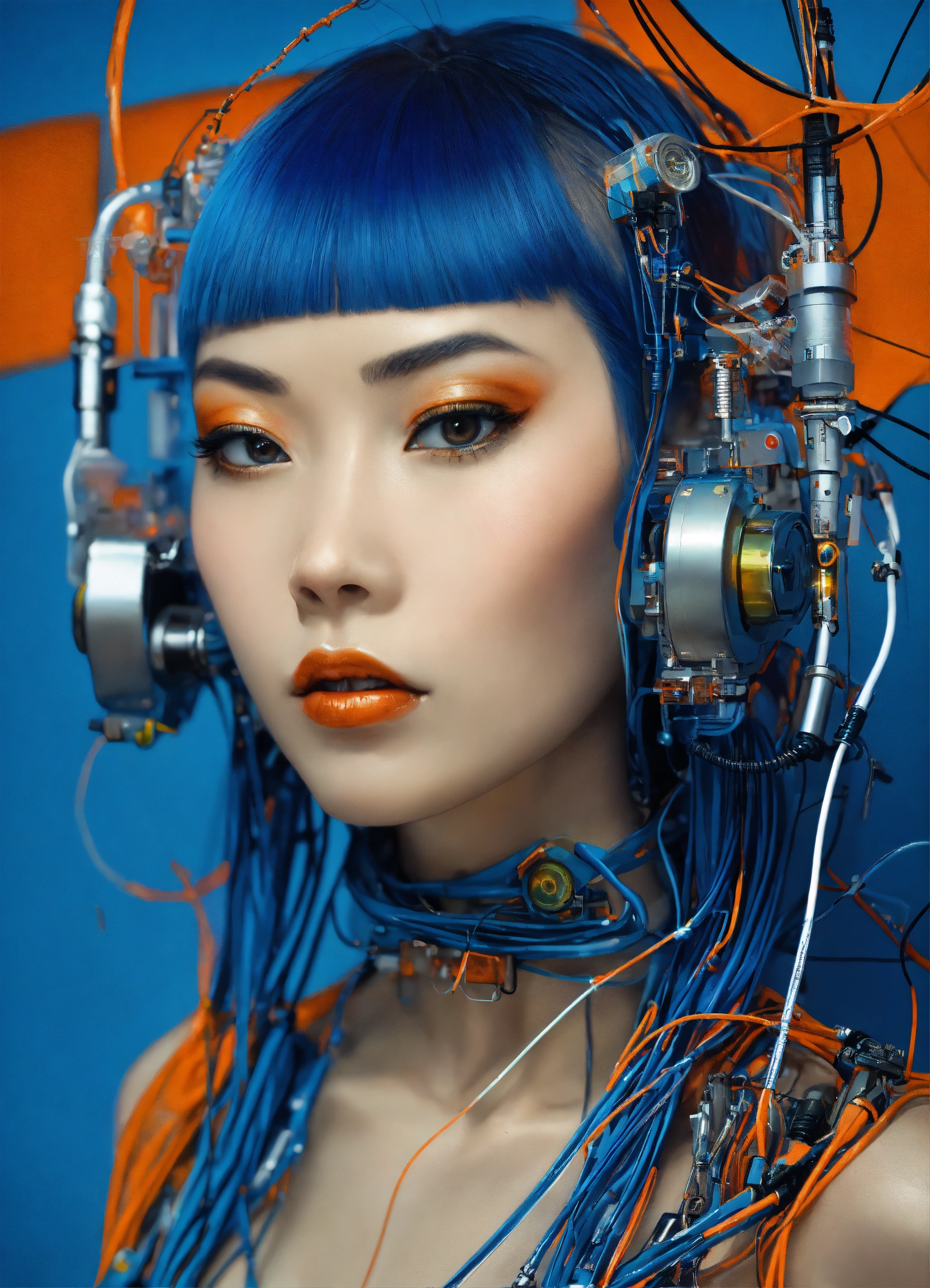 Face photography, in front of an orange and blue wall, a beauty asian cyborg woman, connected by cables and wires and led, an attractive transparent dark plexiglass latex body plc robots with silver motor head, with ray guns, 80 degree view, art by sergio lopez, natalie shau, james jean and salvador dali