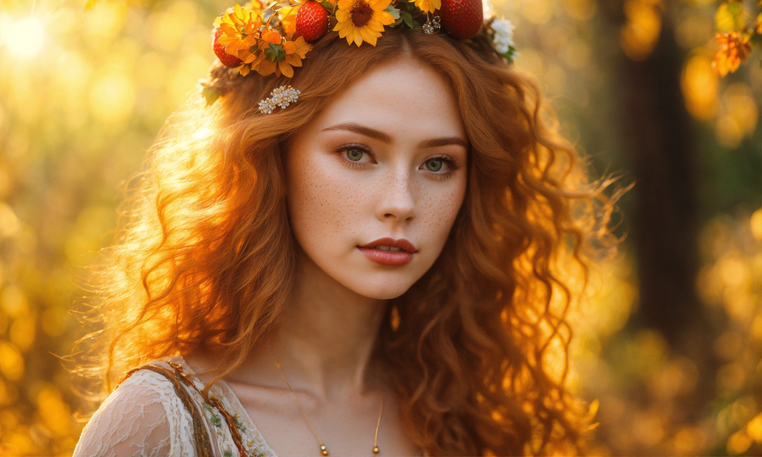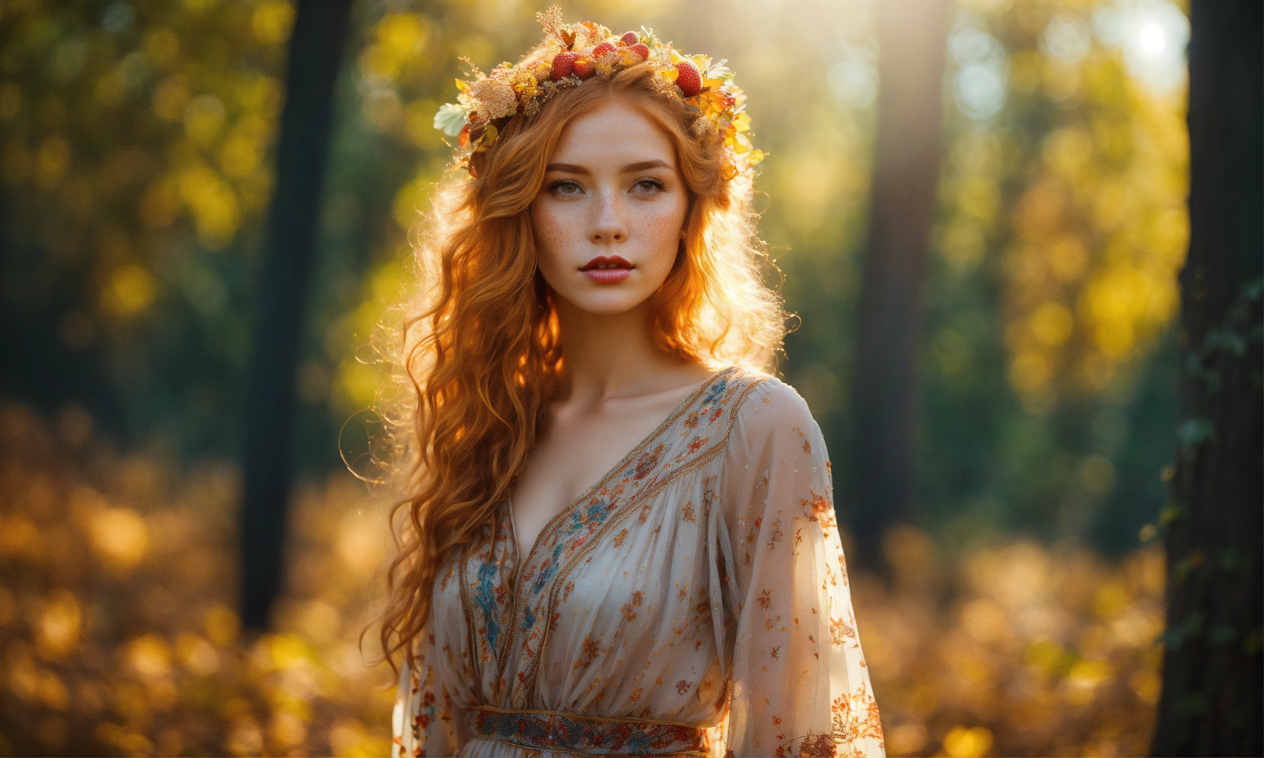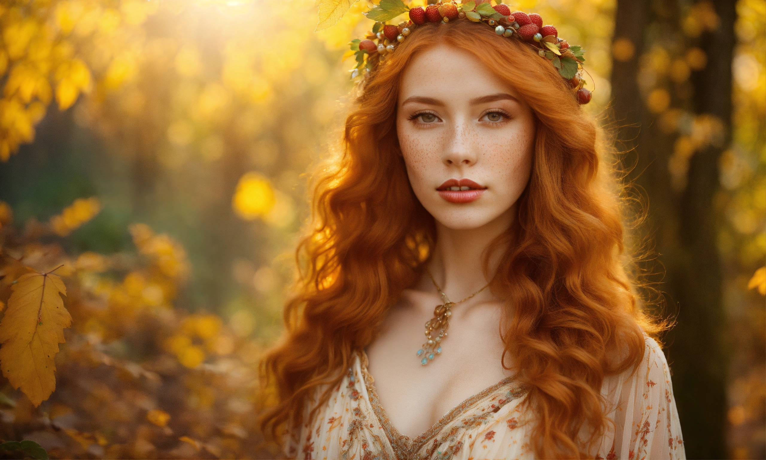 Bright, strawberry blonde-haired, with freckles. 30 year old 38 inch bustline, full luscious lips wearing amber strands and beads the sun, the autumn forest, fantastic beauty. curls. wearing a boho summer dress ultra-detailed dreamlike, photography 8k resolution image, translucent and ethereal.