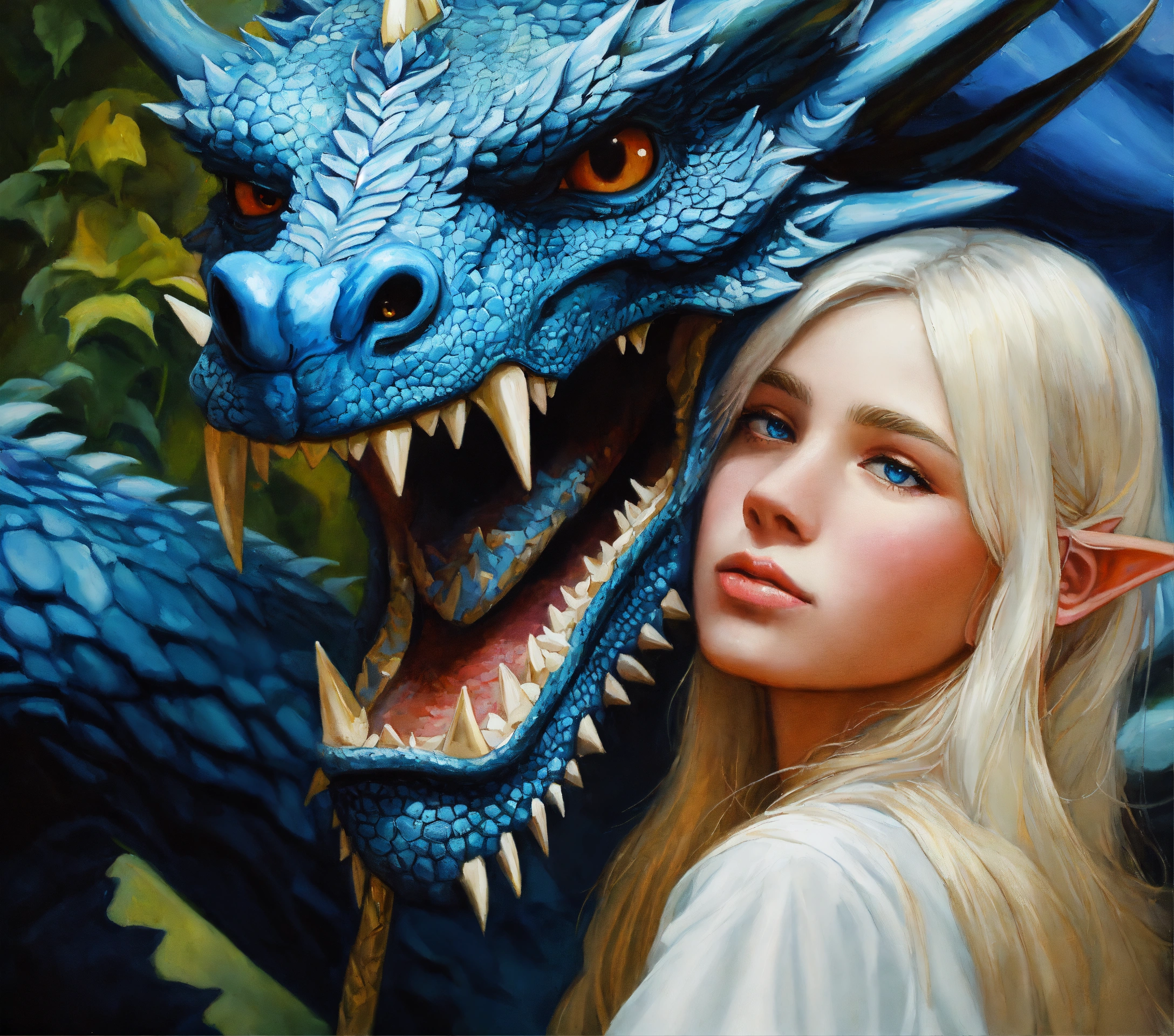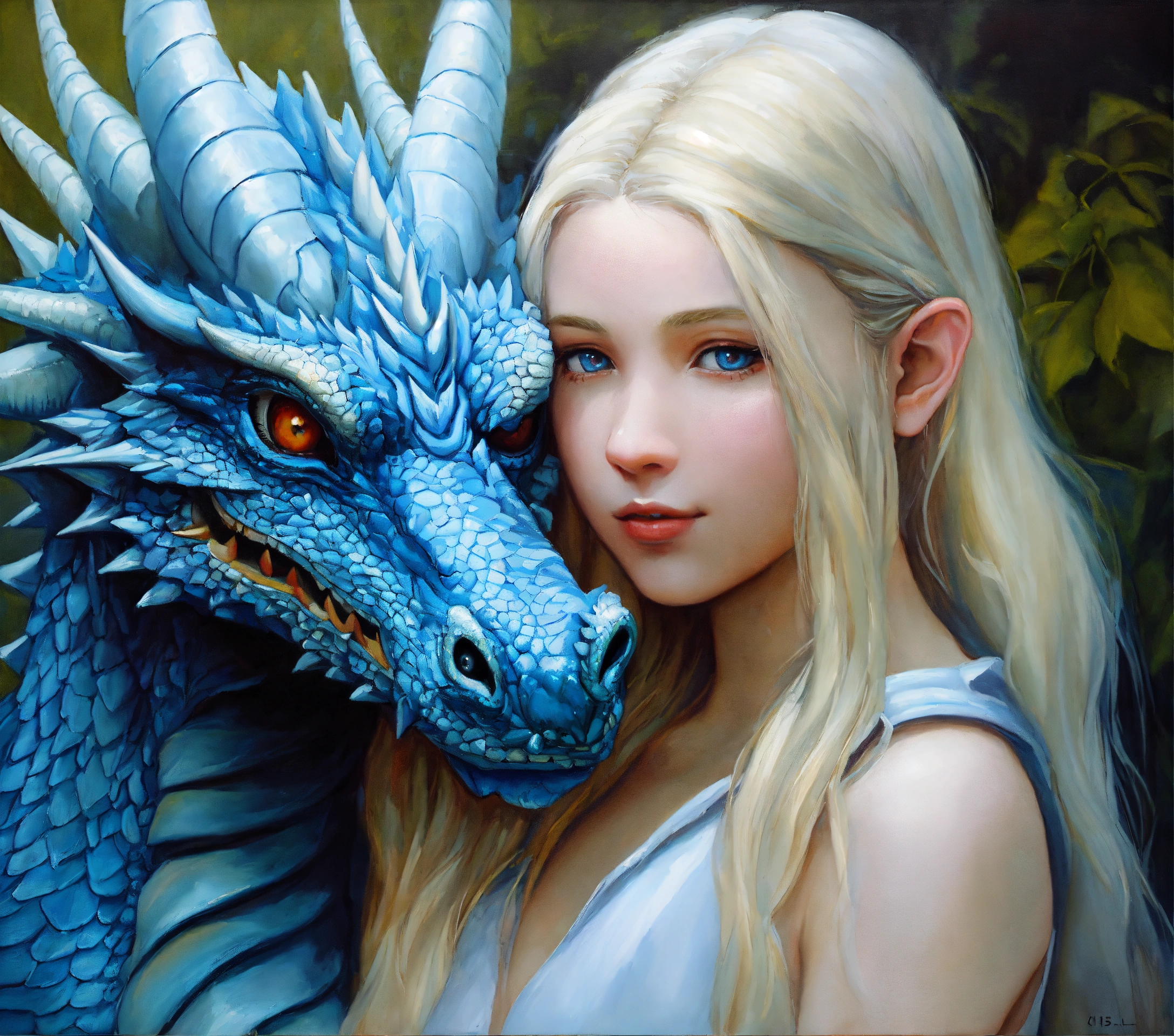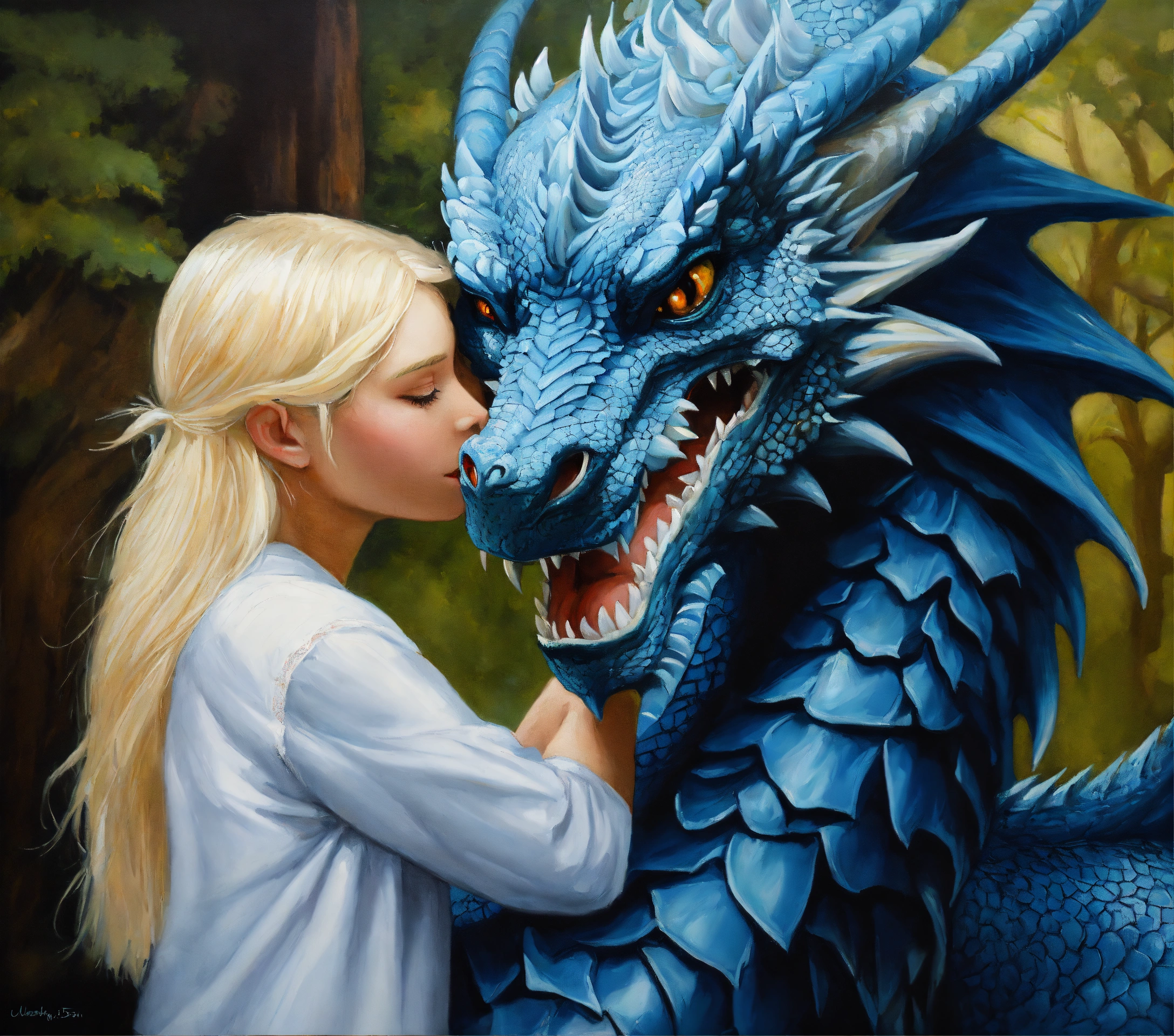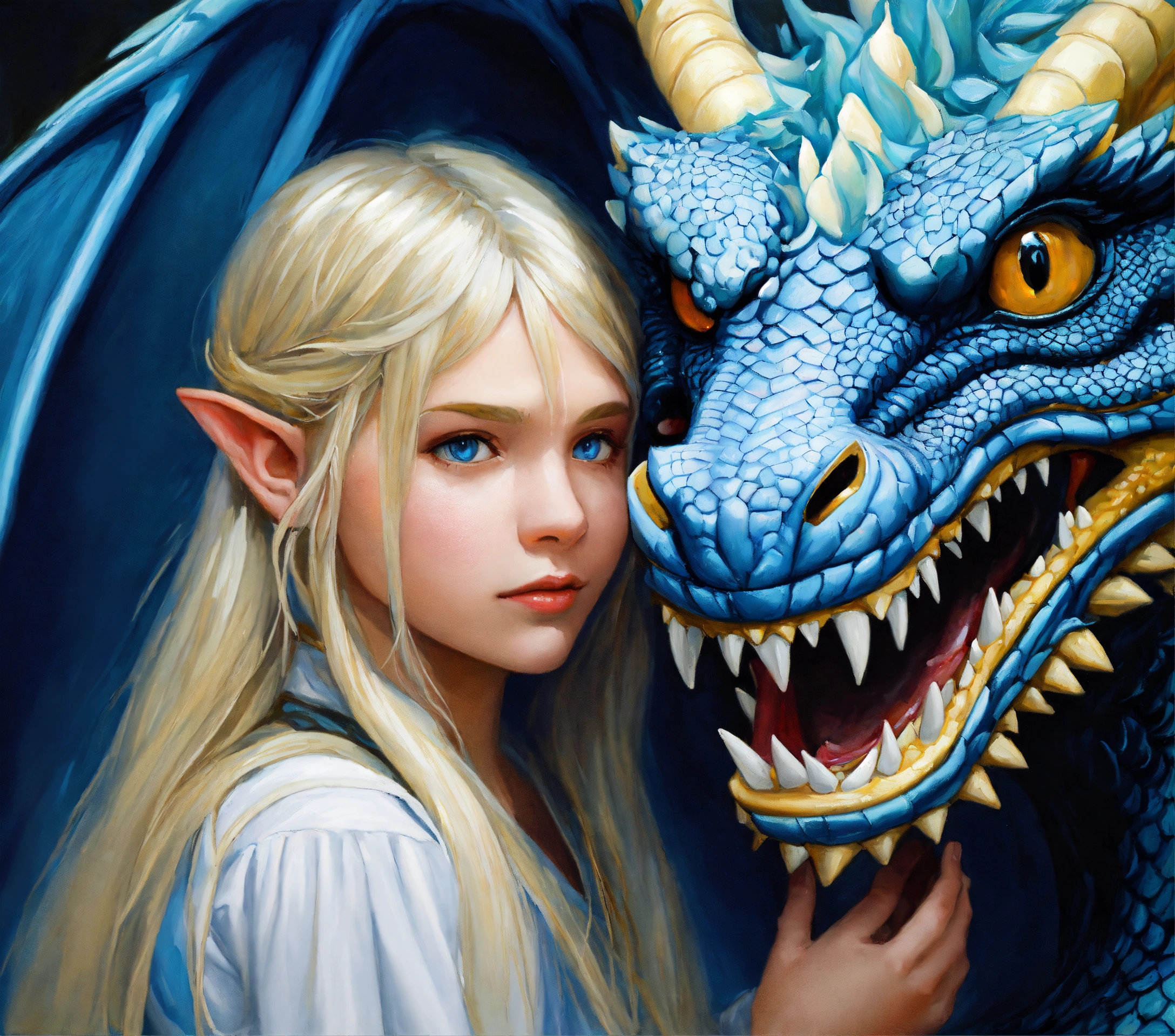 Oil painting of a huge, magnificent blue dragon head with a 15 year old white blonde elf girl lovingly hugging the dragon head, the dragon's head is as big as the entire girl, ultra detailled, ultra realistic